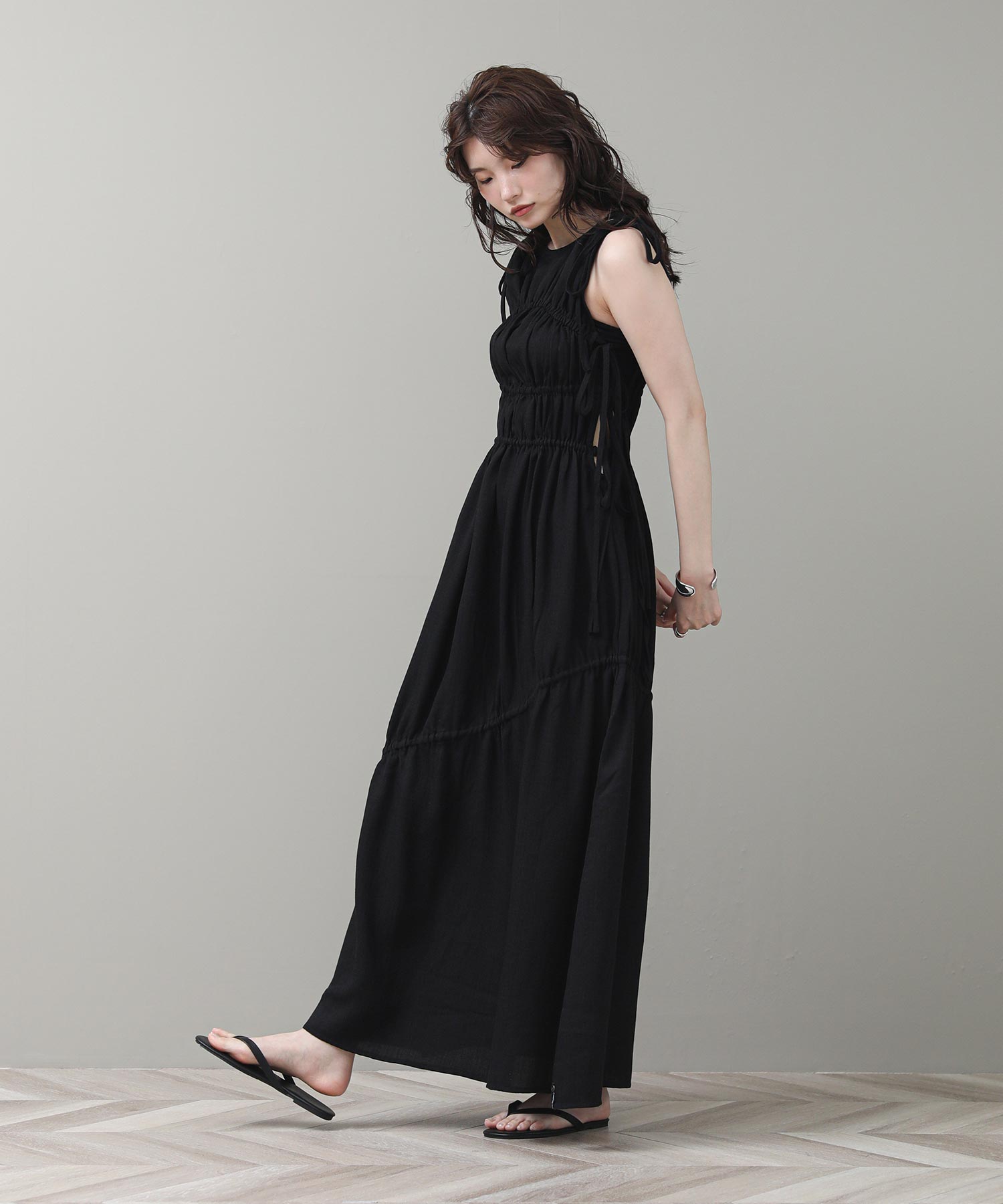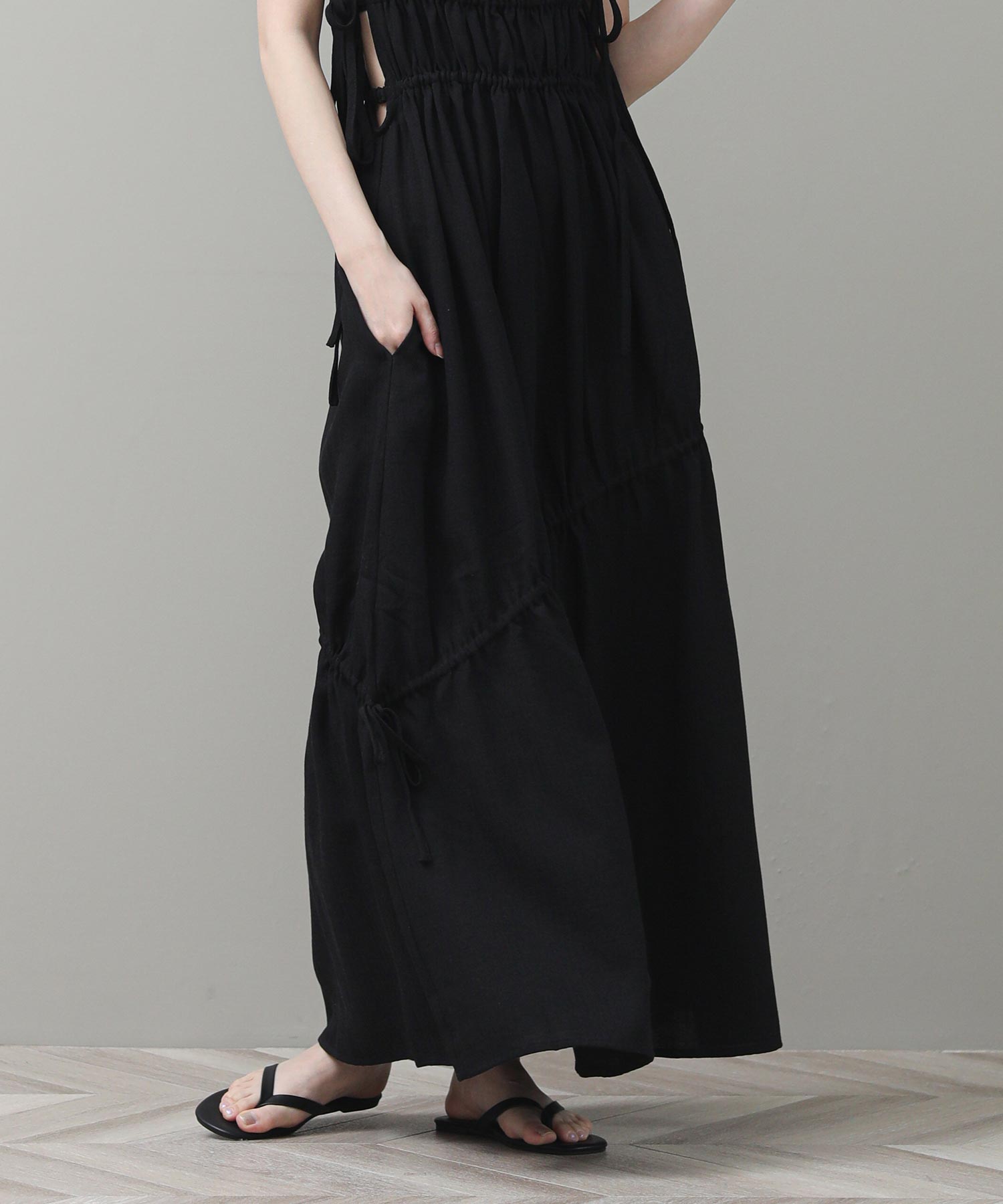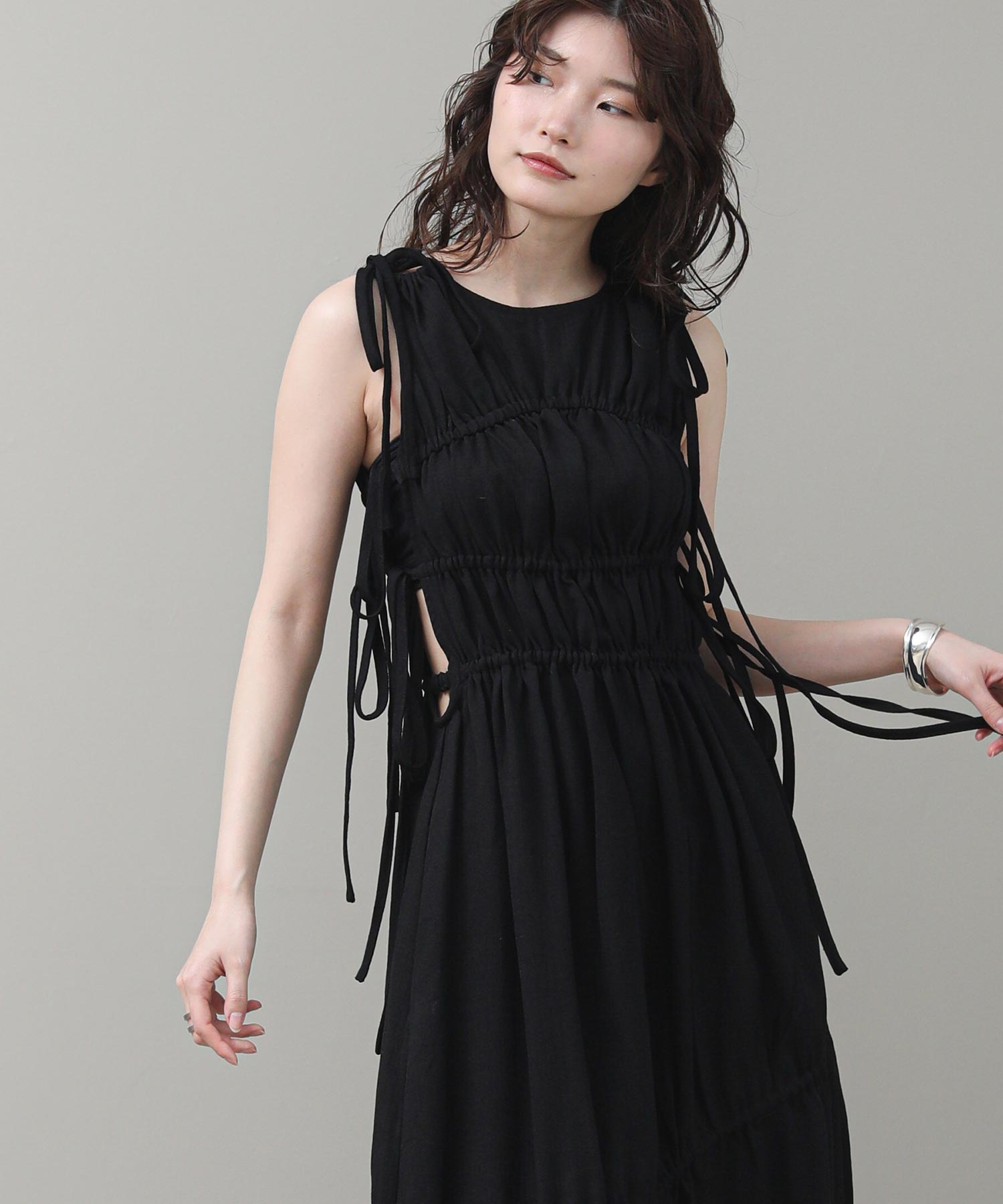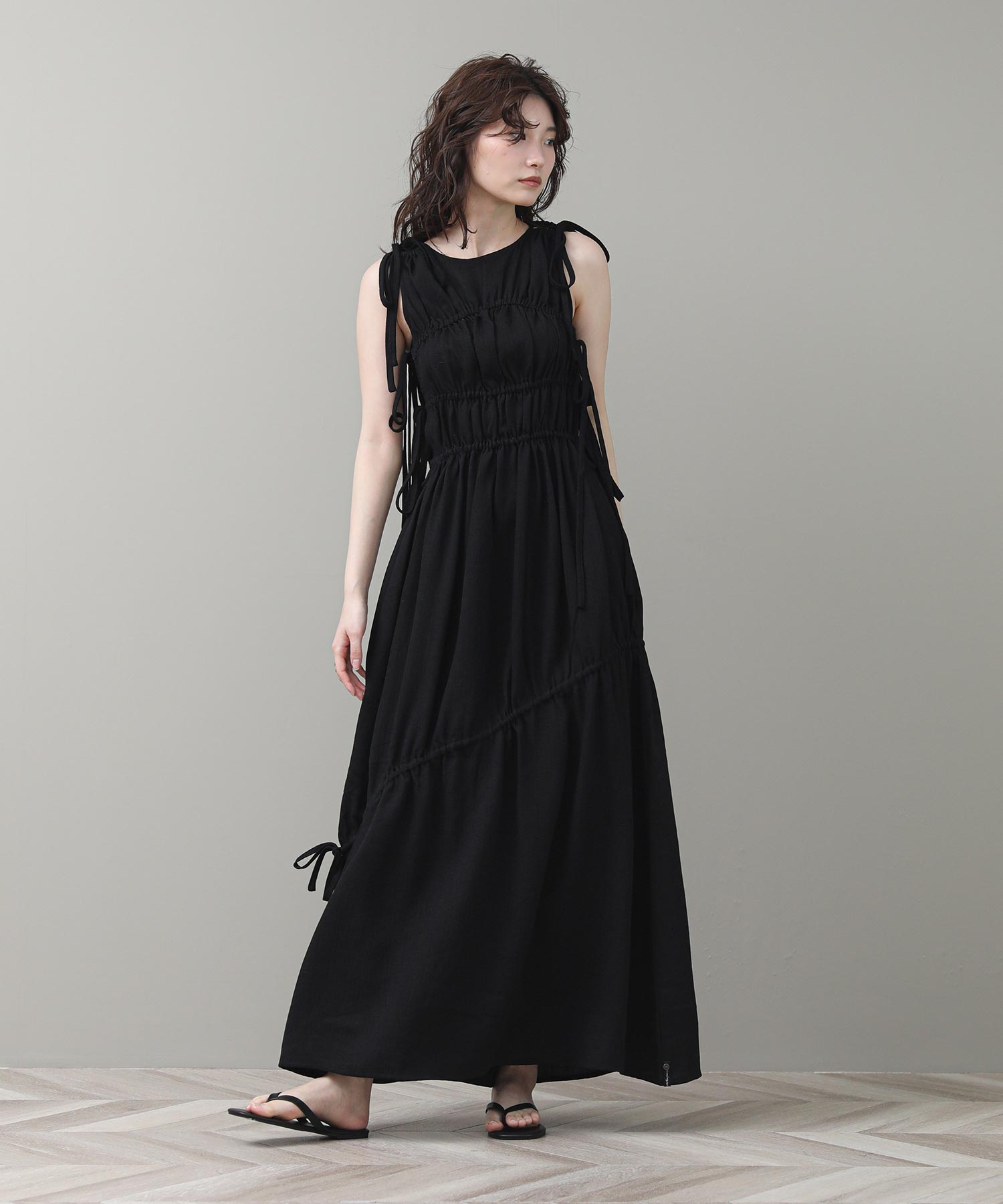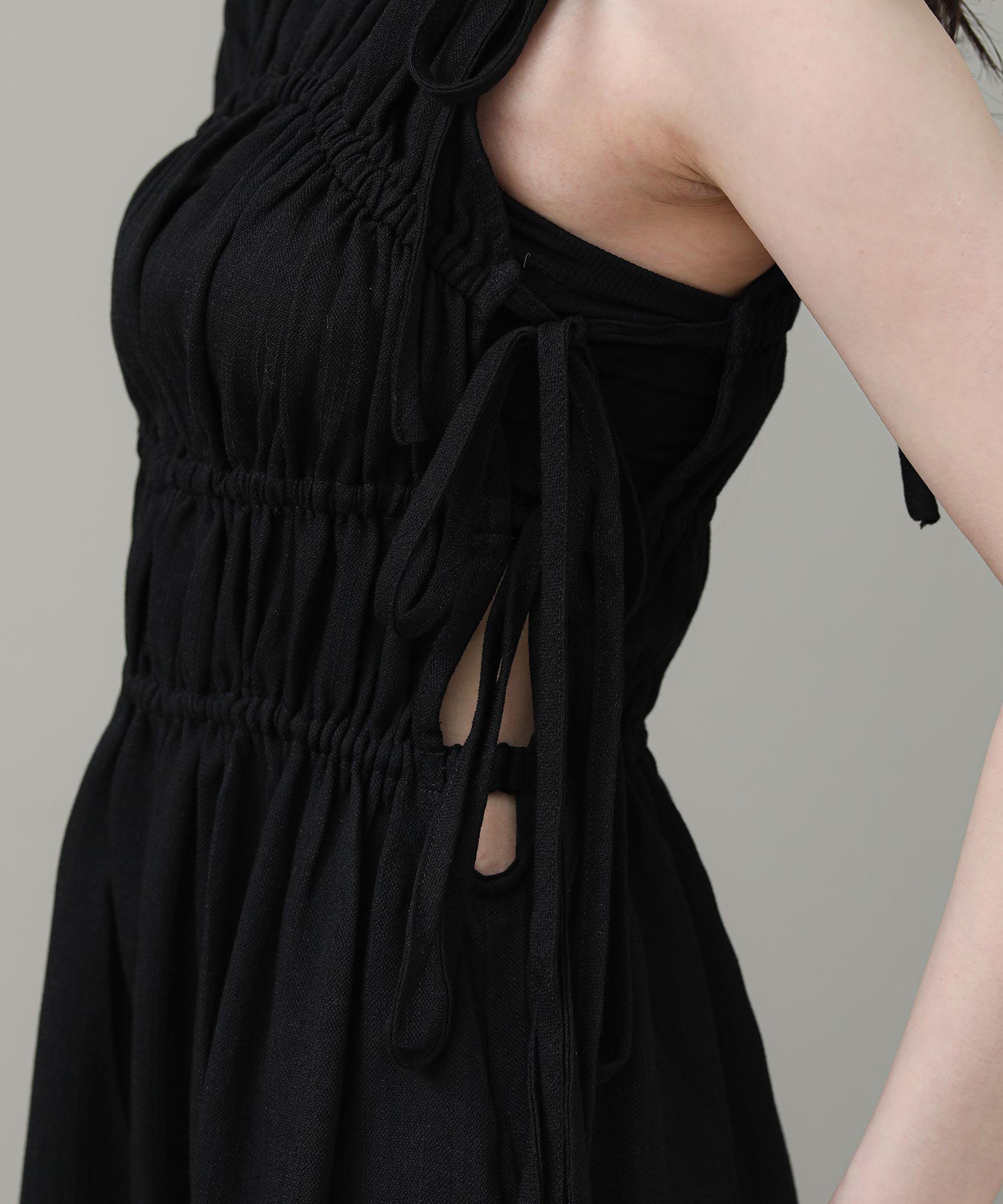 脇をリボンで結ぶ仕様です。ギャザーは調節が可能なのでシルエットを自由に変えられます。まだ肌寒い時期はロンTを重ねたり、ジャケットを羽織ると◎夏は1枚でリゾートスタイルに。長く楽しんでいただけるアイテムです。