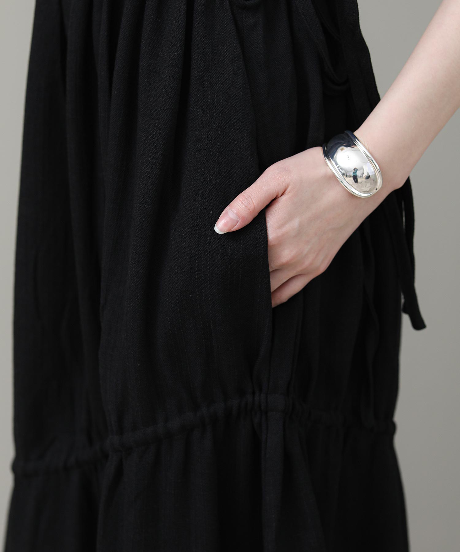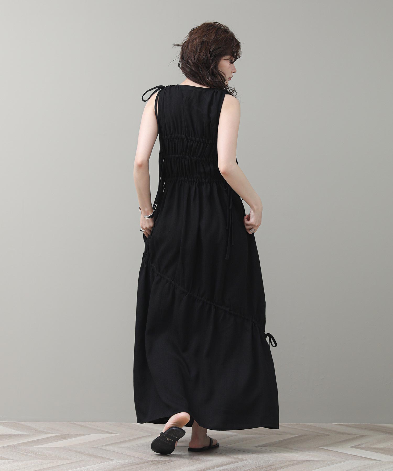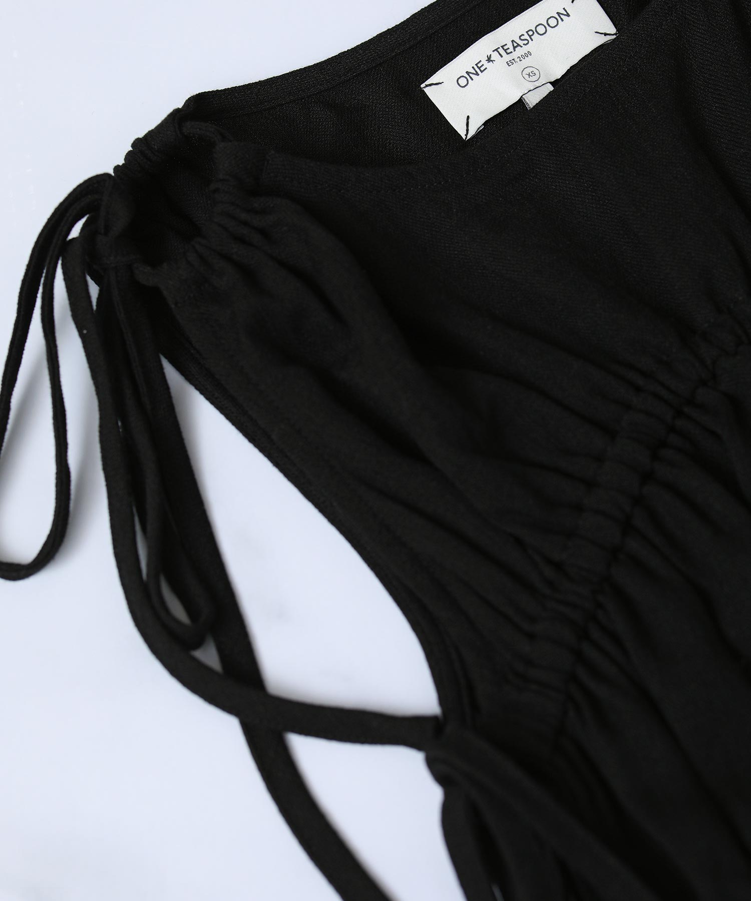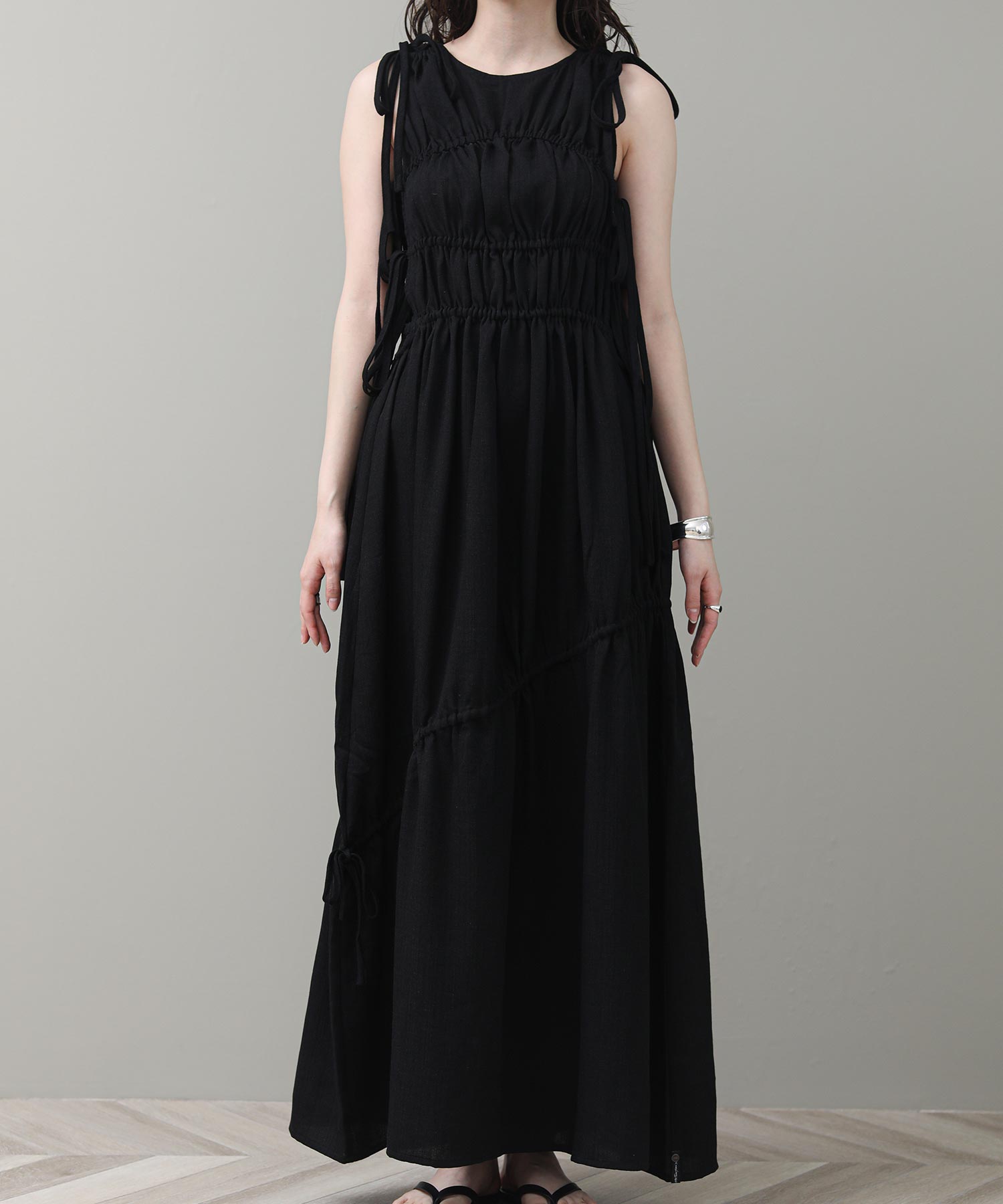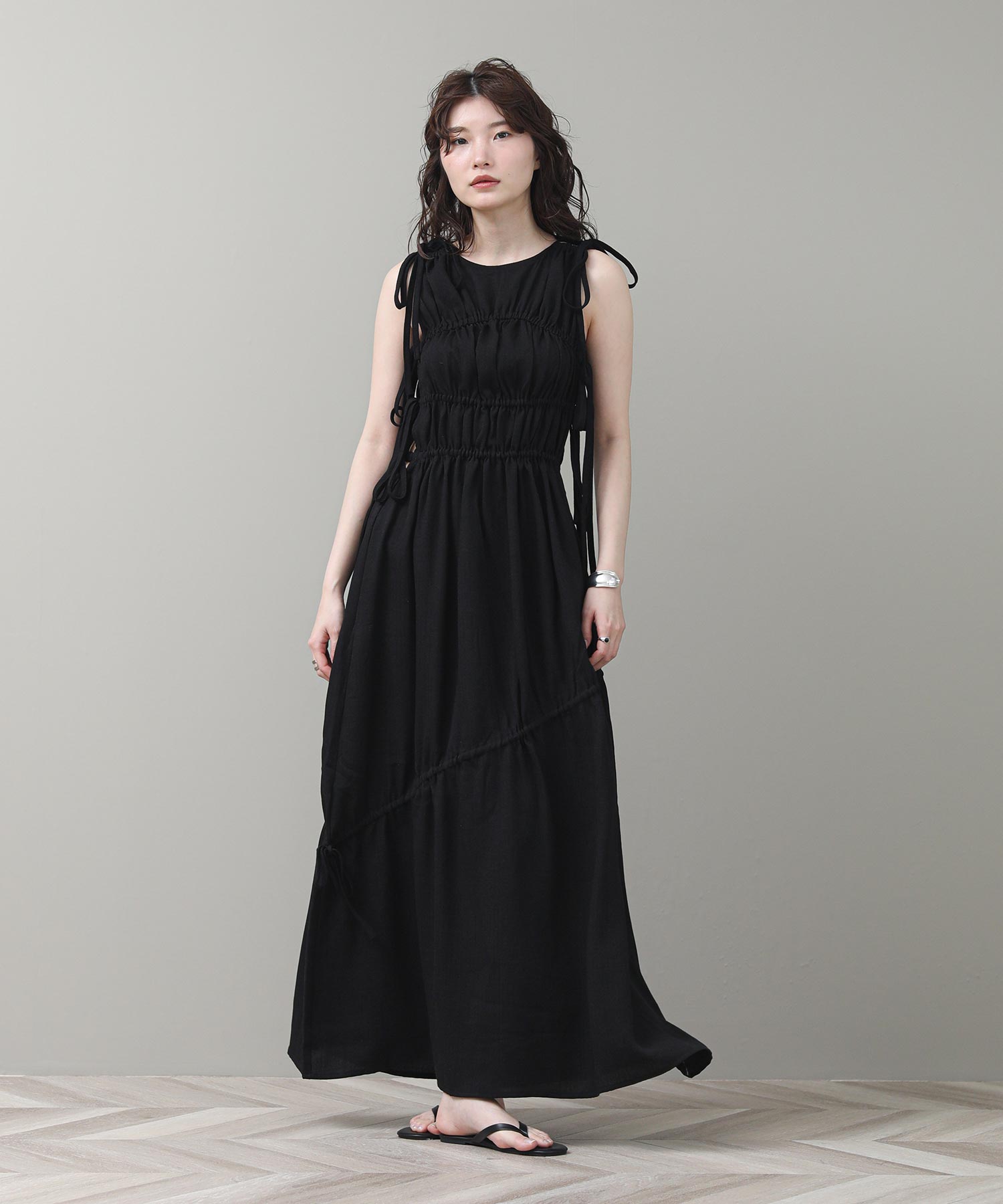 脇をリボンで結ぶ仕様です。ギャザーは調節が可能なのでシルエットを自由に変えられます。まだ肌寒い時期はロンTを重ねたり、ジャケットを羽織ると◎夏は1枚でリゾートスタイルに。長く楽しんでいただけるアイテムです。