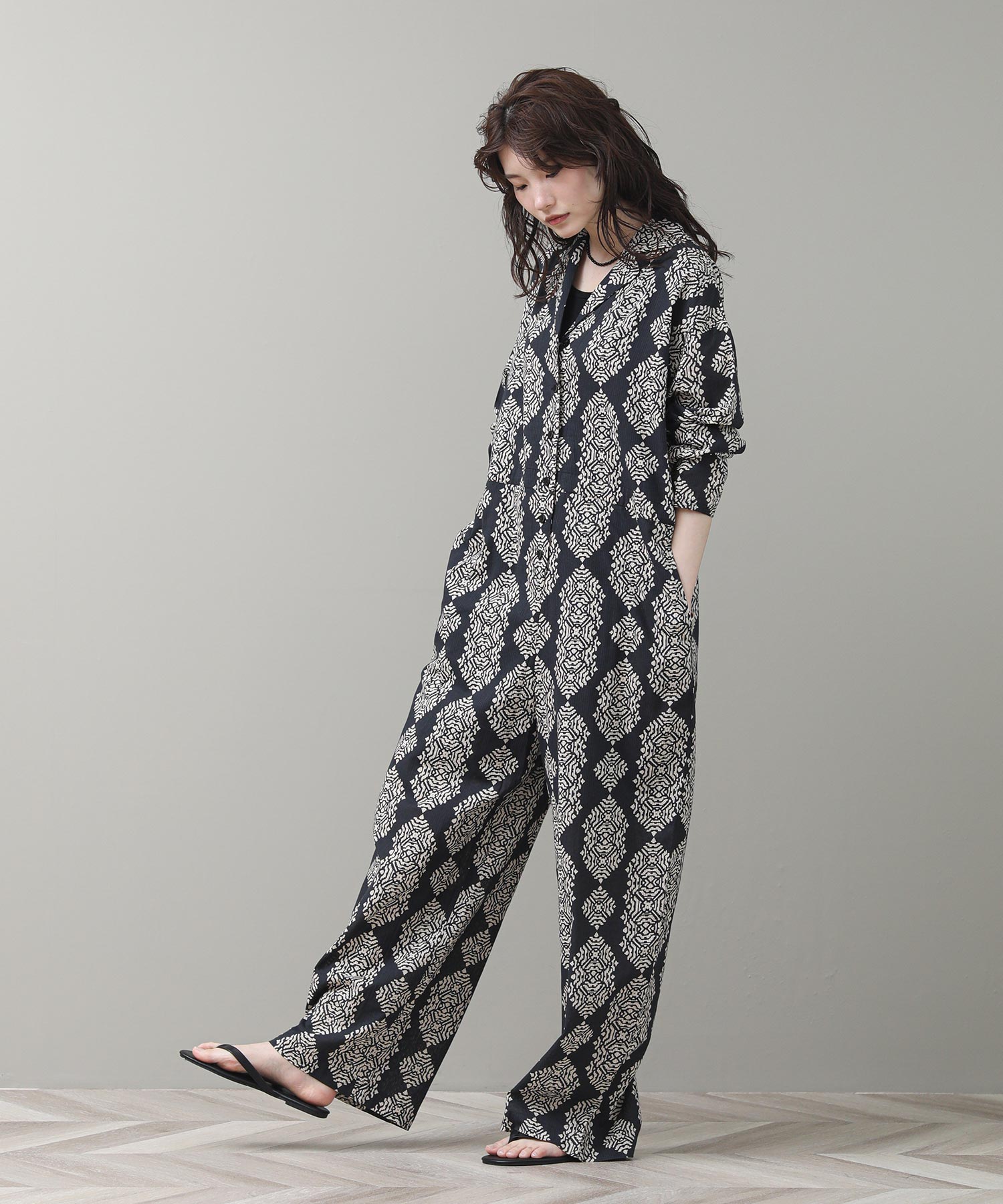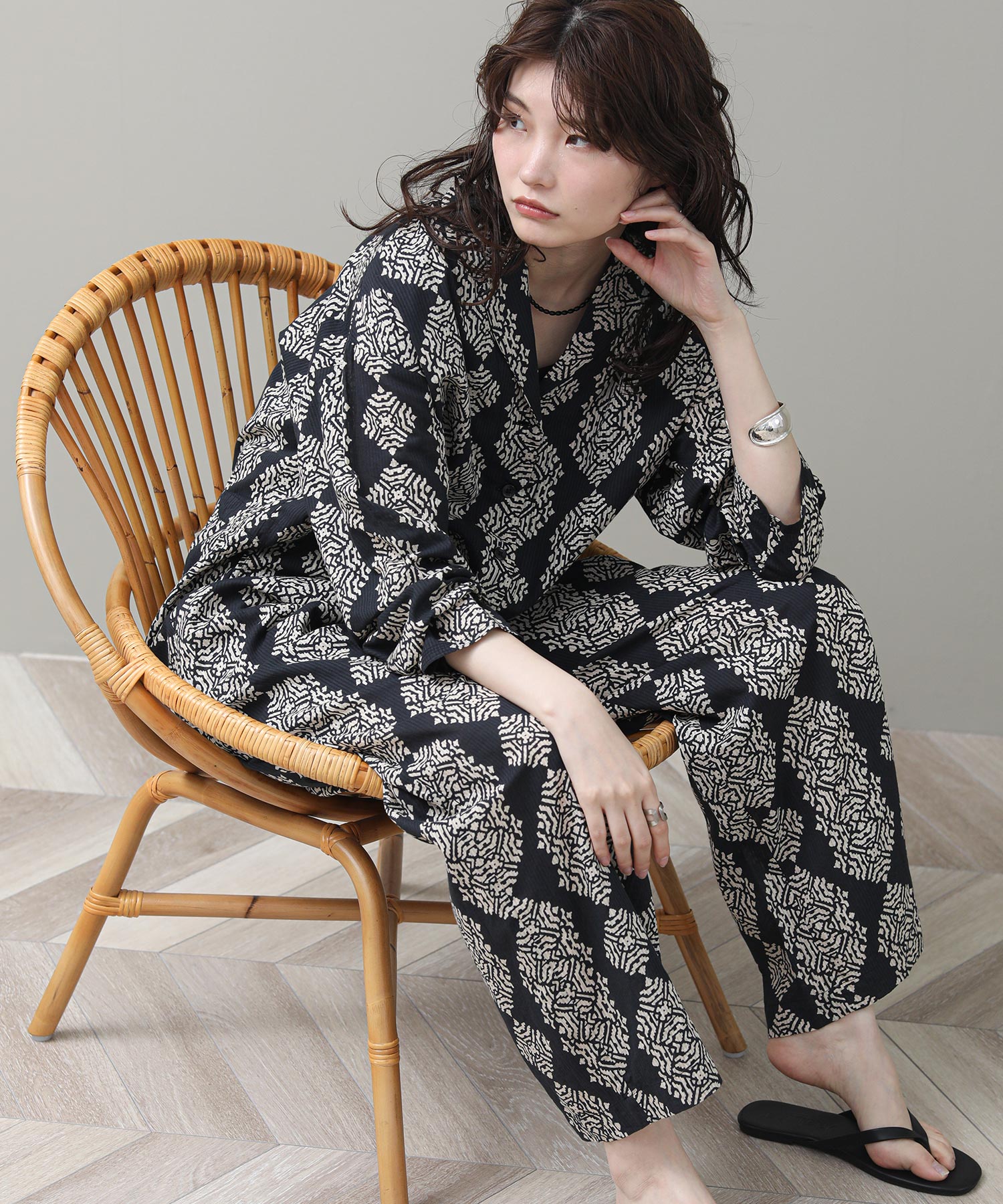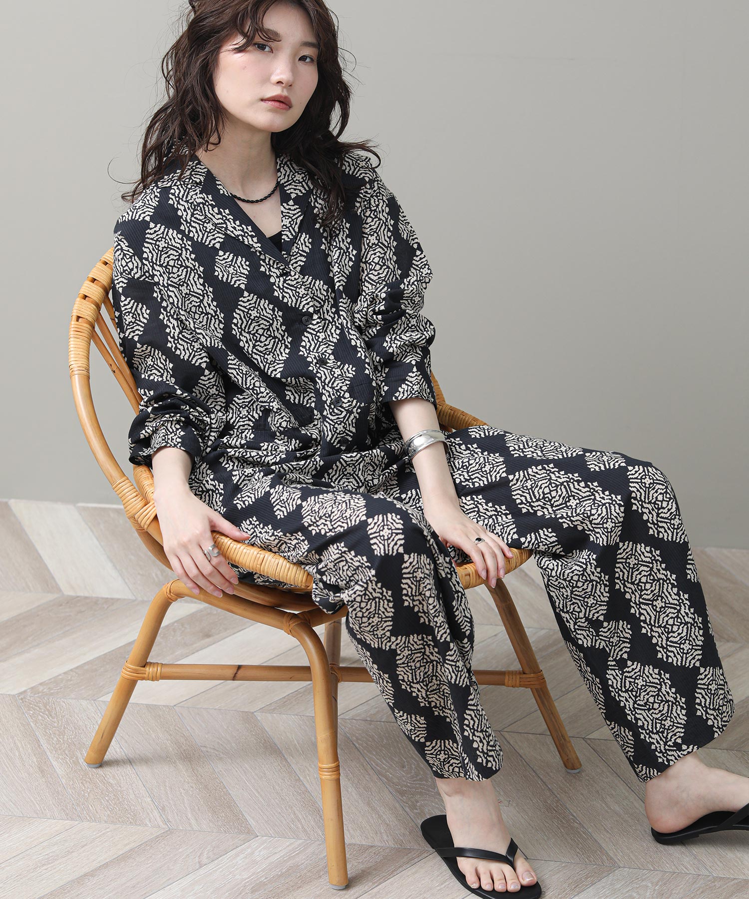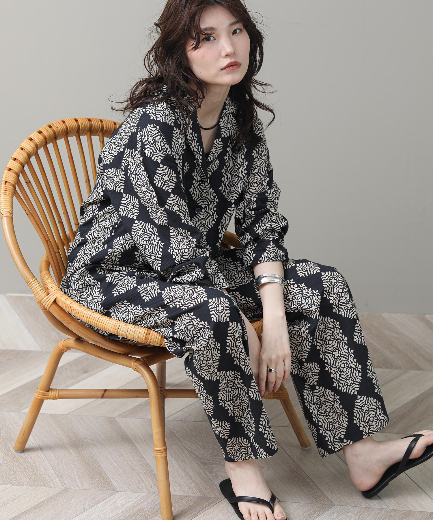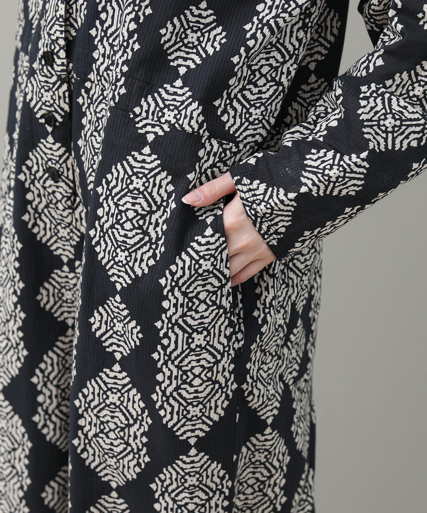 そのままストンと着てパジャマ風に、あるいはウエストをブラウジングしてシルエットを変えて楽しむこともできます。背面には便利なポケット付き。裏地付きなので、薄手素材でも透けを気にせず着用可能です。膝下は裏地を省き、風通しの良さと涼しさを実現しました。袖口の無駄な装飾を省いたシンプルなデザインが、軽やかな着心地をさらに際立たせます。70年代のヒッピーから着想を得たエスニックなジオメトリック柄は可愛らしすぎず、あえて辛口に仕上げて、モード感も感じられる一着。暑い季節でも心地よくまとえるコットン100%も嬉しいポイントです。