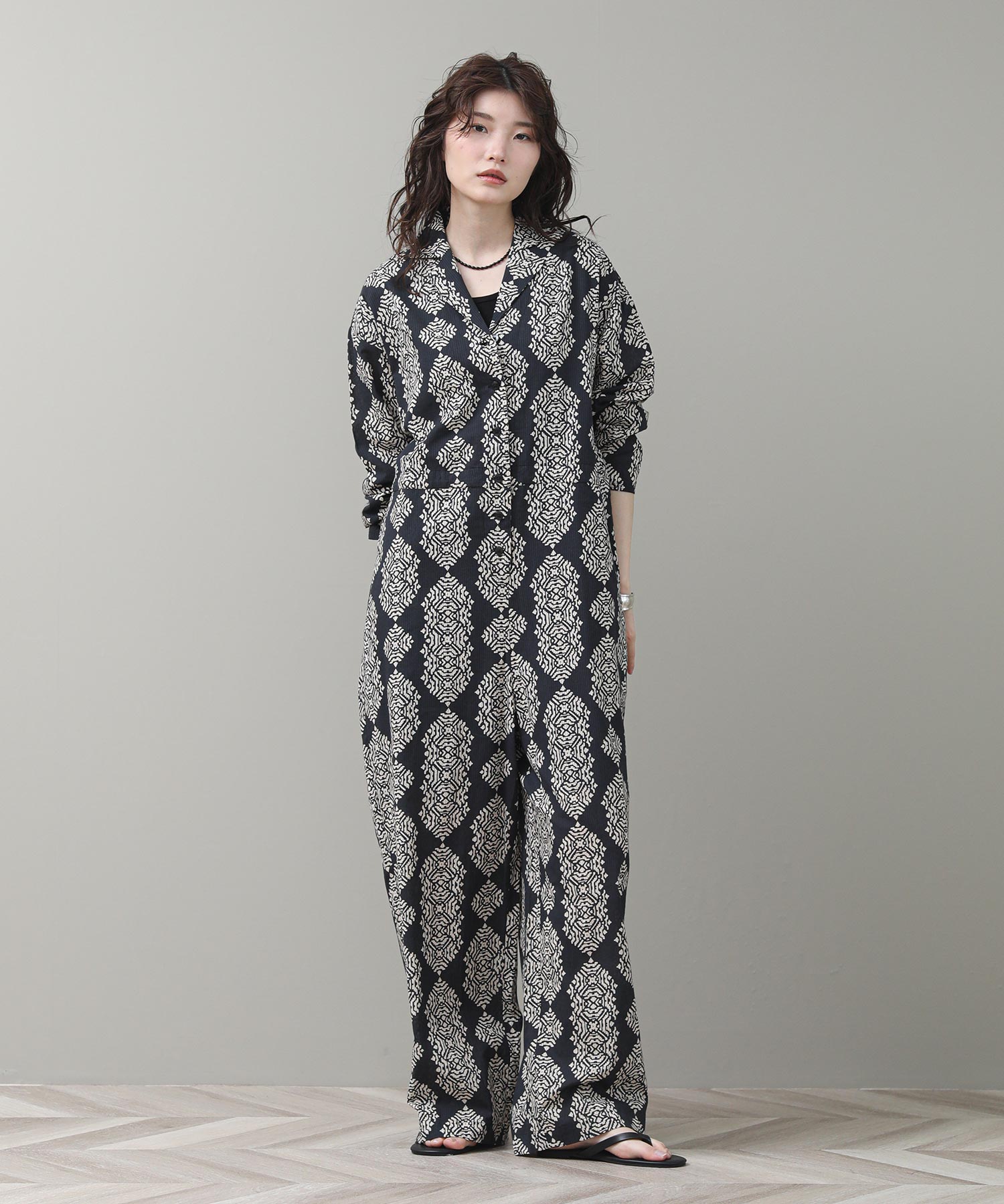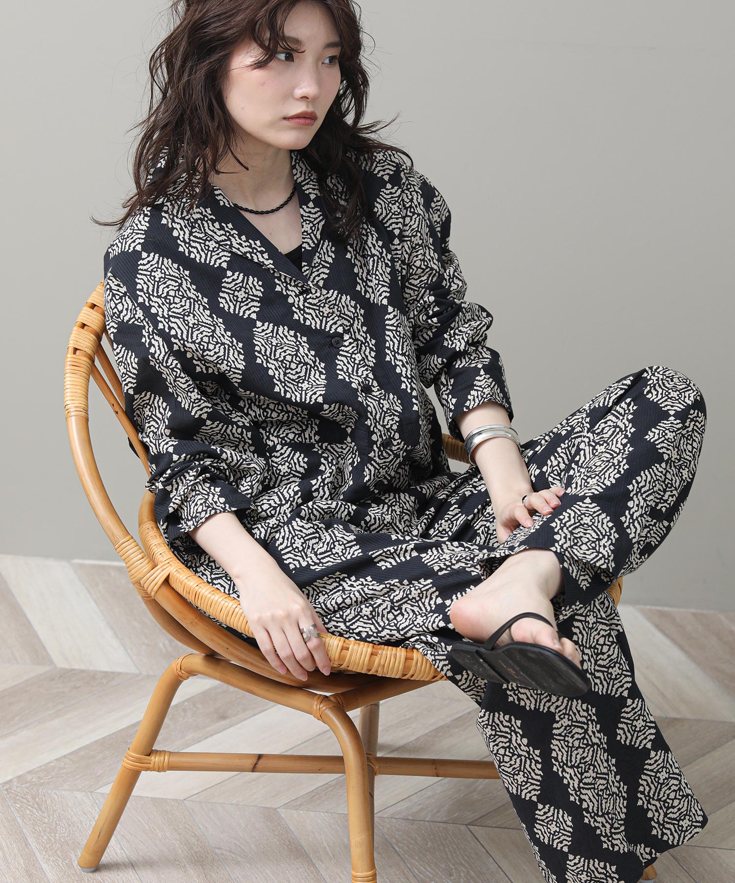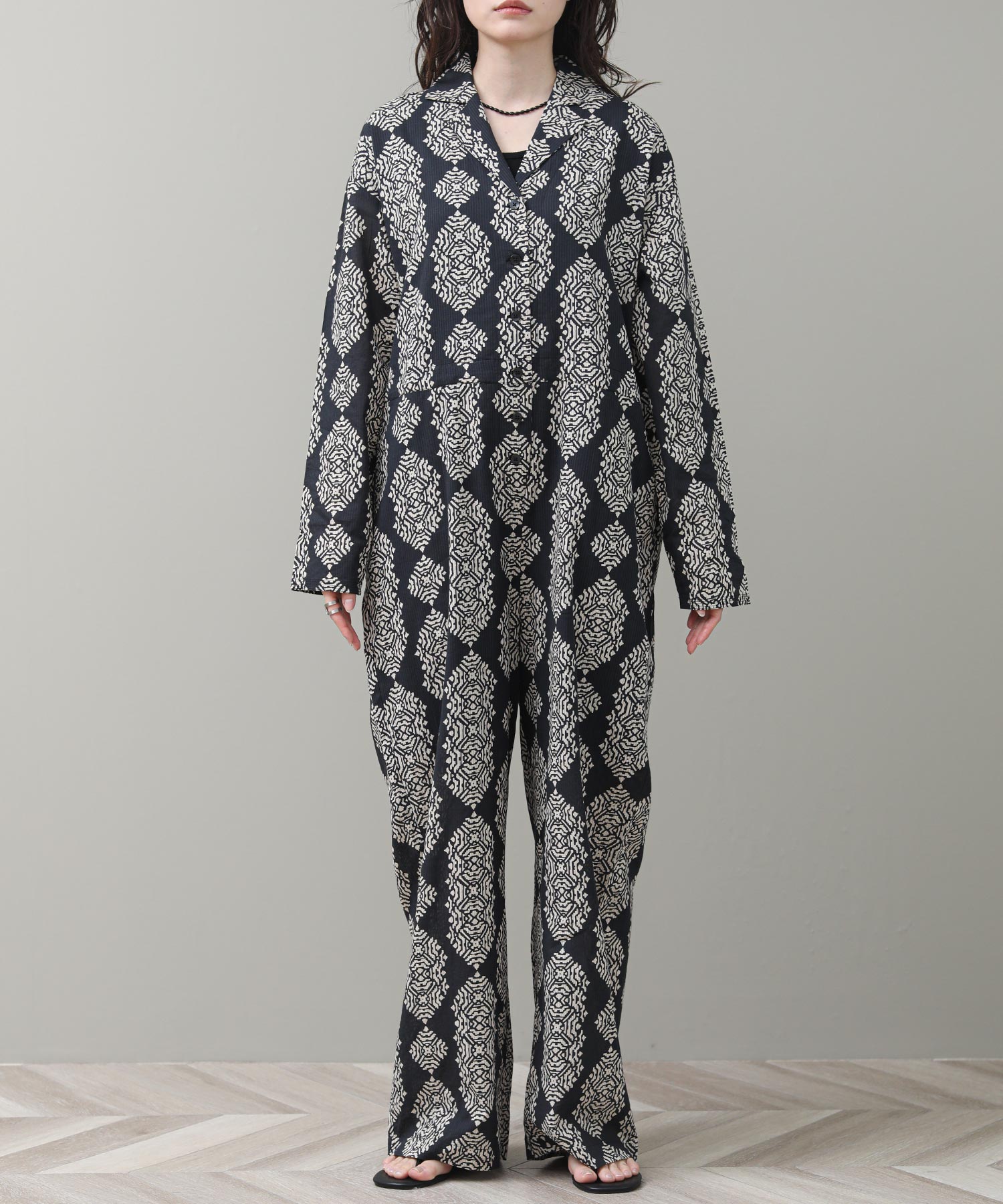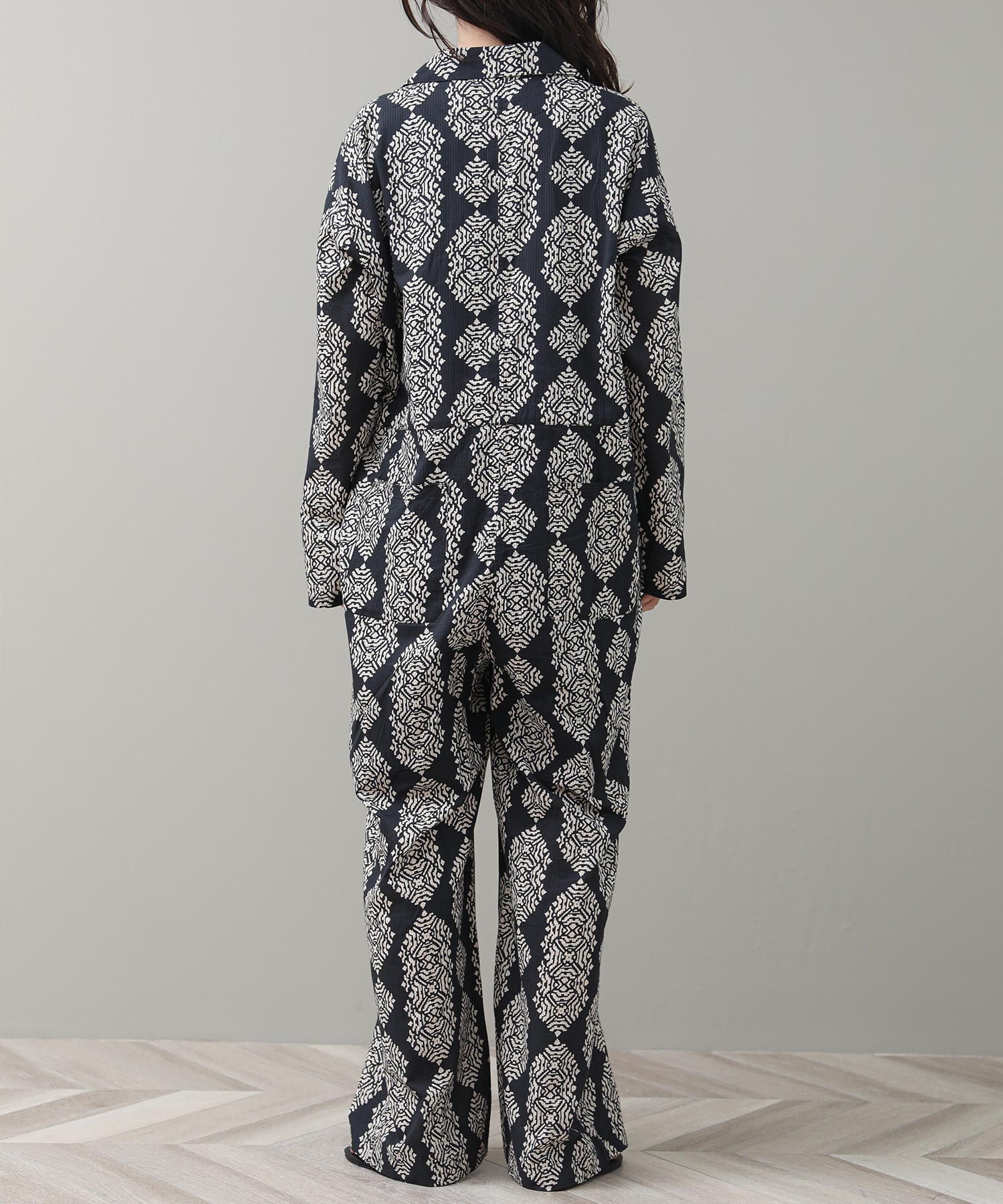 そのままストンと着てパジャマ風に、あるいはウエストをブラウジングしてシルエットを変えて楽しむこともできます。背面には便利なポケット付き。裏地付きなので、薄手素材でも透けを気にせず着用可能です。膝下は裏地を省き、風通しの良さと涼しさを実現しました。袖口の無駄な装飾を省いたシンプルなデザインが、軽やかな着心地をさらに際立たせます。70年代のヒッピーから着想を得たエスニックなジオメトリック柄は可愛らしすぎず、あえて辛口に仕上げて、モード感も感じられる一着。暑い季節でも心地よくまとえるコットン100%も嬉しいポイントです。