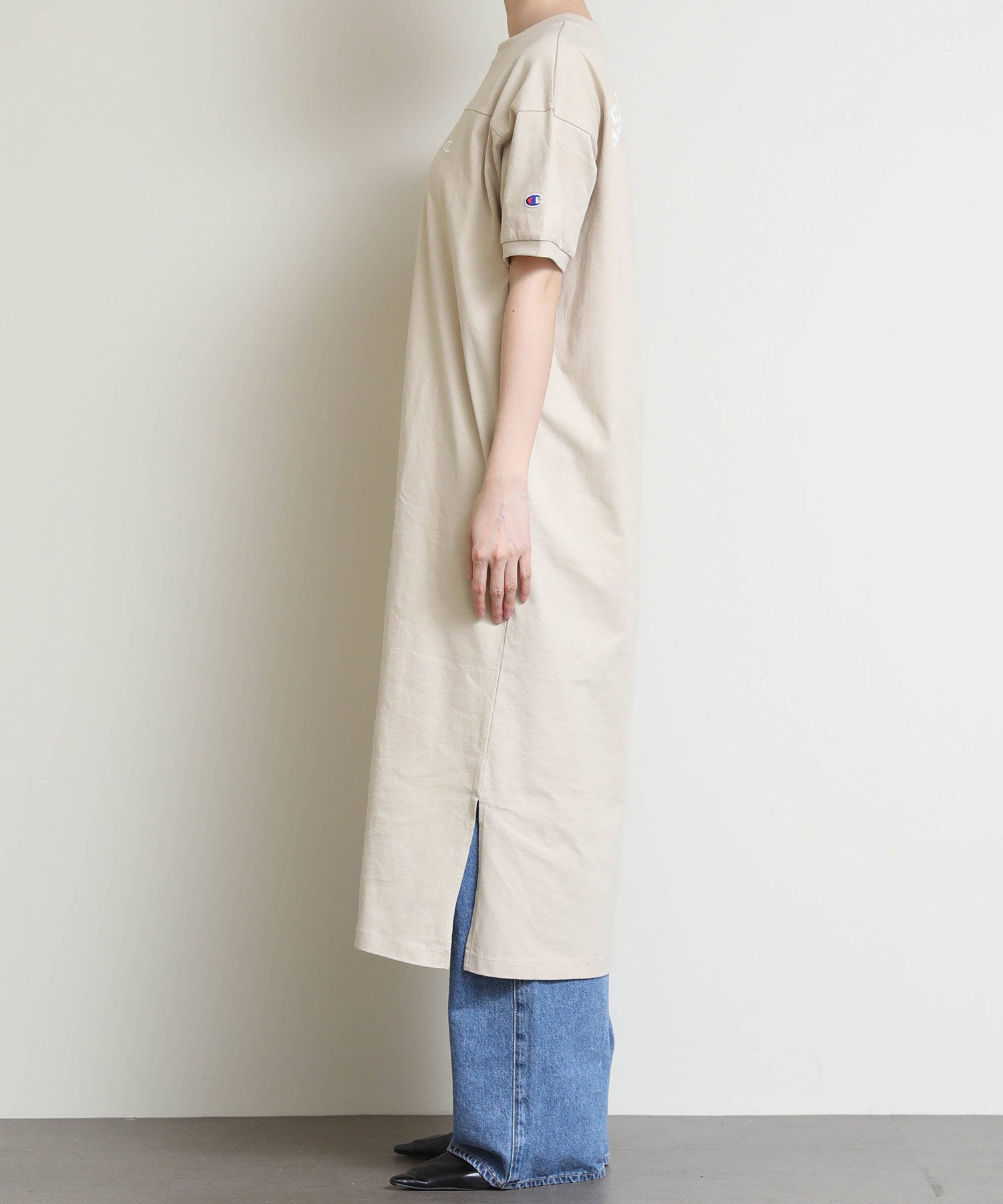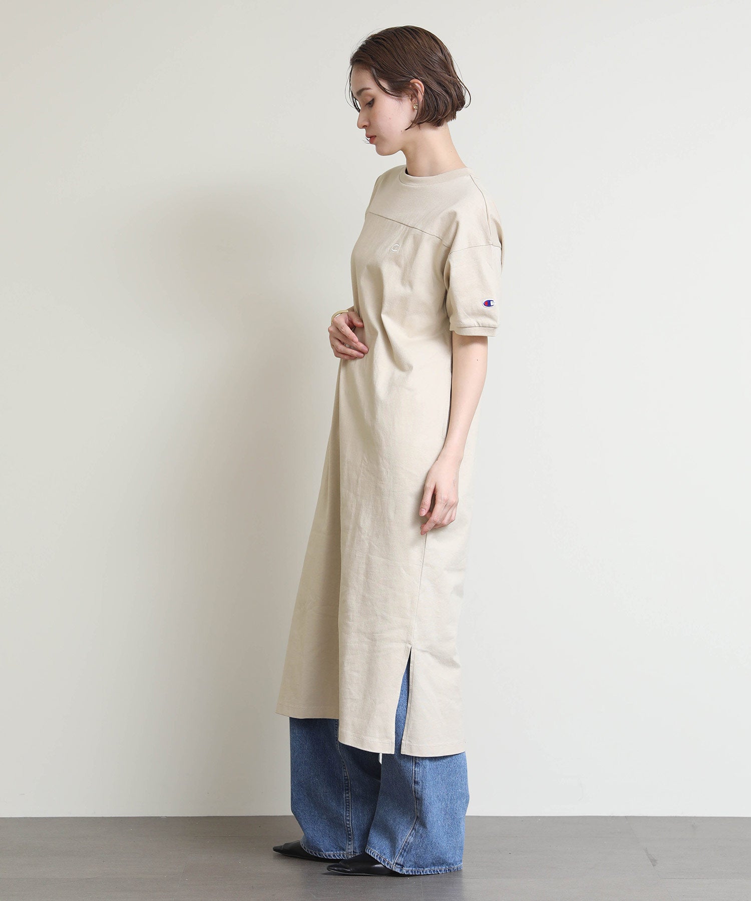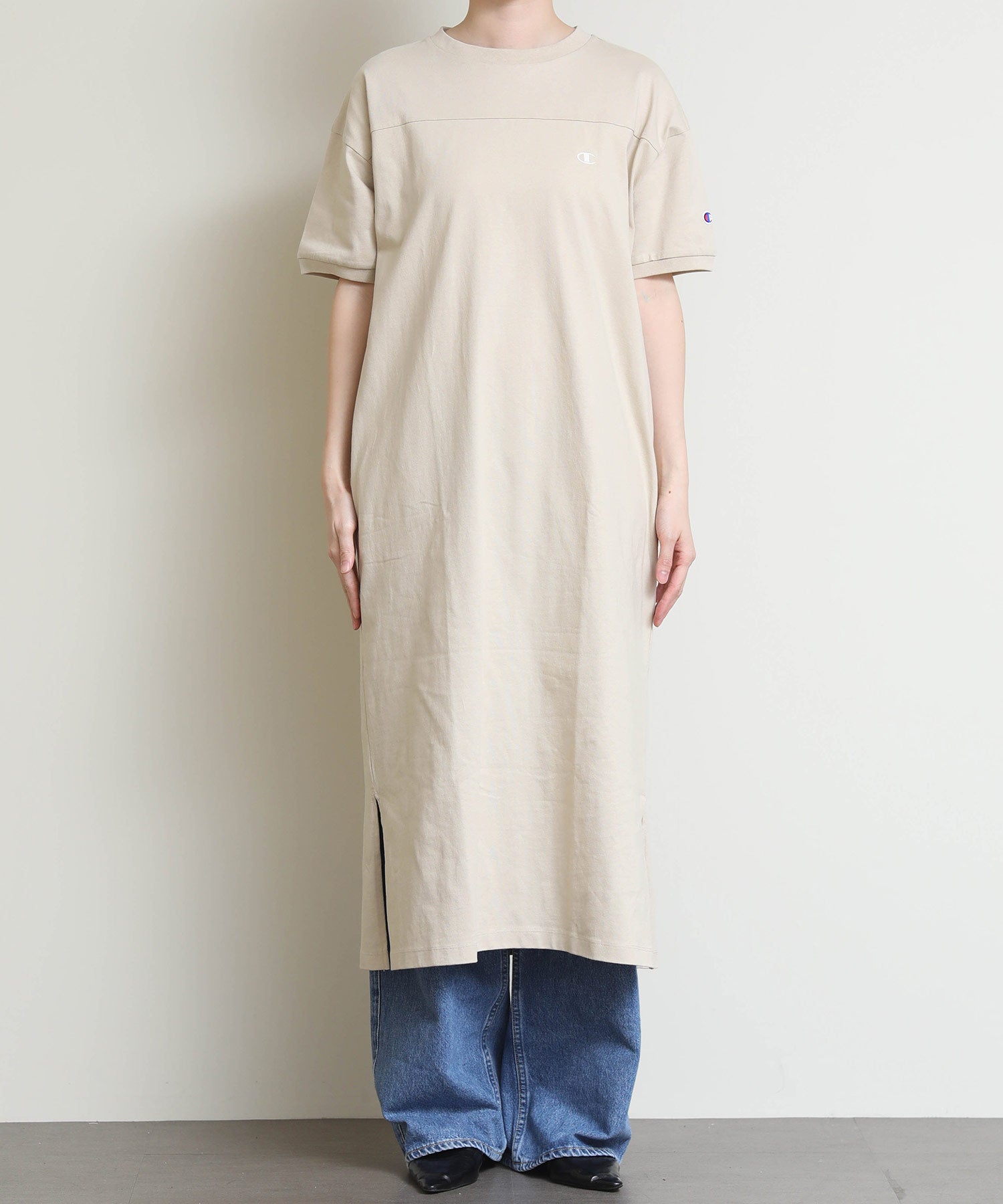 しっかりとしたコットン100%の天竺素材を使用し、左胸にChampionロゴをあしらったショートスリーブワンピース。