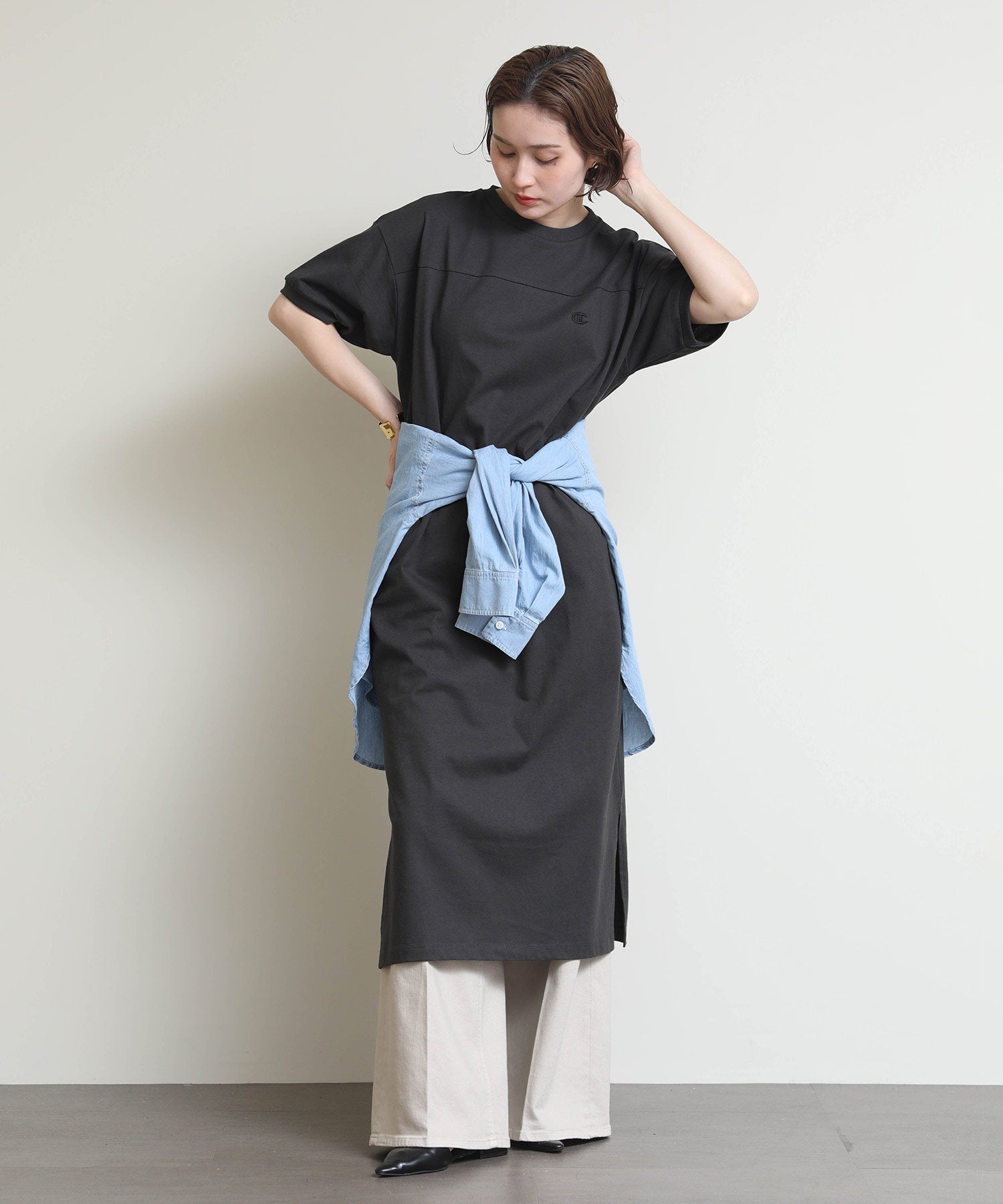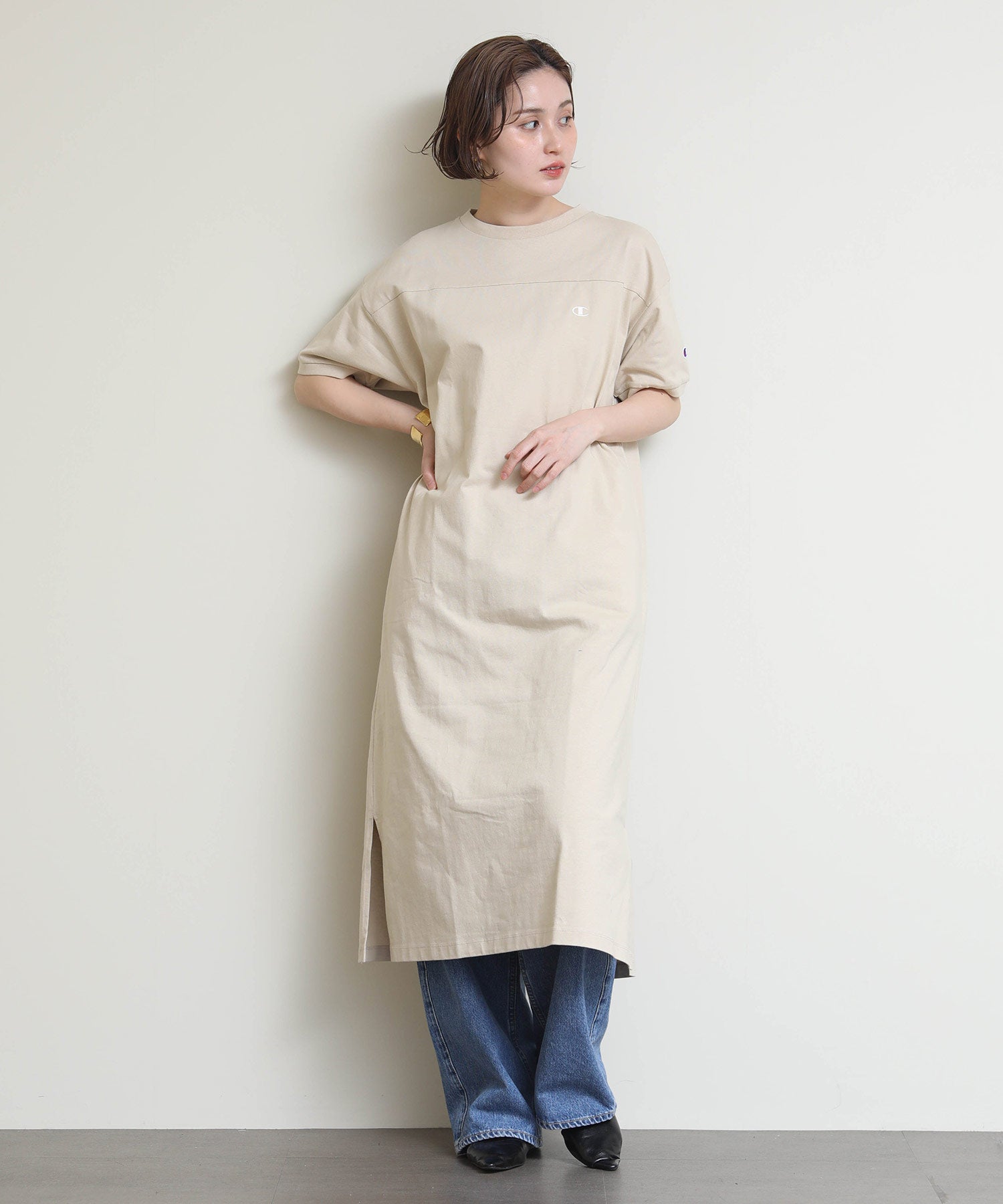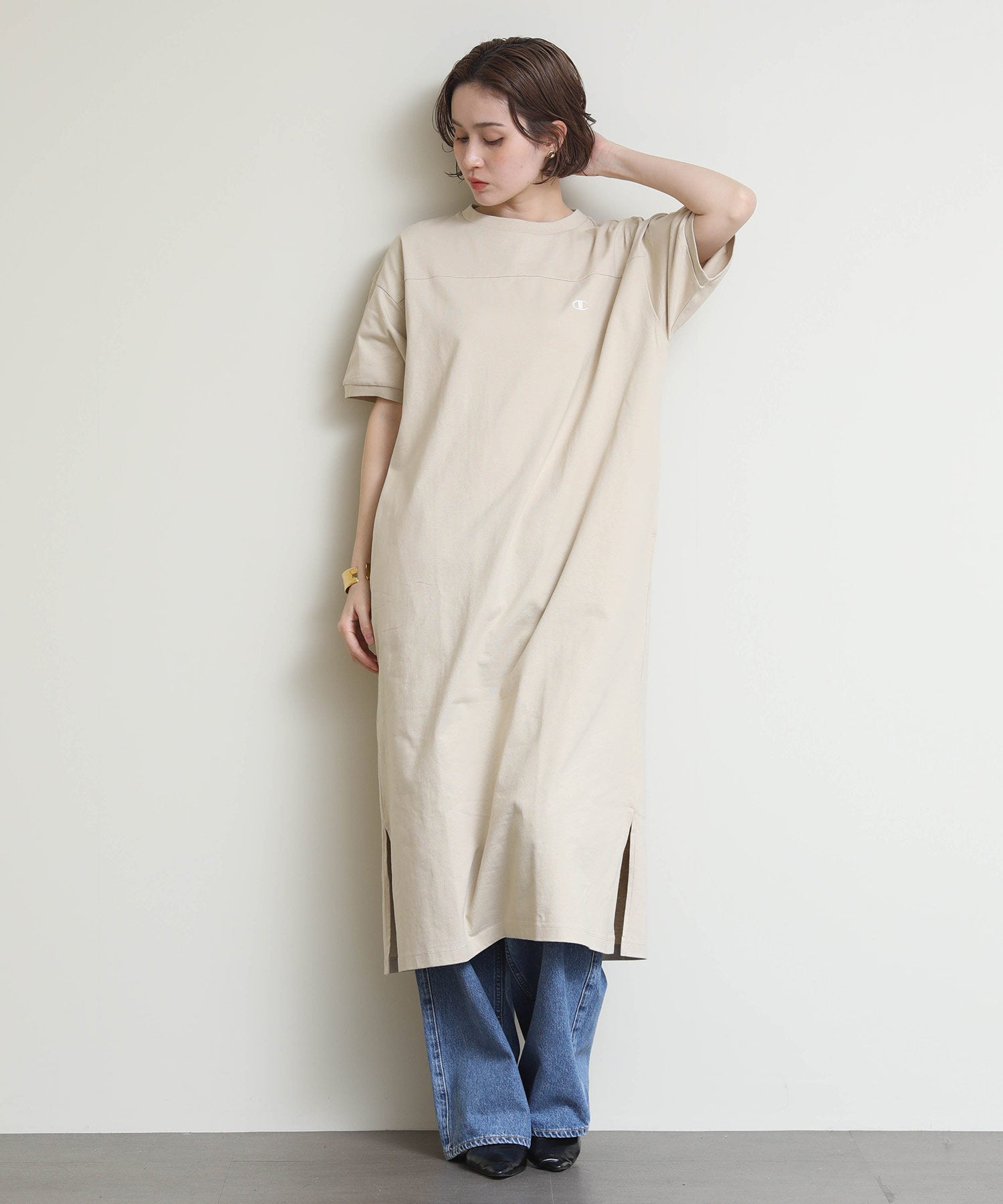 しっかりとしたコットン100%の天竺素材を使用し、左胸にChampionロゴをあしらったショートスリーブワンピース。