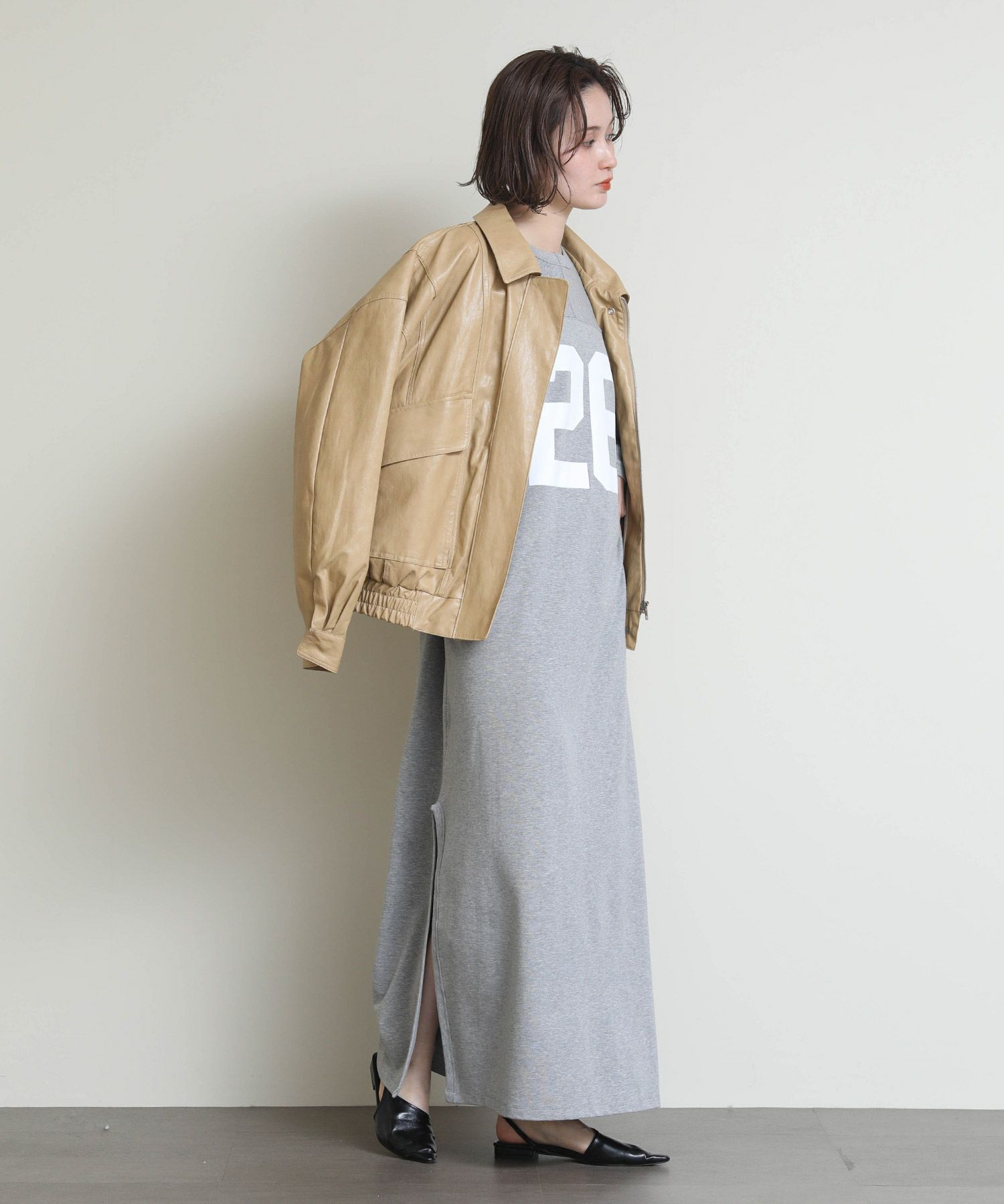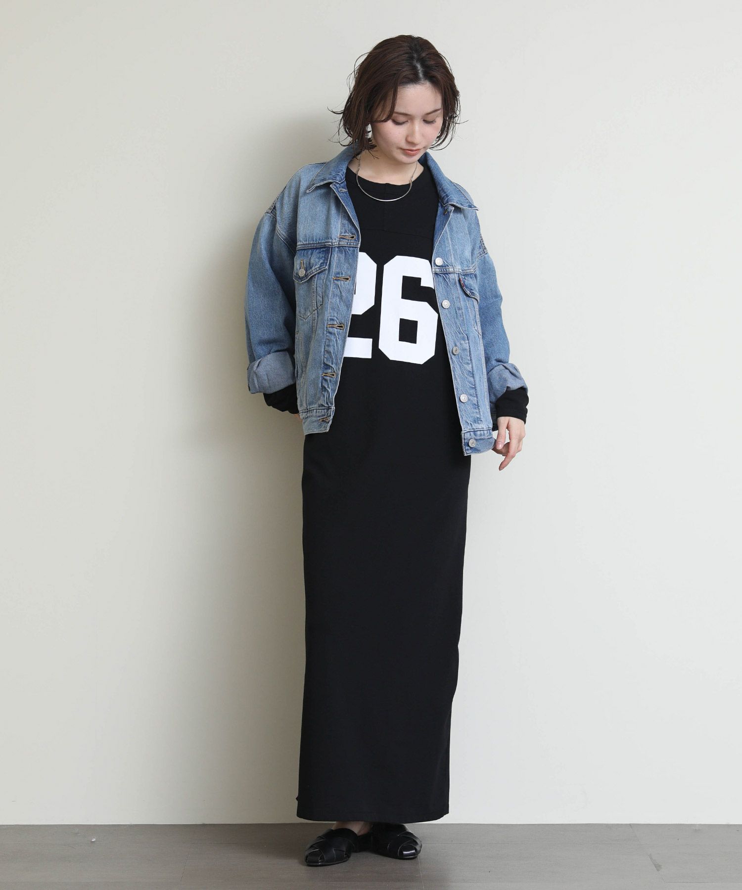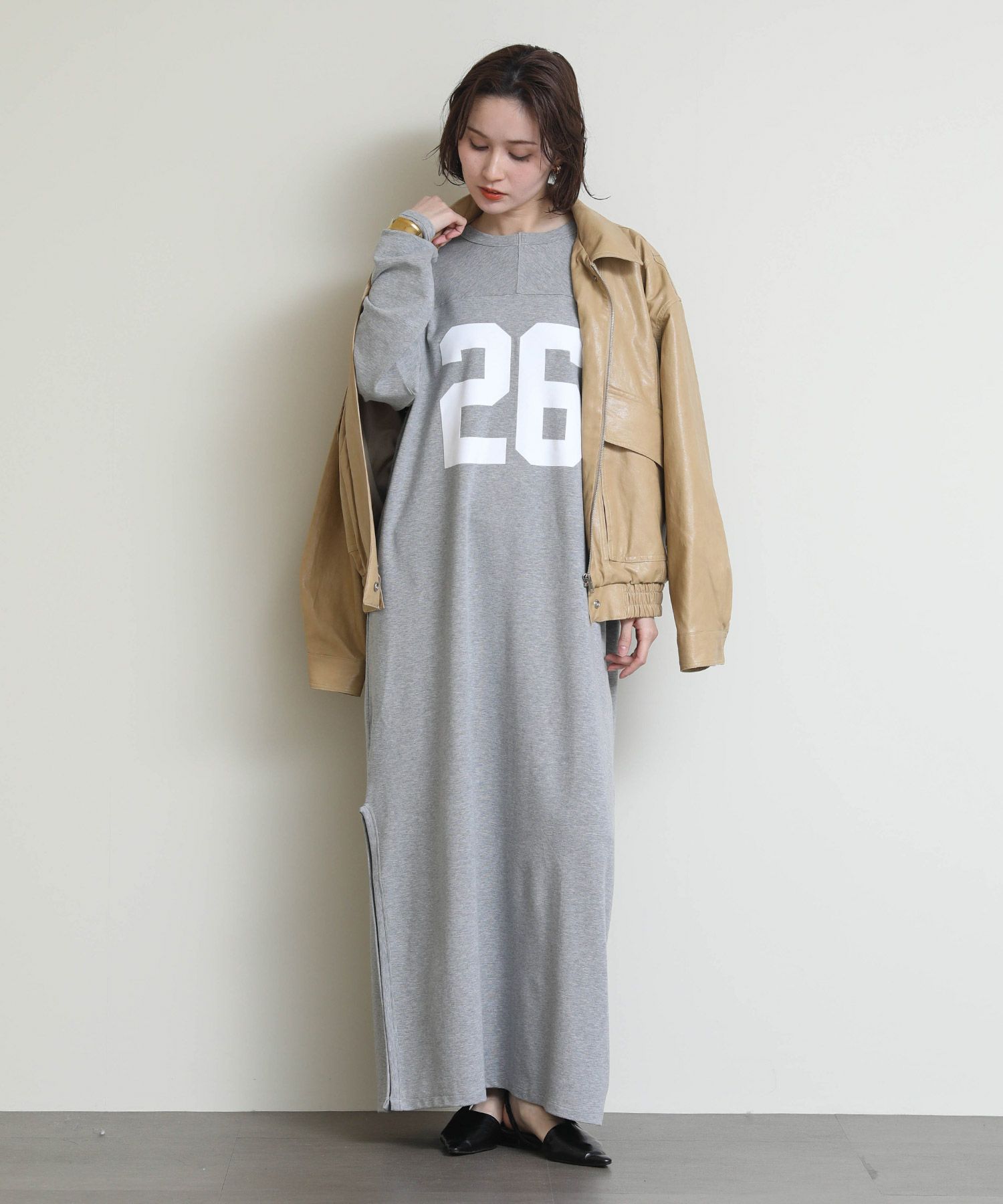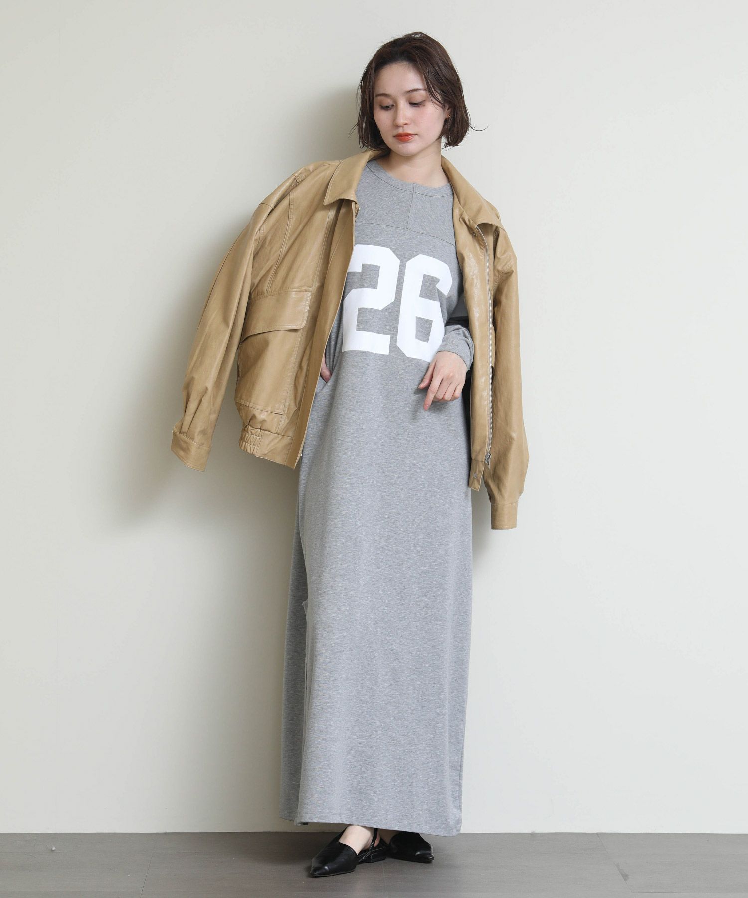 存在感のある「26」ロゴと、程よいIラインシルエットがラフなのに大人っぽい印象を演出します。