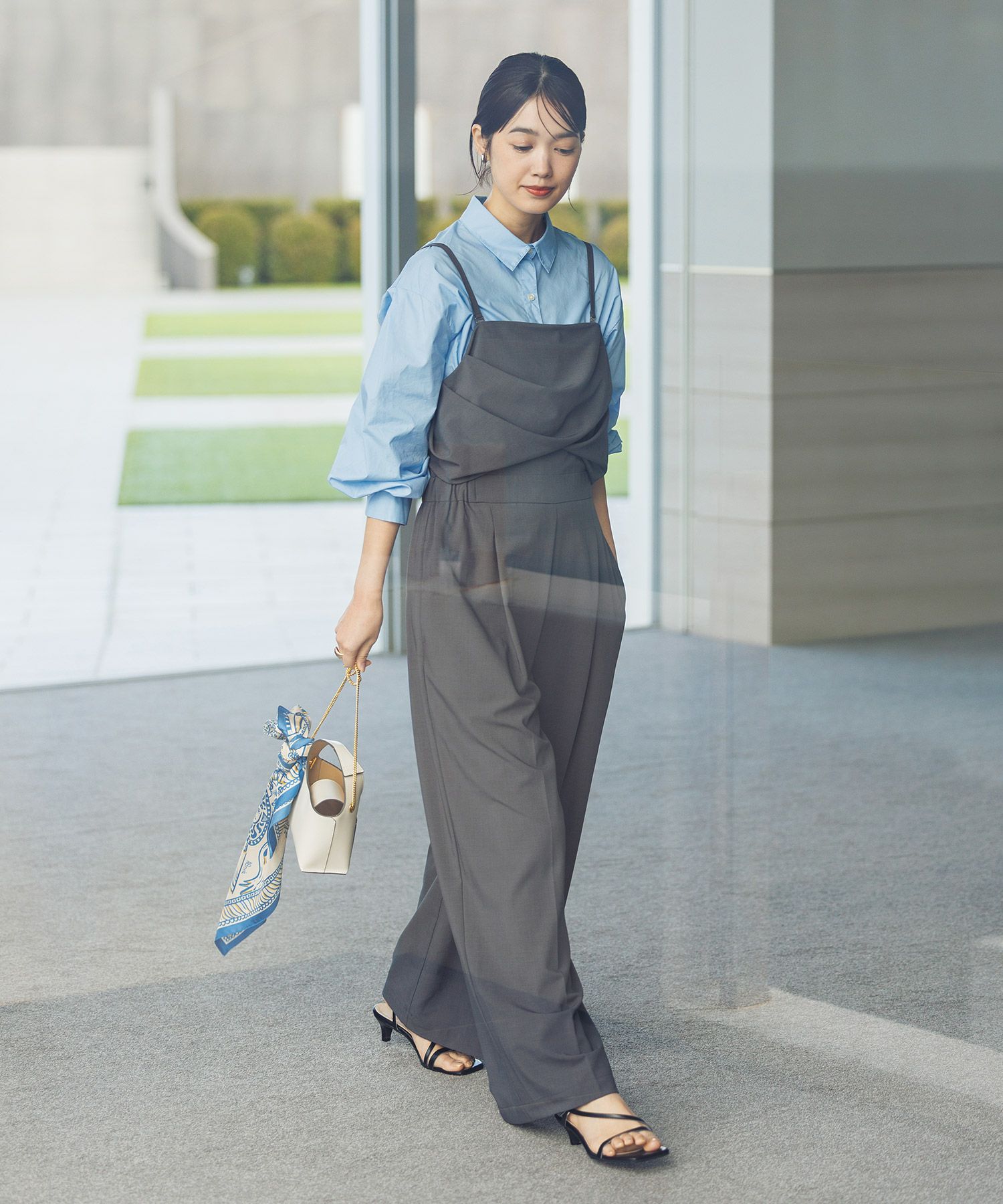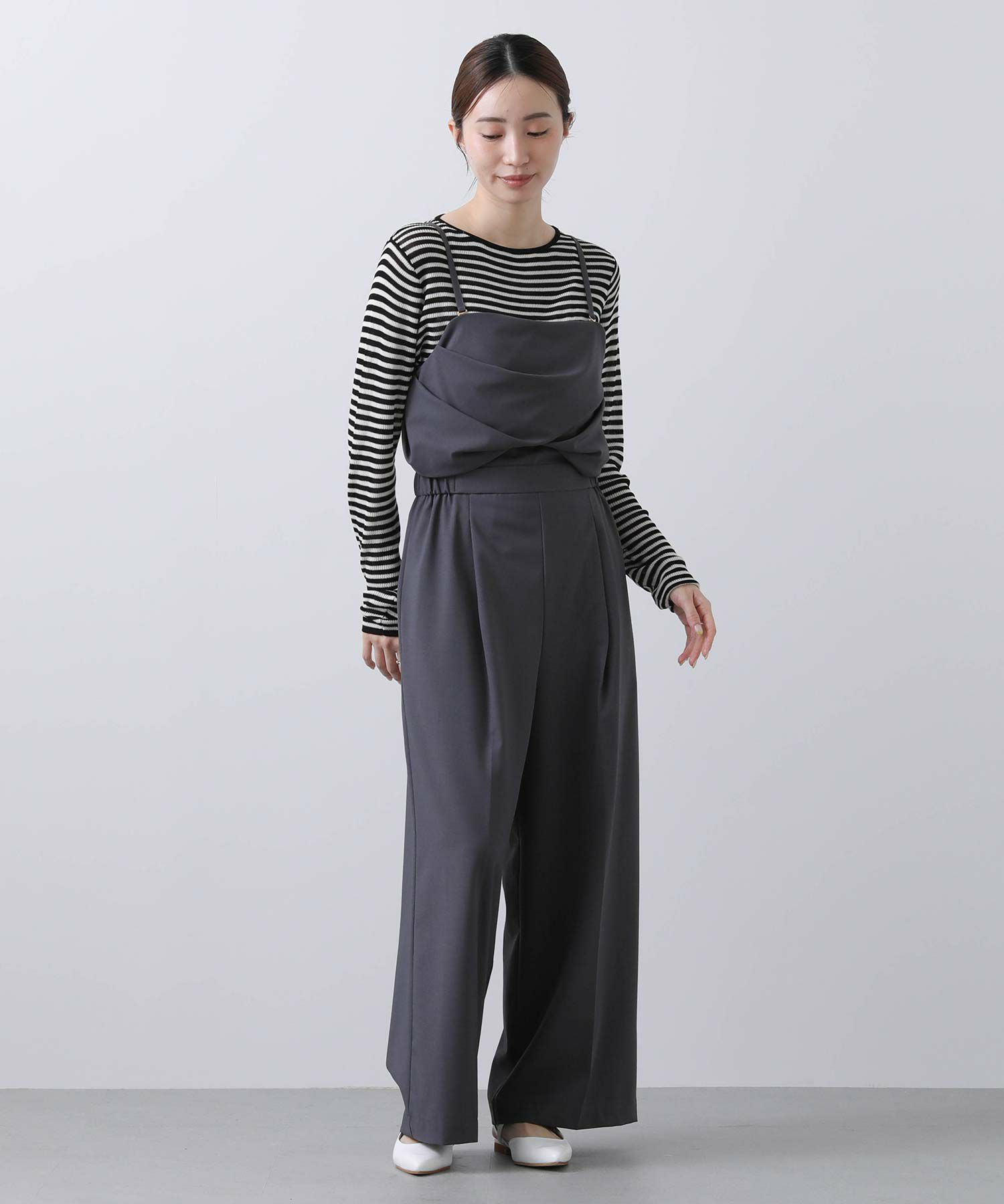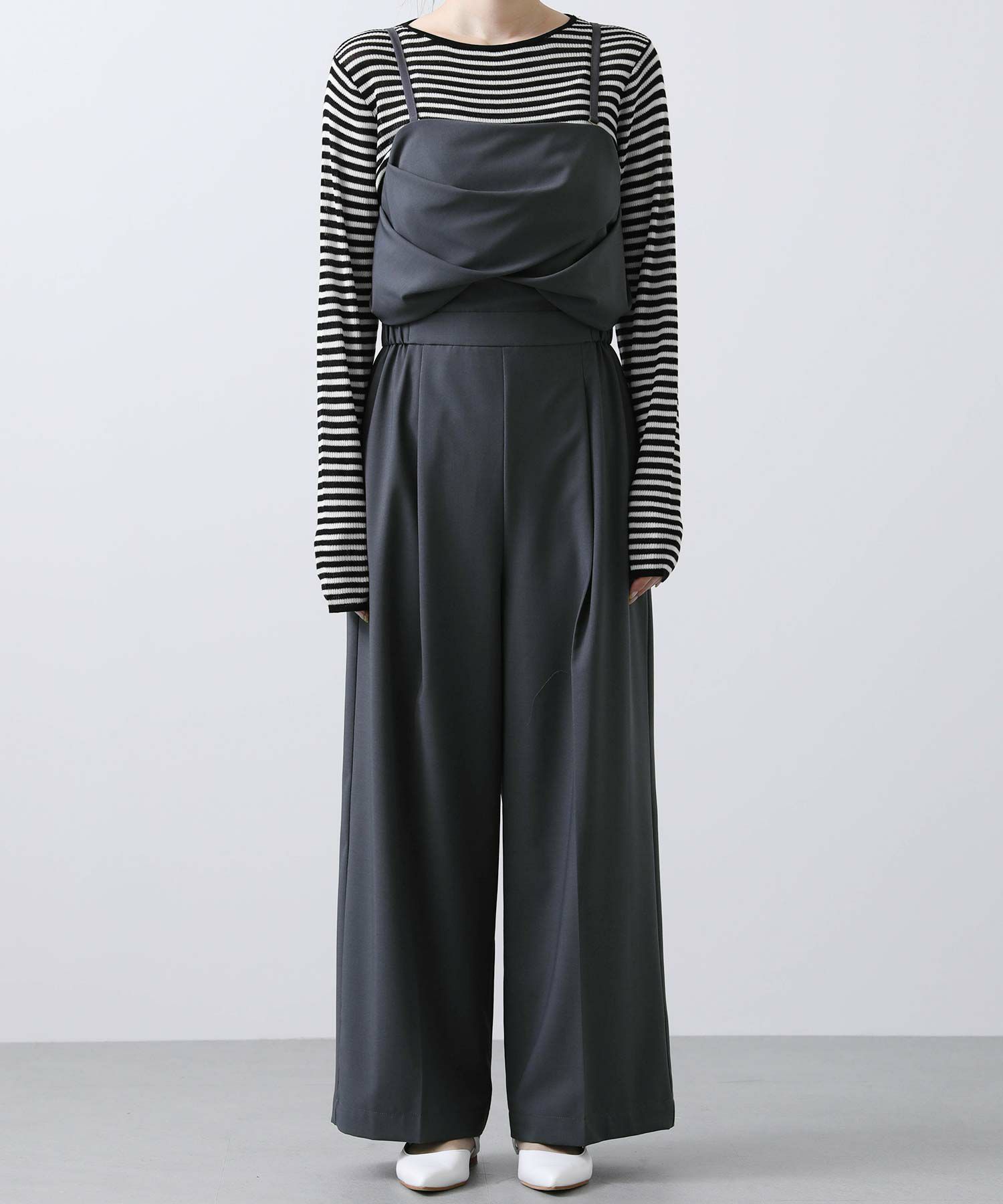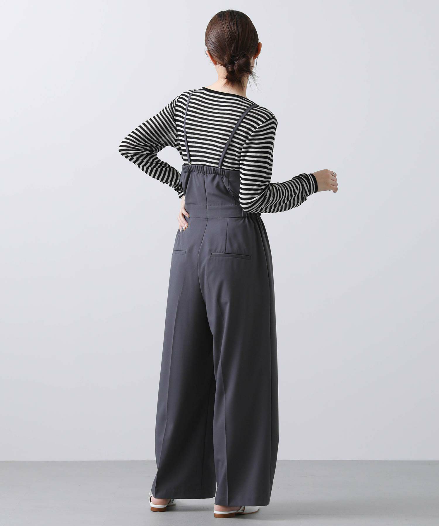ボトムは程よいワイドシルエットで身体のラインを拾いすぎず肩紐で丈を調整できるのも嬉しいポイント。