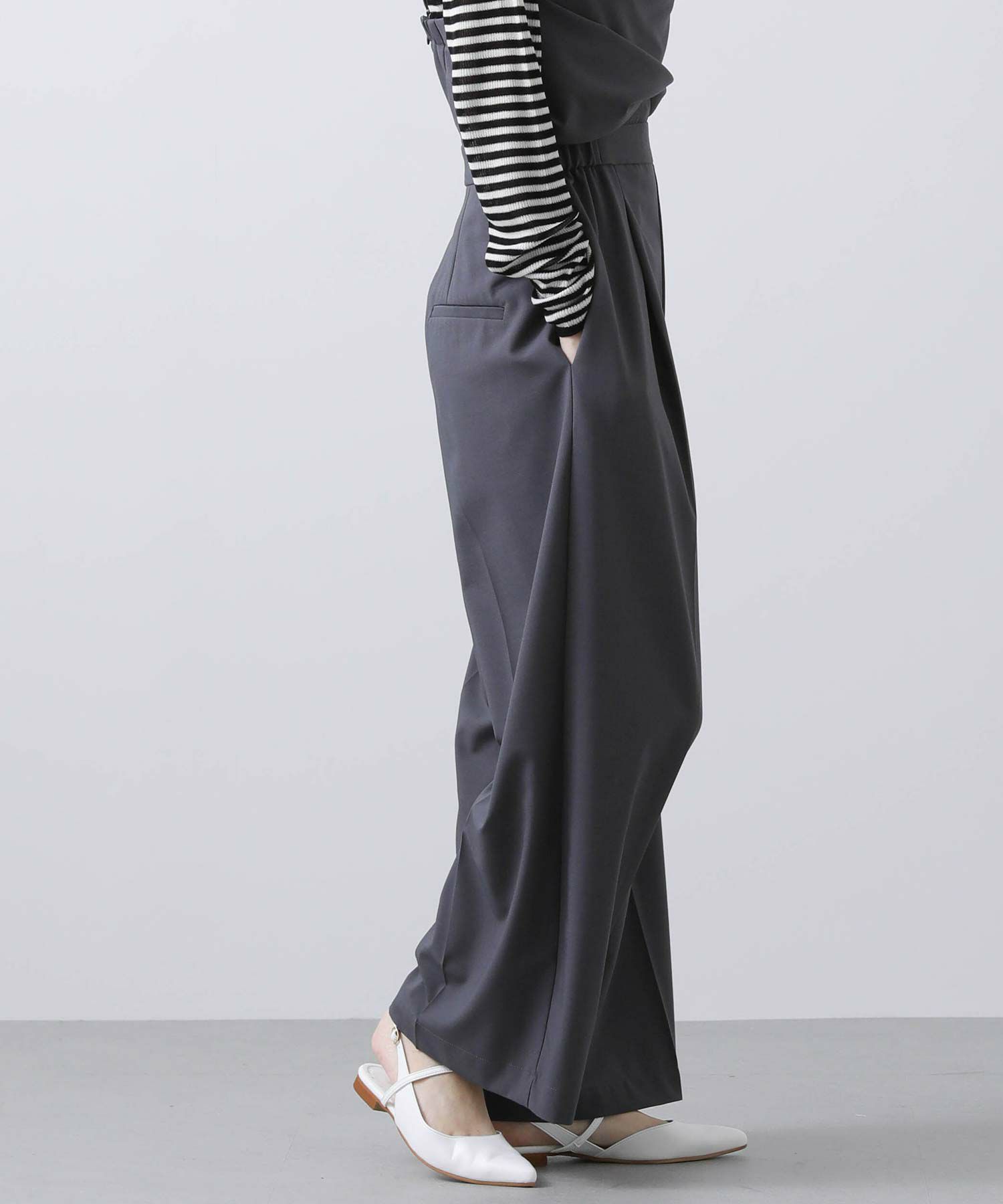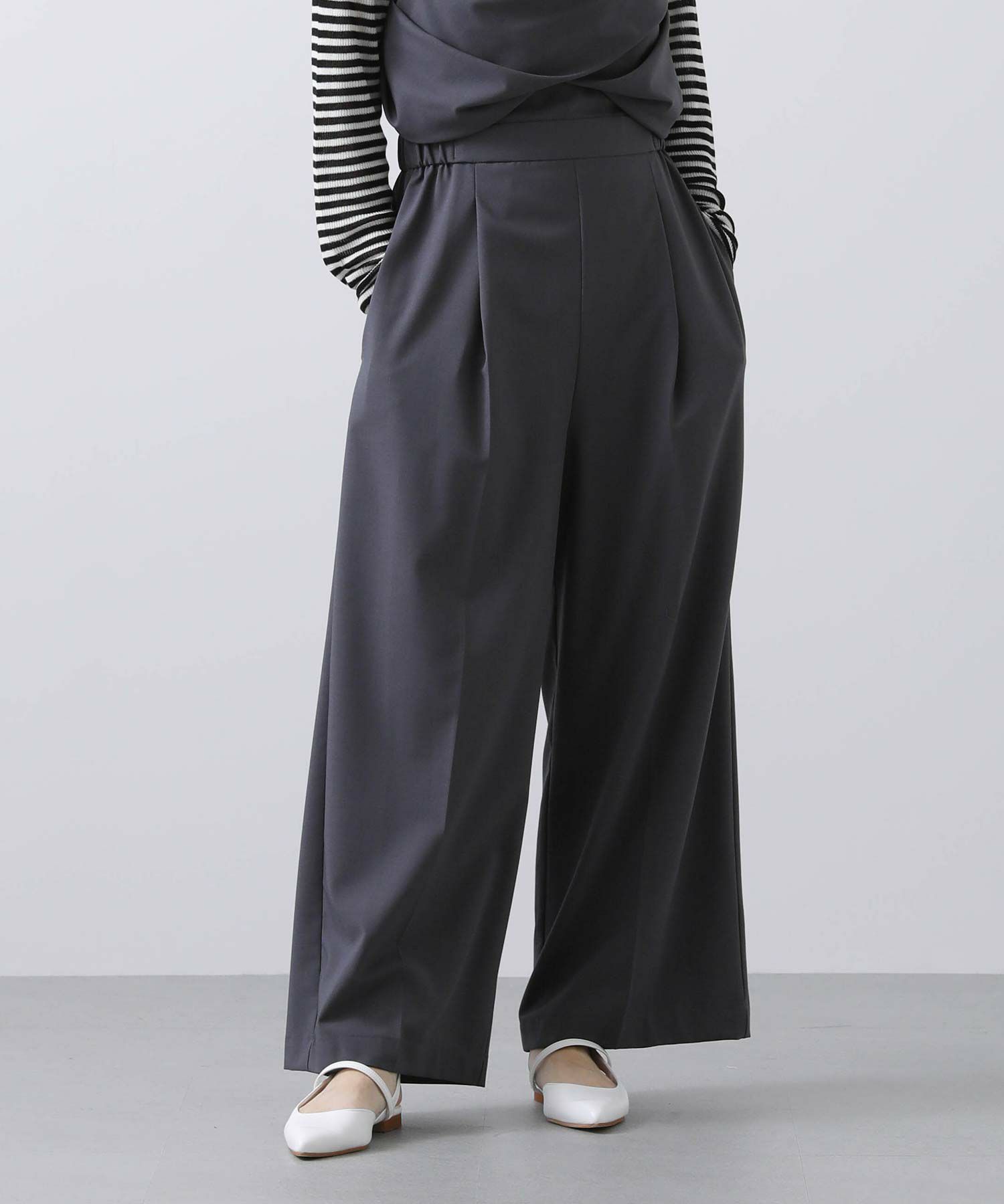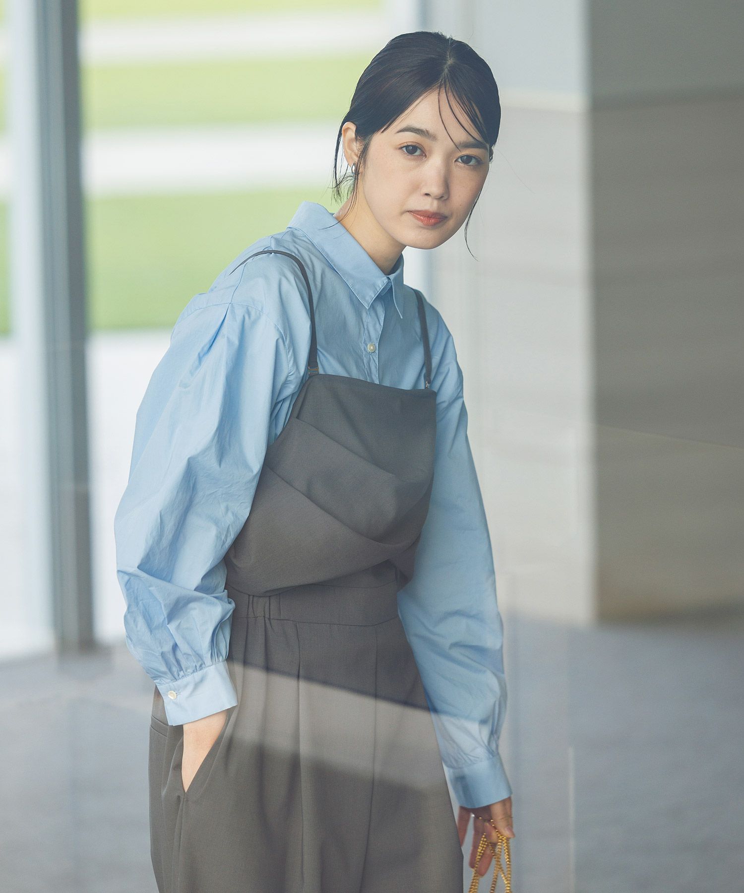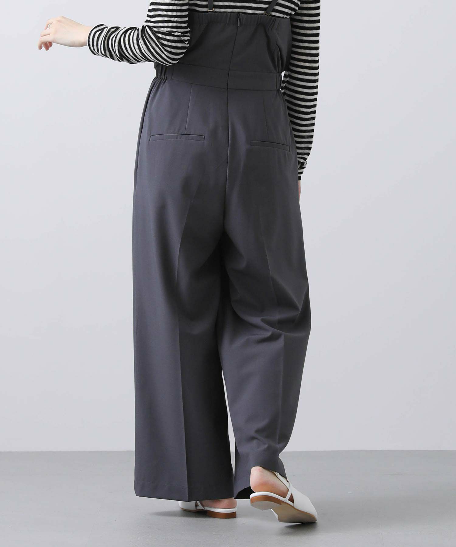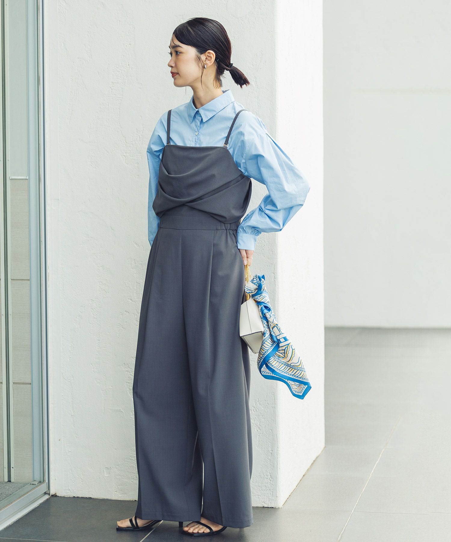 ボトムは程よいワイドシルエットで身体のラインを拾いすぎず肩紐で丈を調整できるのも嬉しいポイント。
