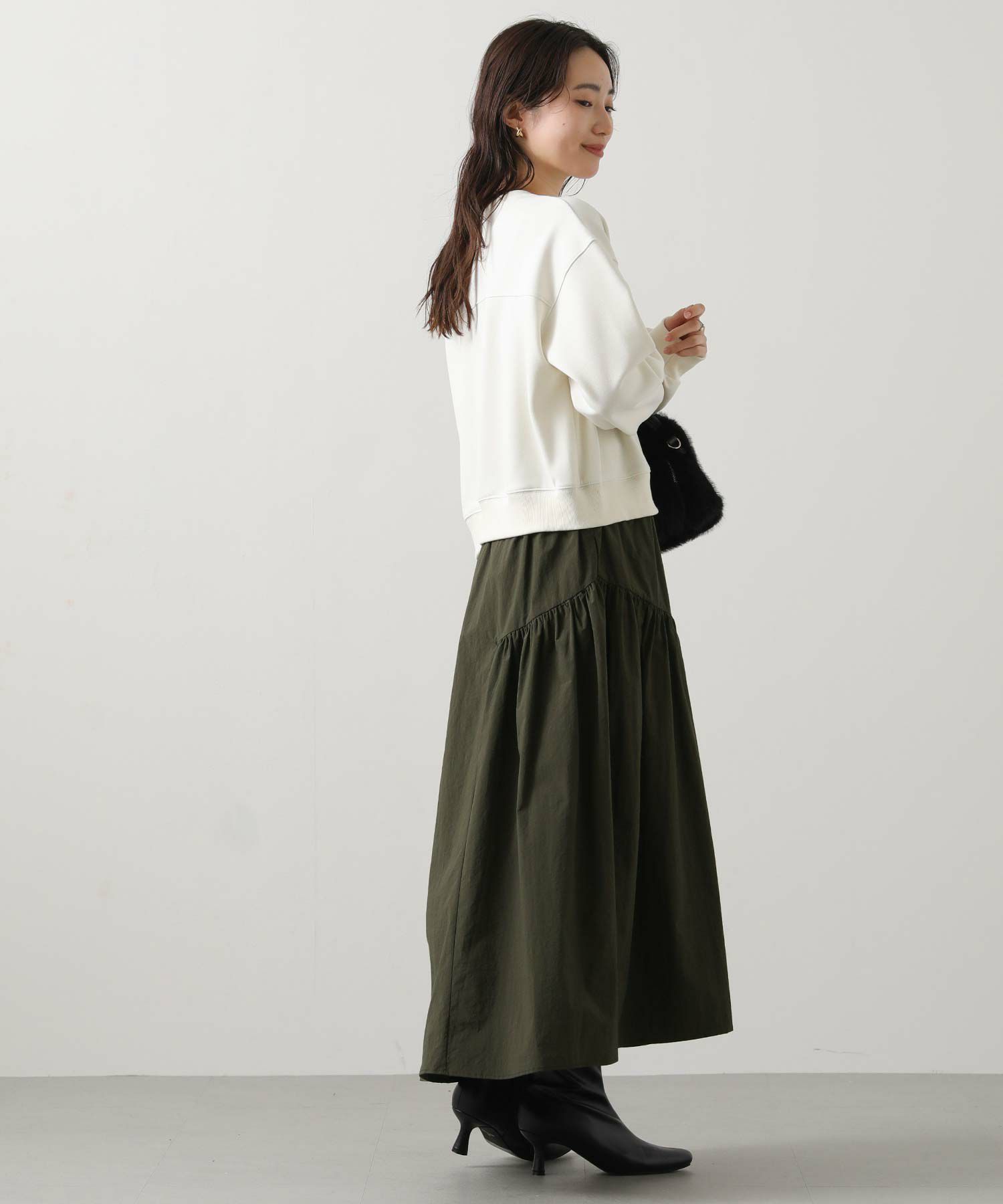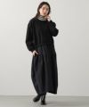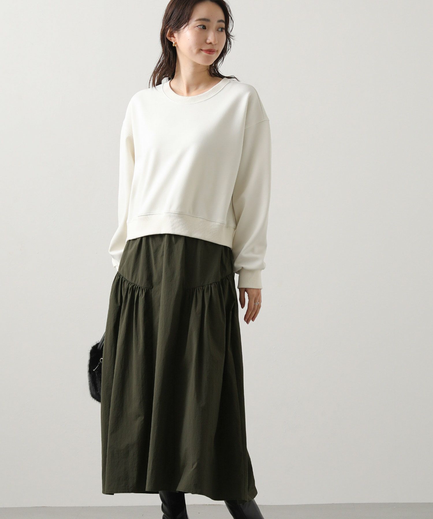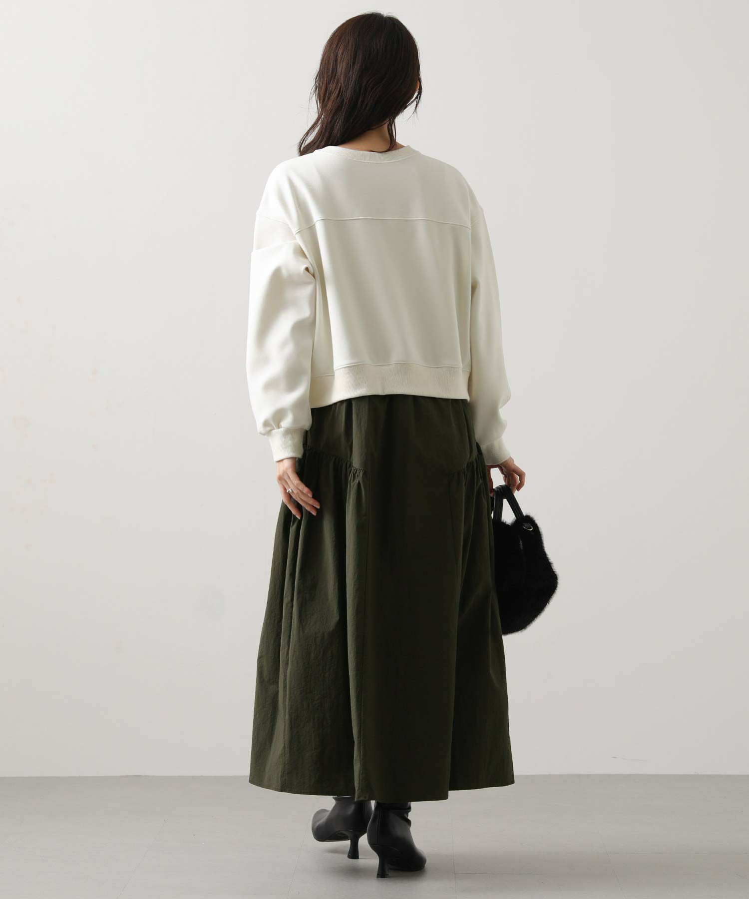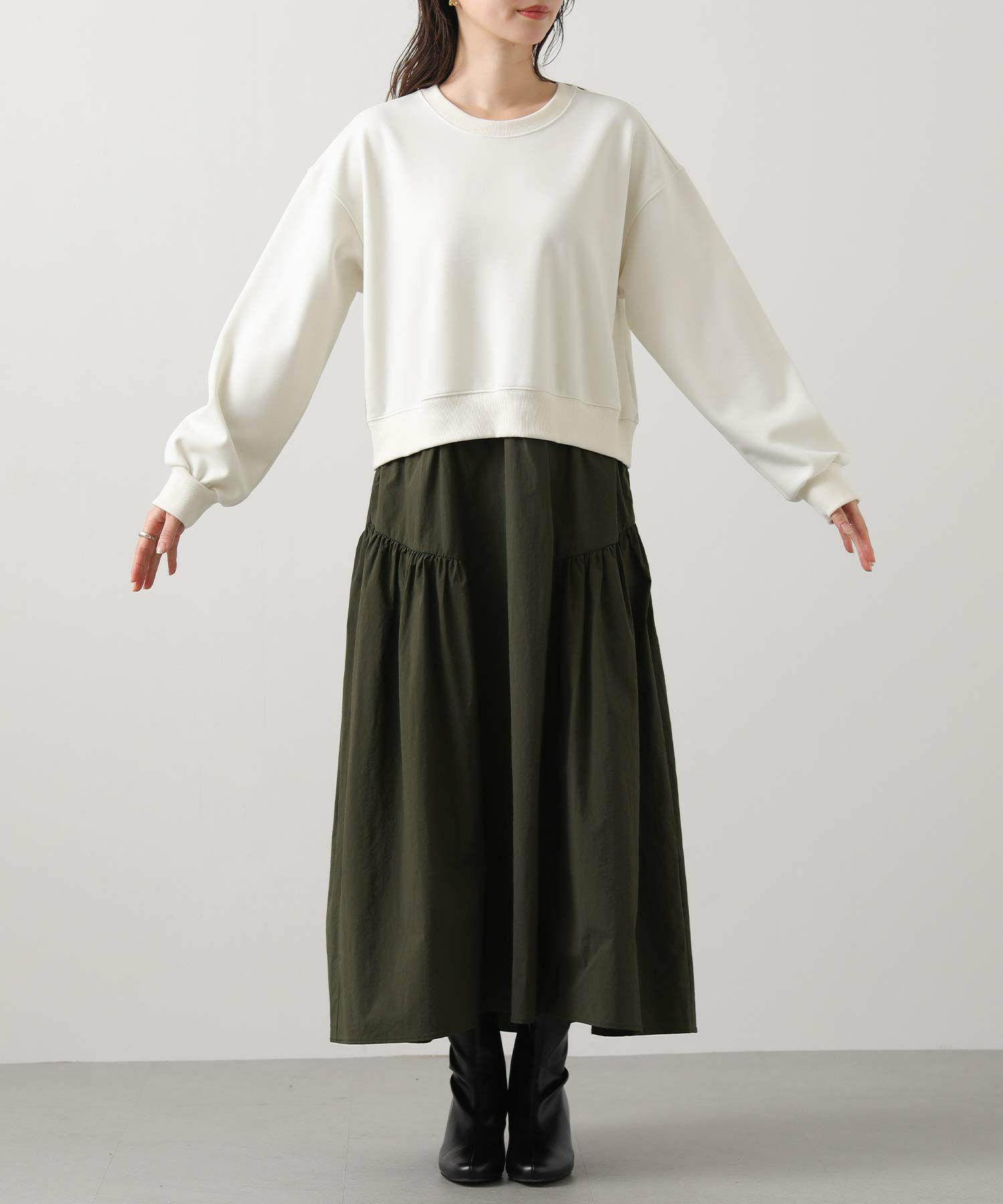 裏起毛カットソーとワッシャー素材をドッキングした異素材ワンピース。