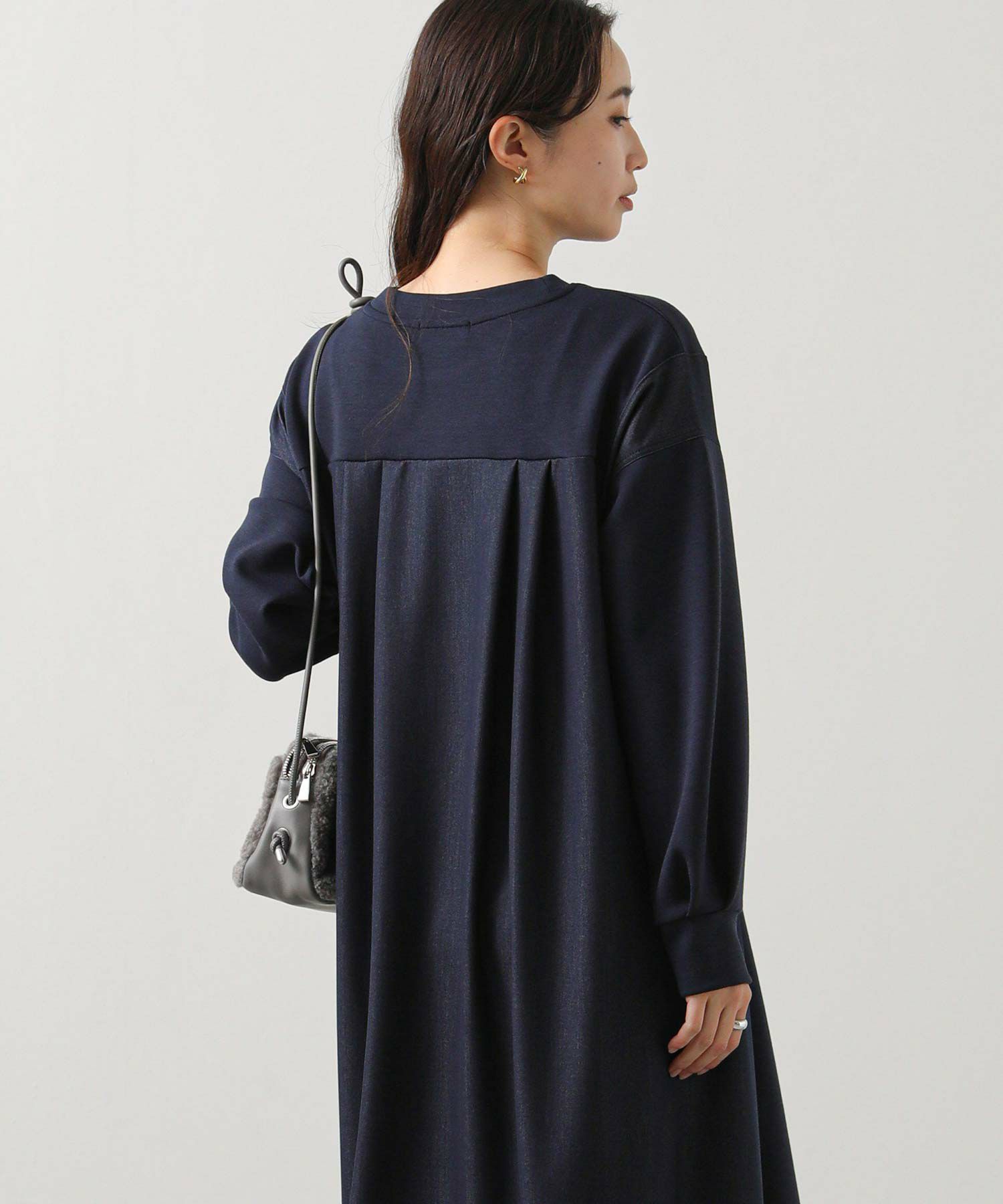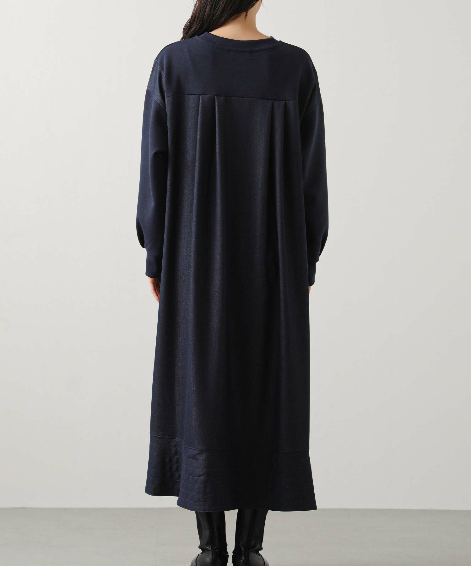 滑らかな素材感のTRデニムとダンボール素材をドッキングしたフレアワンピース。
