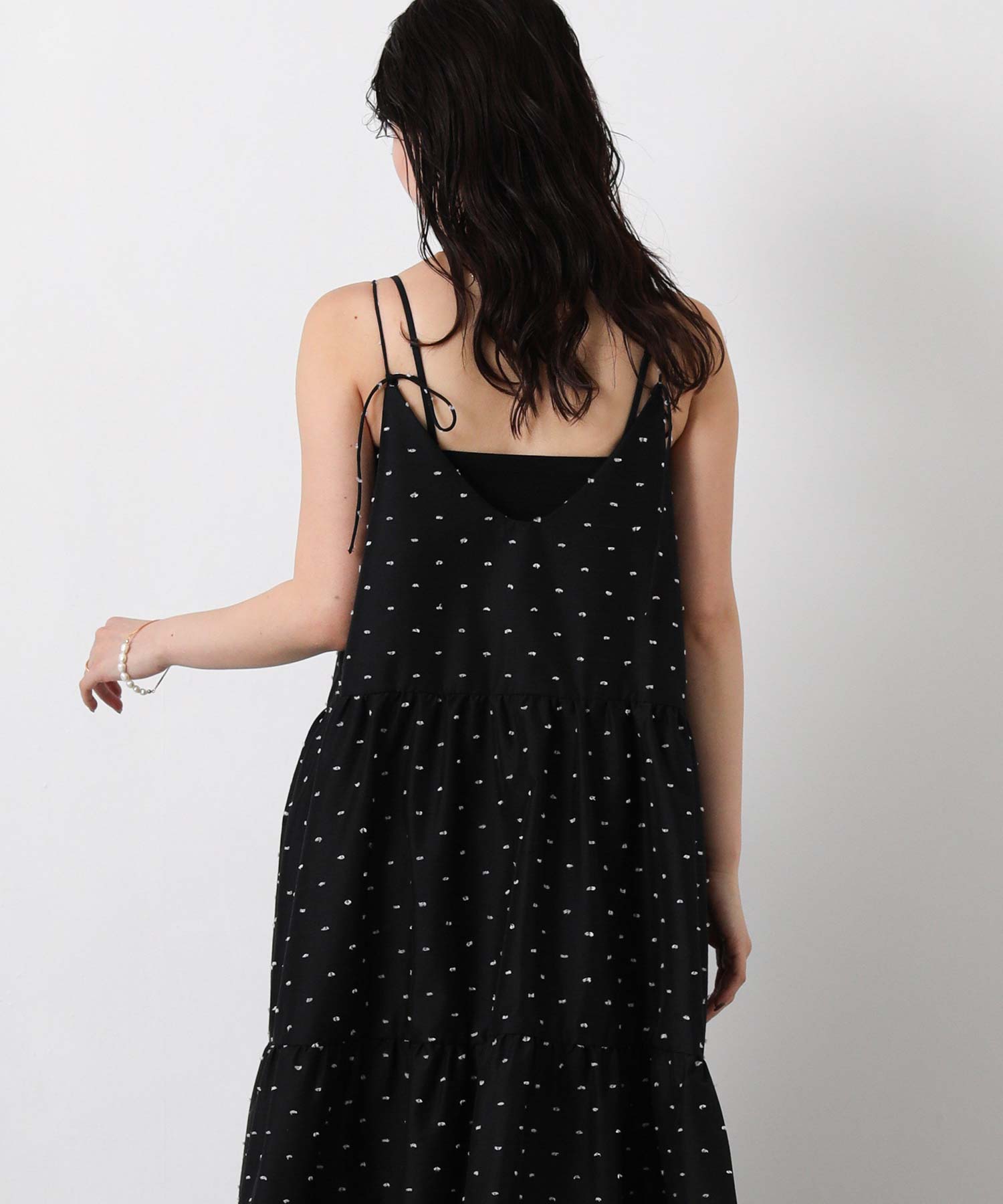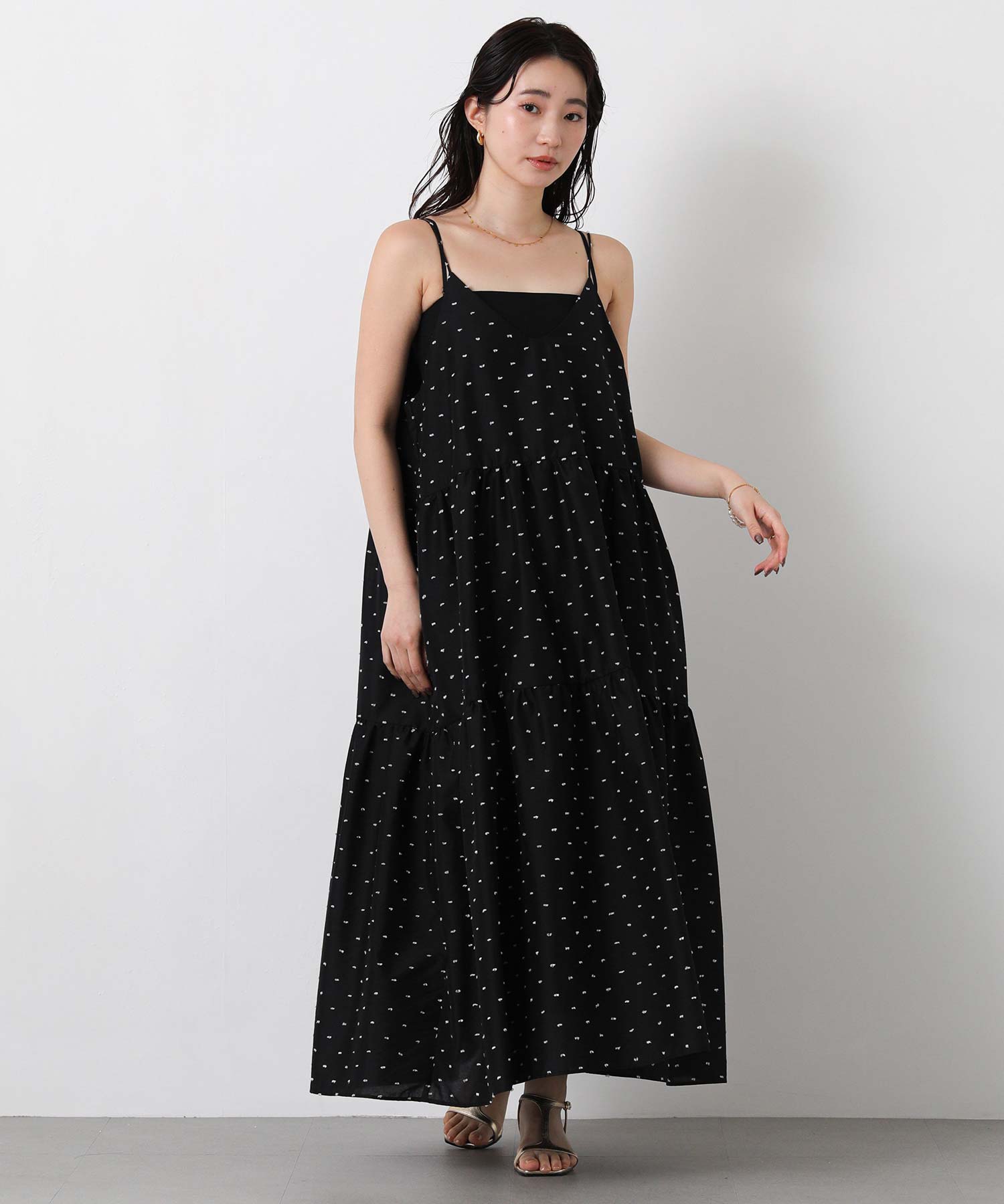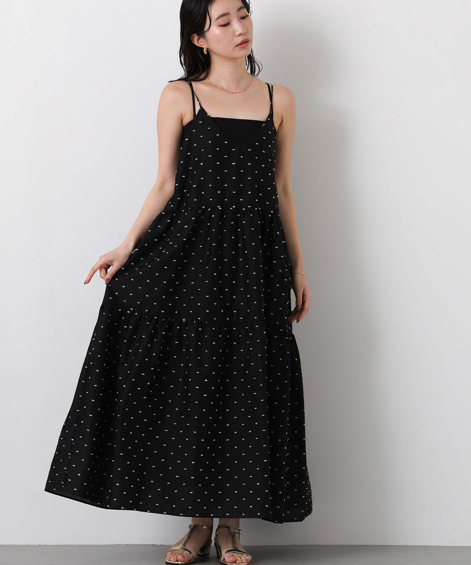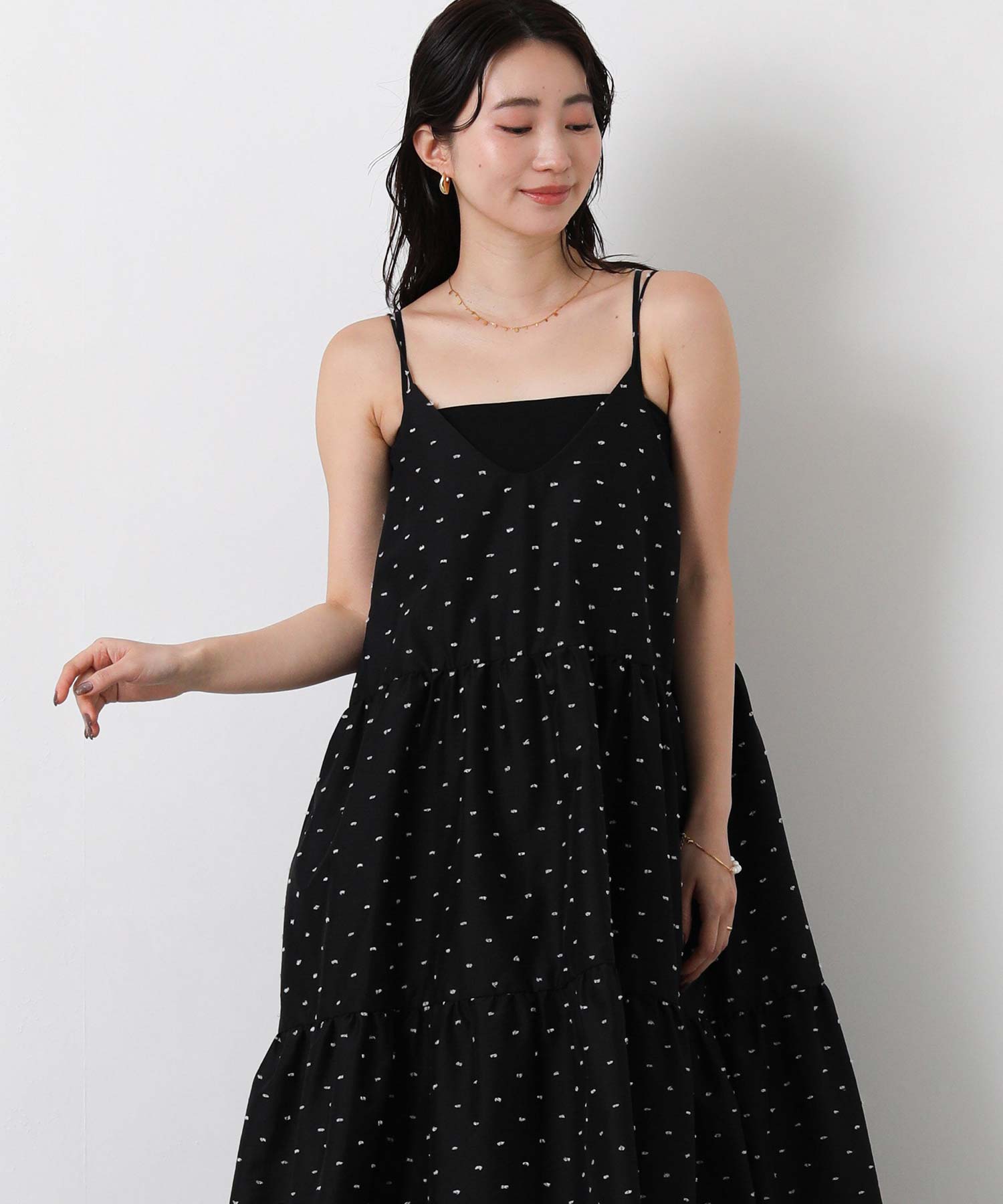 1枚で華やかな印象にしてくれるドットキャミワンピ。