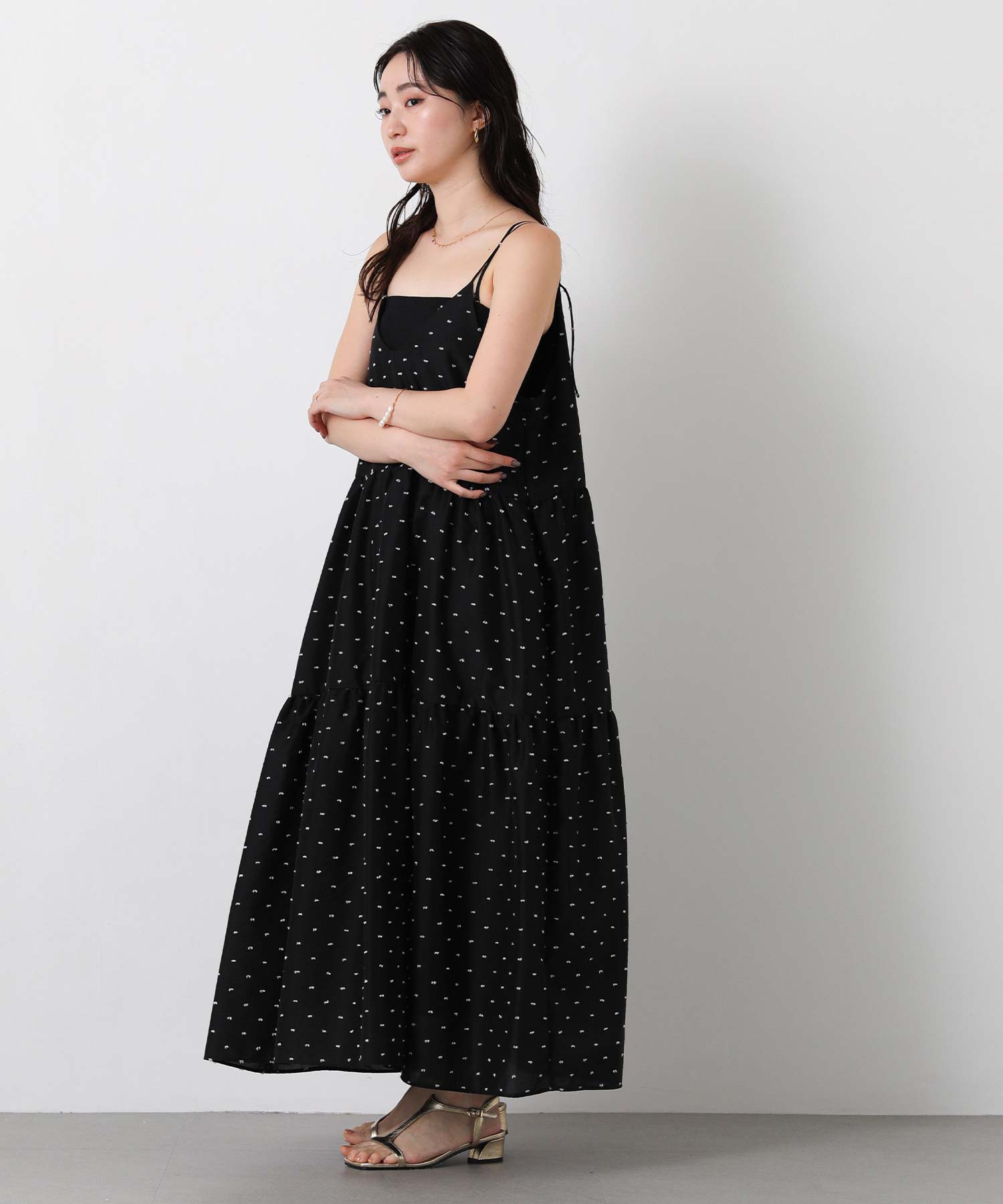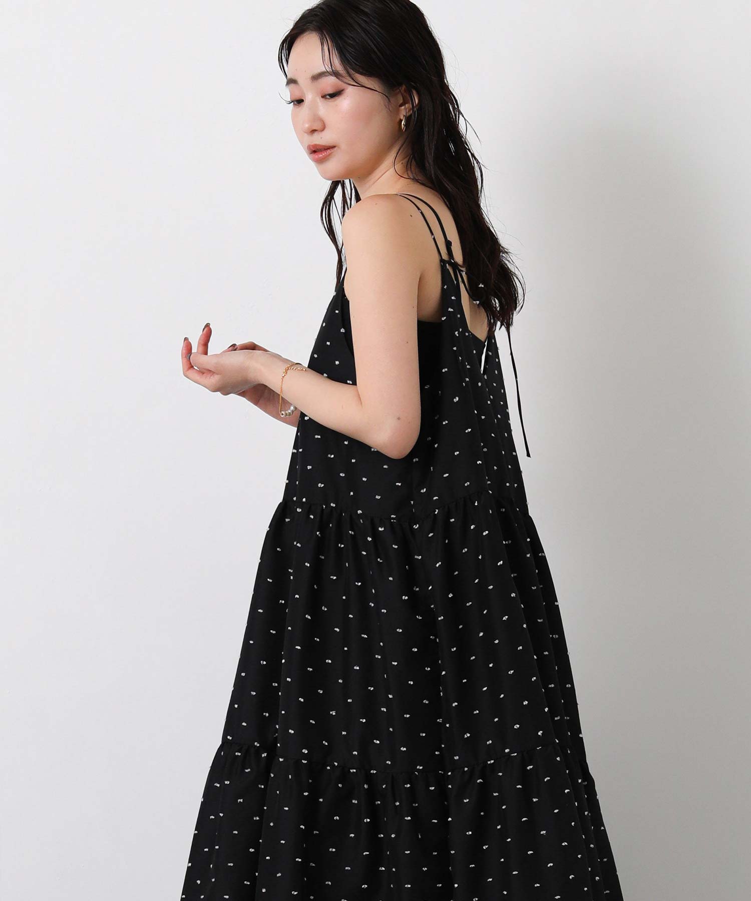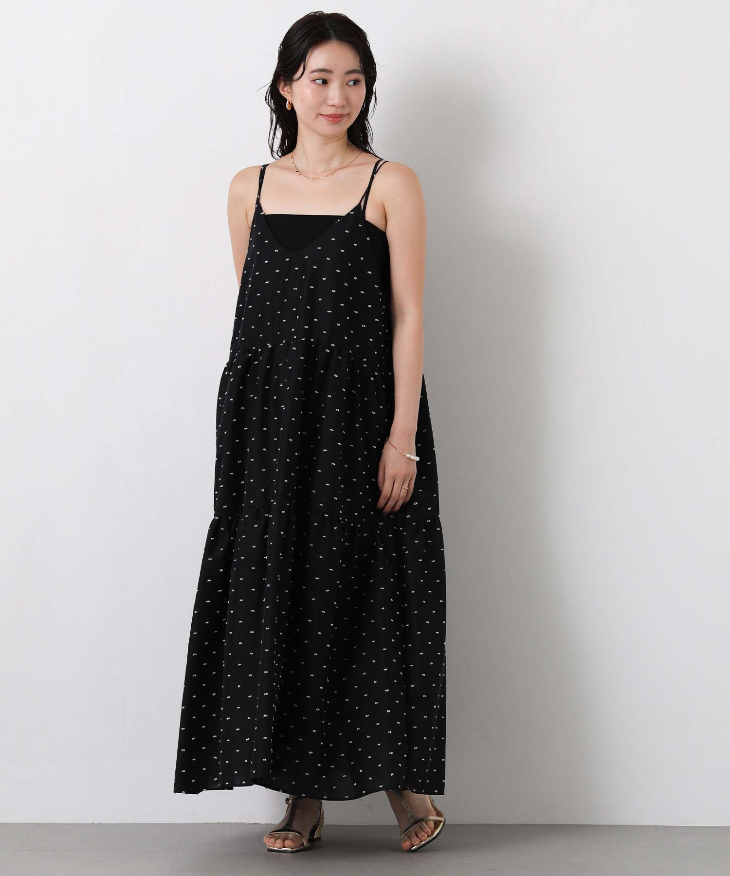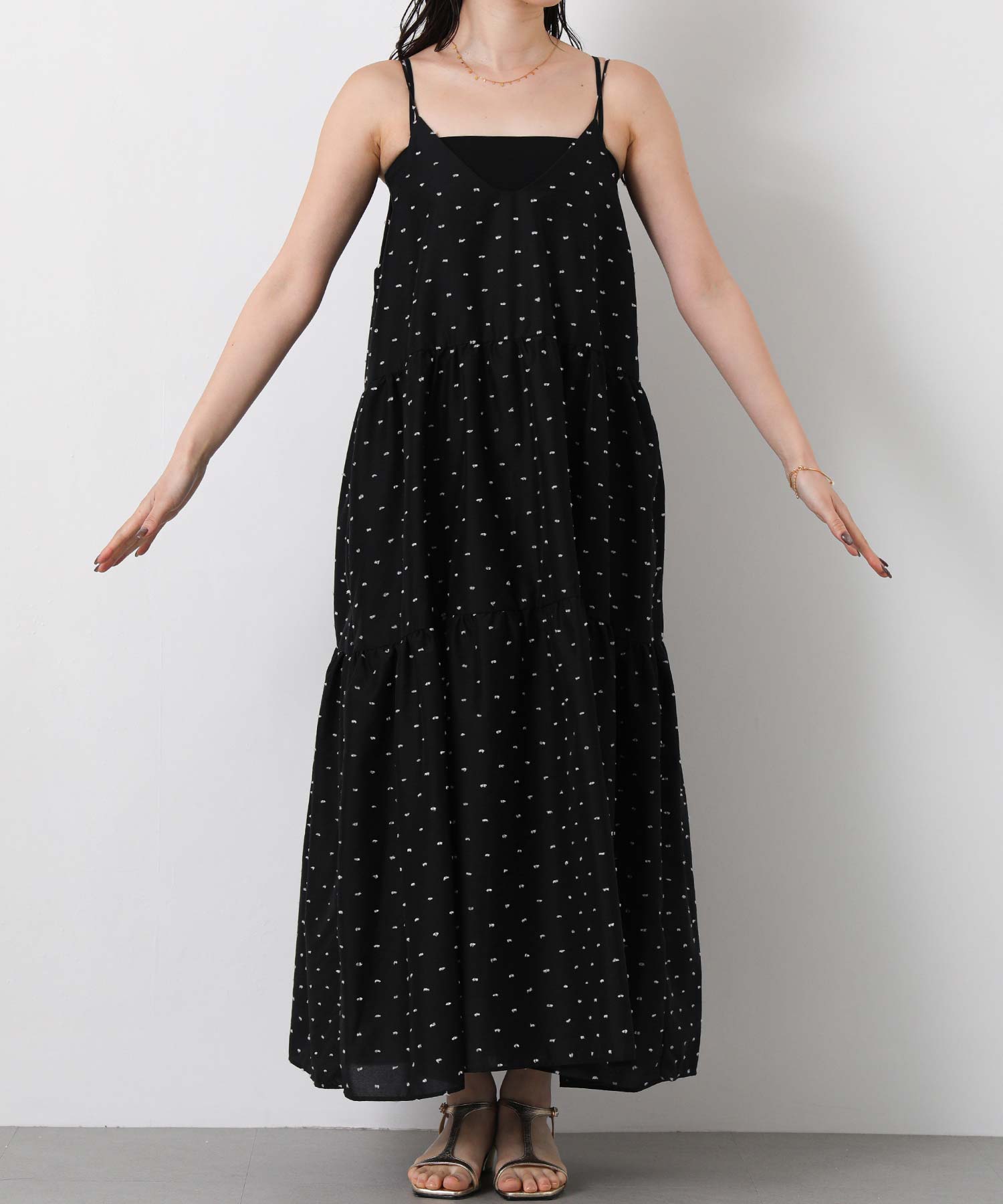1枚で華やかな印象にしてくれるドットキャミワンピ。