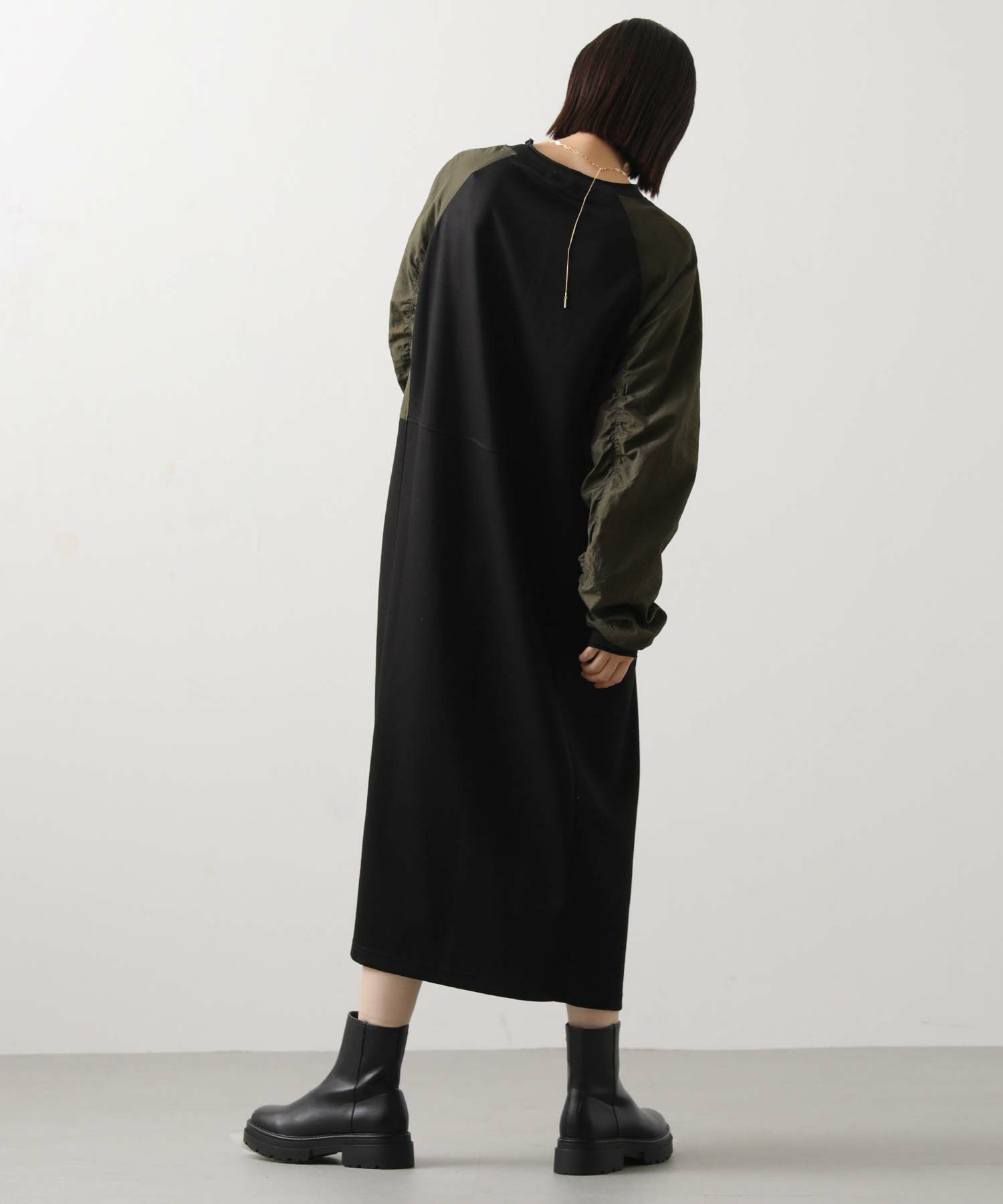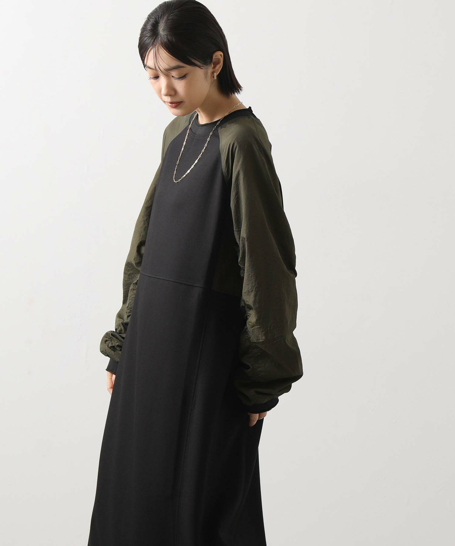 ワッシャーの軽やかな質感と、柔らかなカットソー素材を組み合わせたドッキングワンピース。