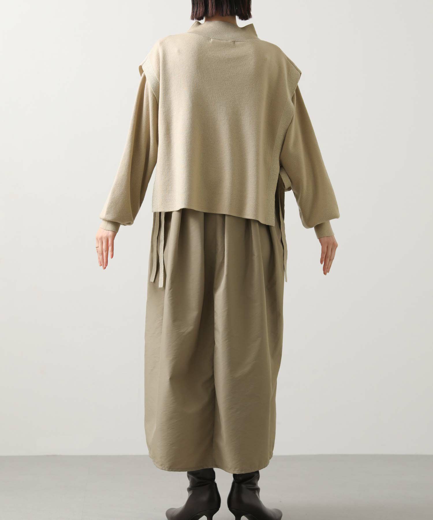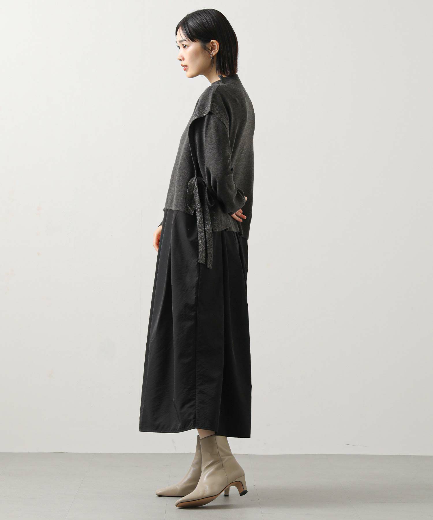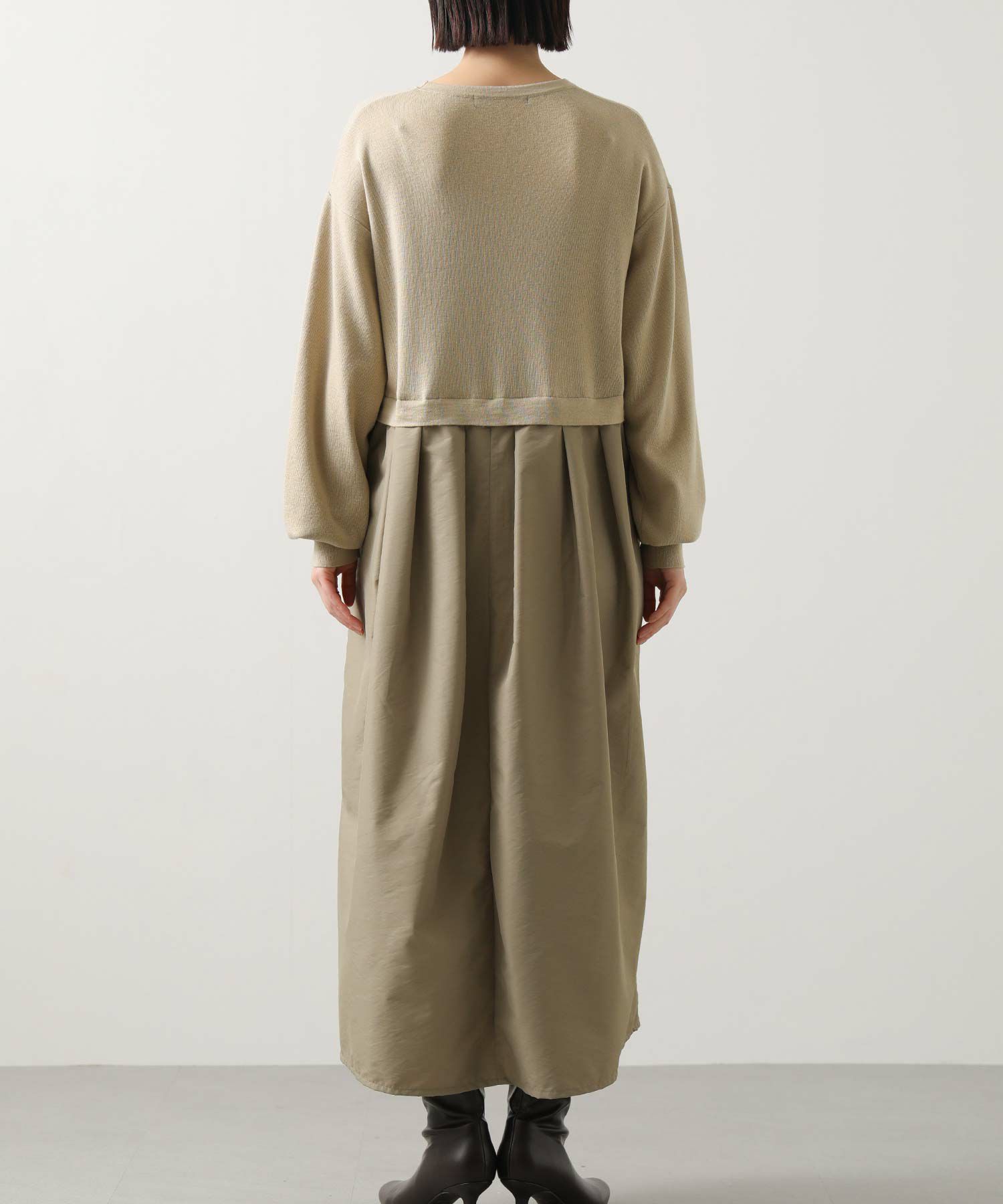 ニットワンピースはウエスト位置で布帛とドッキングしたデザイン。