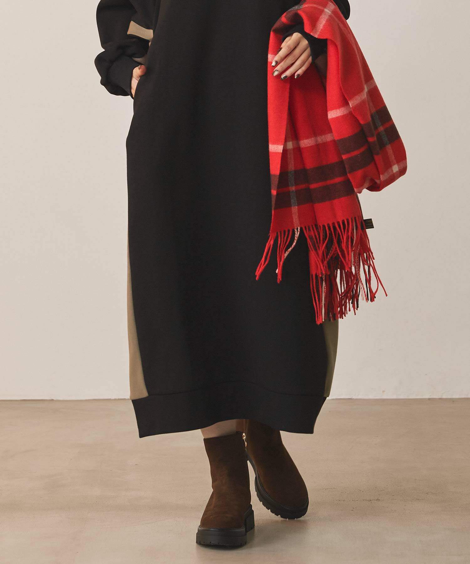 サイドラインから袖下のバイカラーがポイントのフーディワンピース。
