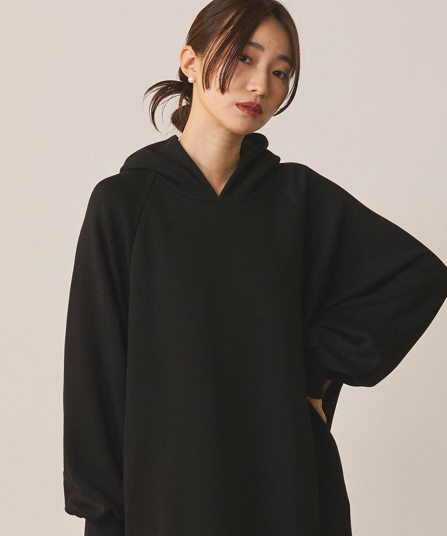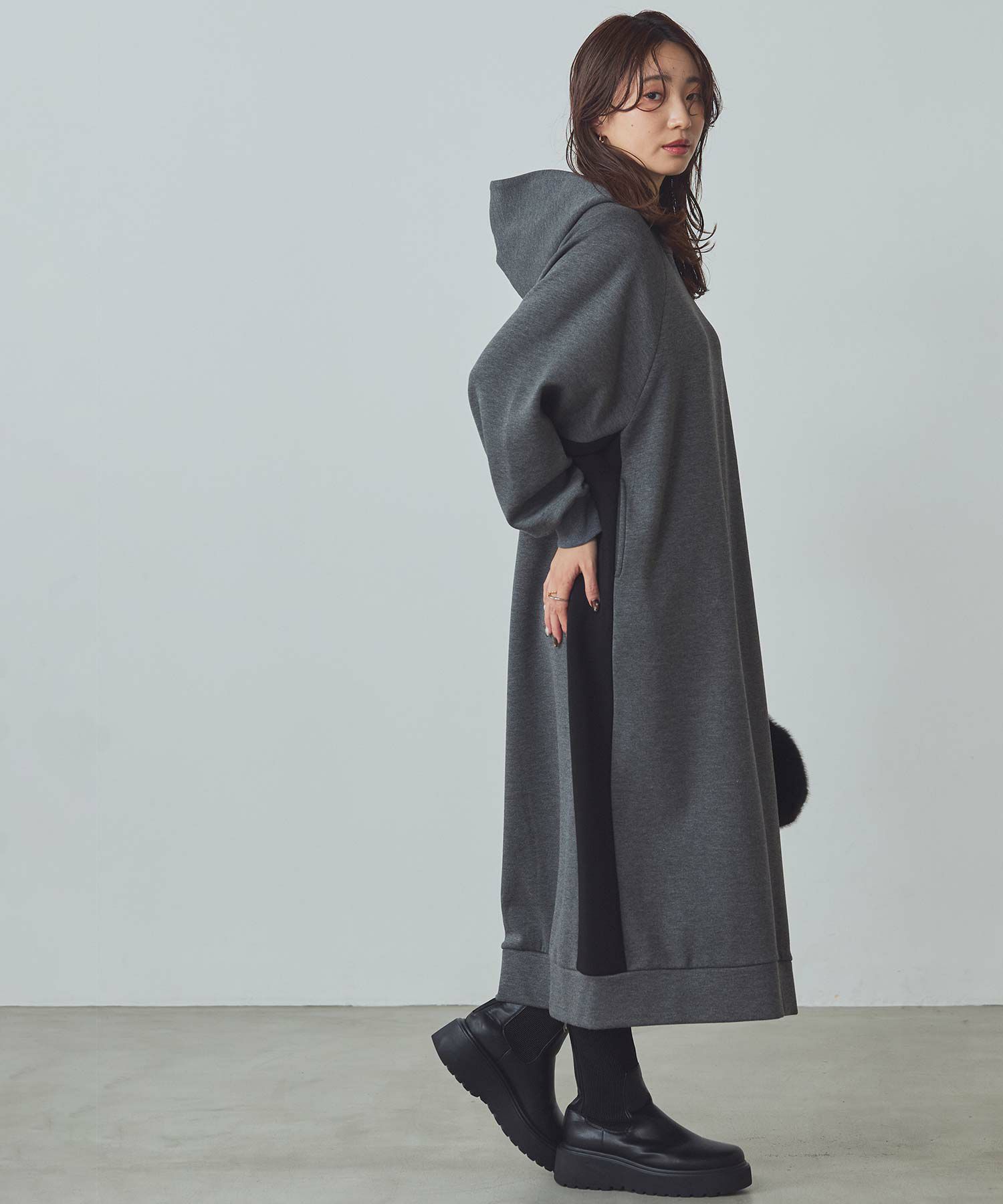 サイドラインから袖下のバイカラーがポイントのフーディワンピース。