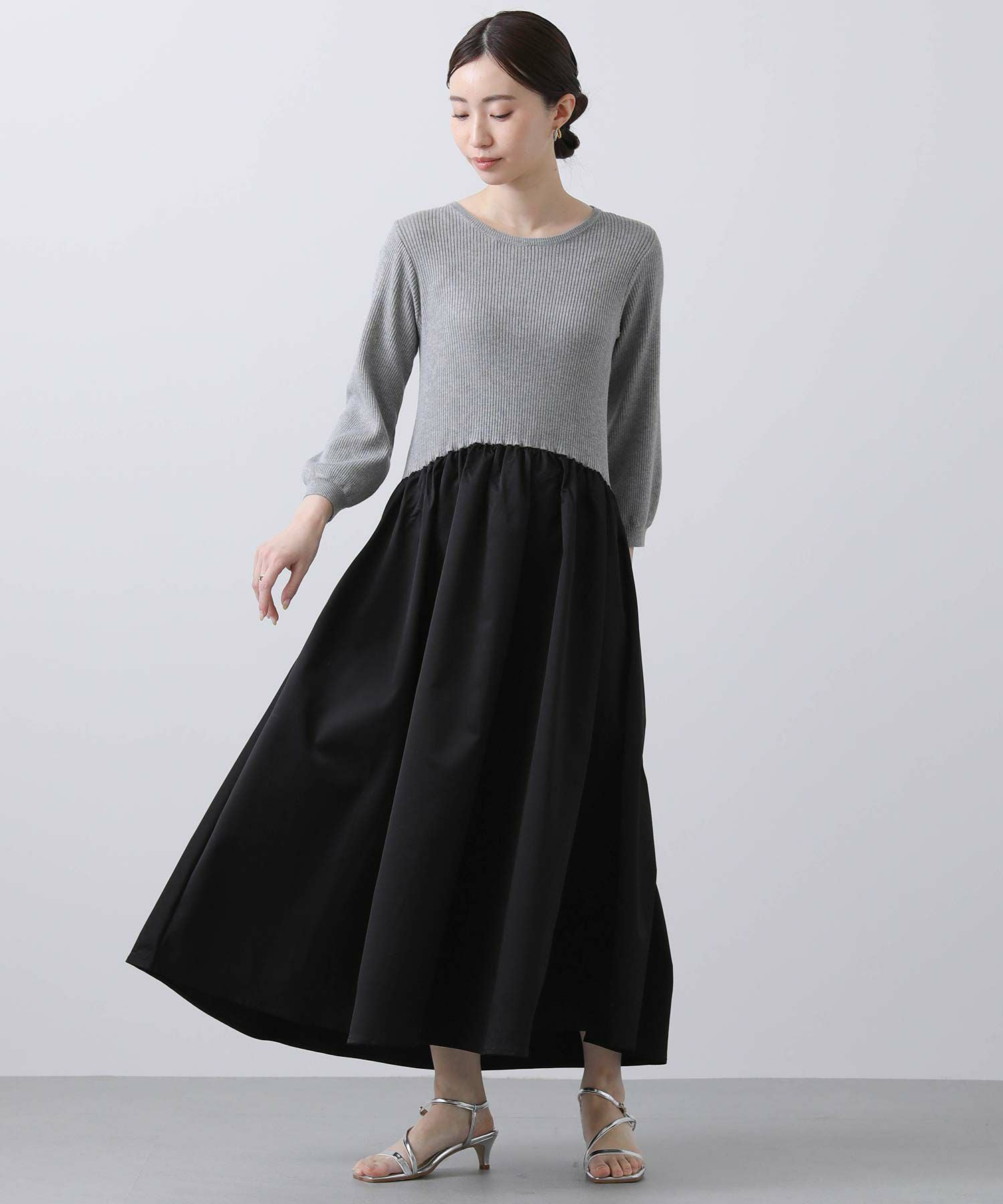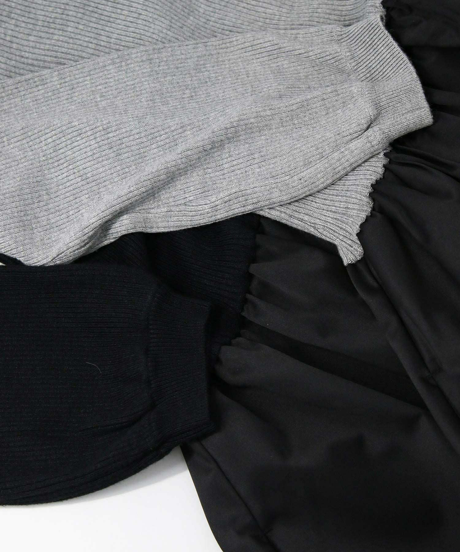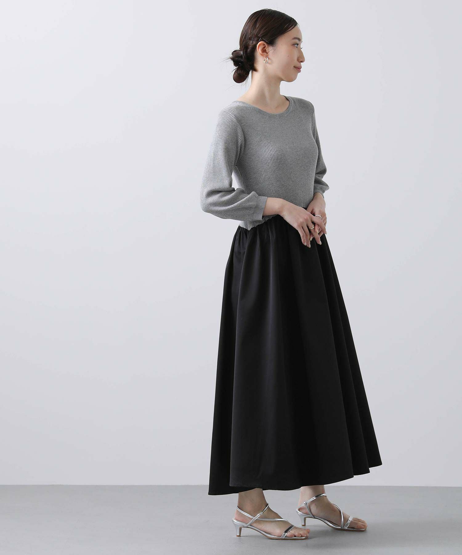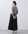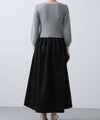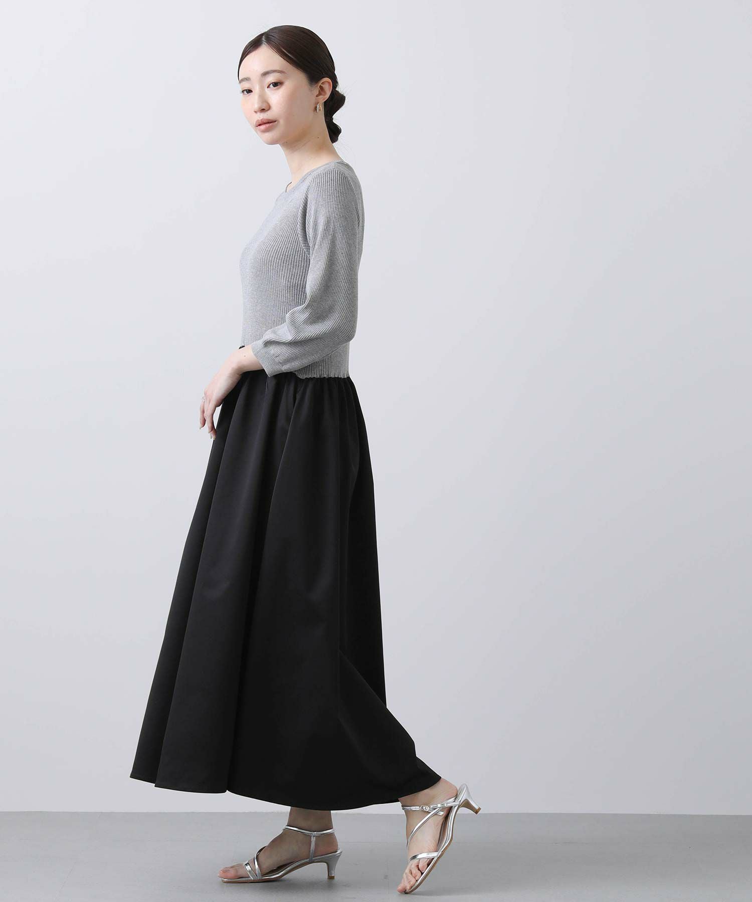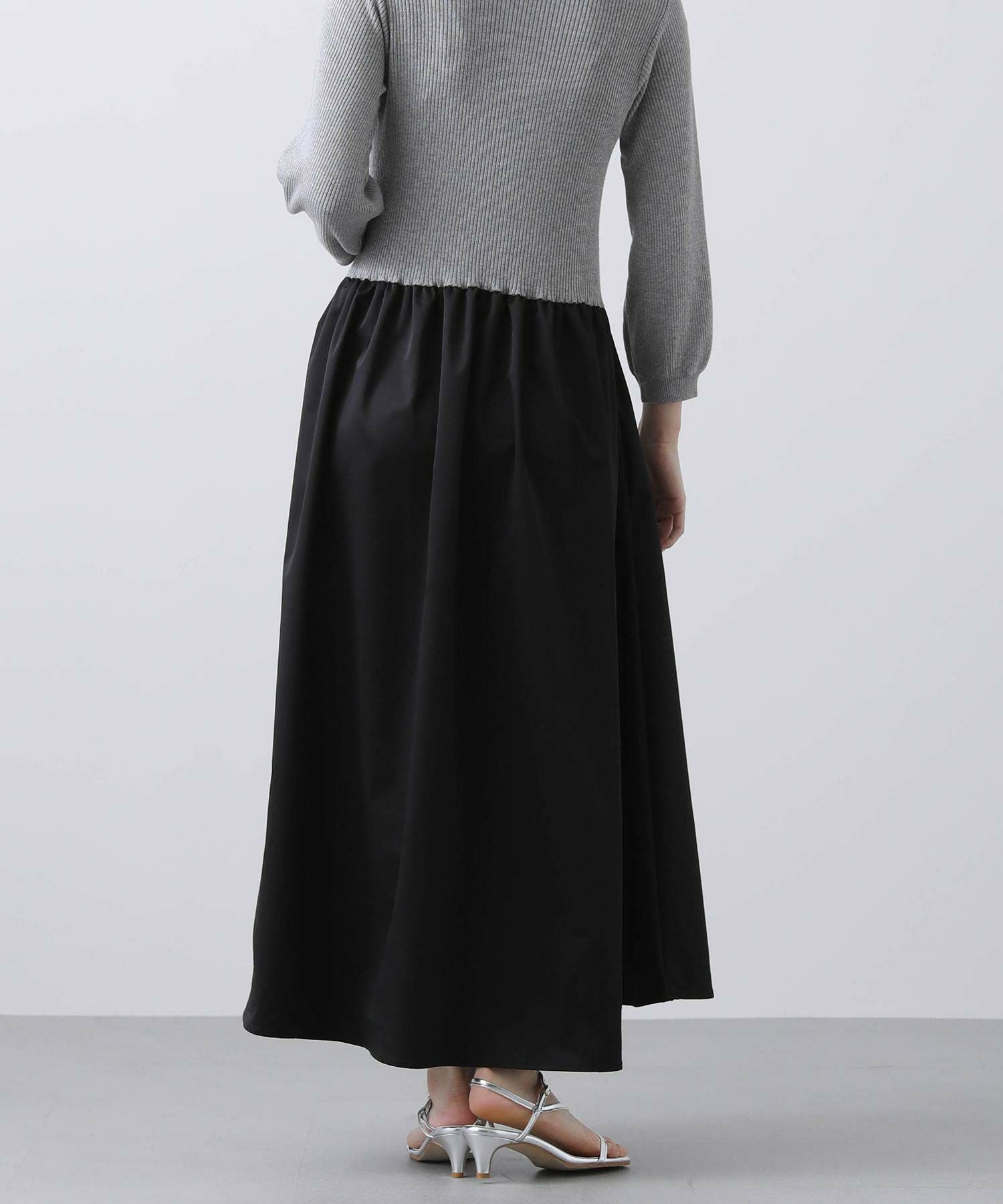 トップスはニット素材でスカート部分は程よいツヤと張りのあるポリエステル素材を使用。