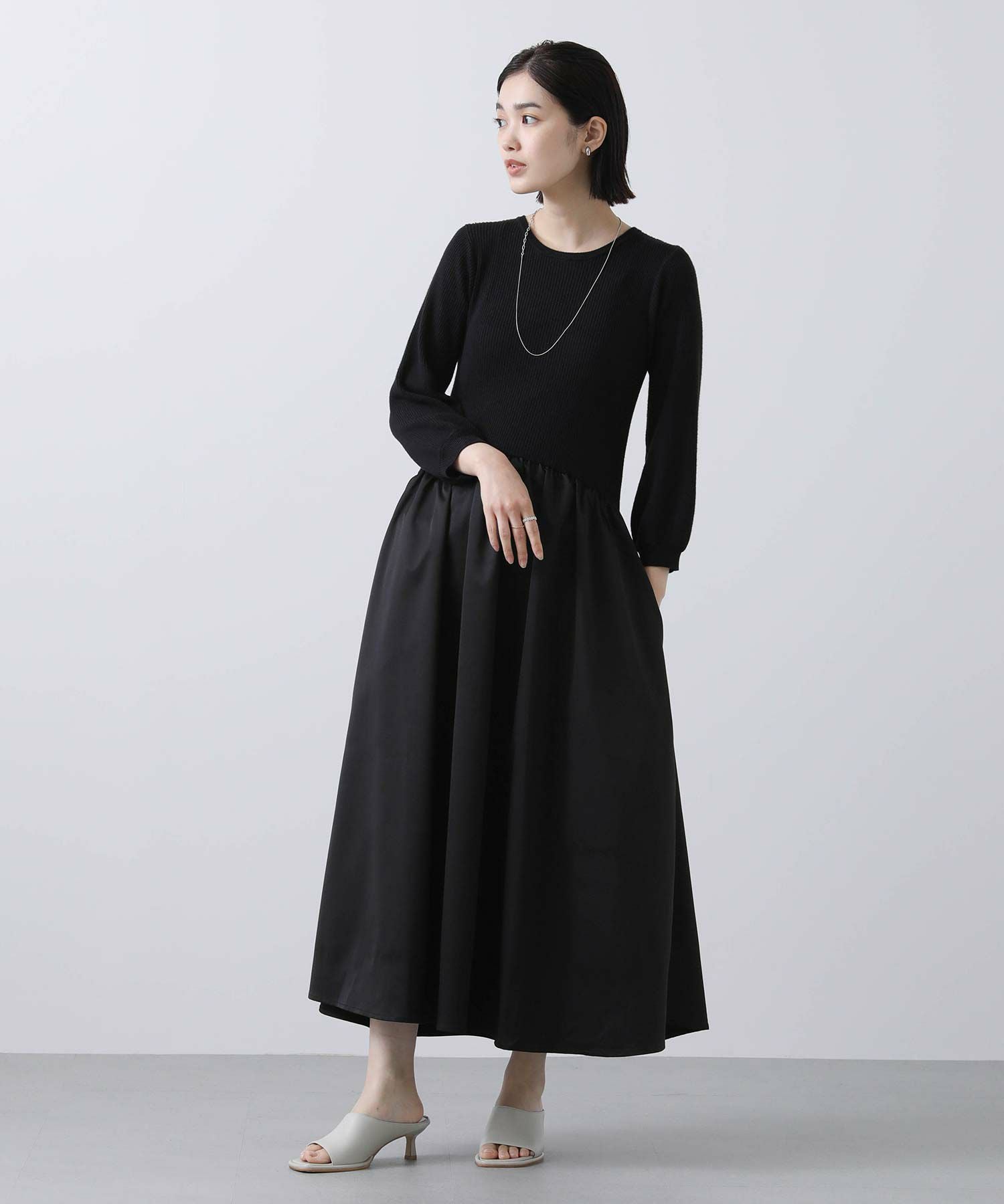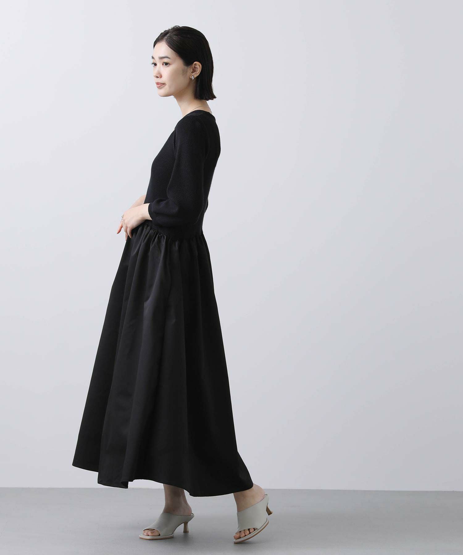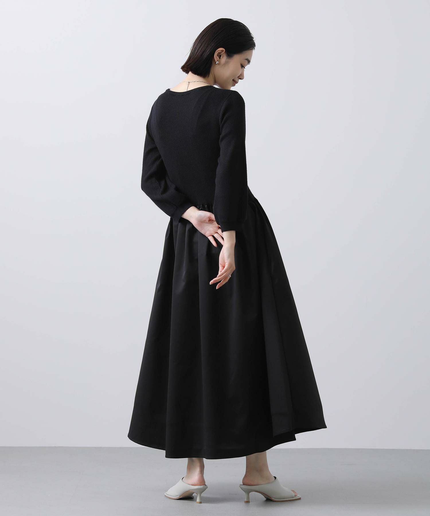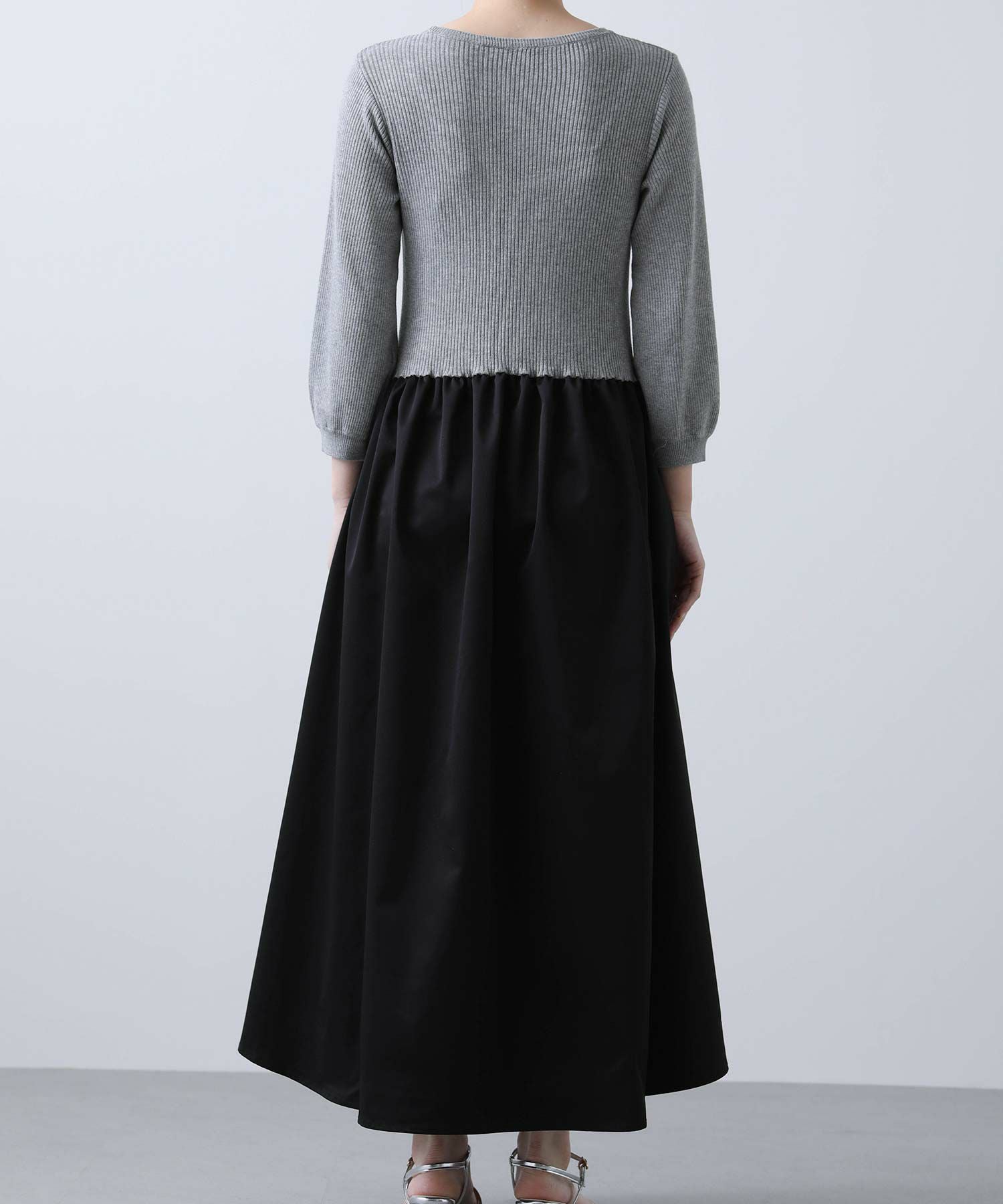 トップスはニット素材でスカート部分は程よいツヤと張りのあるポリエステル素材を使用。