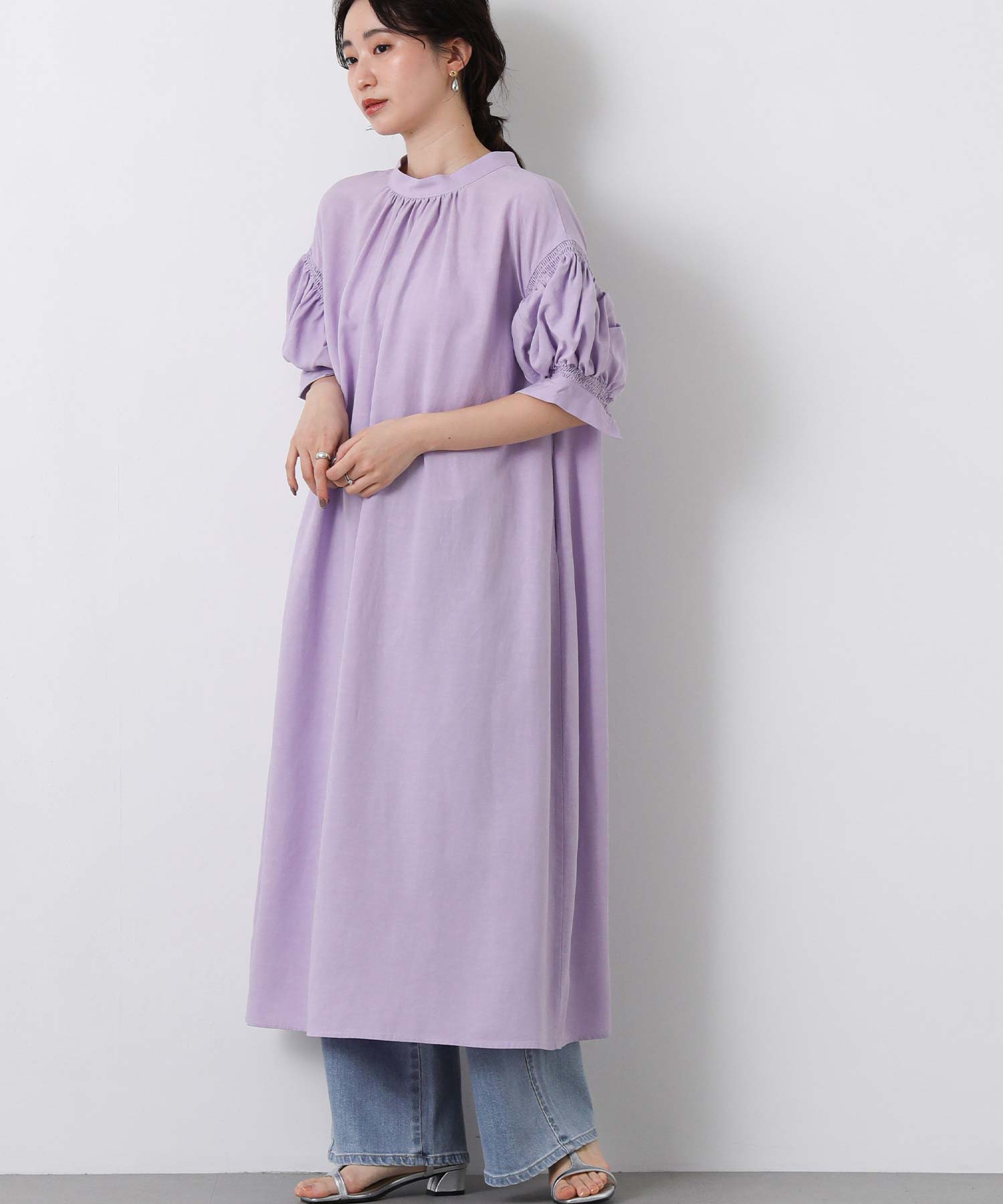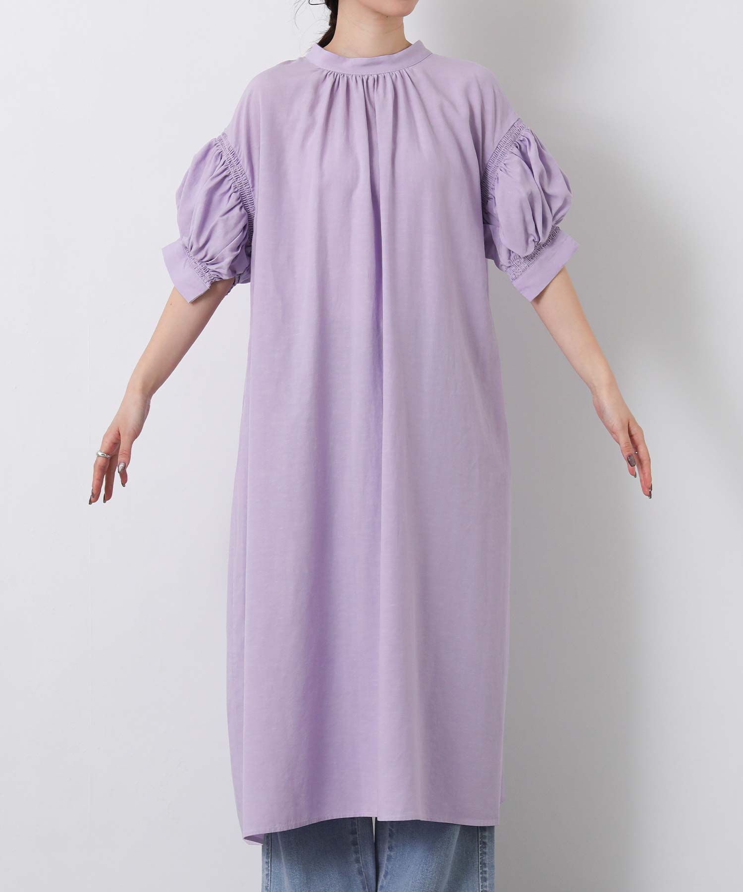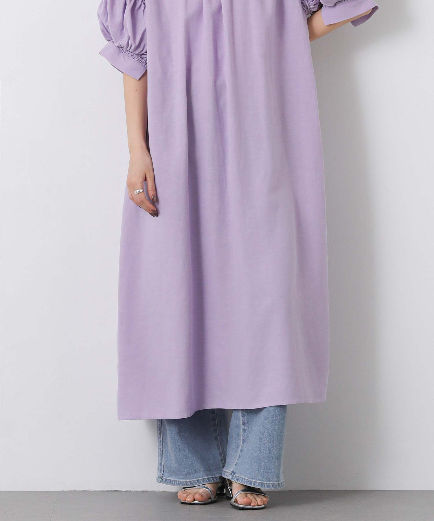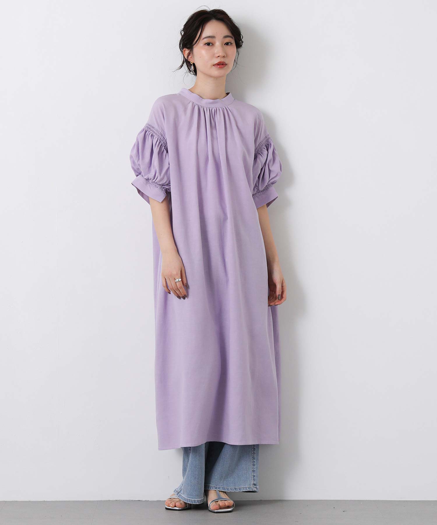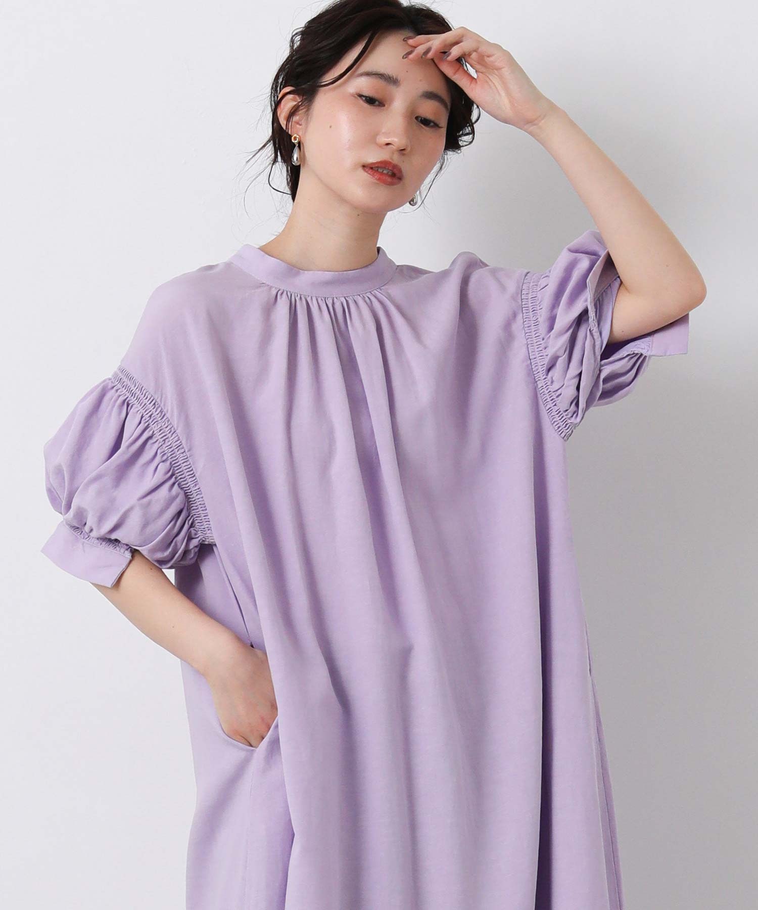 シンプルながらもデザイン性の高いパフスリーブと、顔回りをすっきりみせてくれるキーネックでこなれ感を演出。