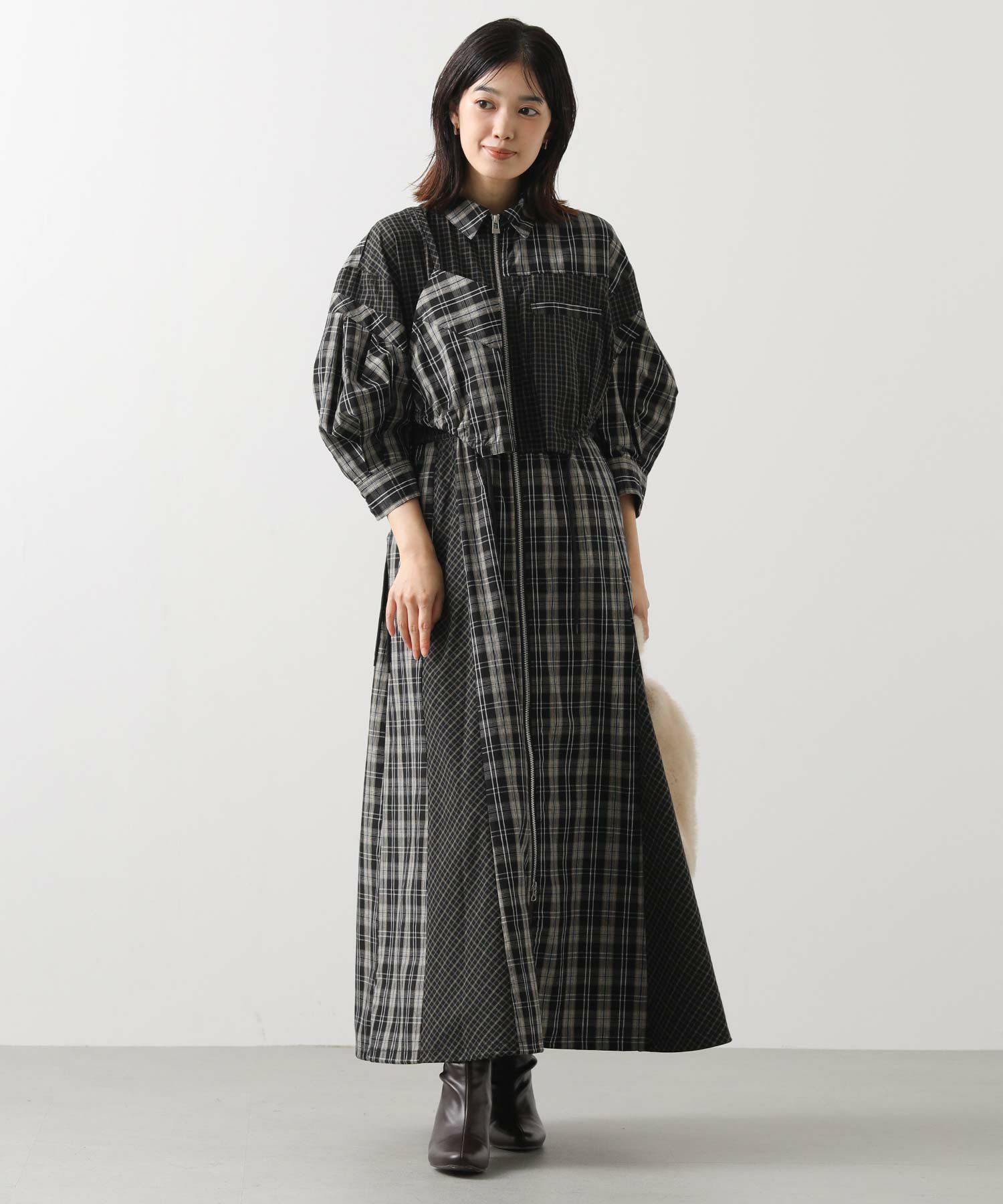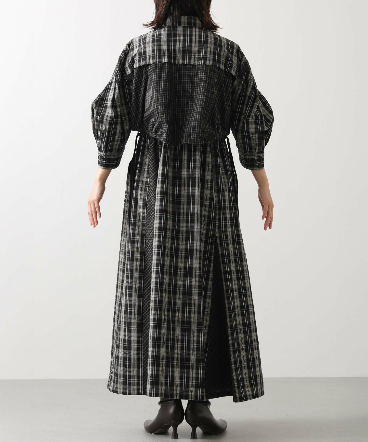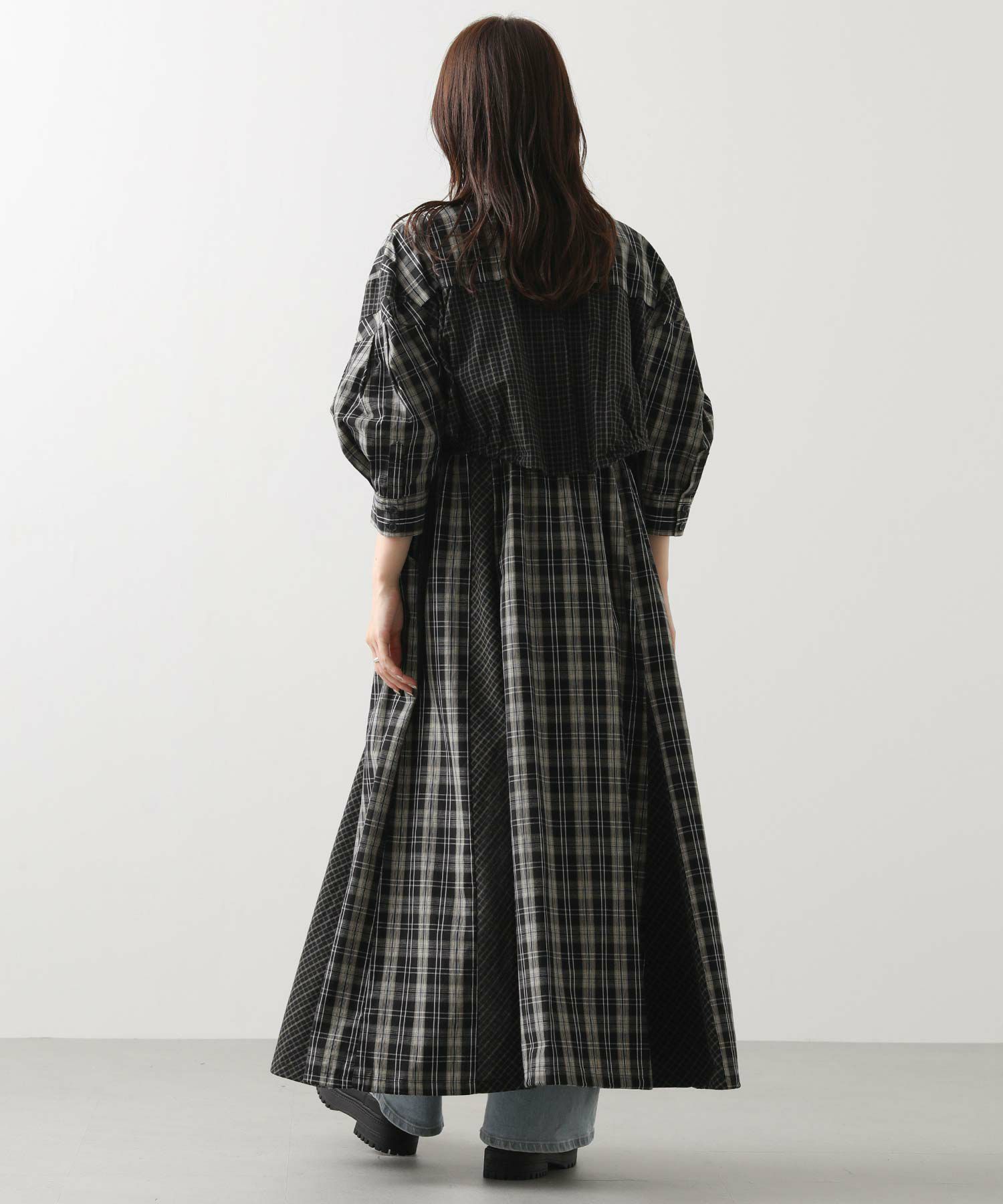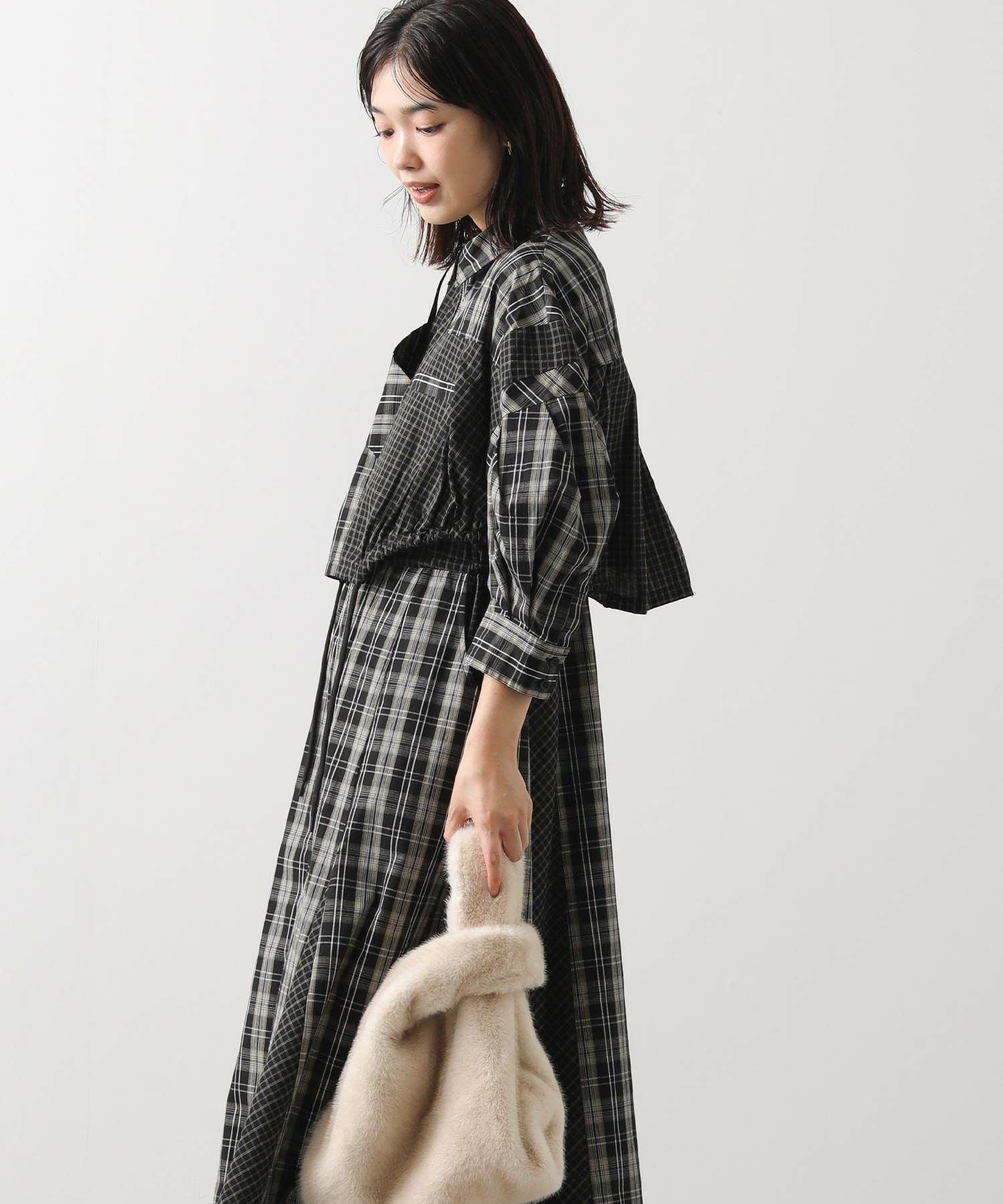 【AULAAILA(アウラアイラ】から、2種類のチェックを組み合わせたシャツワンピースをセレクト。