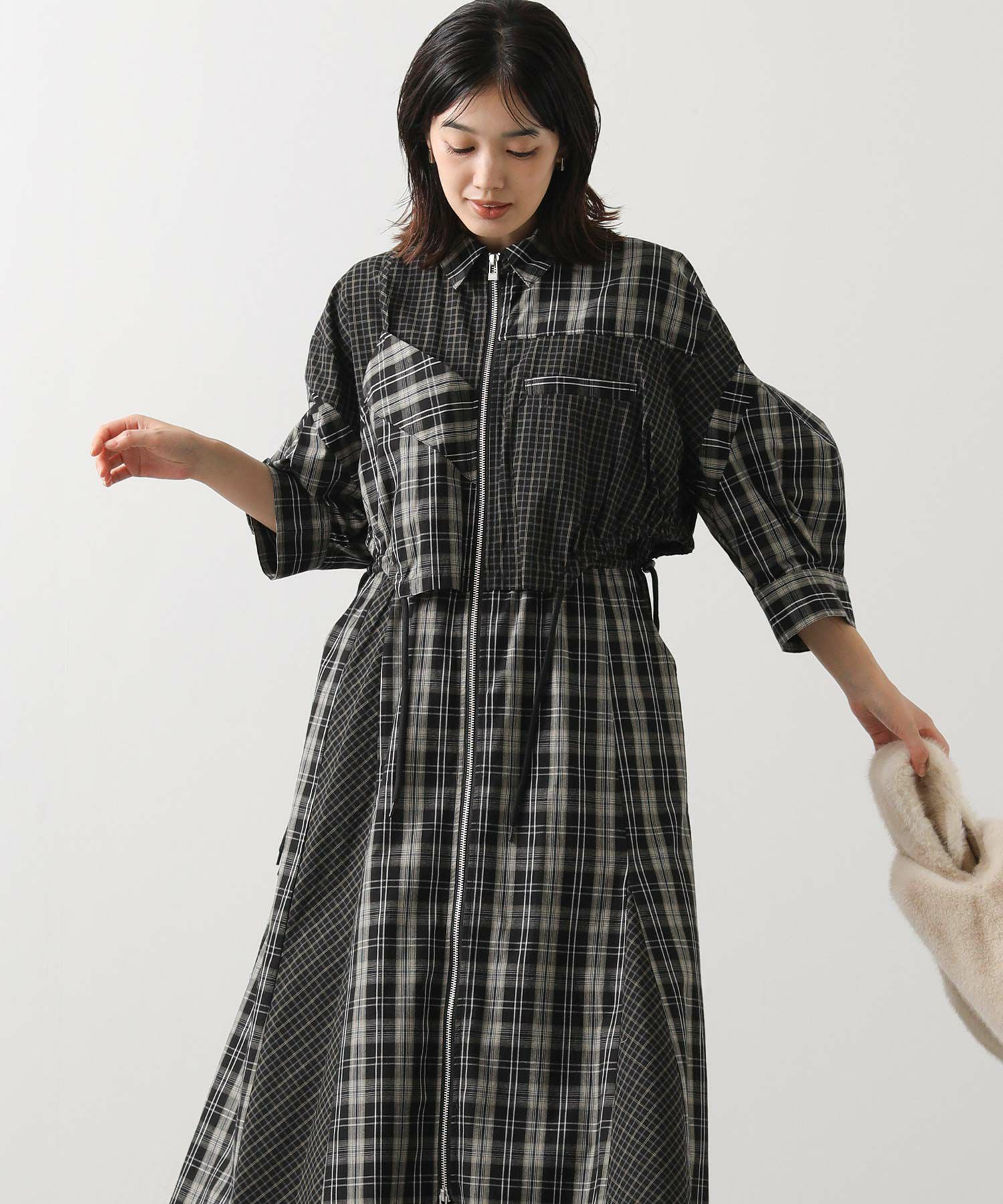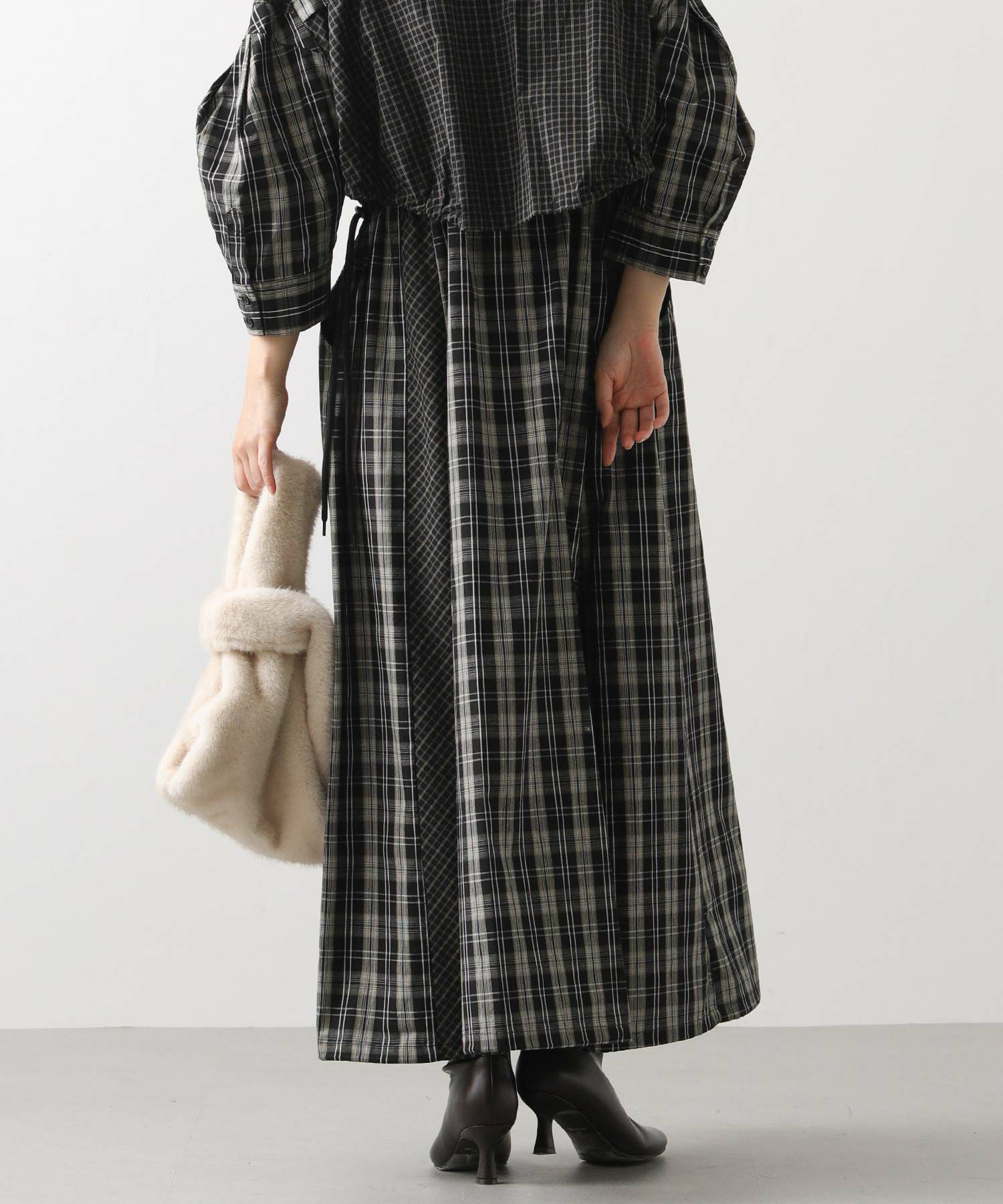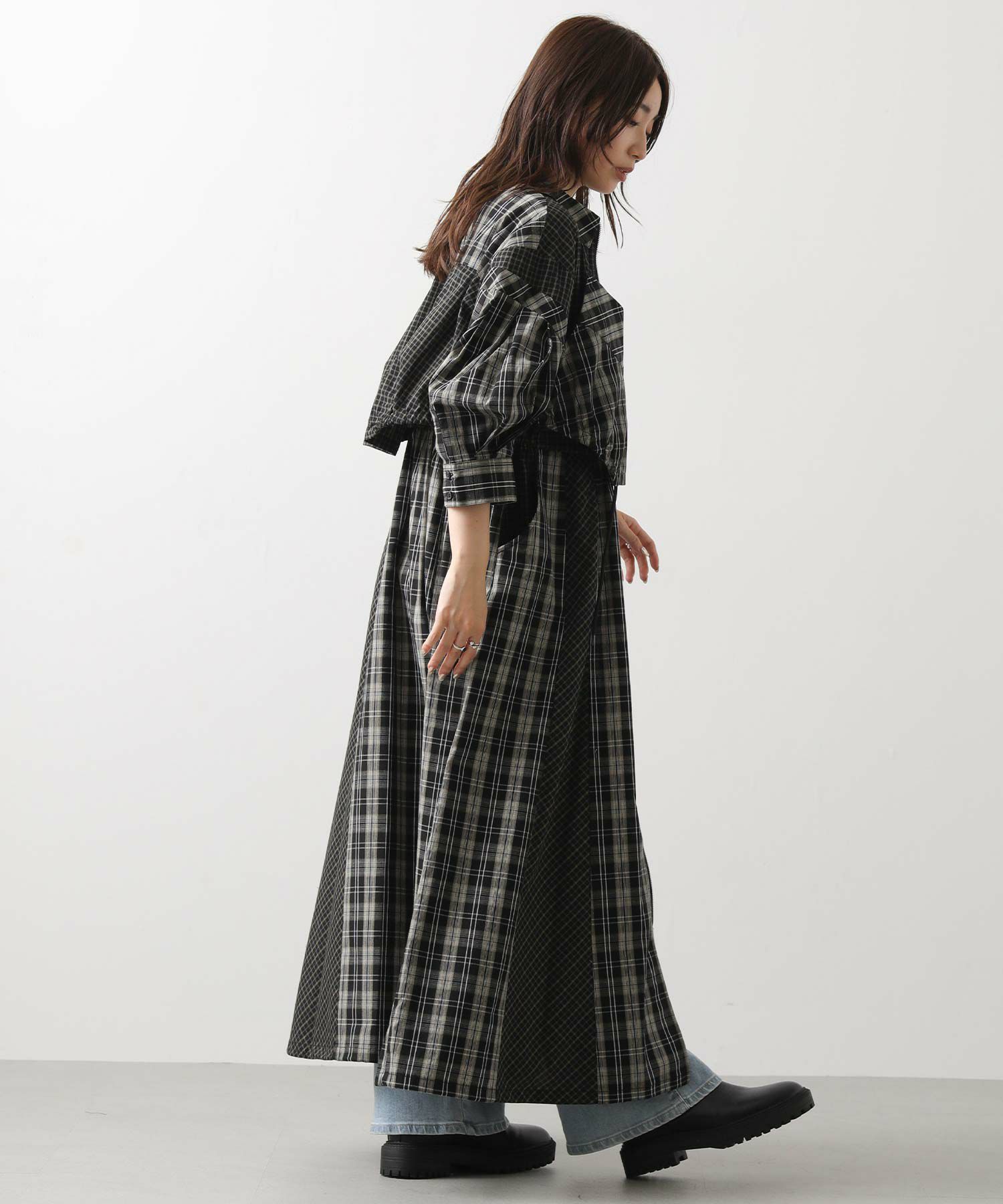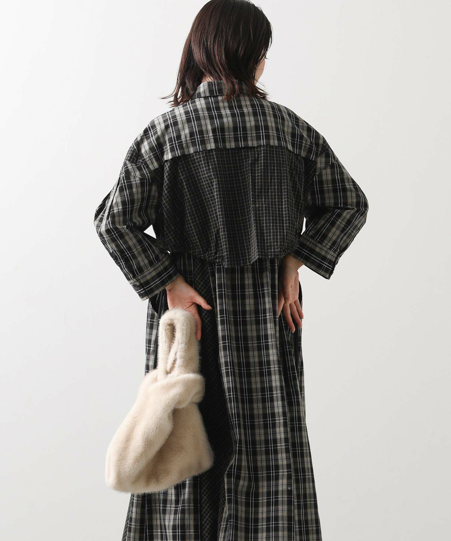 【AULAAILA(アウラアイラ】から、2種類のチェックを組み合わせたシャツワンピースをセレクト。