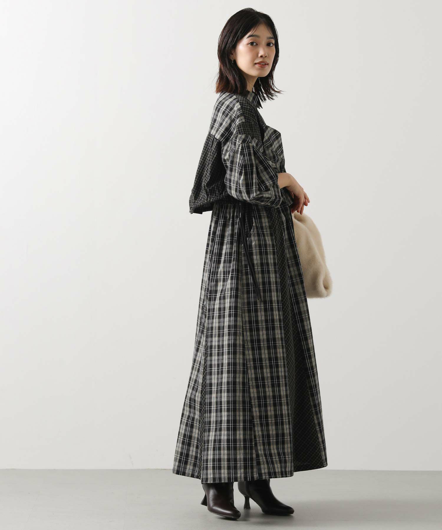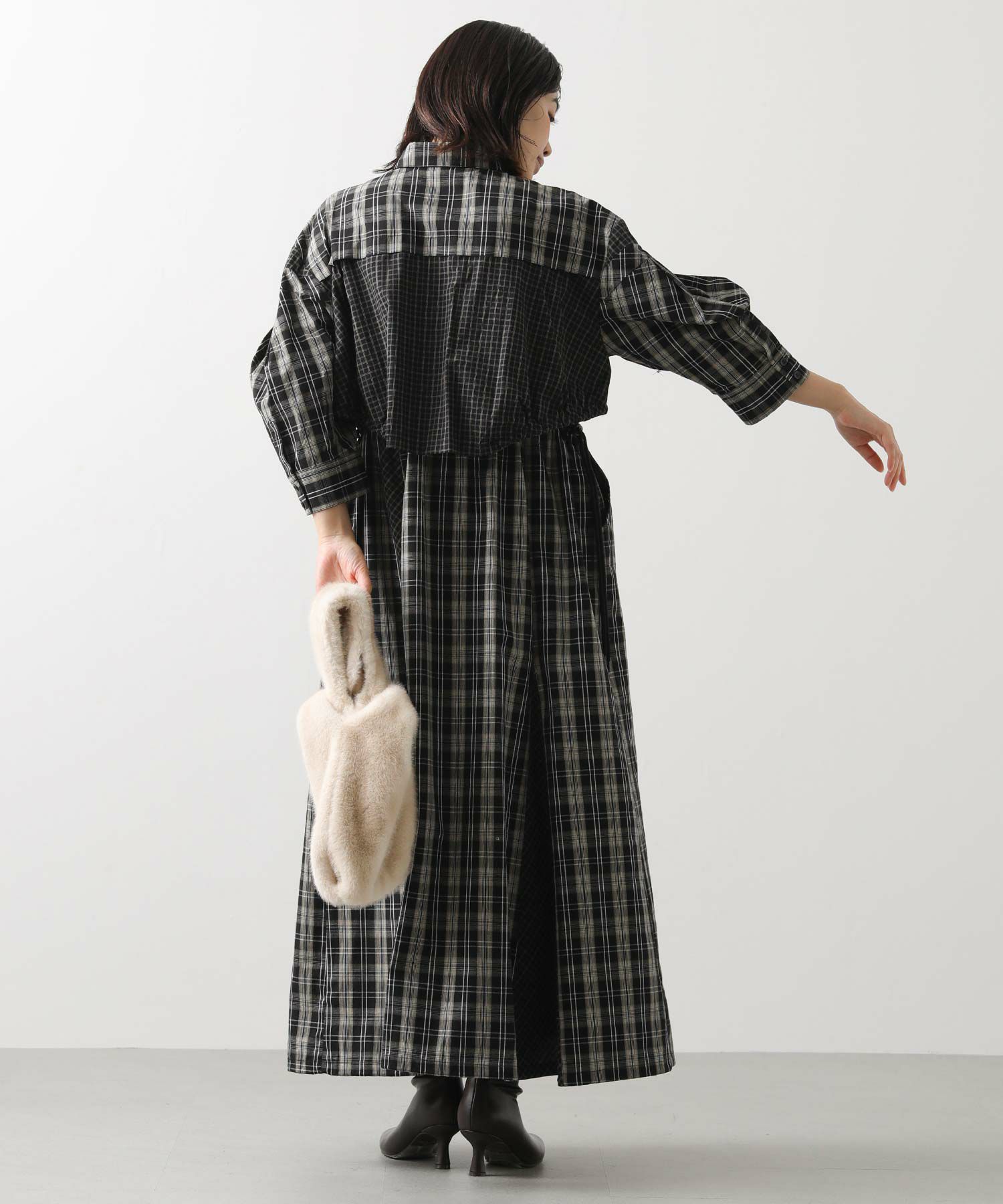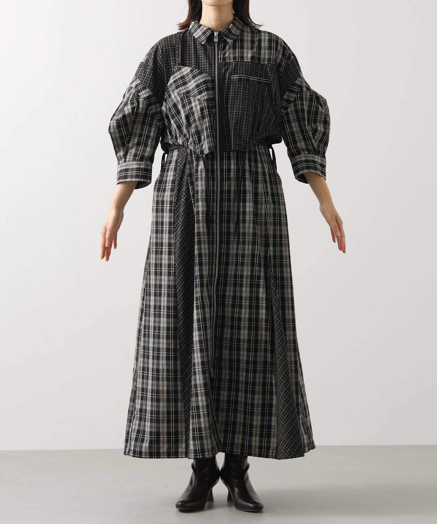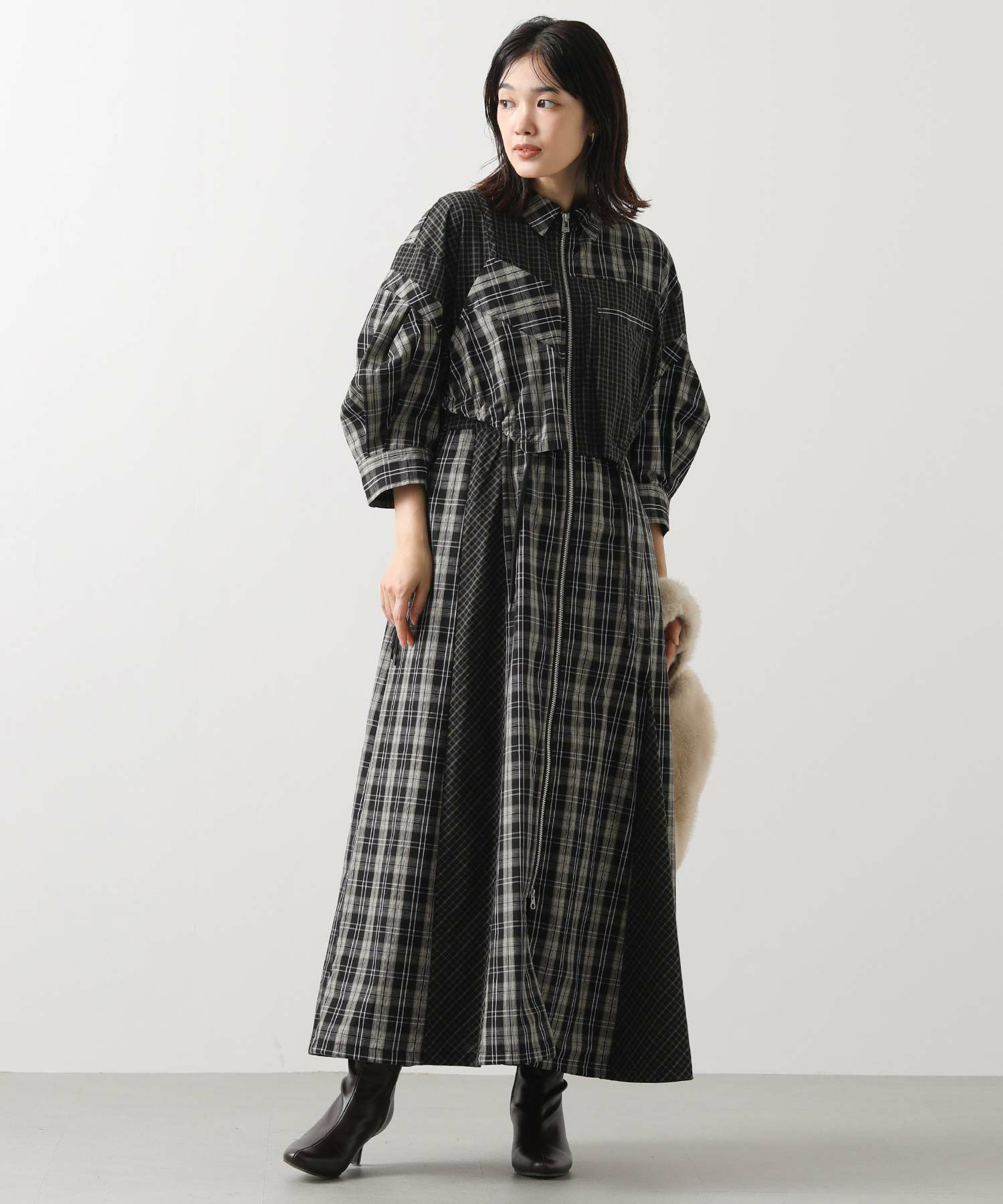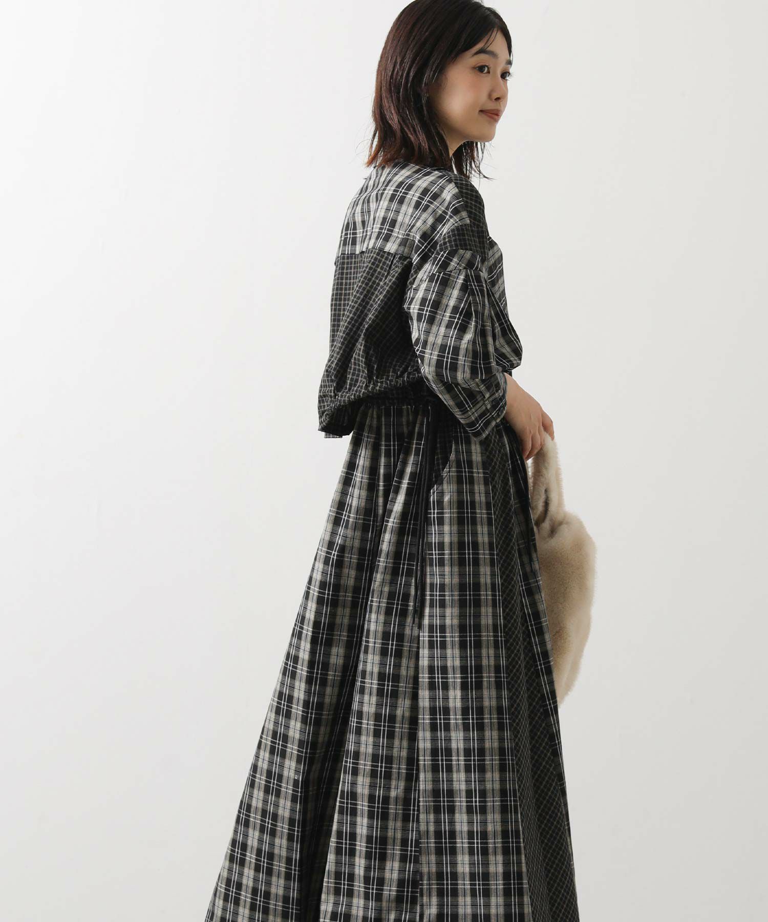 【AULAAILA(アウラアイラ】から、2種類のチェックを組み合わせたシャツワンピースをセレクト。