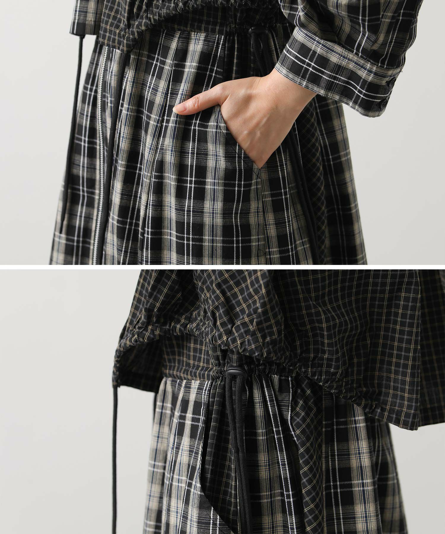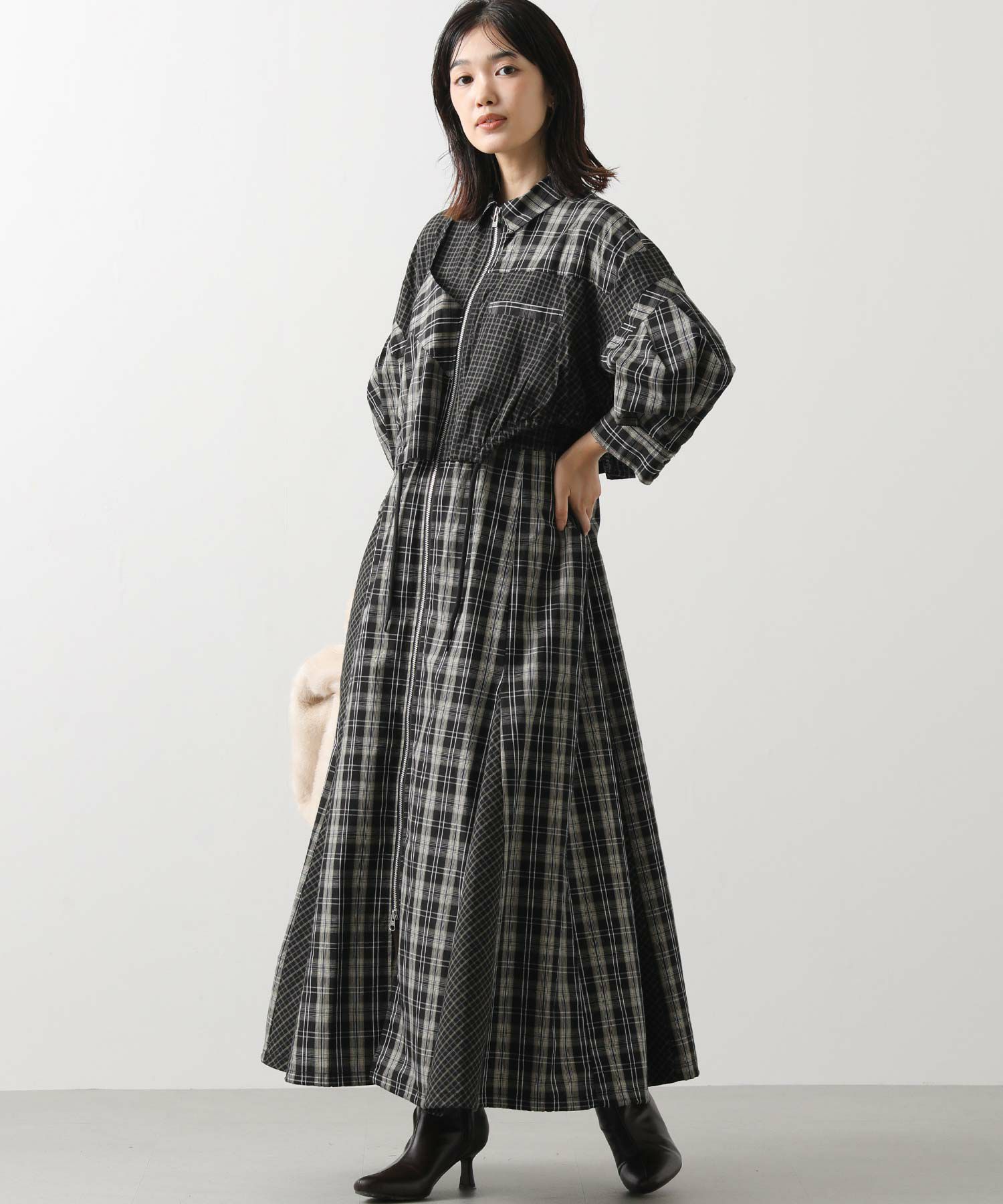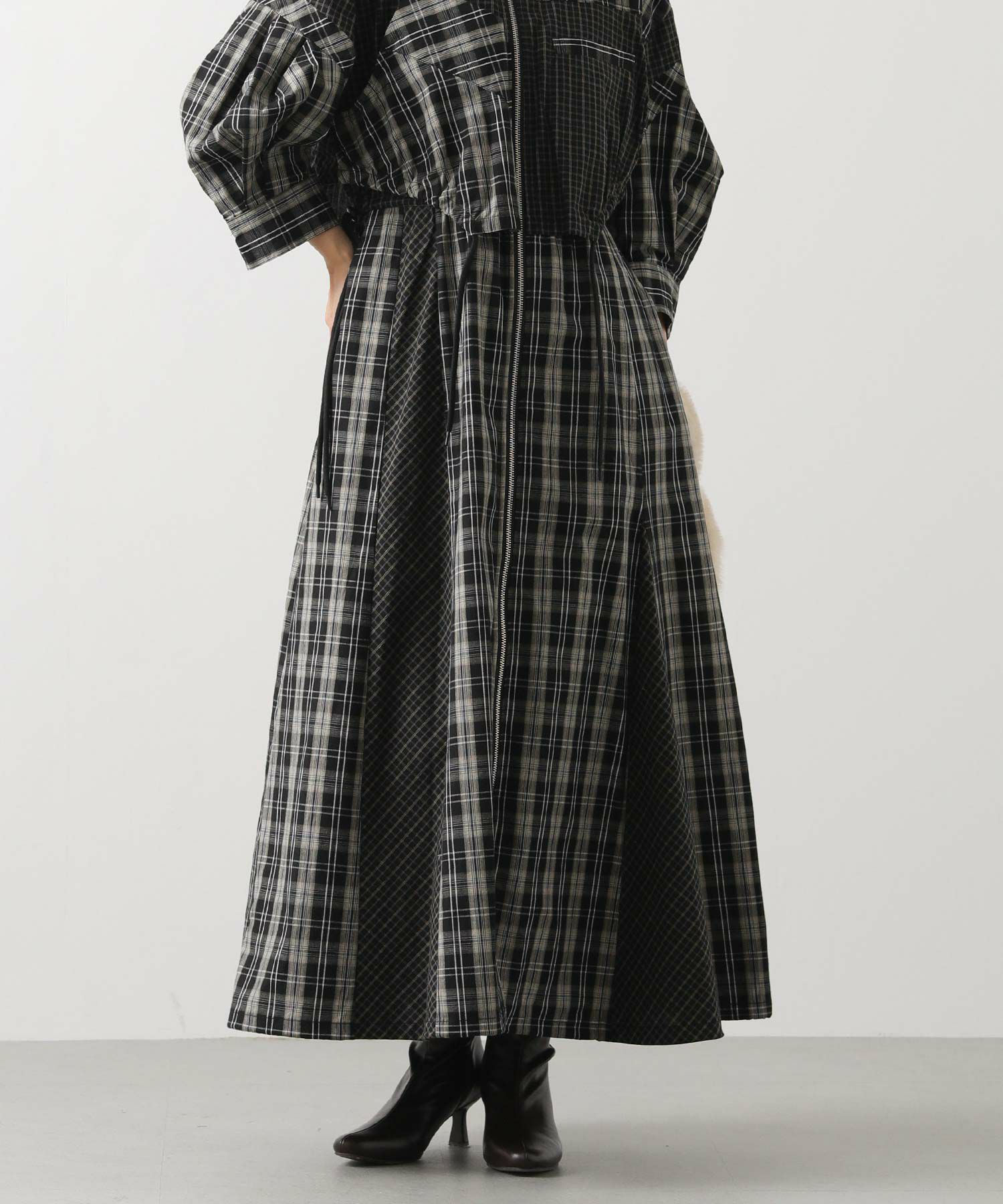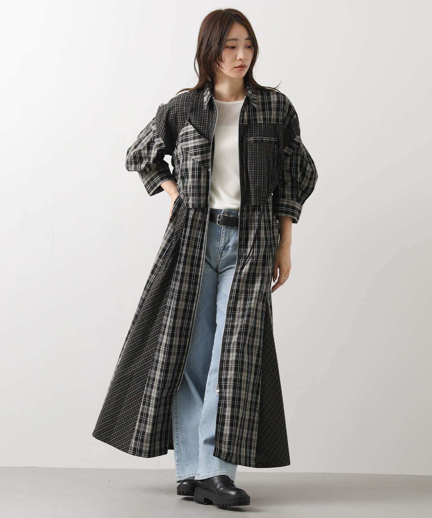 【AULAAILA(アウラアイラ】から、2種類のチェックを組み合わせたシャツワンピースをセレクト。