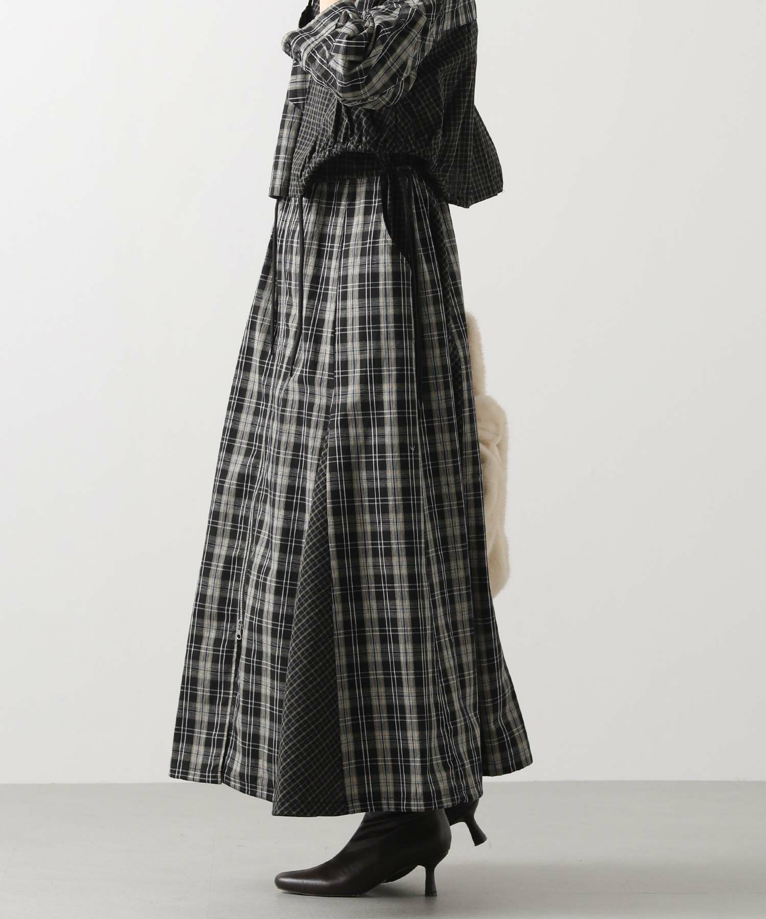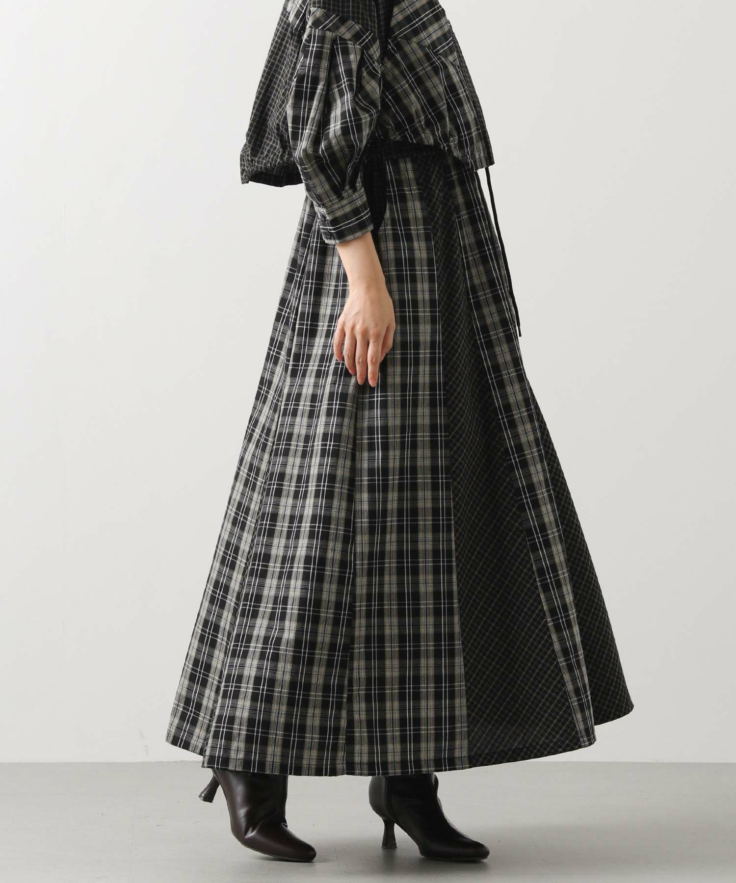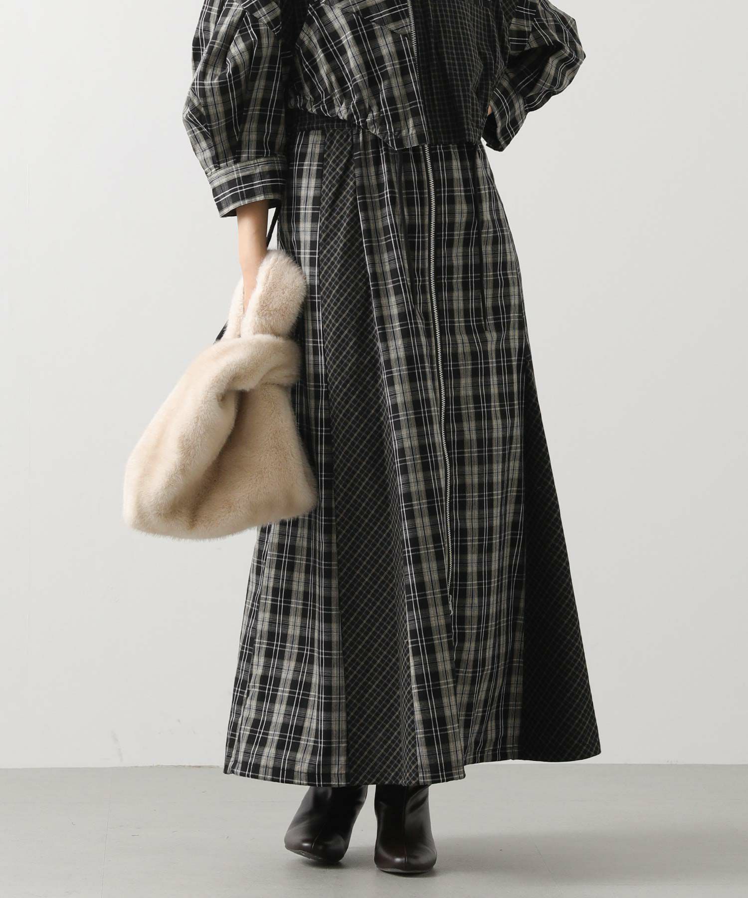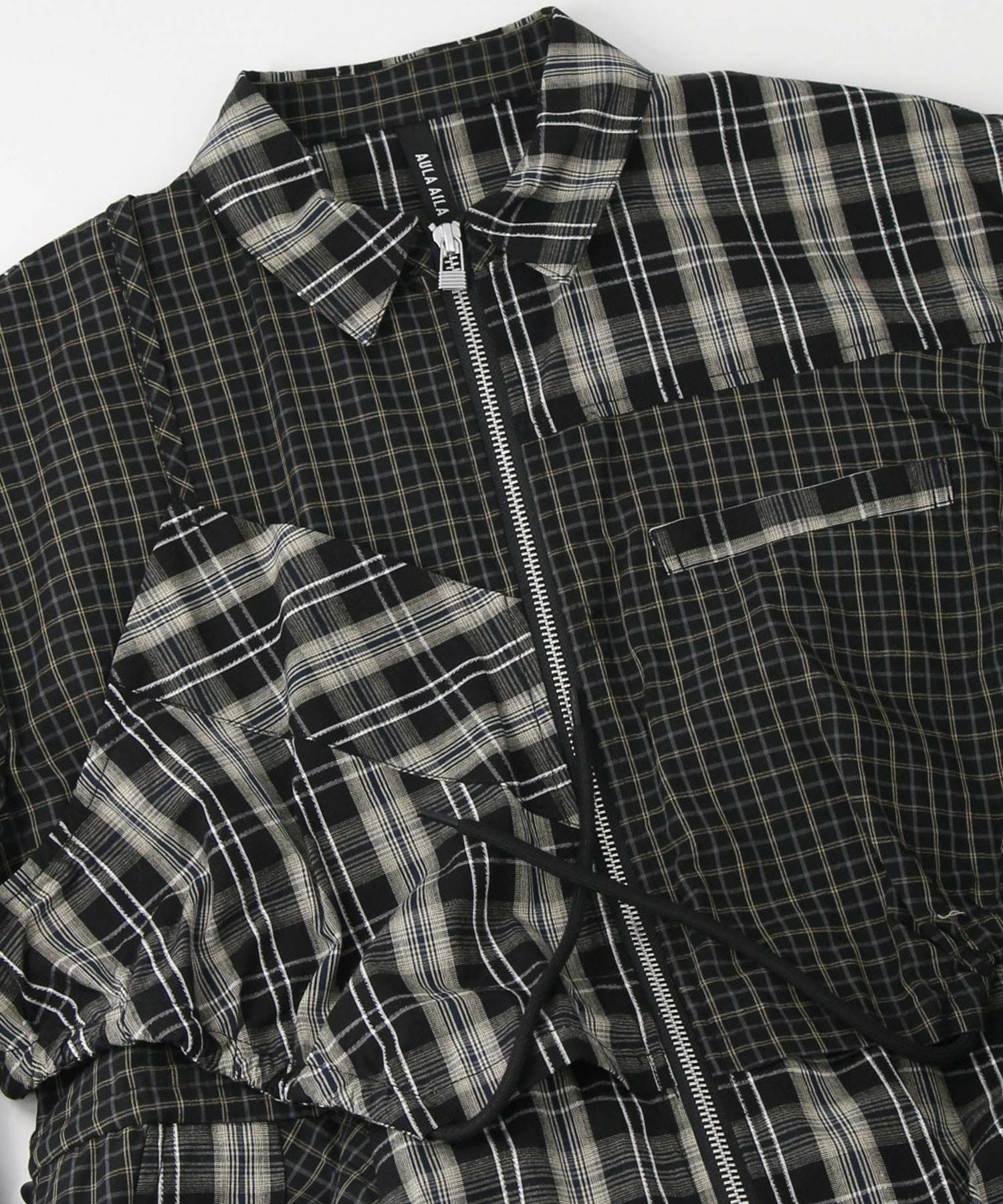 【AULAAILA(アウラアイラ】から、2種類のチェックを組み合わせたシャツワンピースをセレクト。