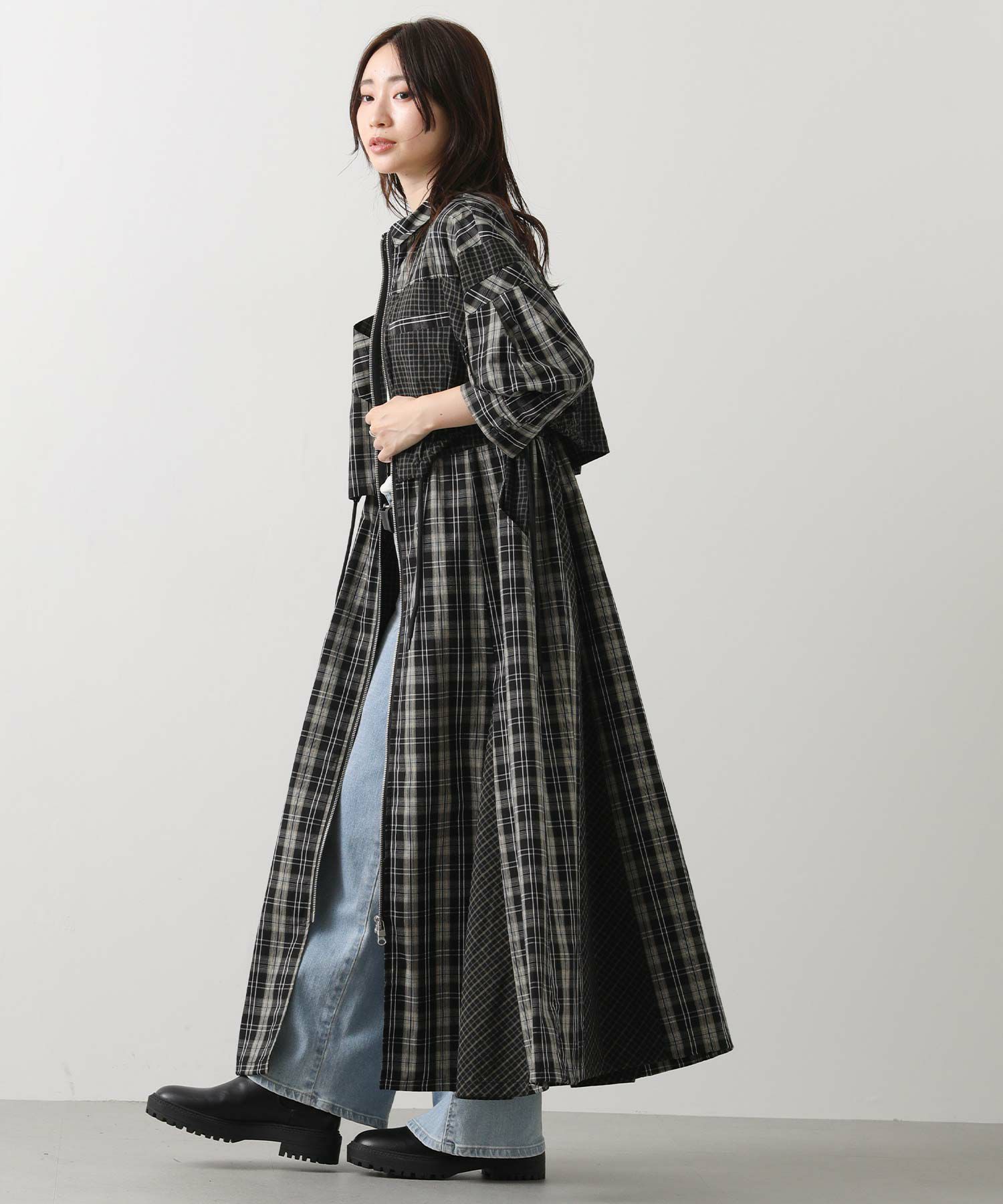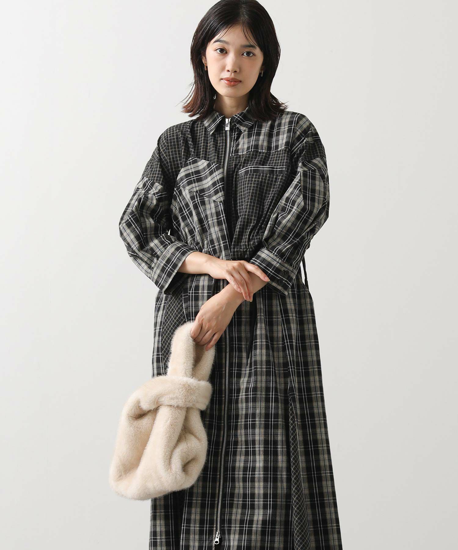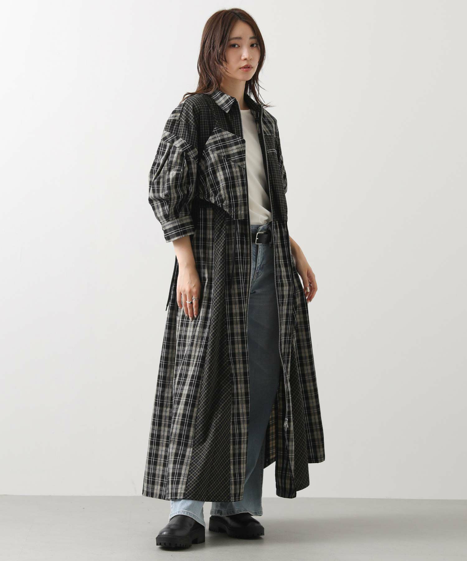 【AULAAILA(アウラアイラ】から、2種類のチェックを組み合わせたシャツワンピースをセレクト。