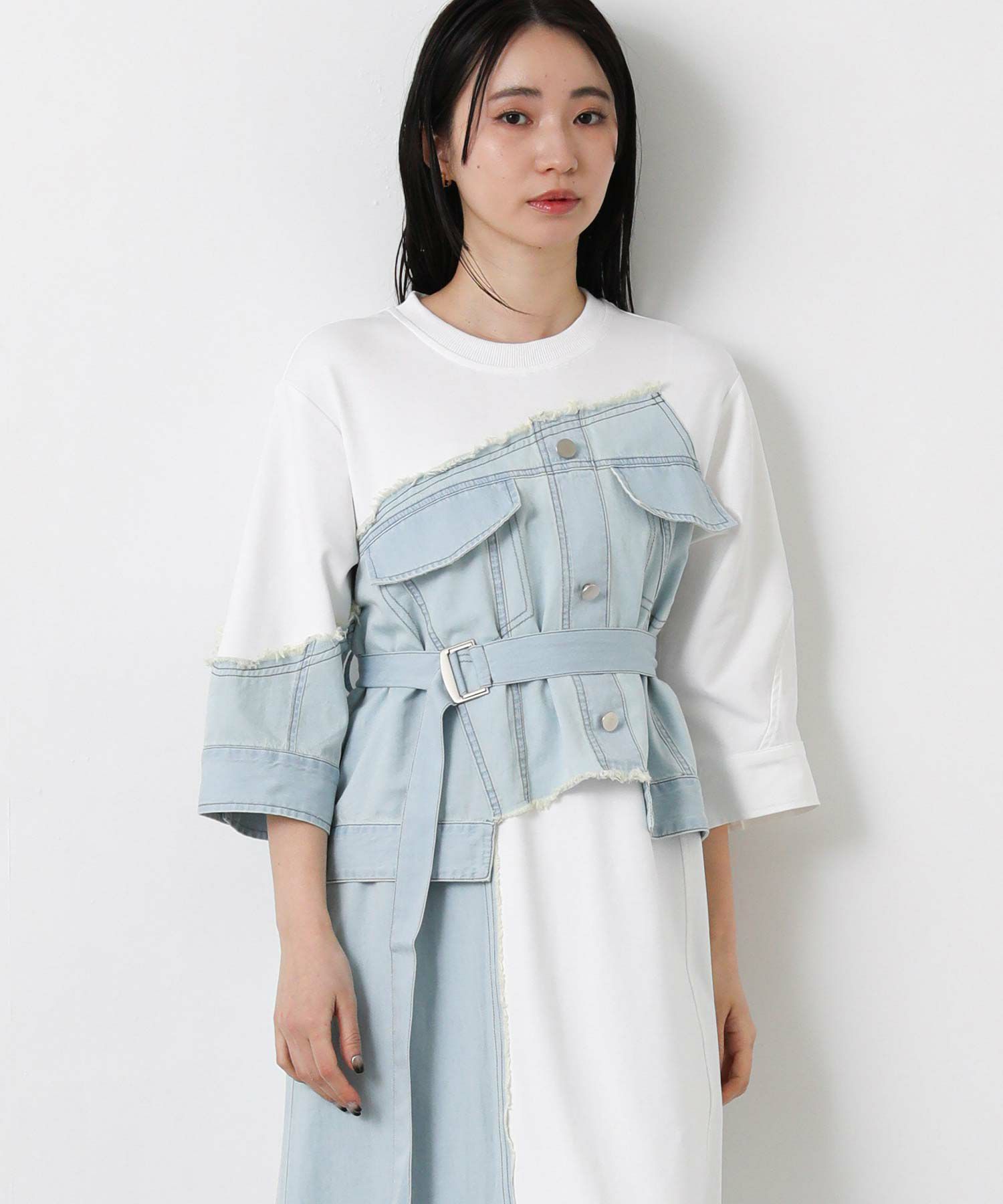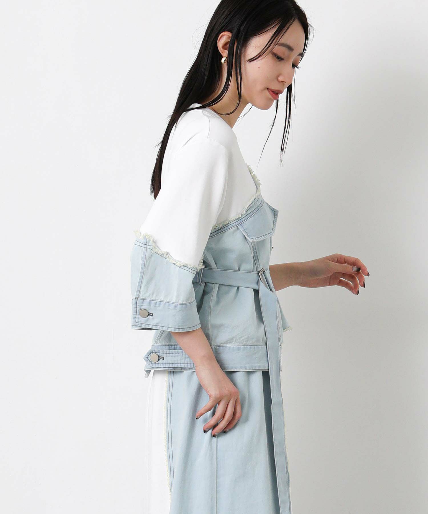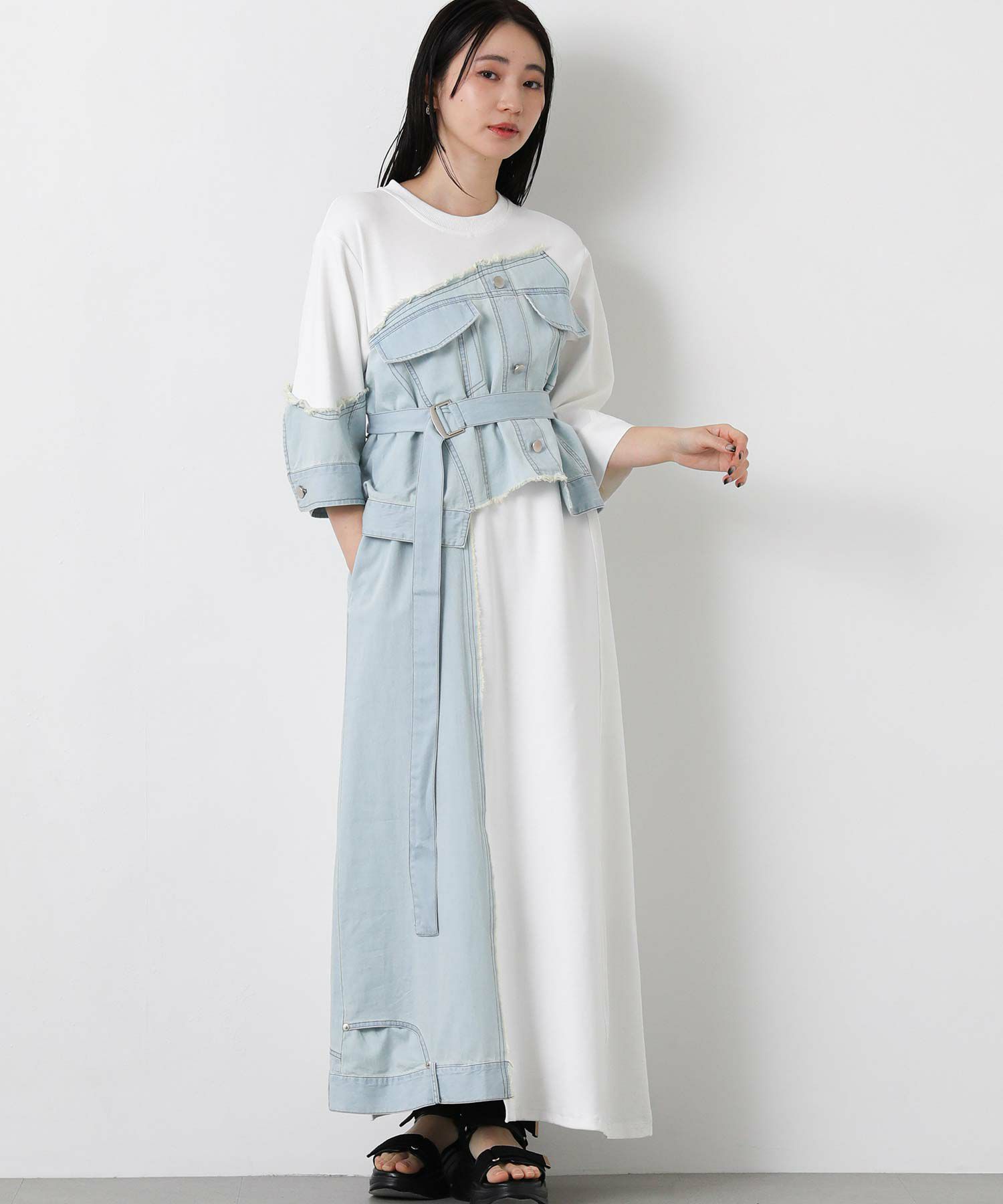 【AULAAILA(アウラアイラ】から、軽くて柔らかく肌触りの良いコットンスムースの素材に、ライトオンスデニムとストレッチタフタをコンビネーションしたワンピースをセレクト。