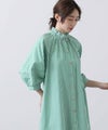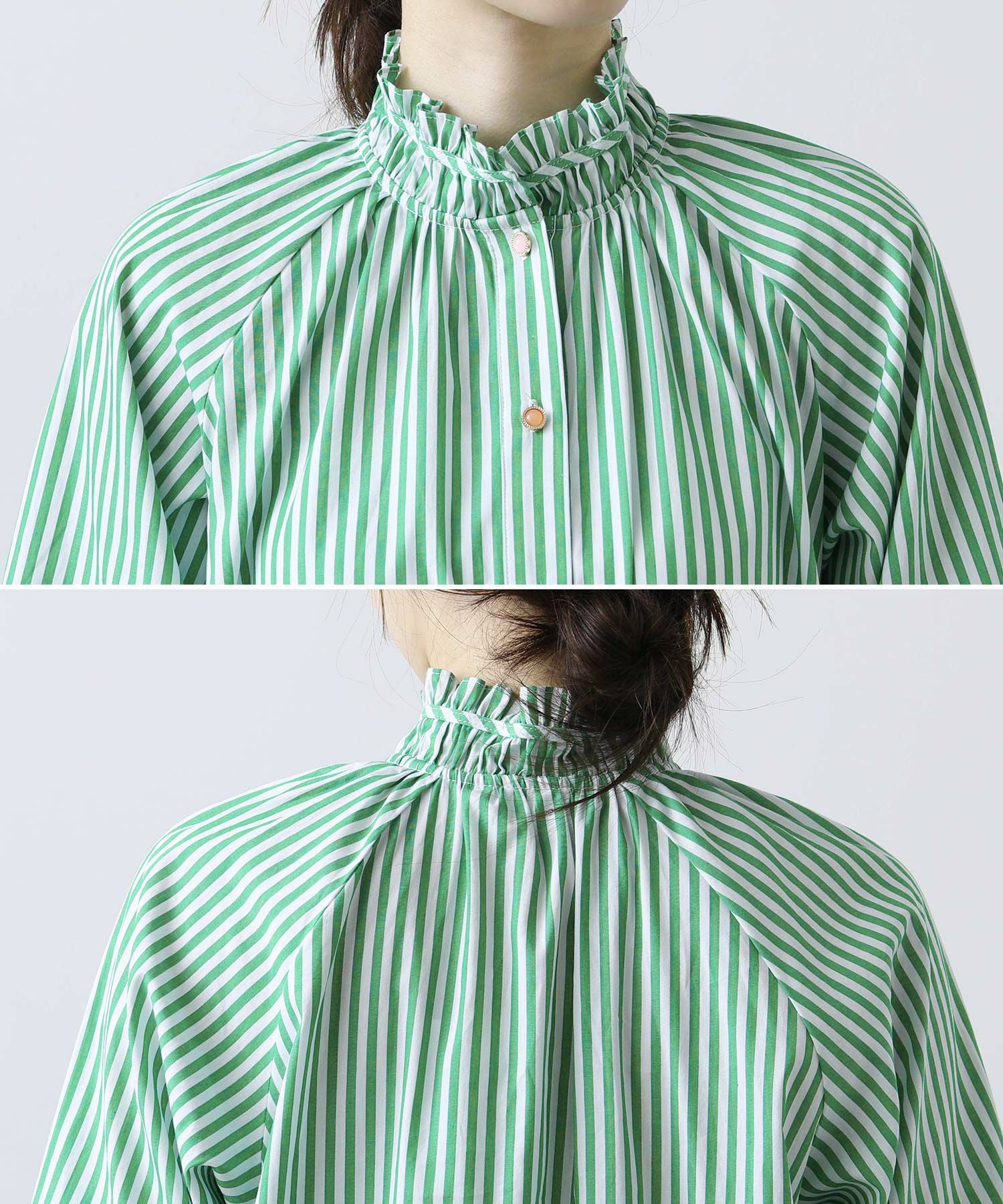 ネックのフリルには共布テープを施して衿を立ち上がりやすくデザインされ、顔周りを華やかな印象に。