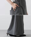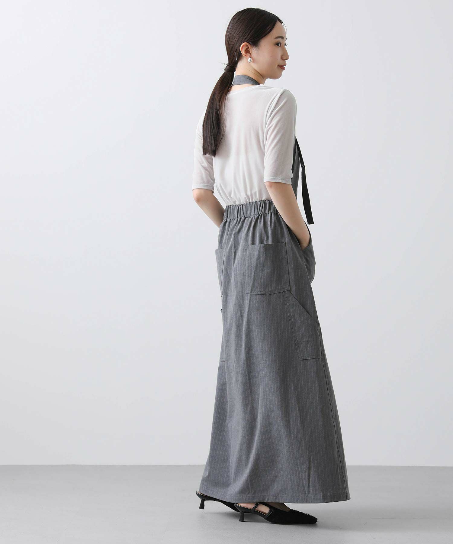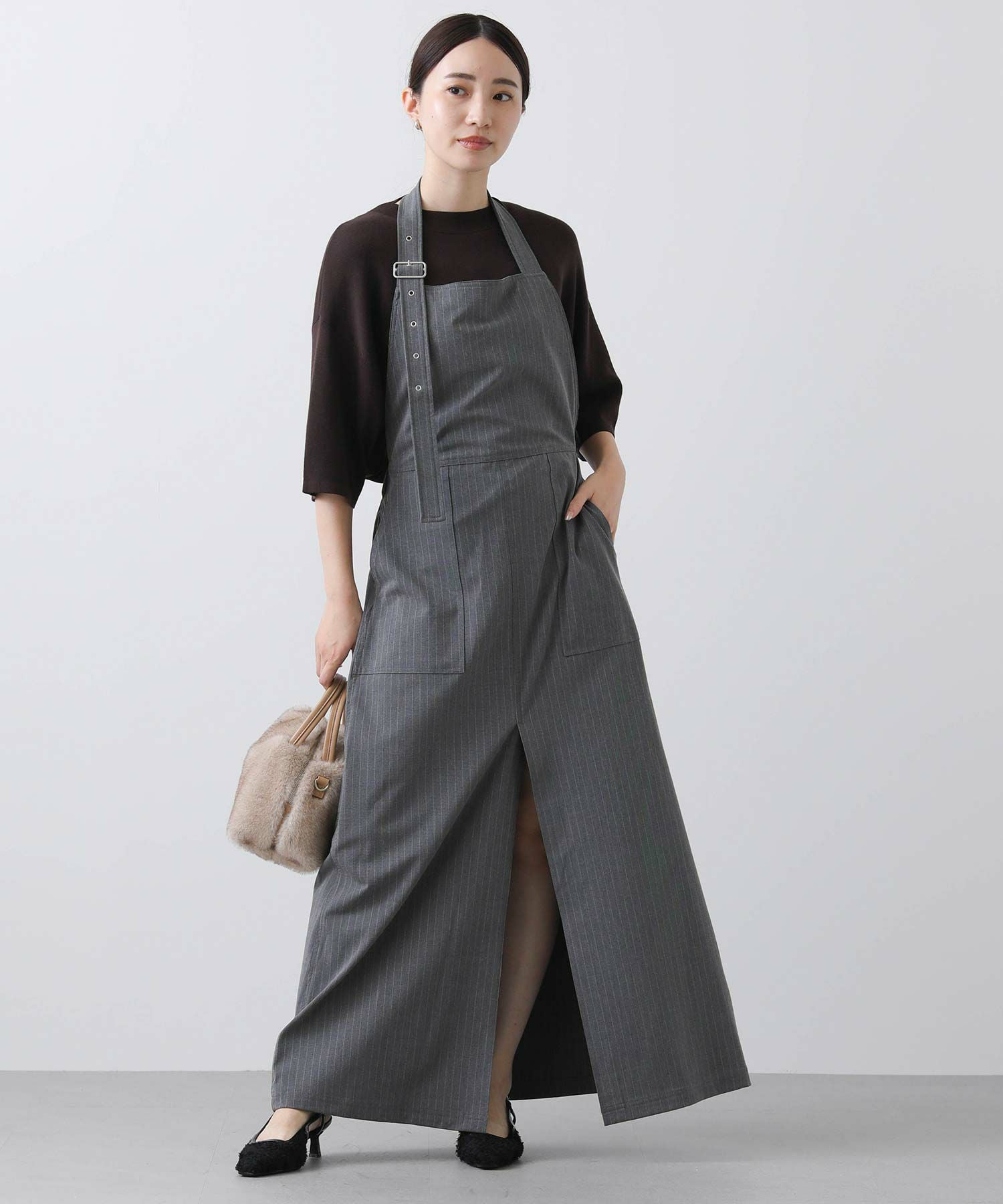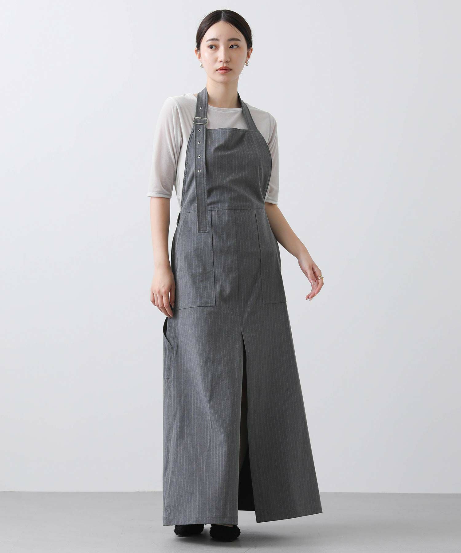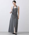 エプロン型で大胆に開いたbackスタイル・フロントには深スリットと、前後で違う表情が楽しめます。