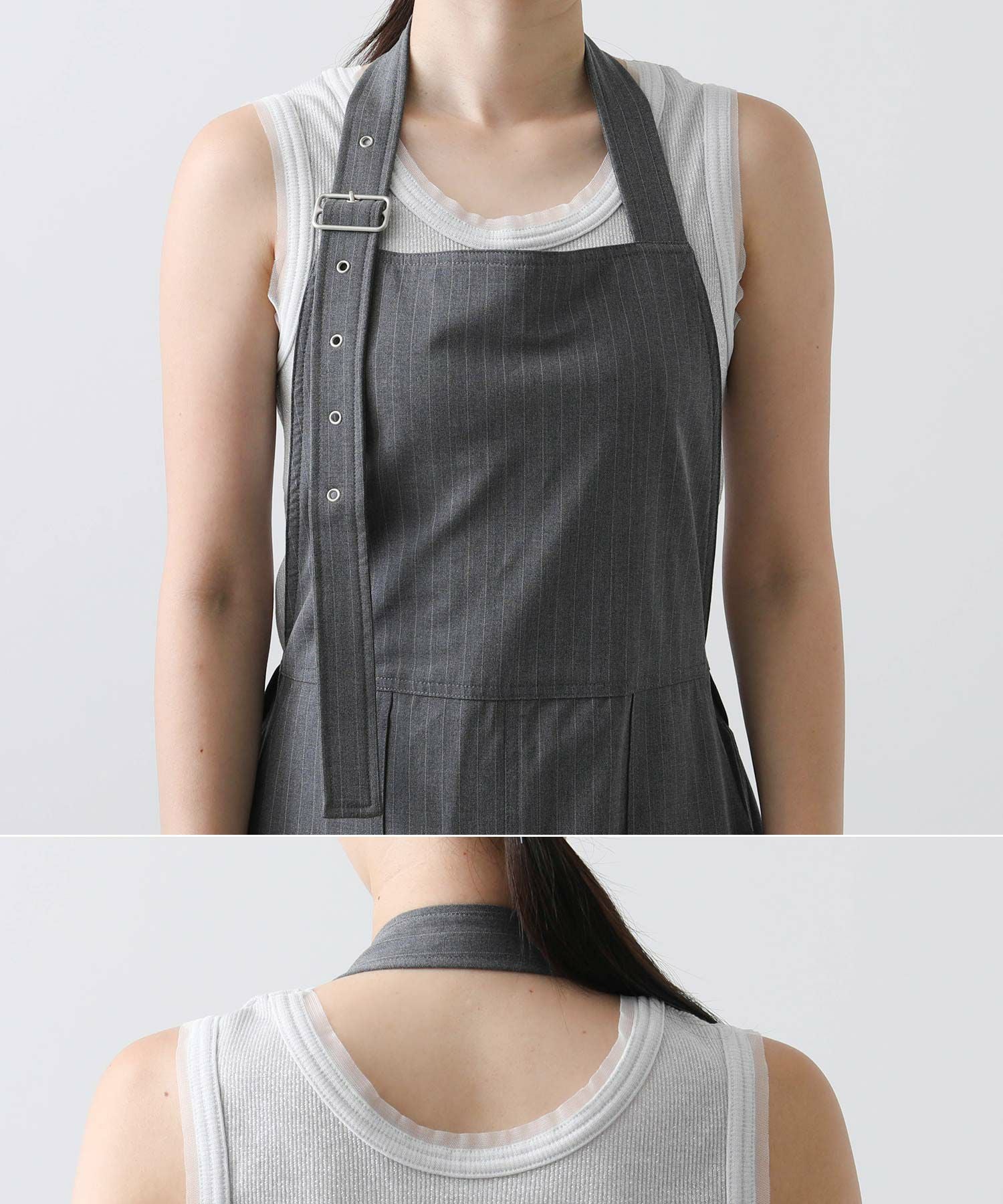 ホルターネック型のベルトは少し太くし、存在感あるバックルやアイレットがモードな印象に。