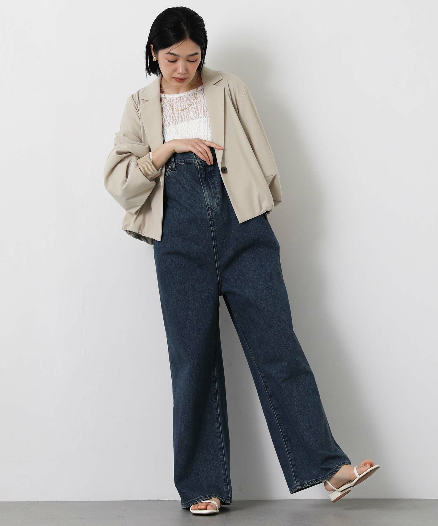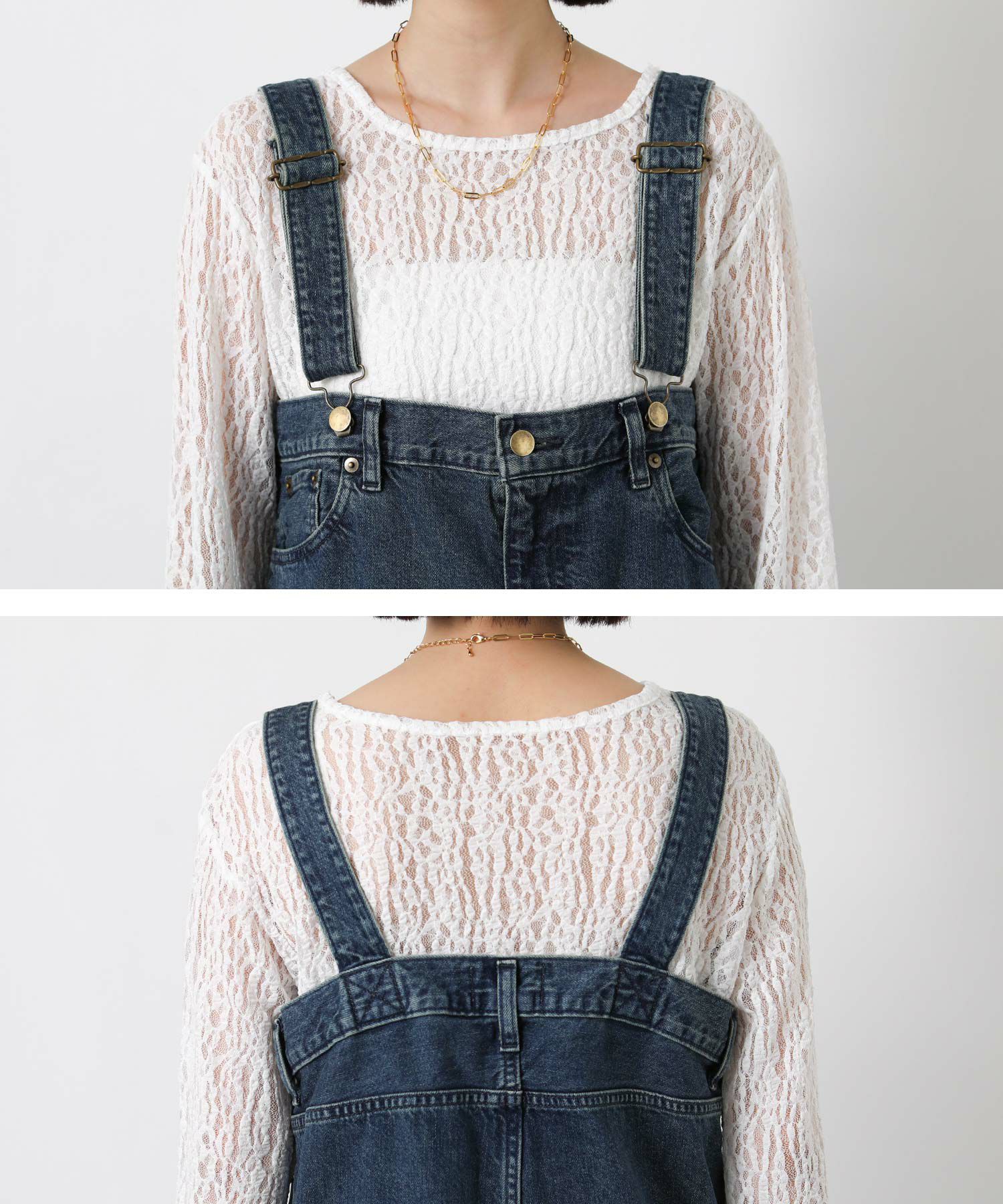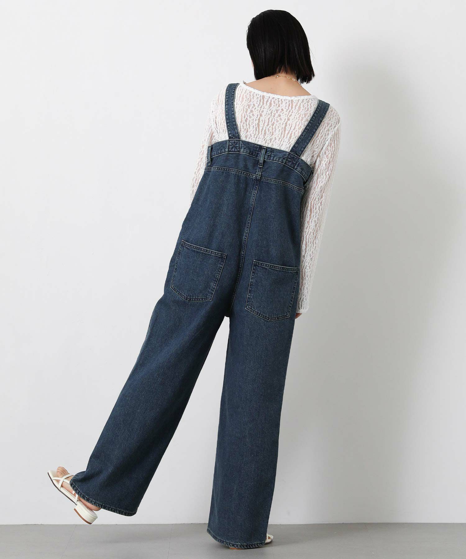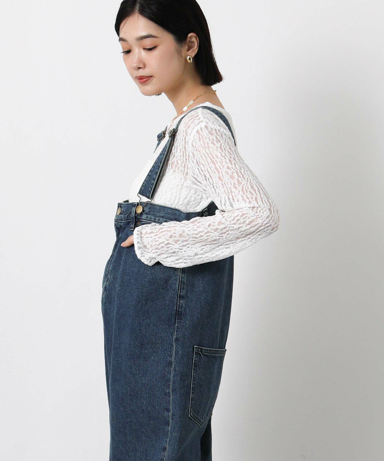 Leminor(ルミノア)のファイブポケットデニムを胸下まで穿いたようなデザインのサロペットをセレクト。