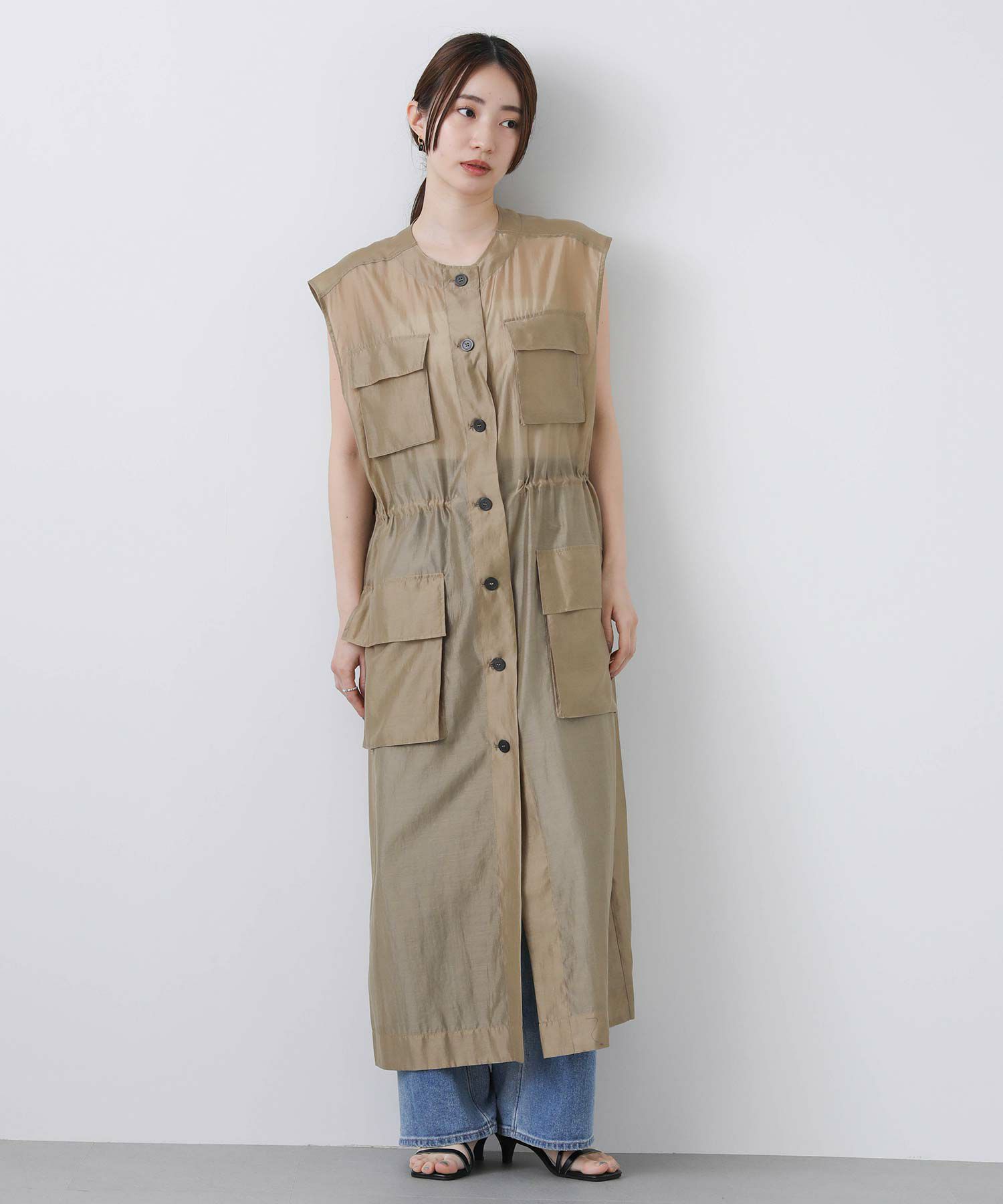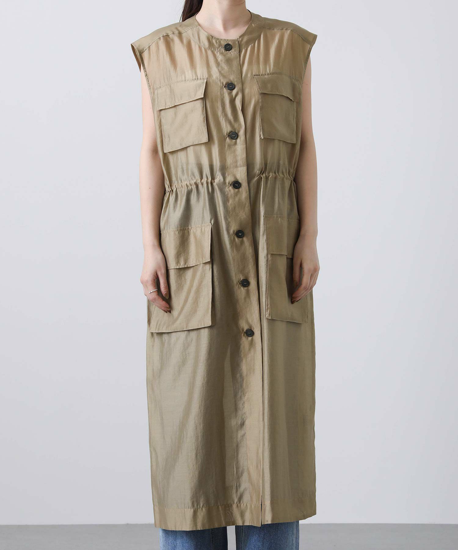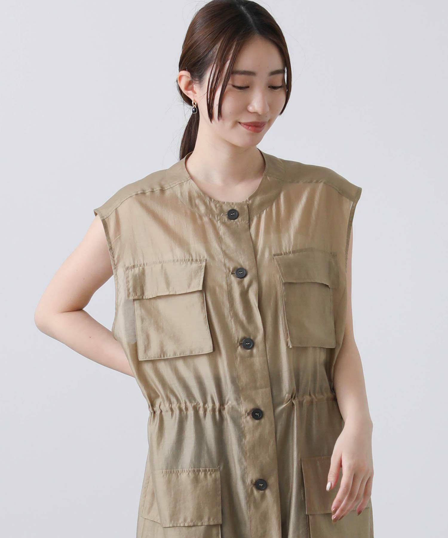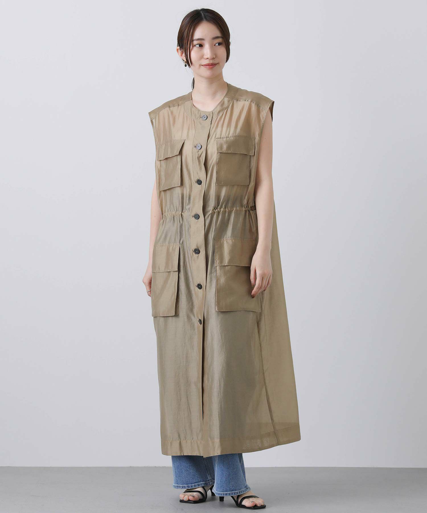 フロントはボタンを留めてワンピースとしても、開けてジレとしても着られます。