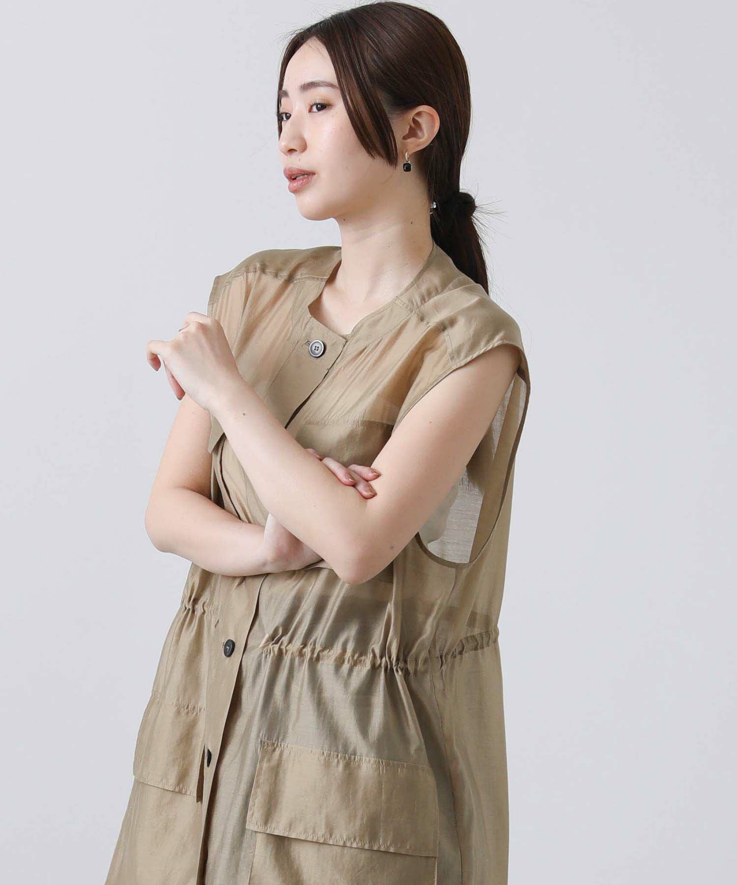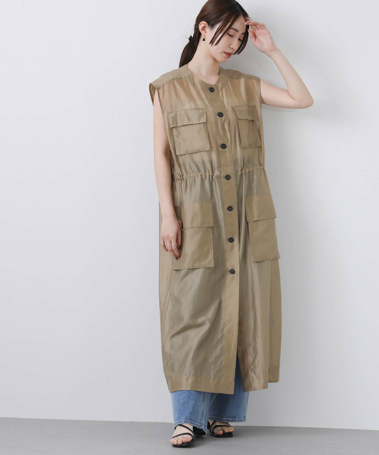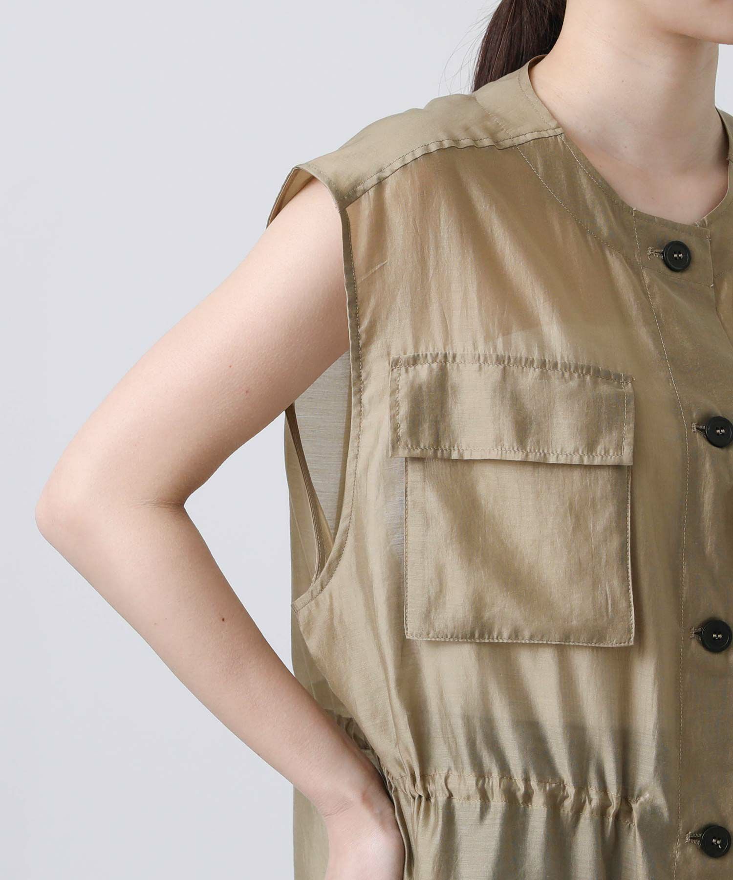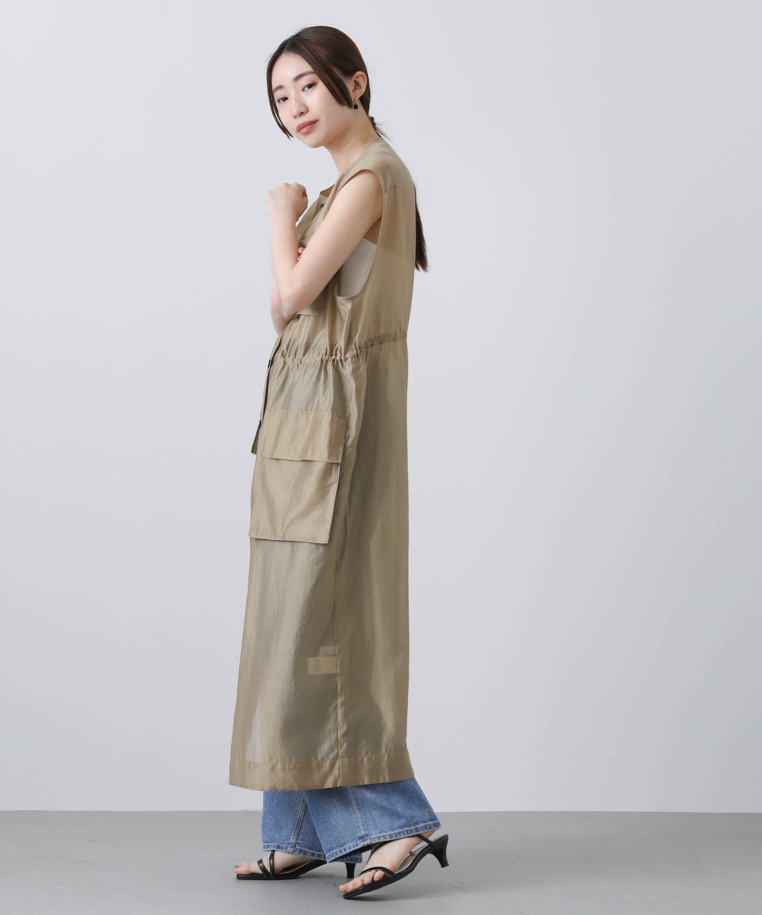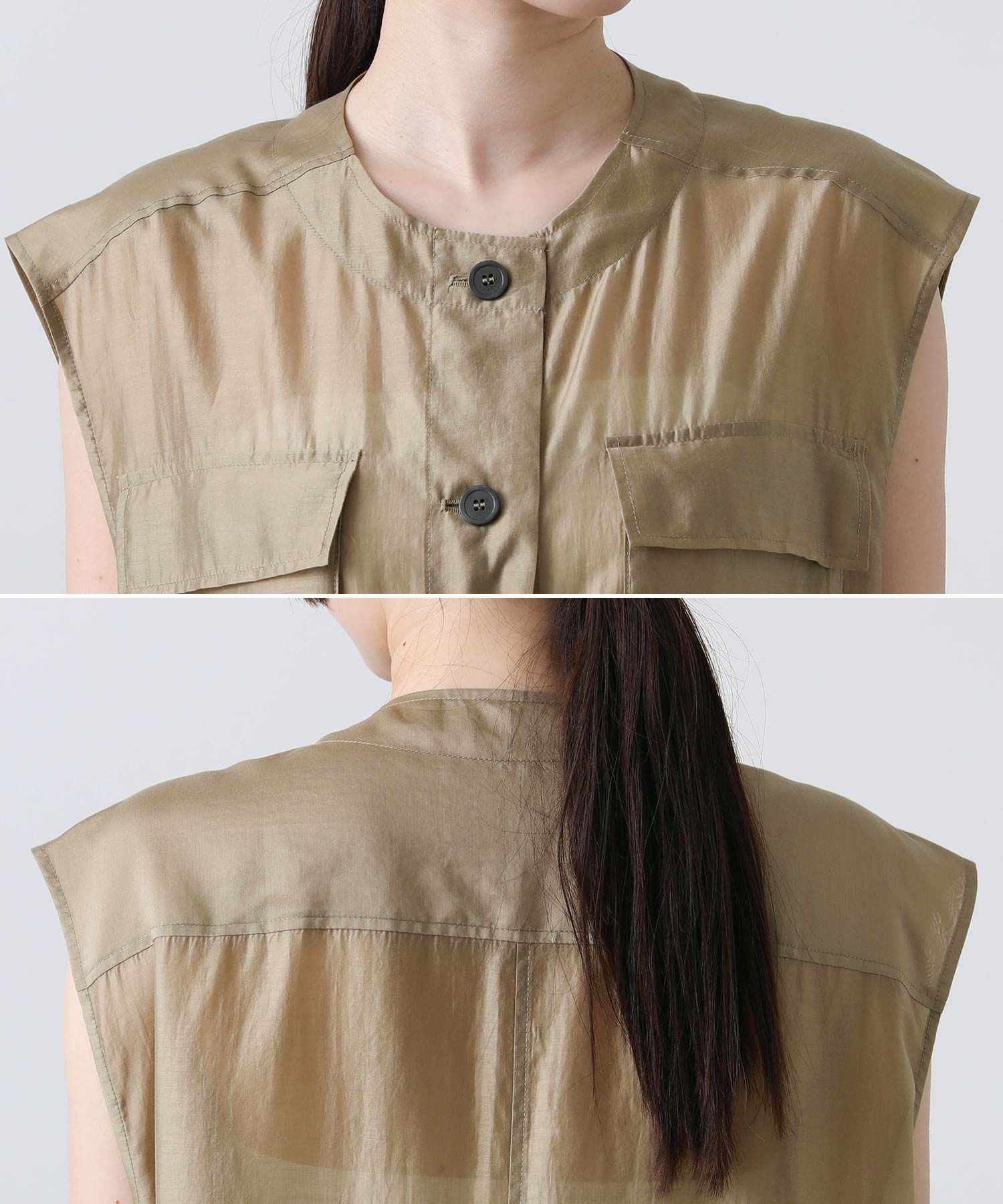 フロントはボタンを留めてワンピースとしても、開けてジレとしても着られます。