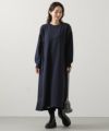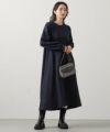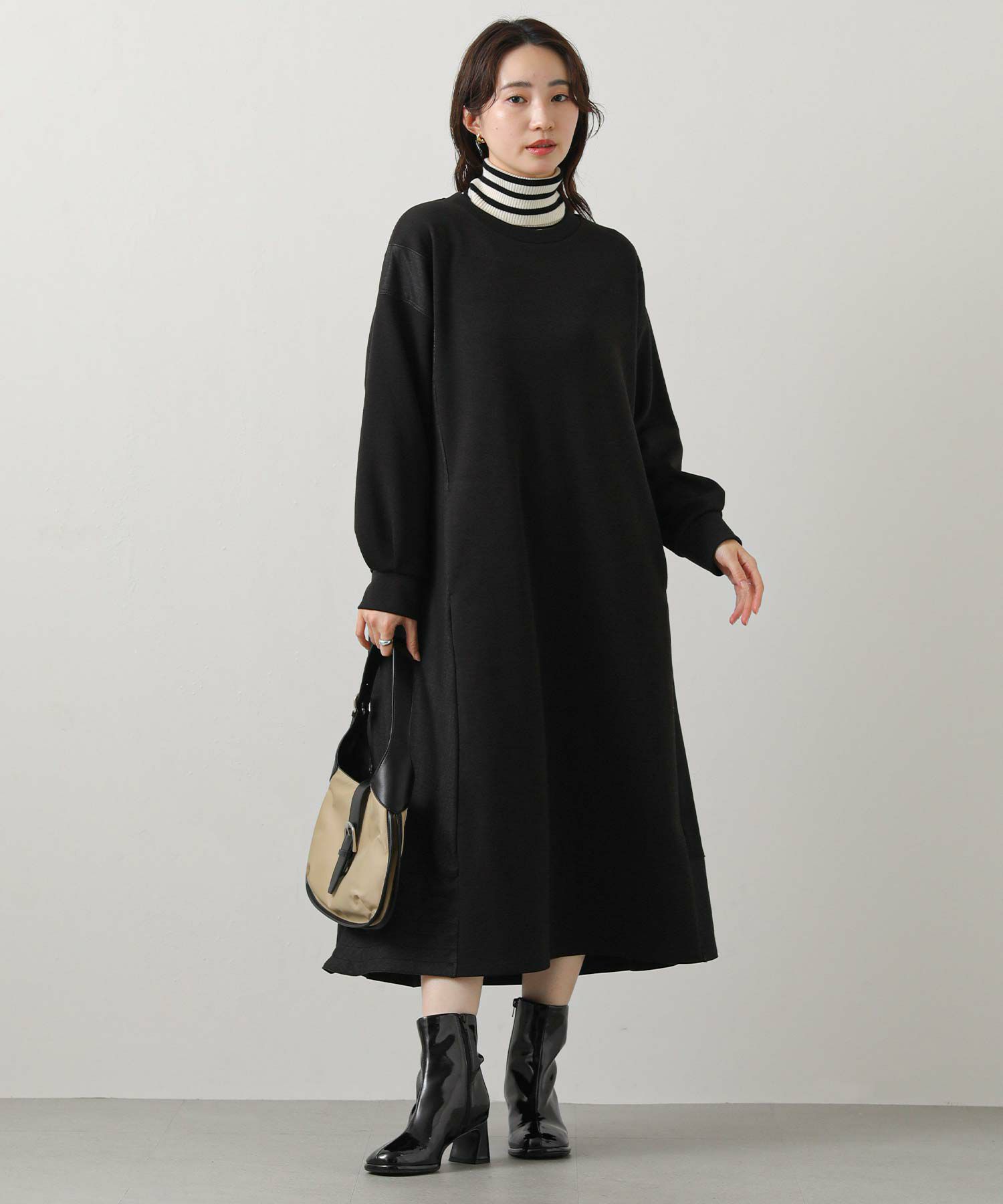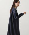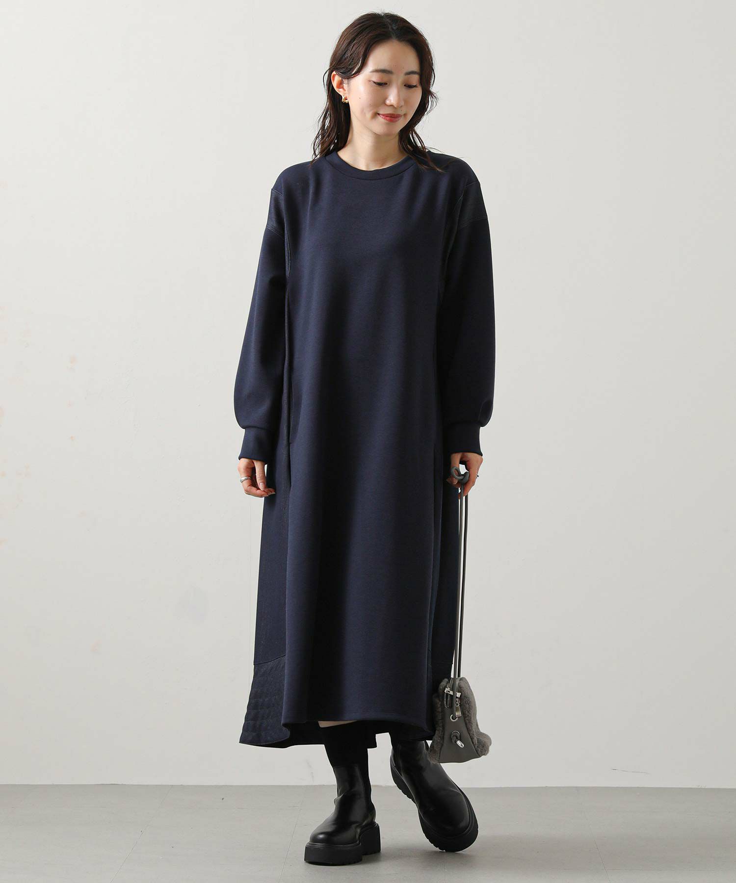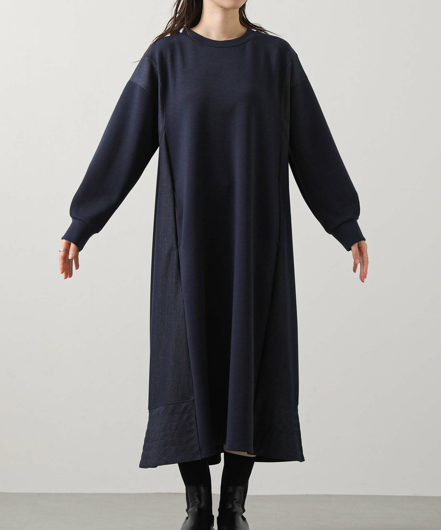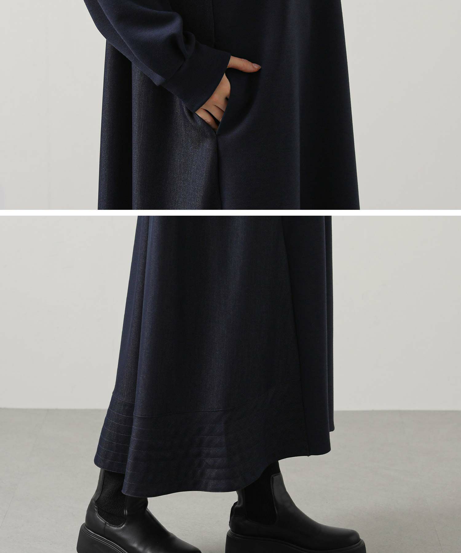 滑らかな素材感のTRデニムとダンボール素材をドッキングしたフレアワンピース。