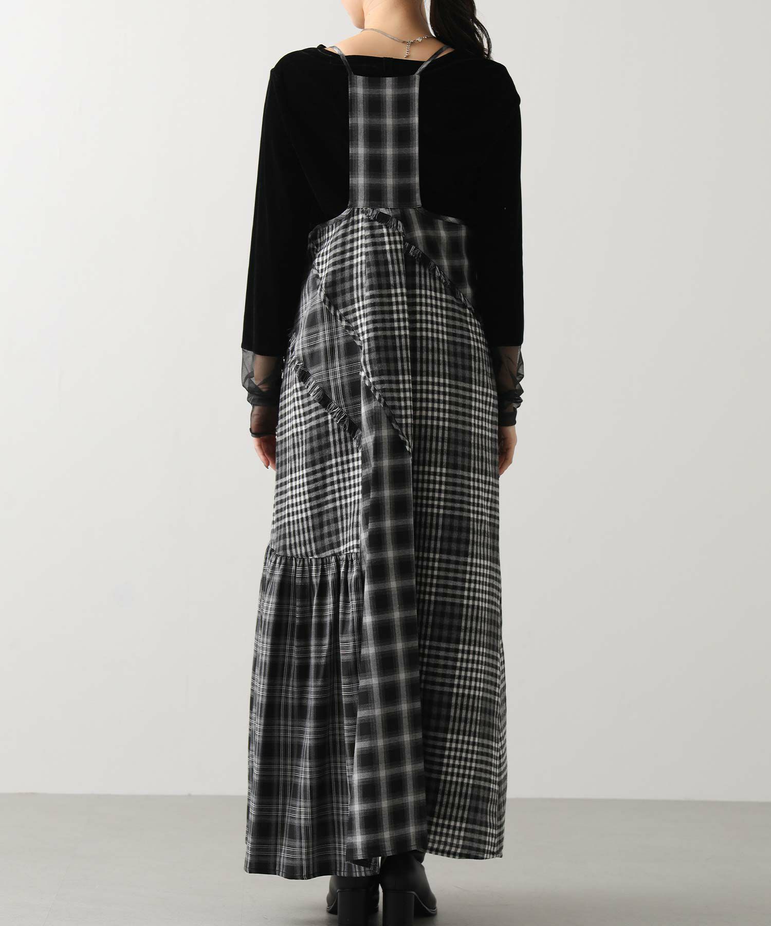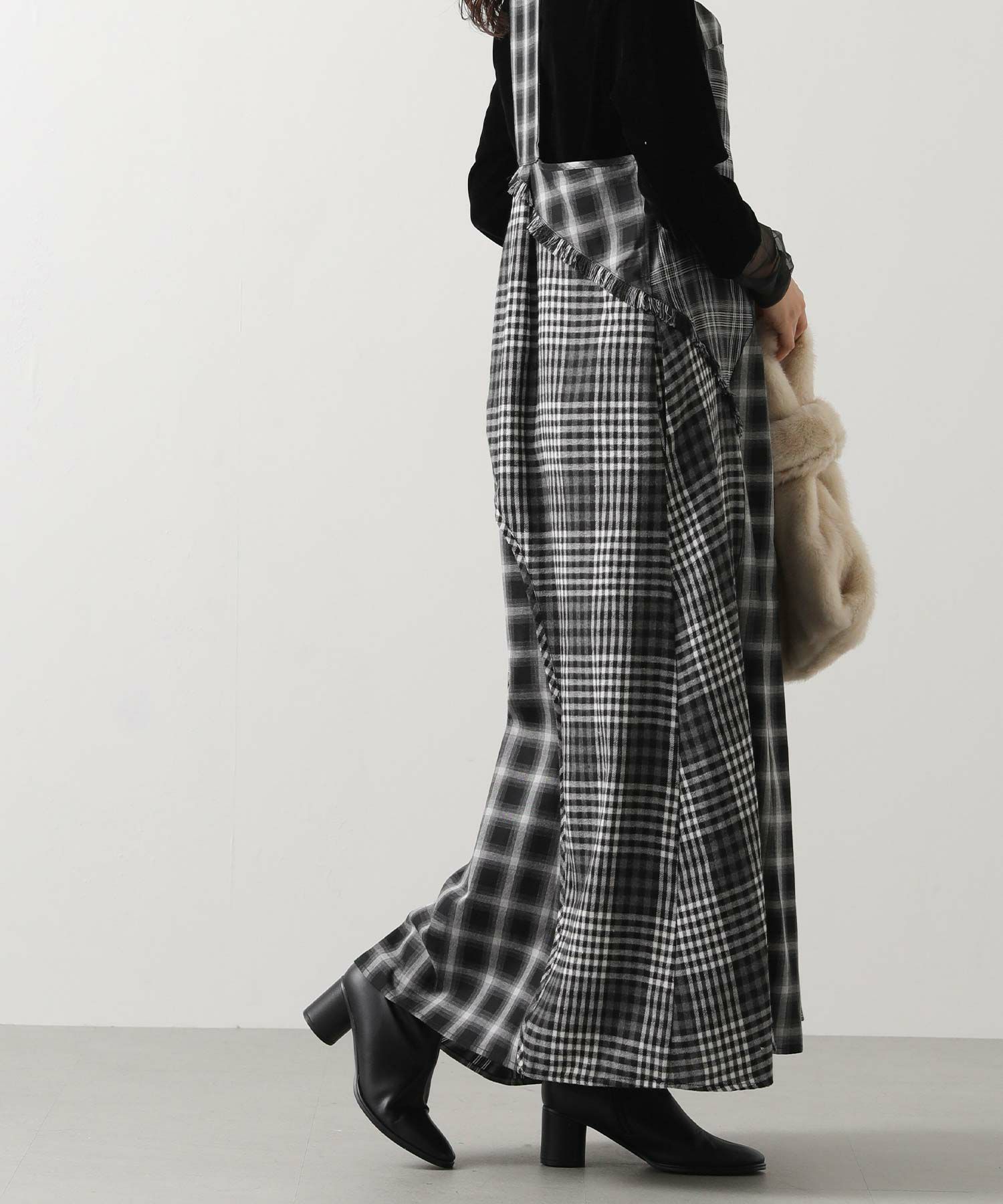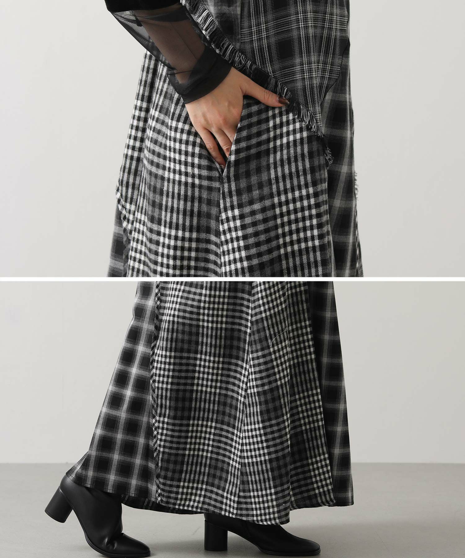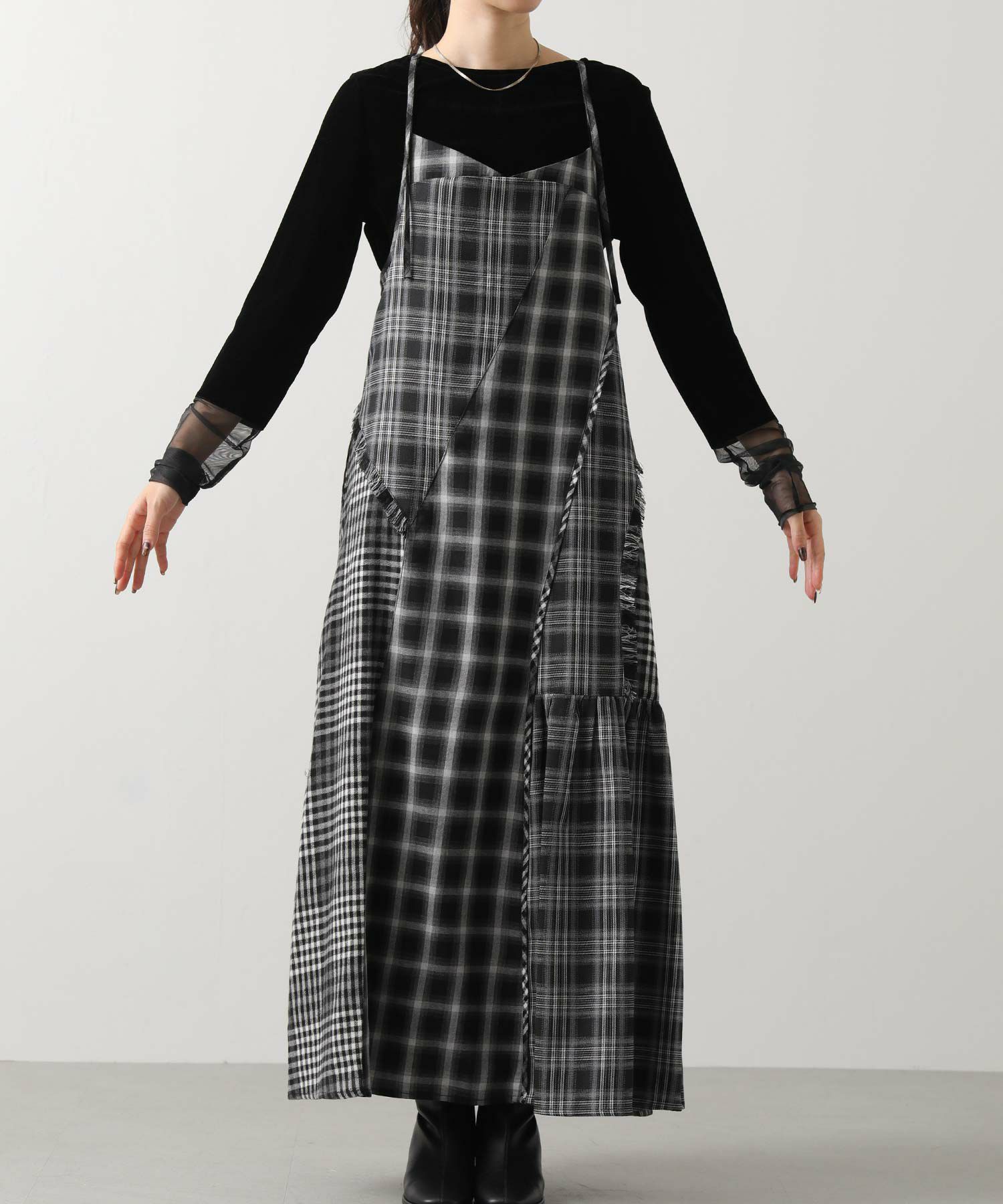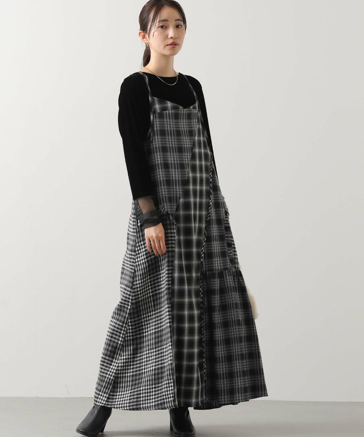 【AULAAILA(アウラアイラ】から、3種類のチェックをランダムに剥ぎ合わせ、アクセントにパイピングやフリンジを挟み込んだチェックコンビネーションロングキャミソールワンピースをセレクト。