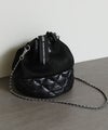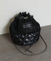 メッシュ素材とキルティング素材がドッキングされた巾着型ポーチバッグ。