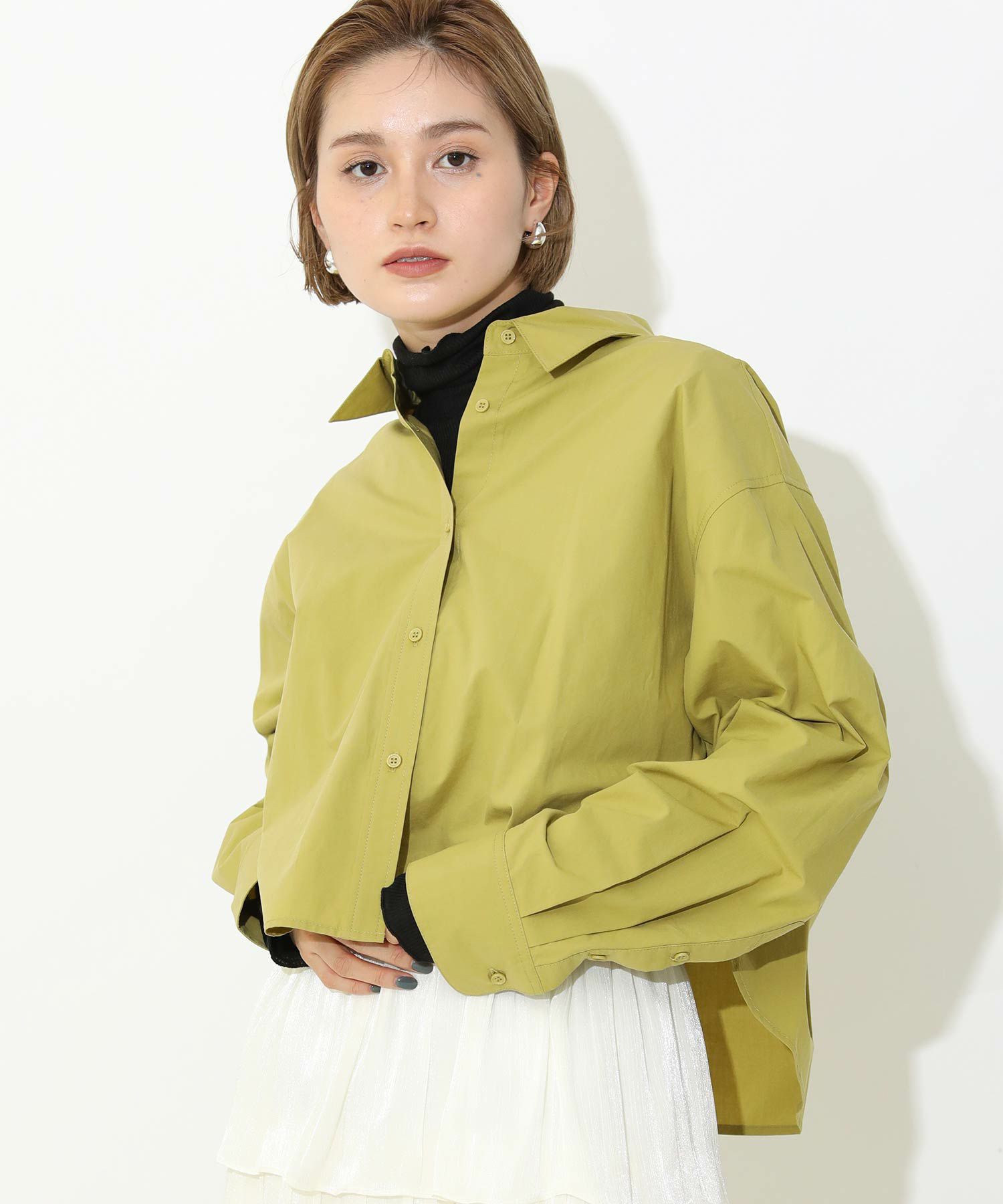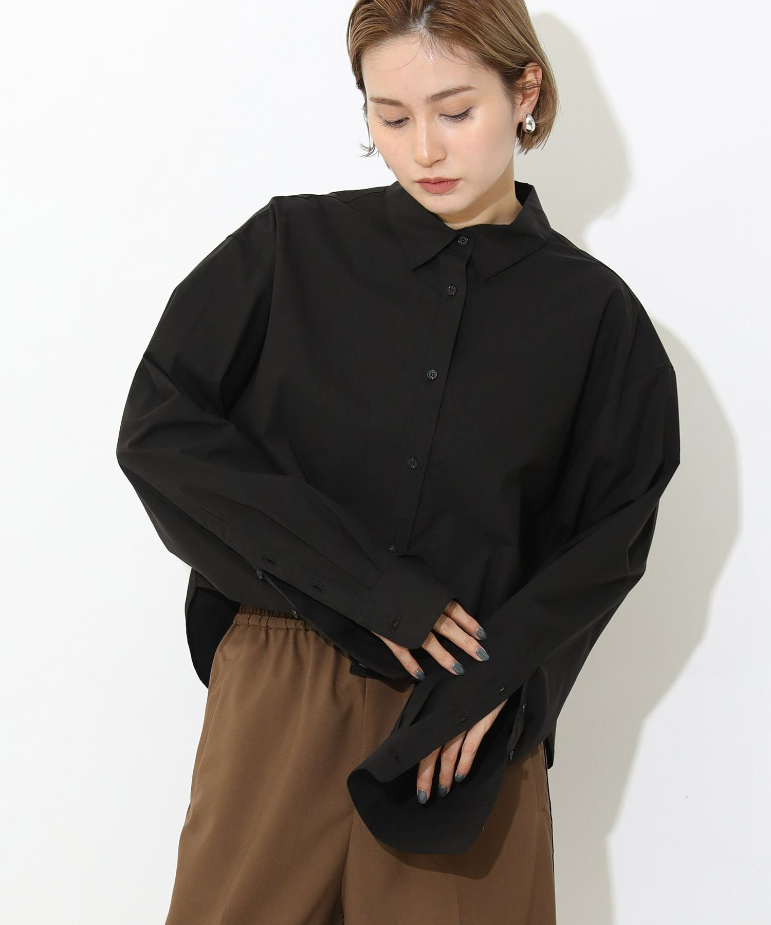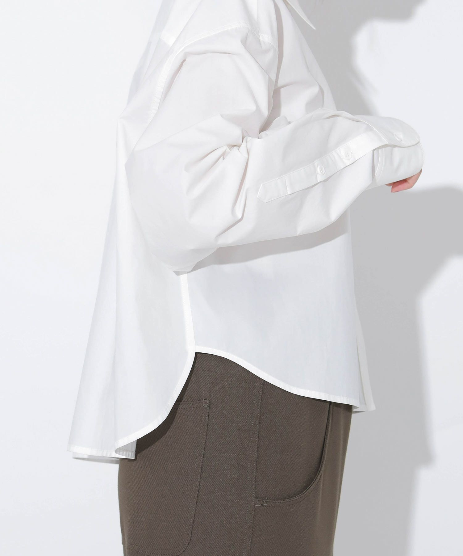 コンパクトな丈感とボリュームのある袖がトレンドライクなクロップドシャツ。脇に向かってカーブさせたヘムラインと、前後差のある丈がシンプルでもサマになる一枚。袖の開きを深めに設定し、開けるとまるでスリットのようなデザインに。後身頃にはタックをとり、ゆとりを持たせたやや大きめのシルエットはさまざまなボトムスと相性抜群。トップスとして着るのはもちろん、肌寒い季節は羽織りとして、秋冬はニットやスウェットのインナーとして着るのもオススメです。さらっとした綿素材がオンオフ問わず、ロングシーズン活躍するアイテムです。