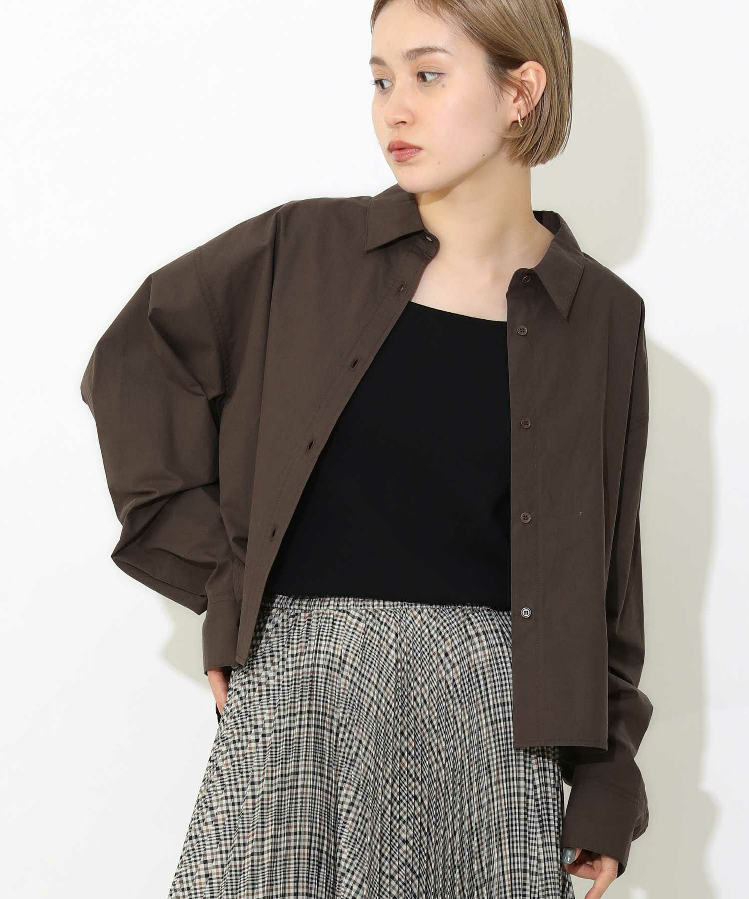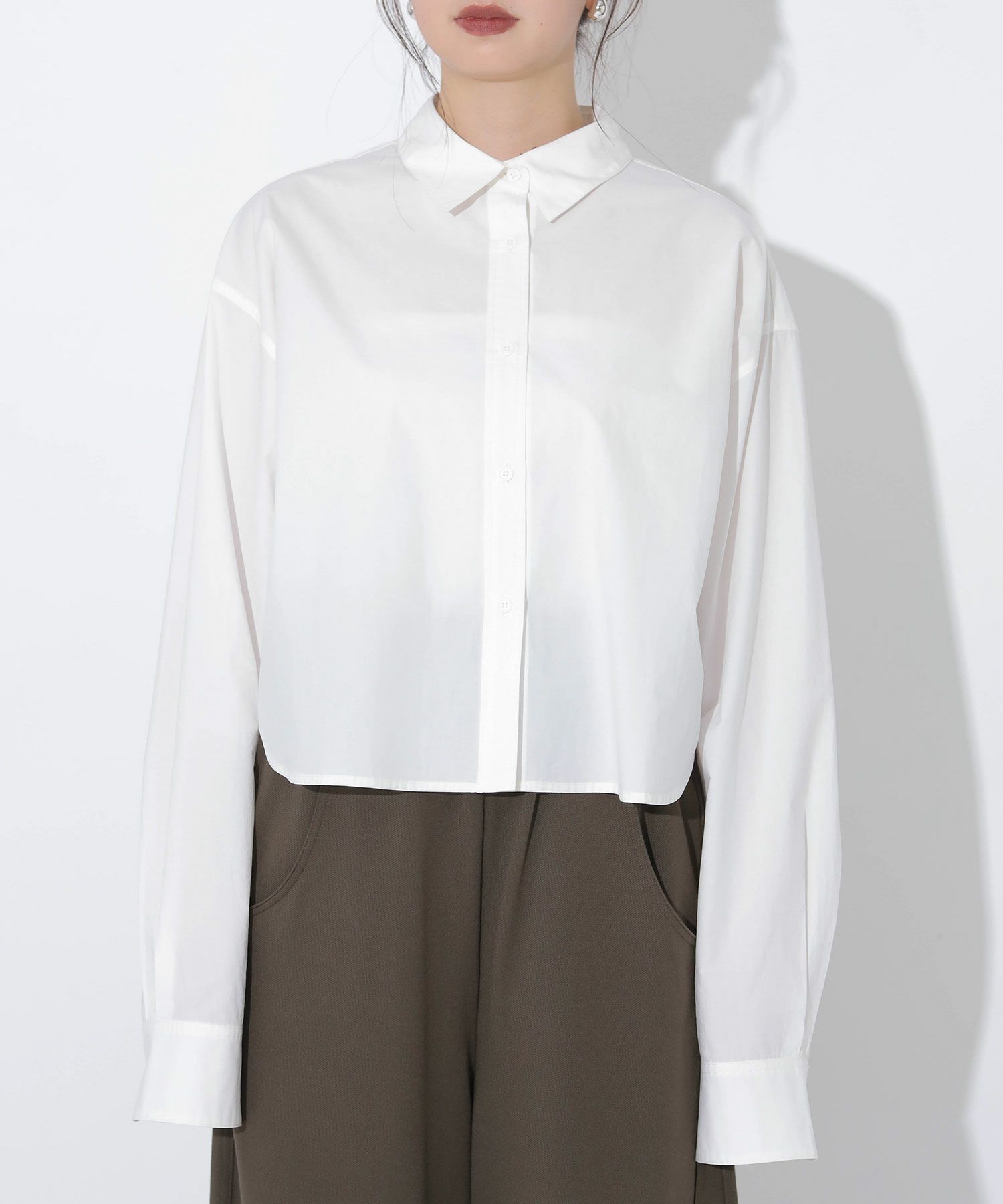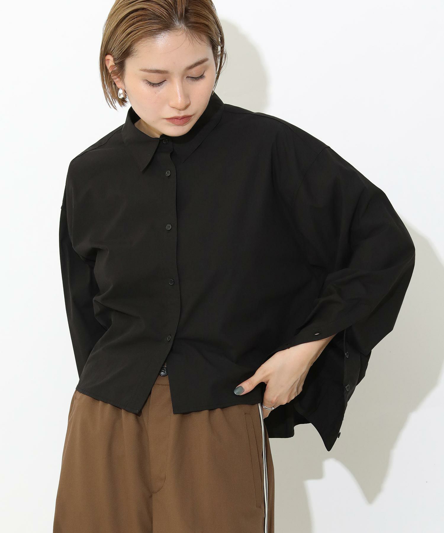 コンパクトな丈感とボリュームのある袖がトレンドライクなクロップドシャツ。脇に向かってカーブさせたヘムラインと、前後差のある丈がシンプルでもサマになる一枚。袖の開きを深めに設定し、開けるとまるでスリットのようなデザインに。後身頃にはタックをとり、ゆとりを持たせたやや大きめのシルエットはさまざまなボトムスと相性抜群。トップスとして着るのはもちろん、肌寒い季節は羽織りとして、秋冬はニットやスウェットのインナーとして着るのもオススメです。さらっとした綿素材がオンオフ問わず、ロングシーズン活躍するアイテムです。