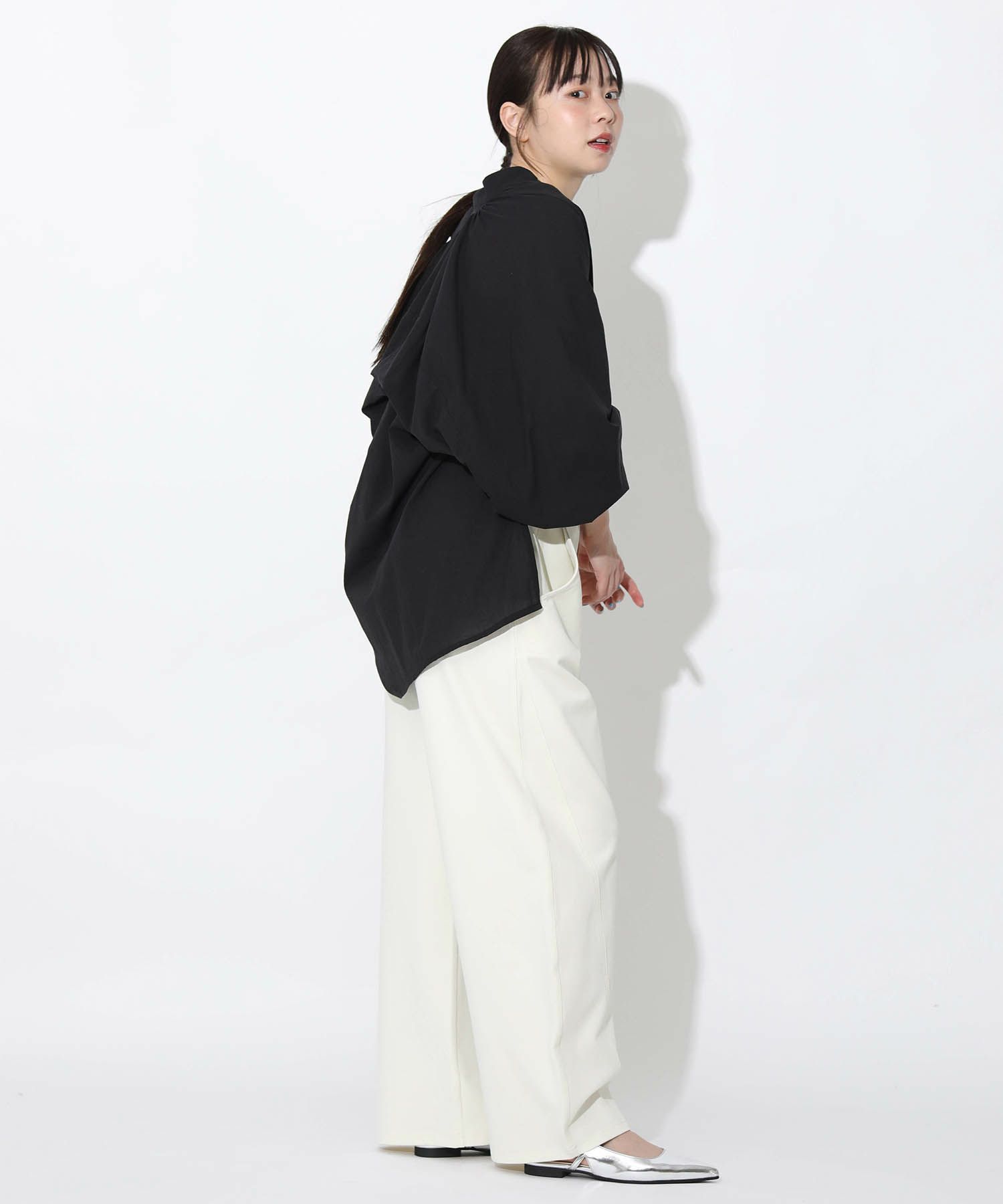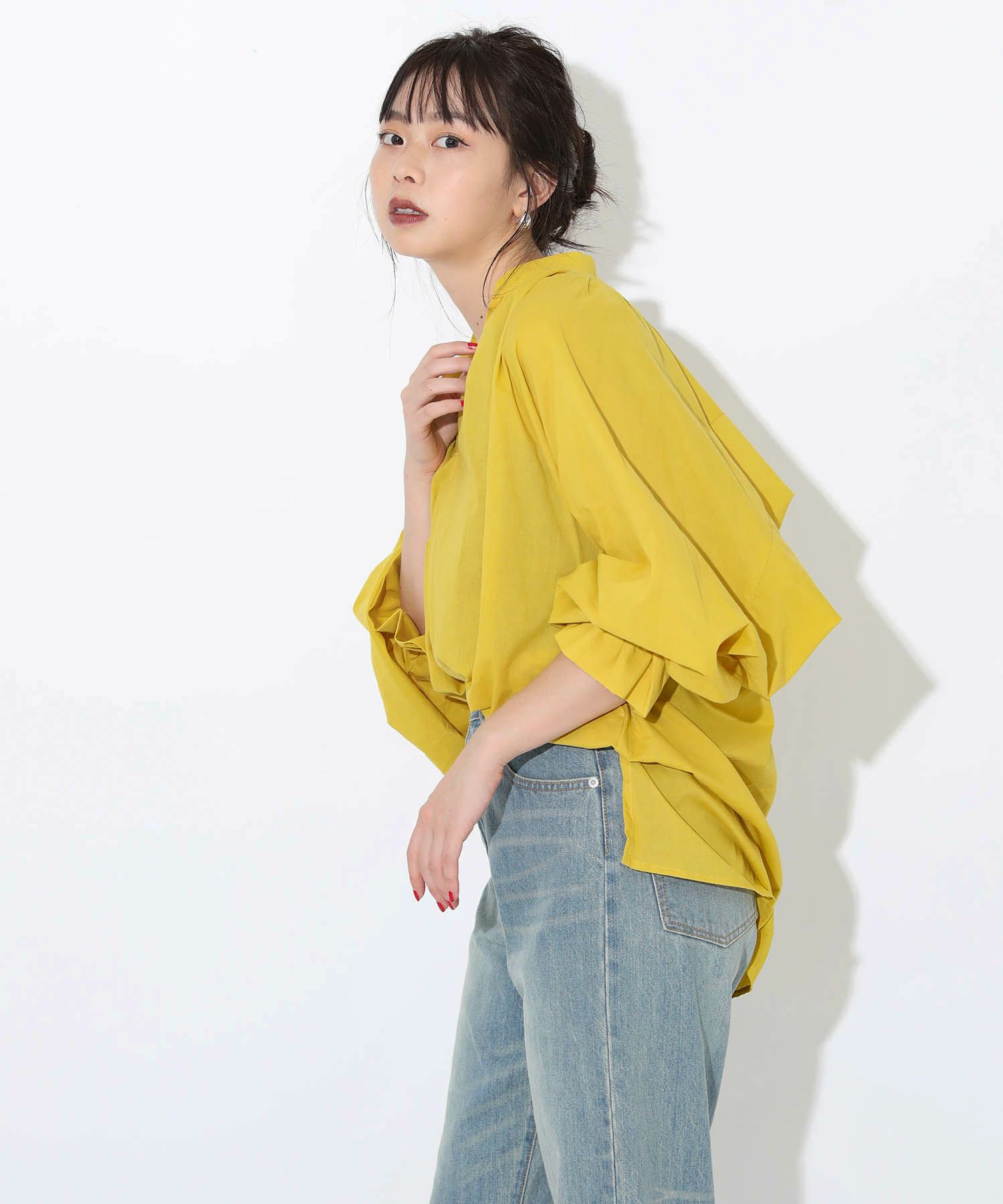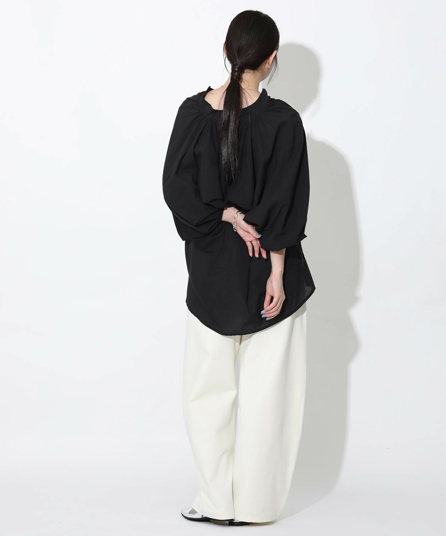 軽やかな素材を使用しており、動くたびにバックのギャザーデザインが空気感を演出できるのがポイントです。大きめの袖がトレンド感を出しつつ、リラックスした雰囲気で着こなせます。深めのVネックがデコルテを美しく見せ、さまざまなボトムスとの相性も抜群。カジュアルな日常使いから、少し特別なシーンまで幅広く対応できる、デイリーコーデに欠かせない一着です。シンプルに着こなしても存在感を放つ逸品です。
