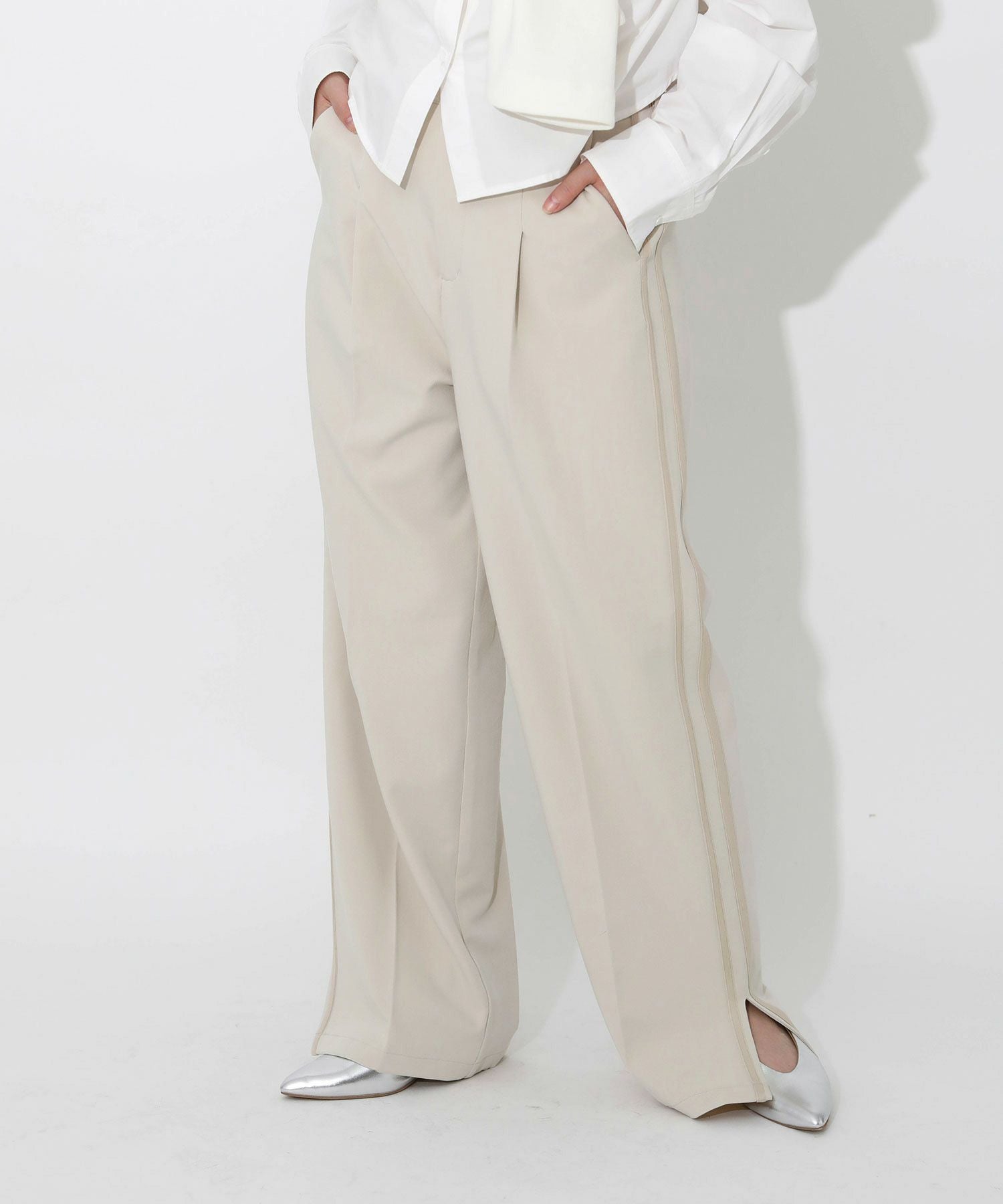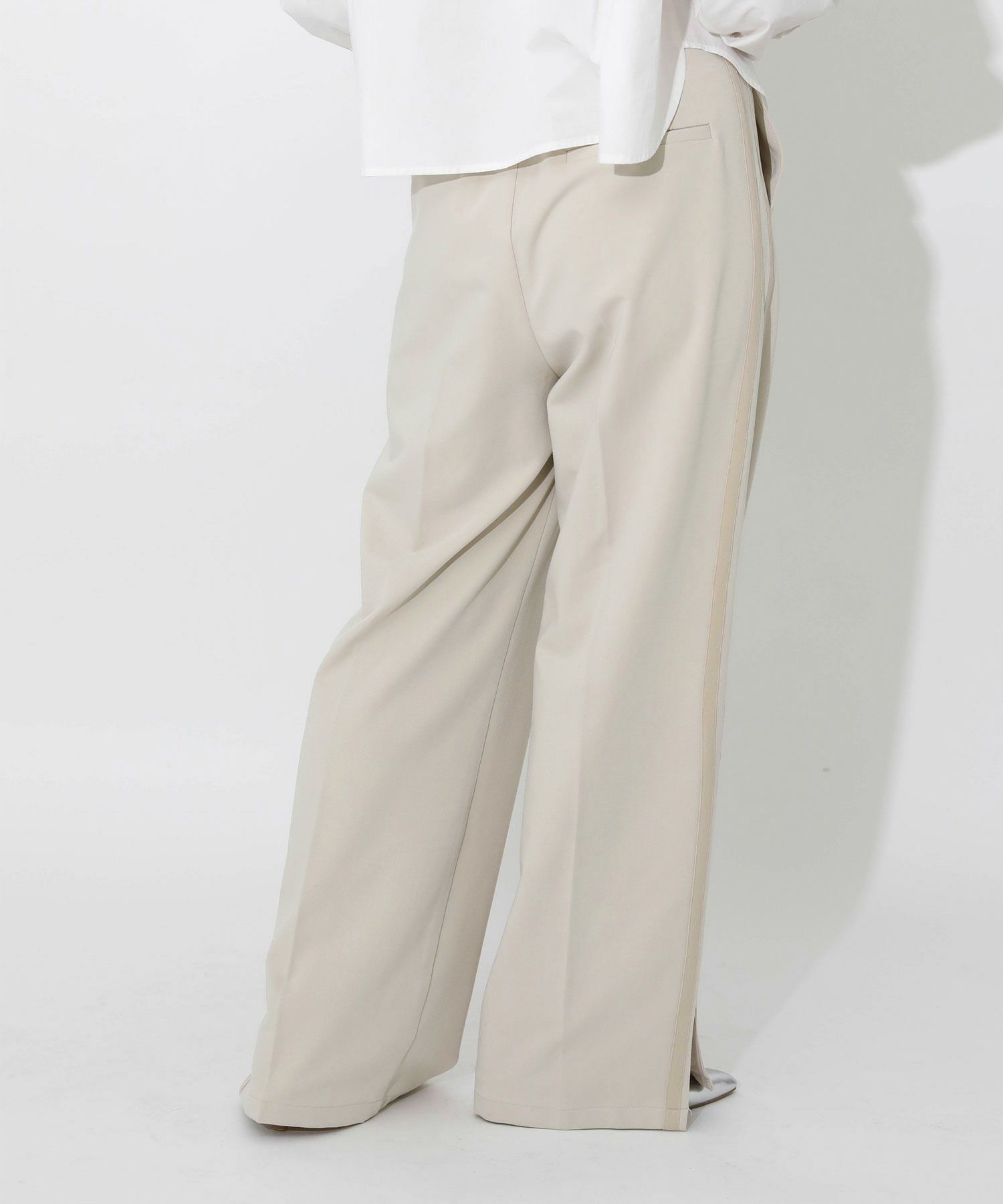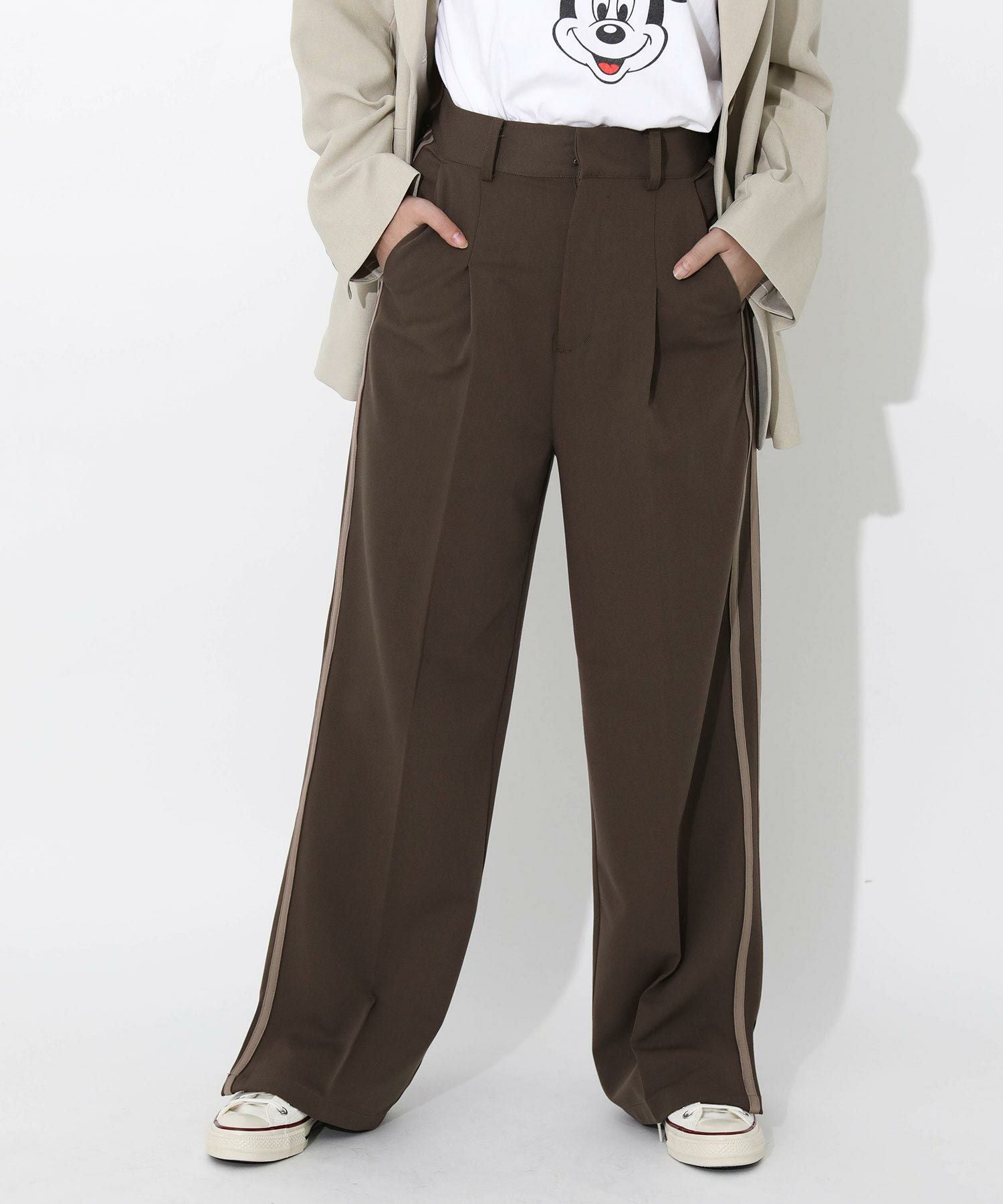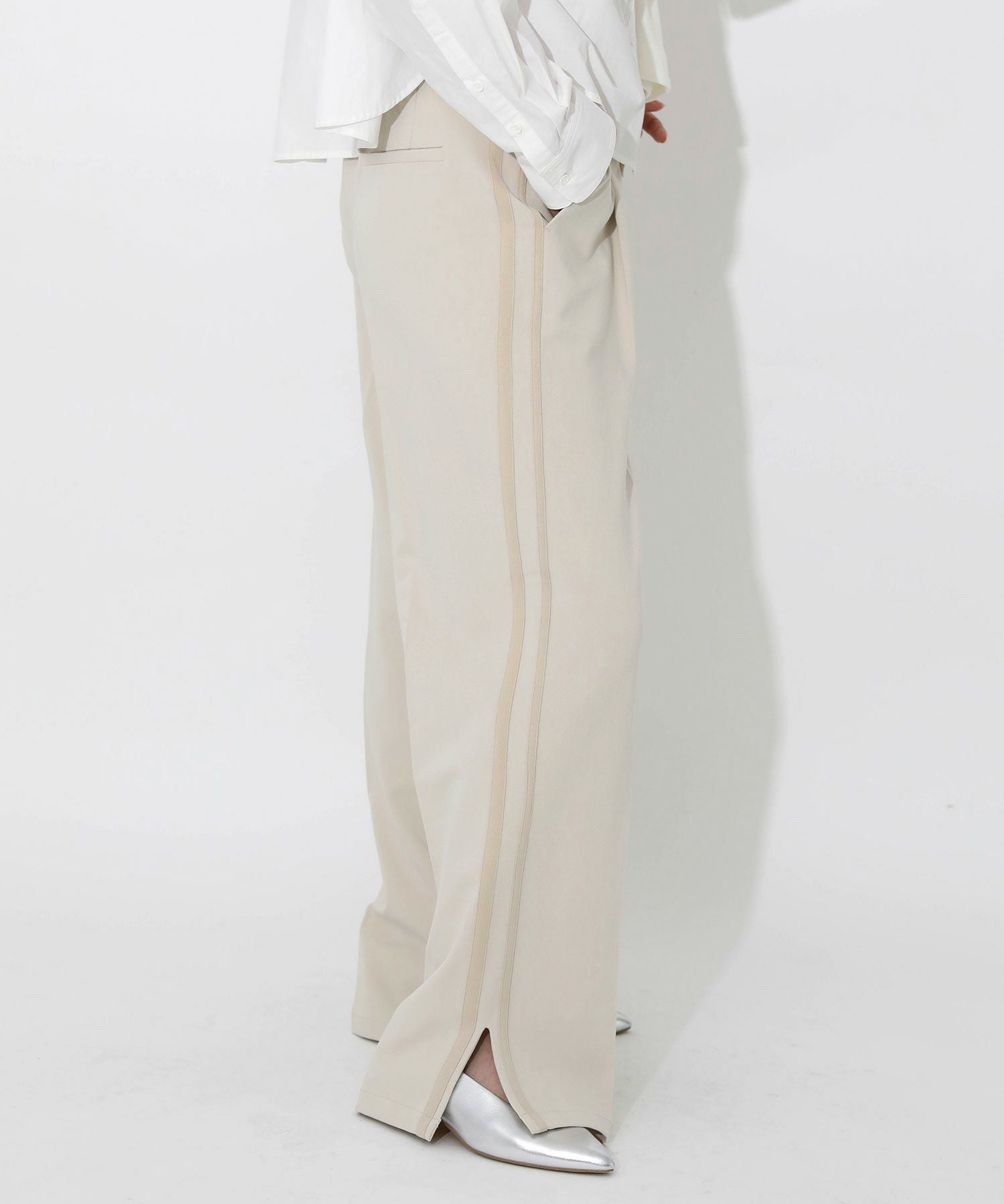 今季トレンドのラインパンツをキレイめにアップデート。