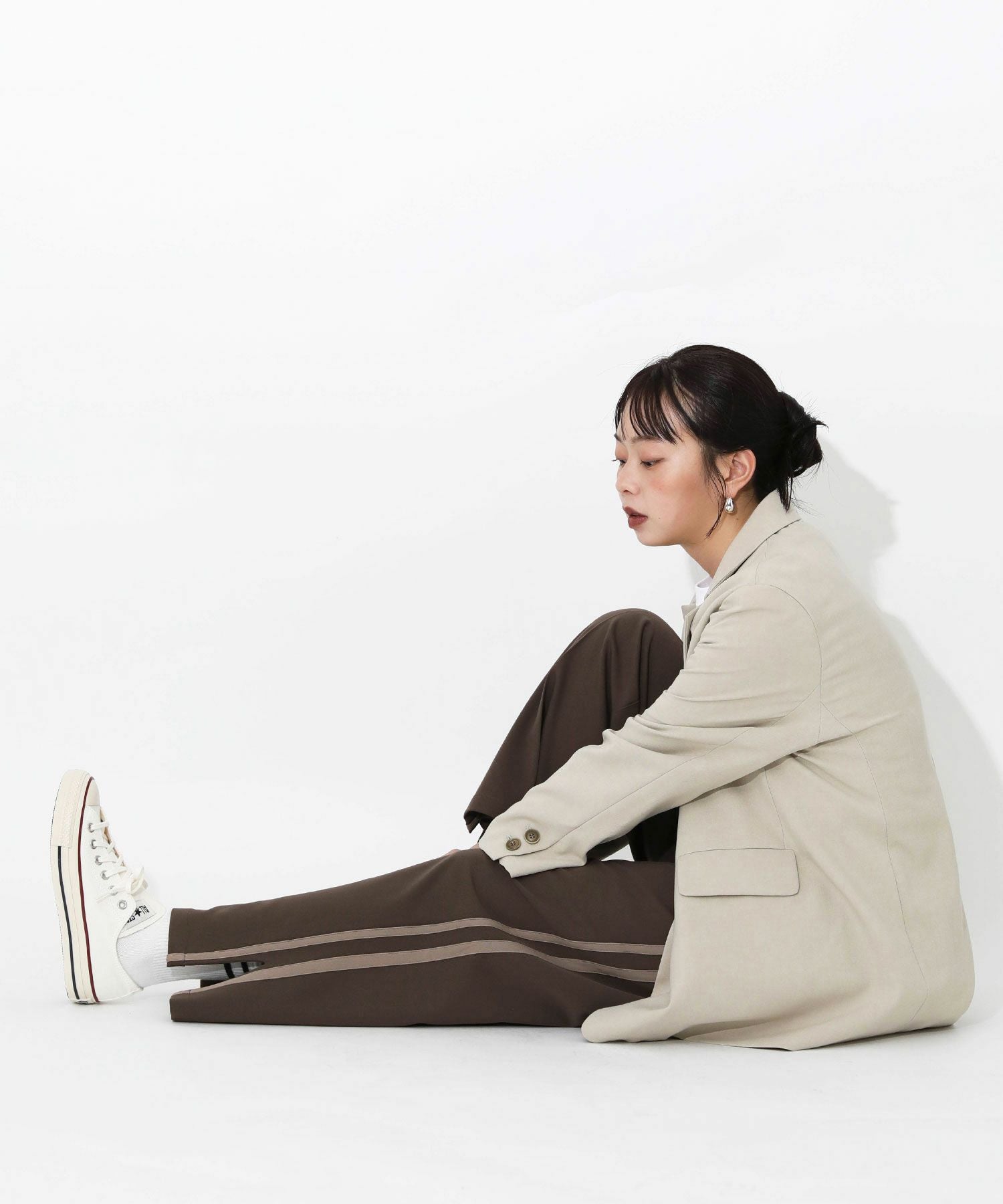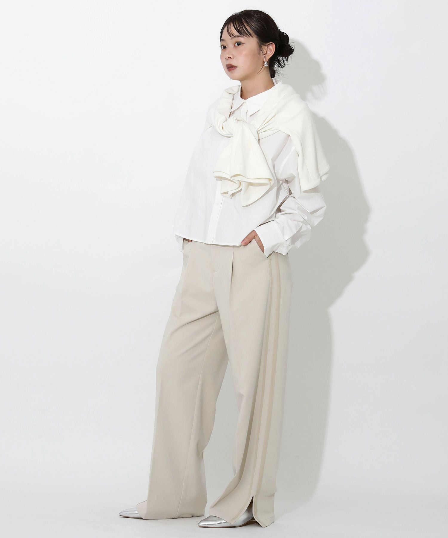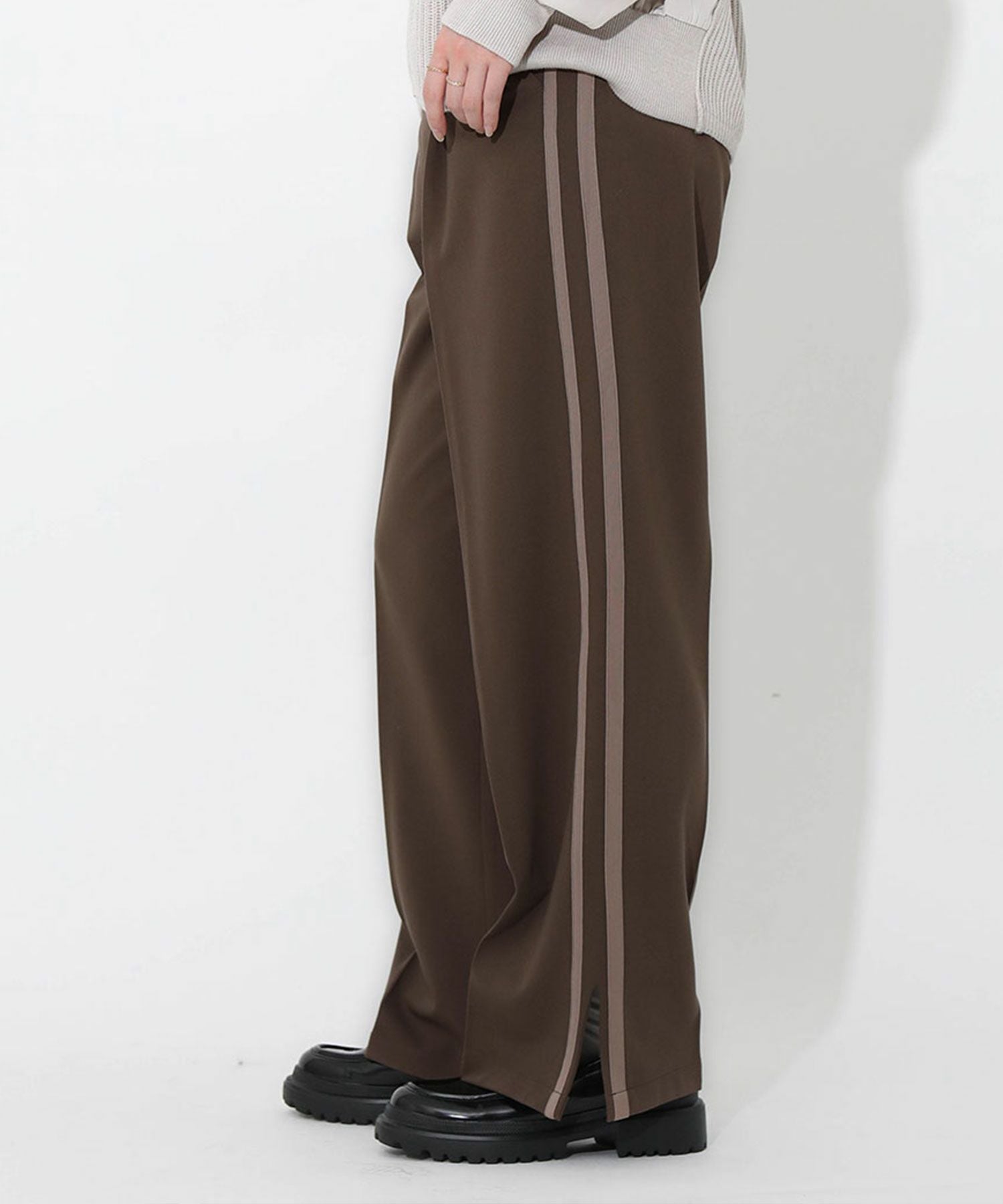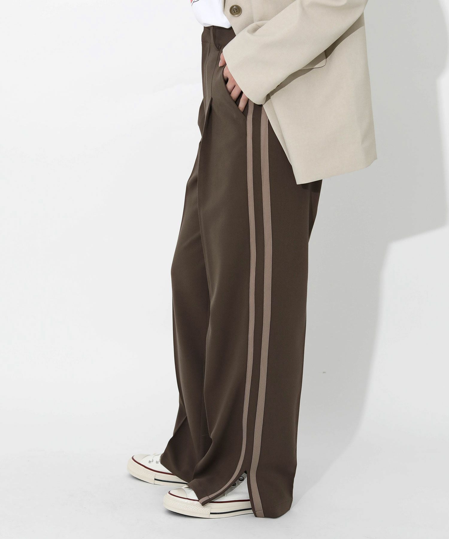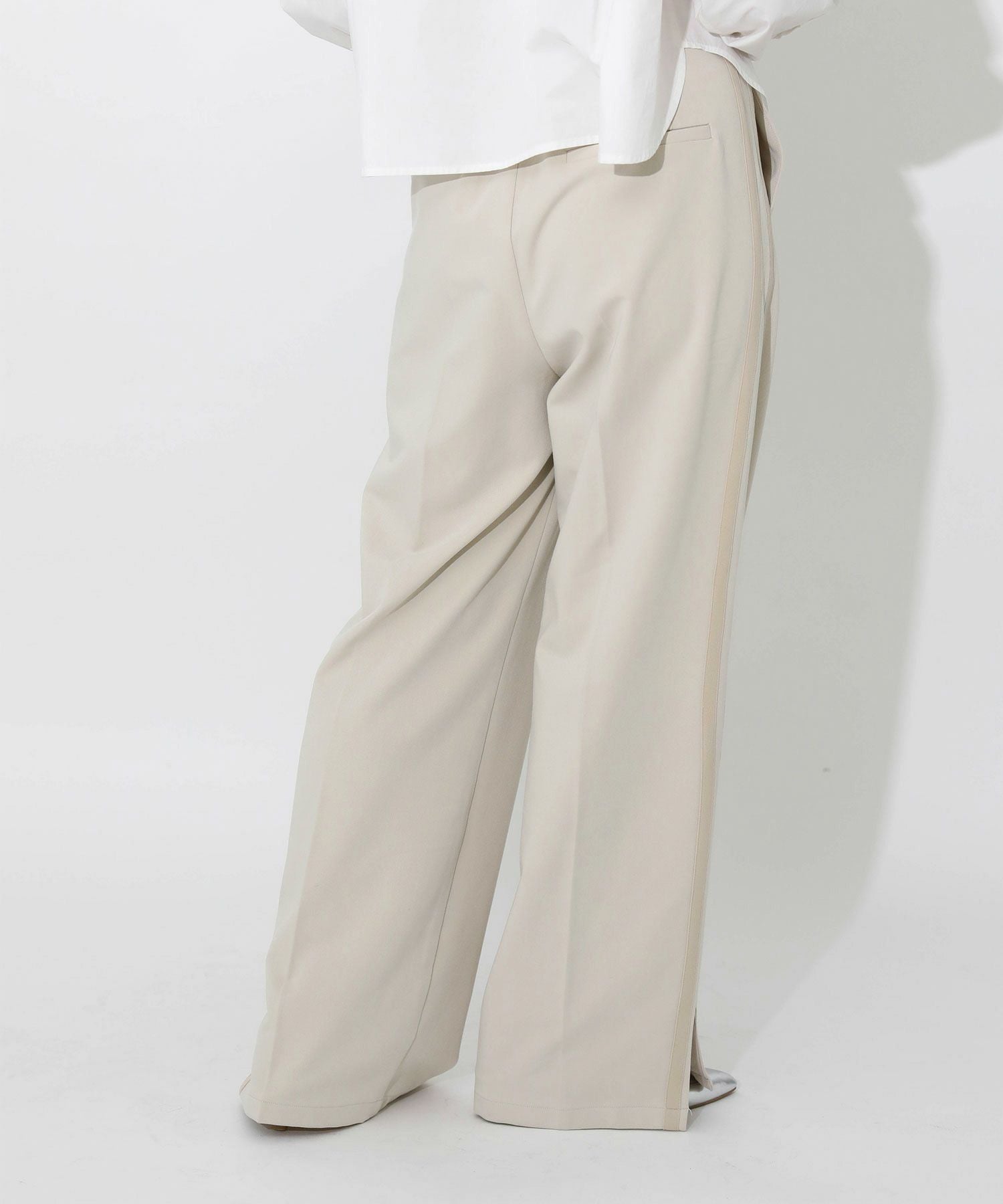 今季トレンドのラインパンツをキレイめにアップデート。