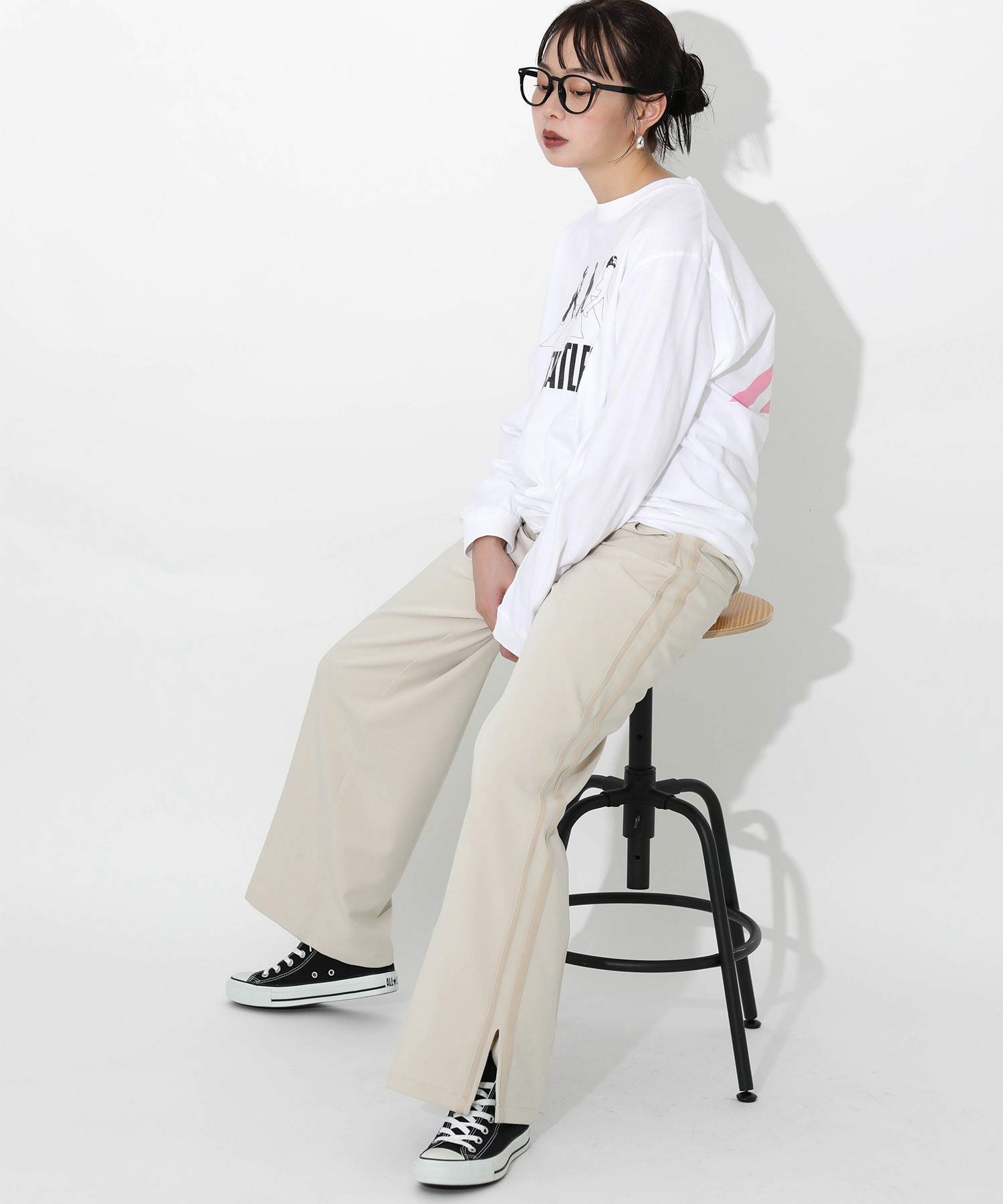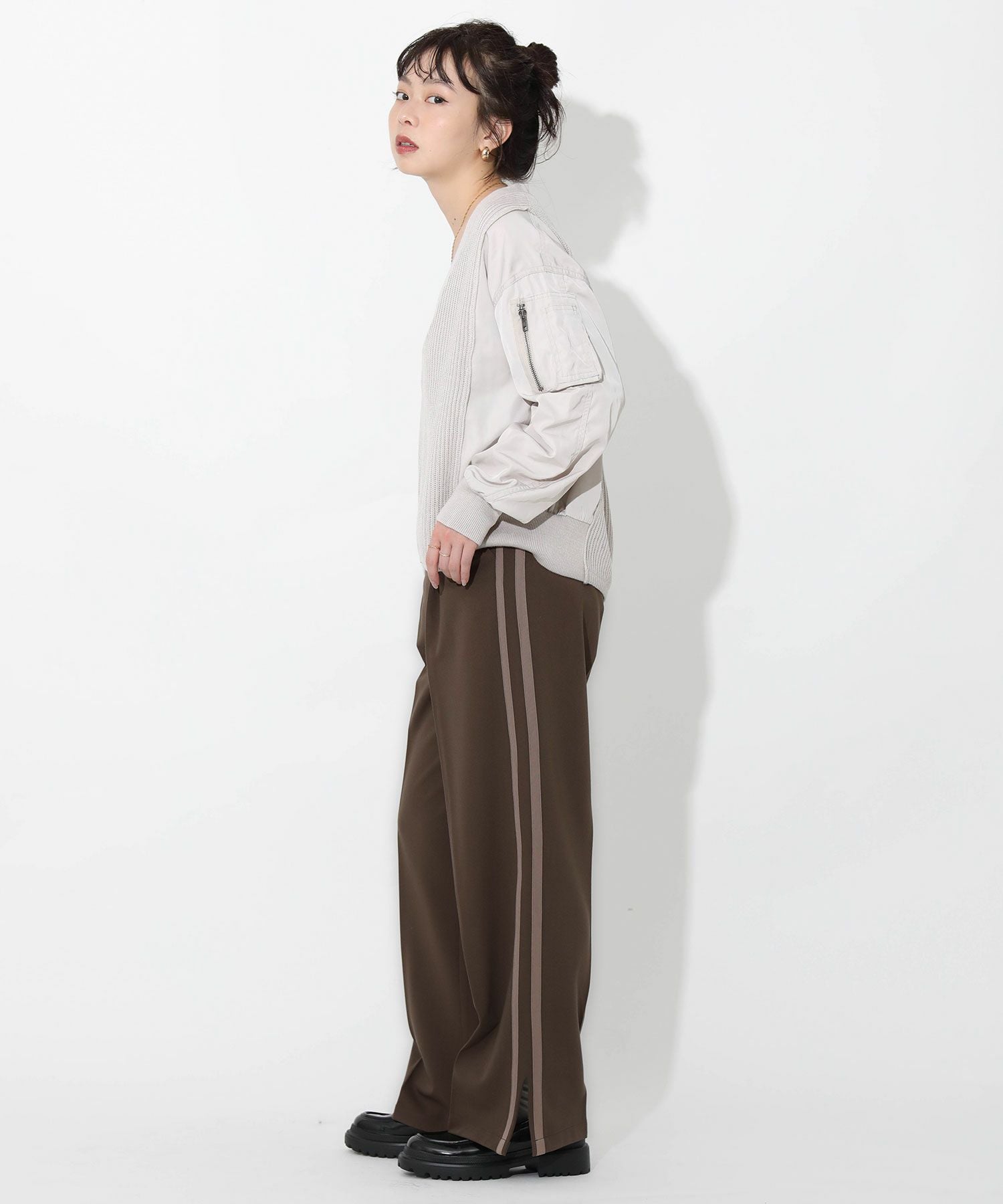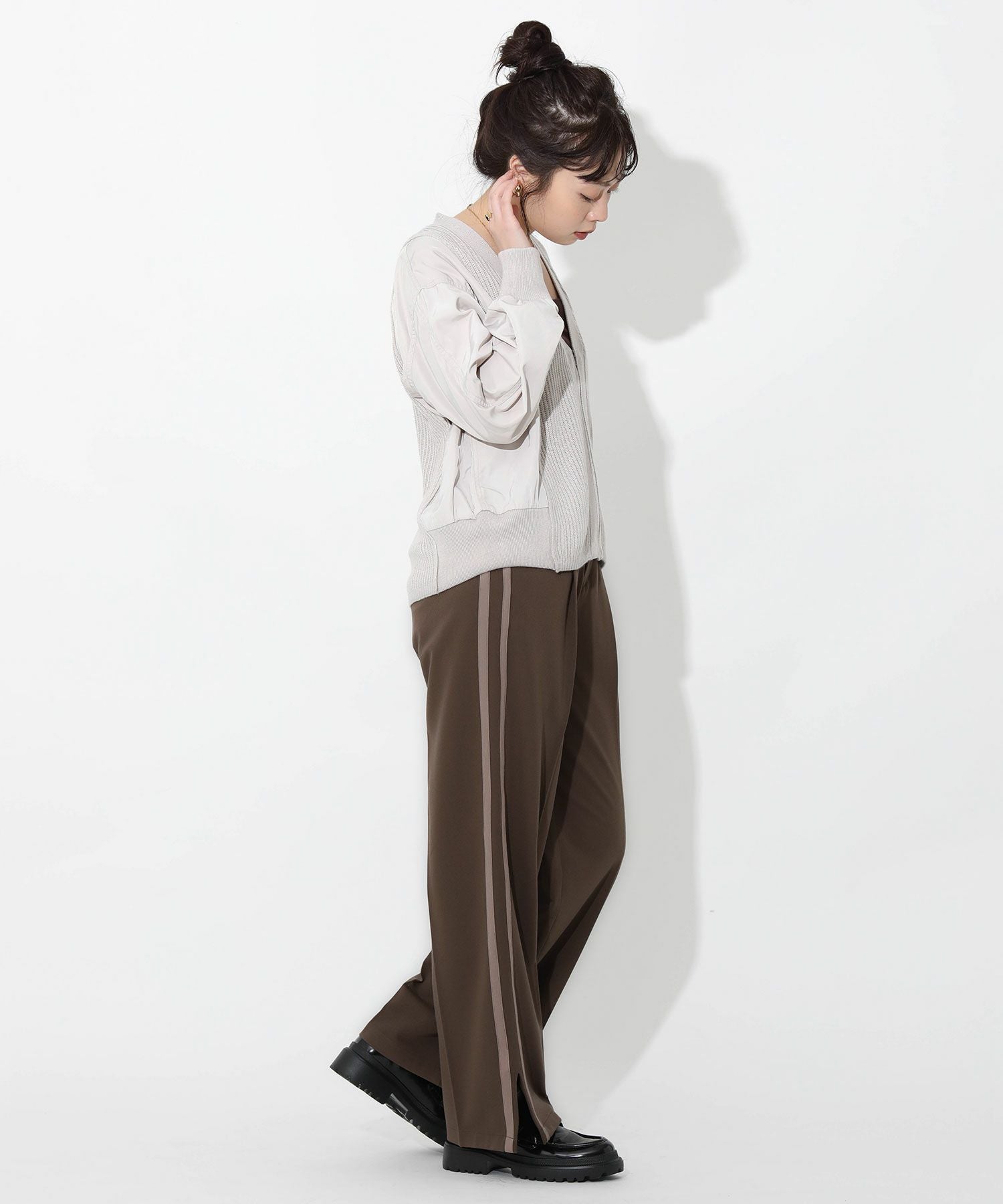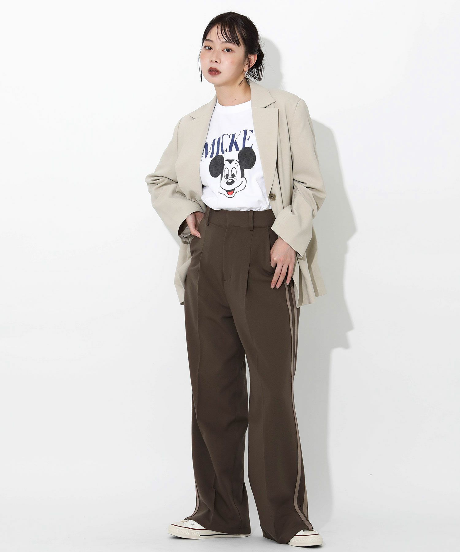 今季トレンドのラインパンツをキレイめにアップデート。