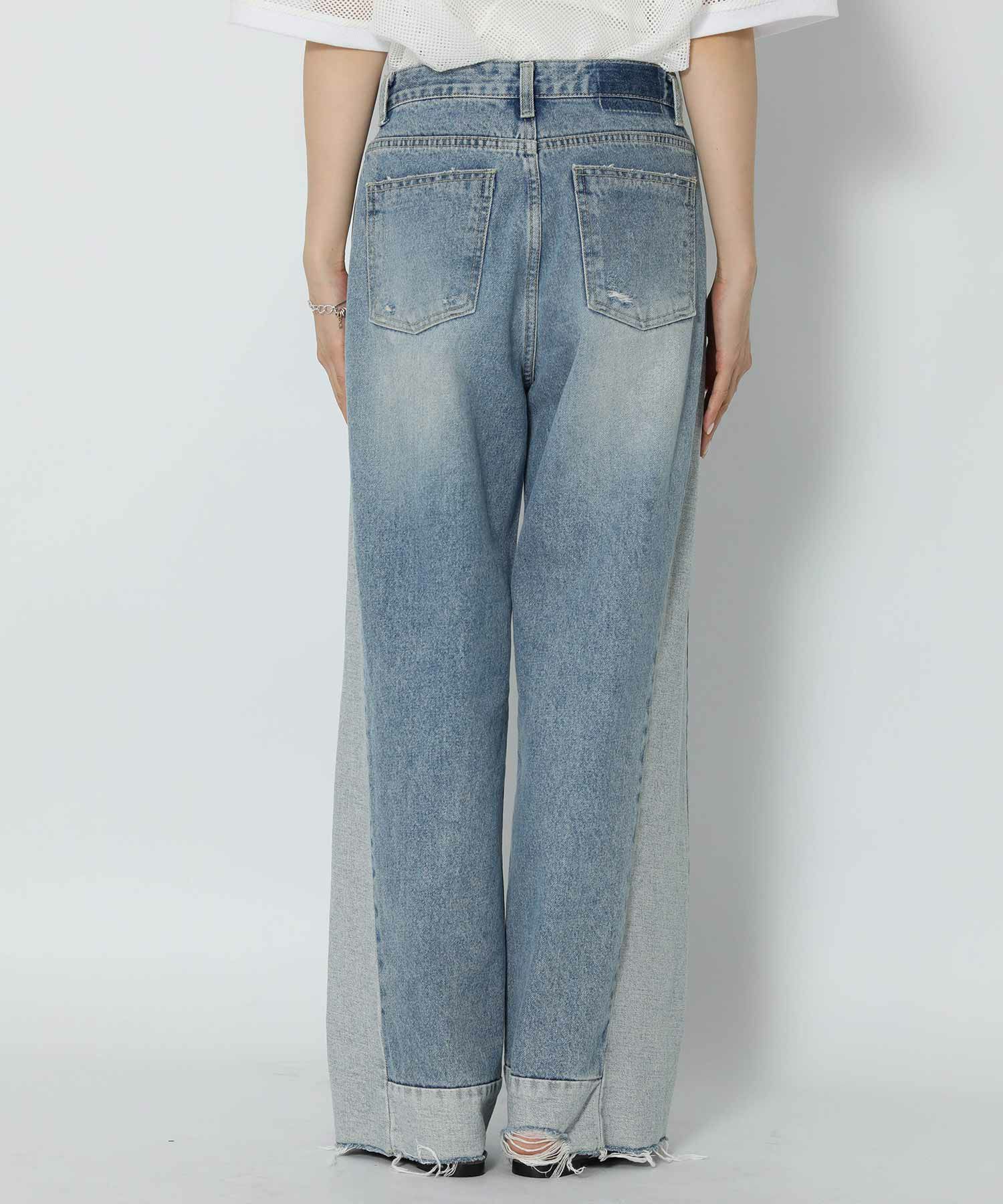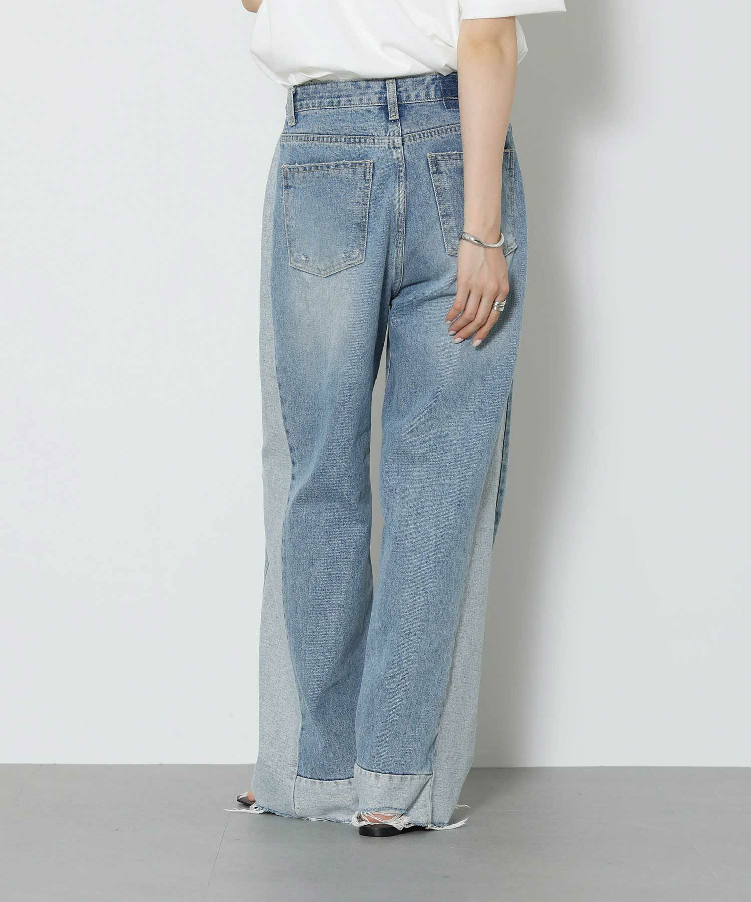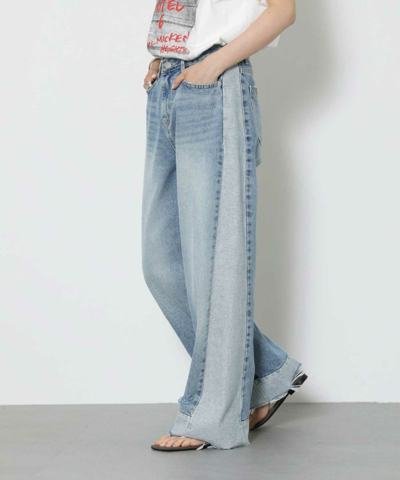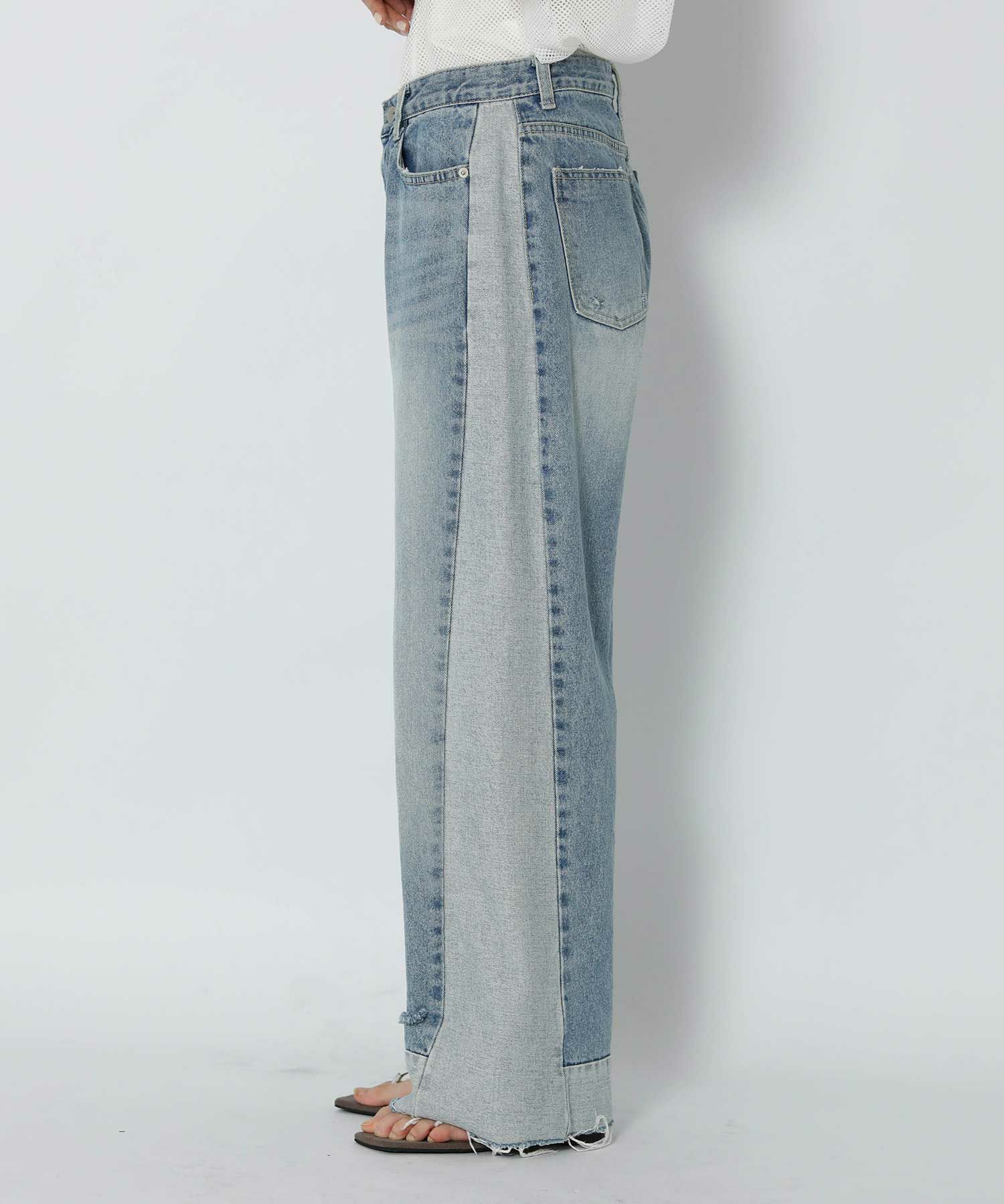 両サイドの大胆な切替が目を惹くデニムパンツ。