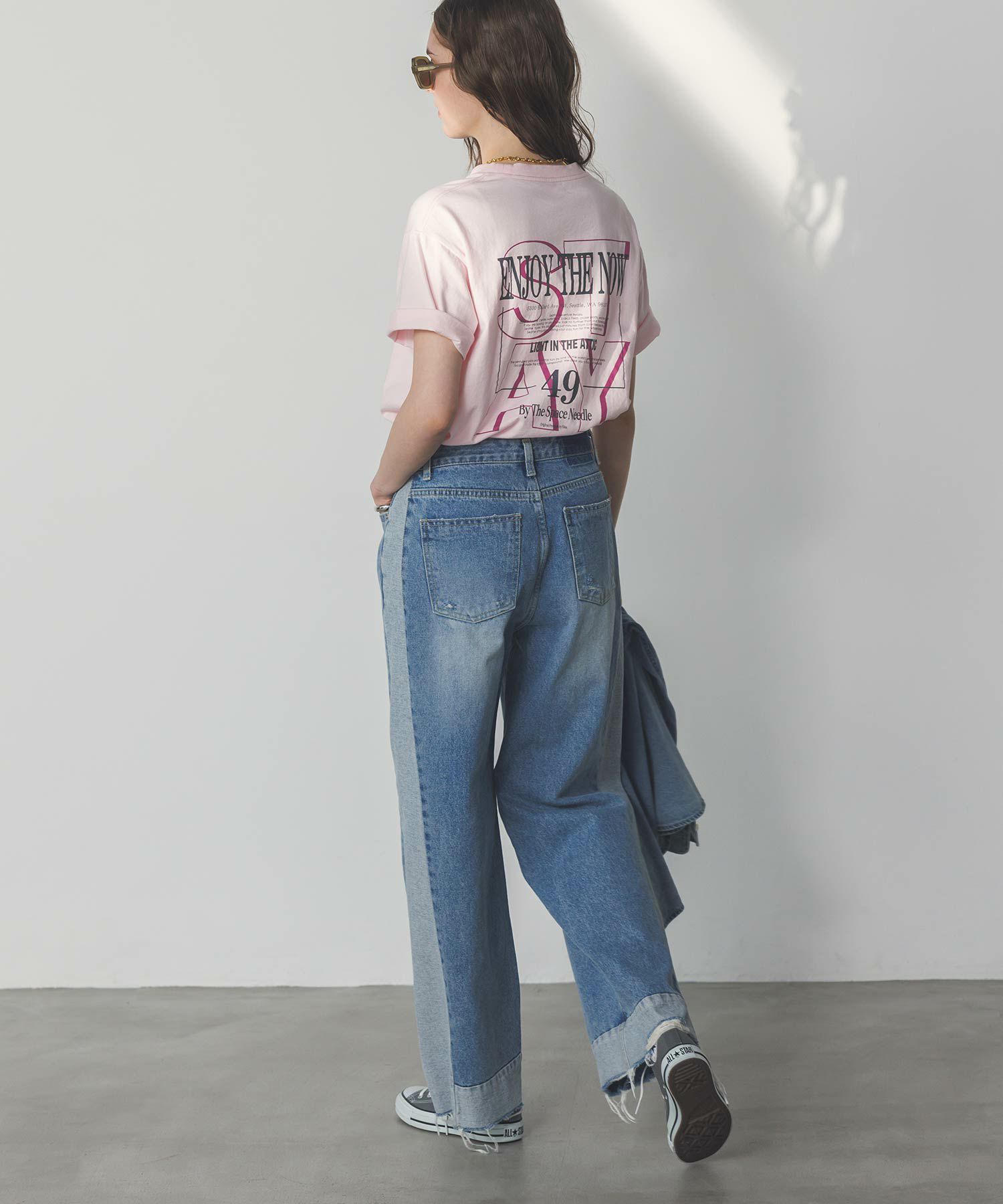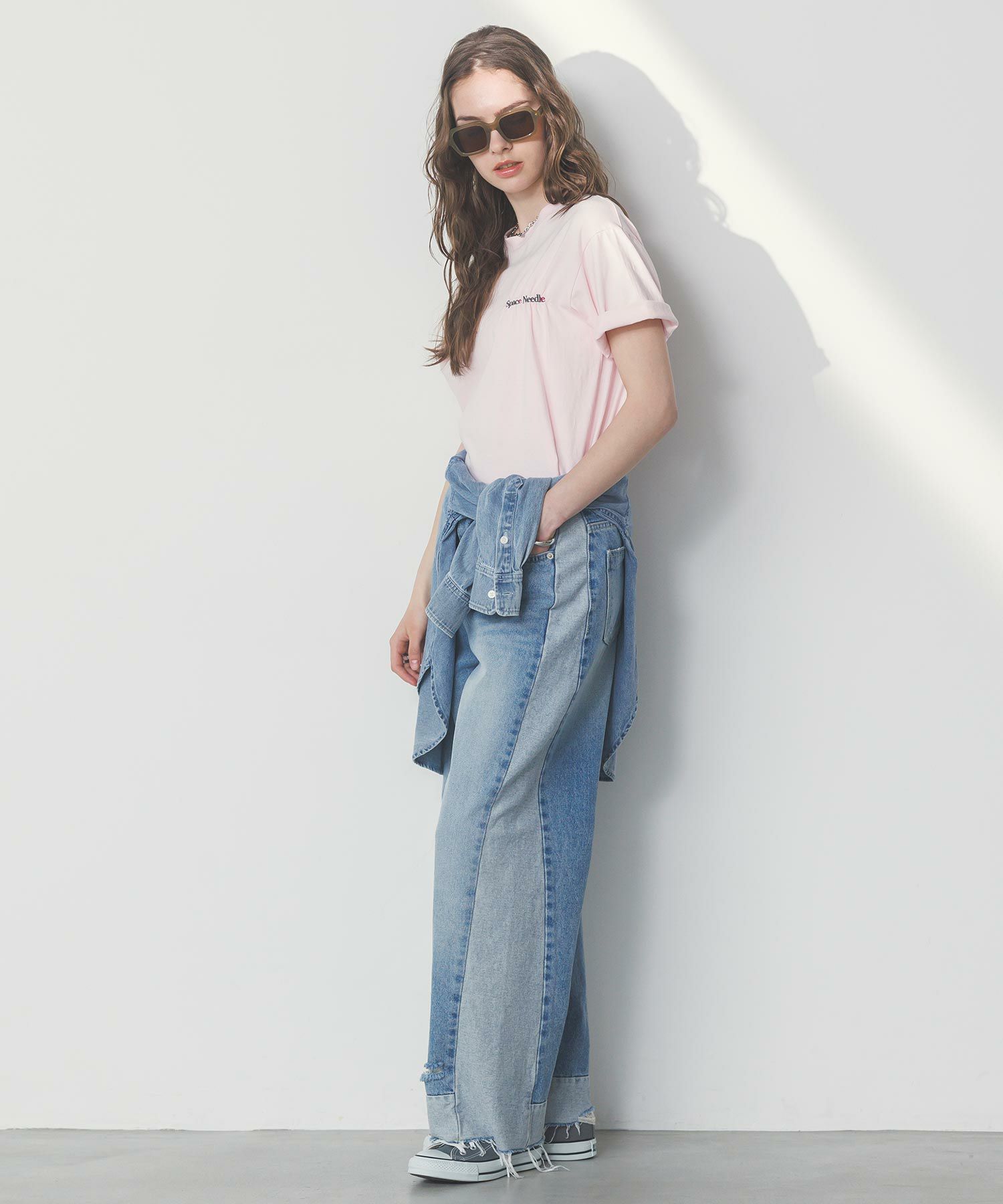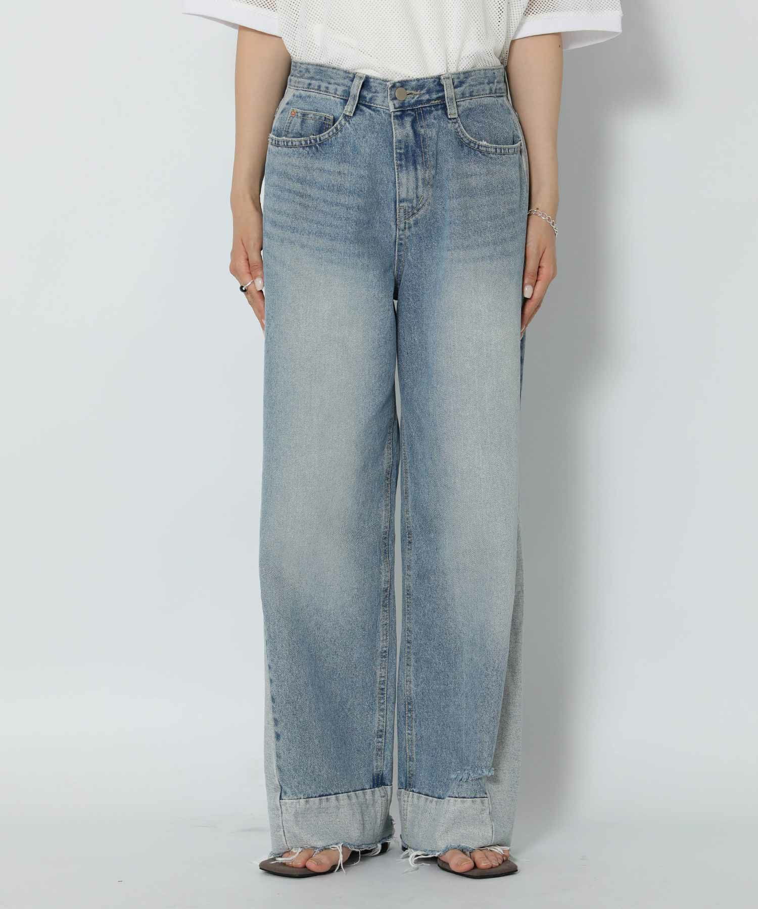 両サイドの大胆な切替が目を惹くデニムパンツ。
