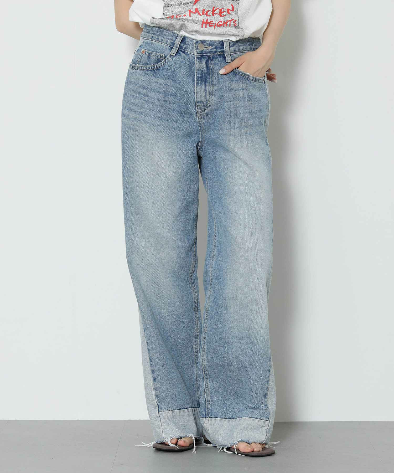 さりげないダメージ加工と裾のカットオフが抜け感のあるデザインに。裾に広がるシルエットで脚長効果も◎