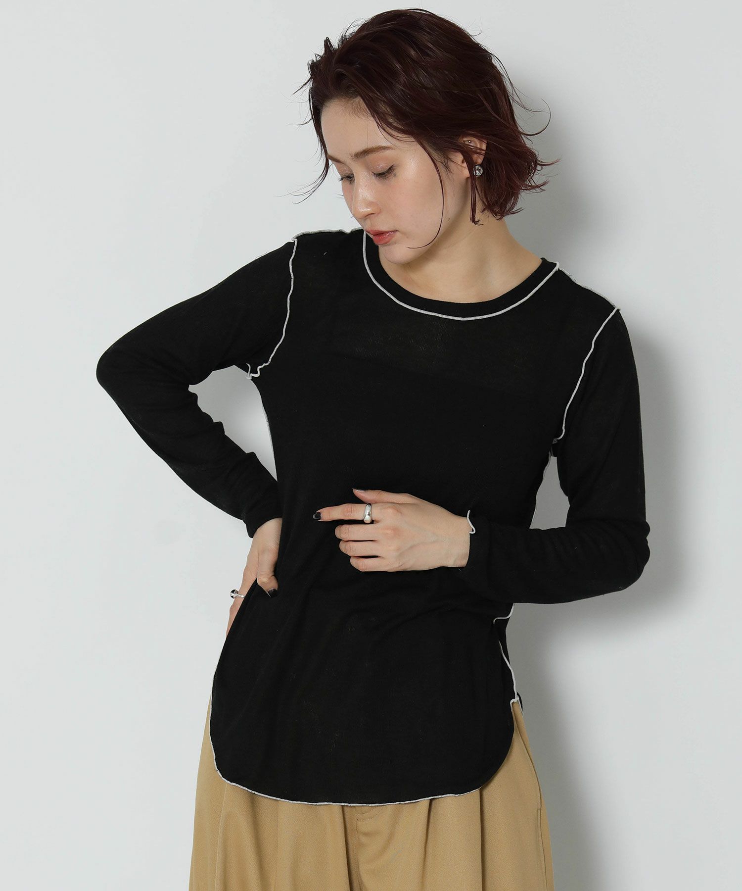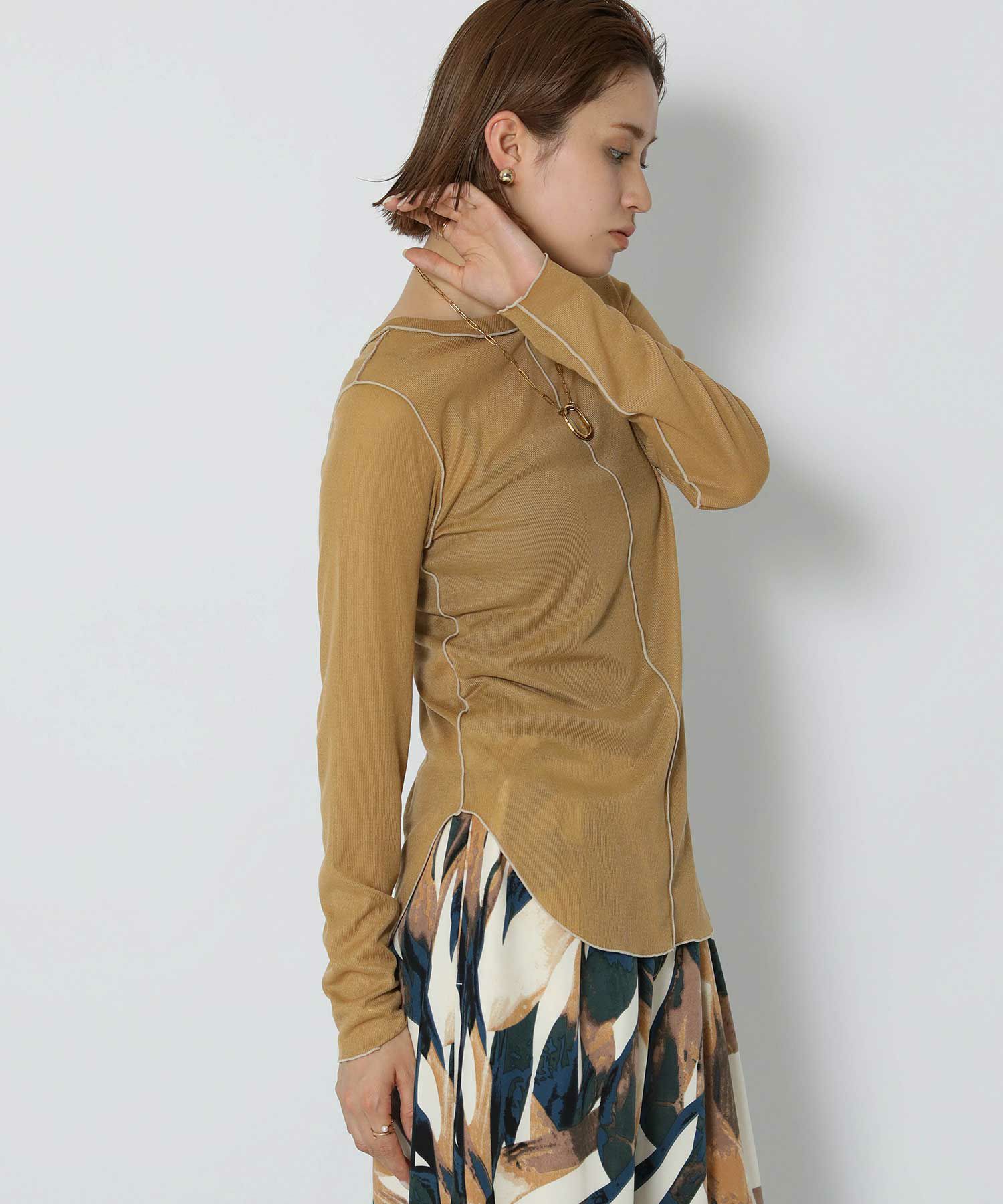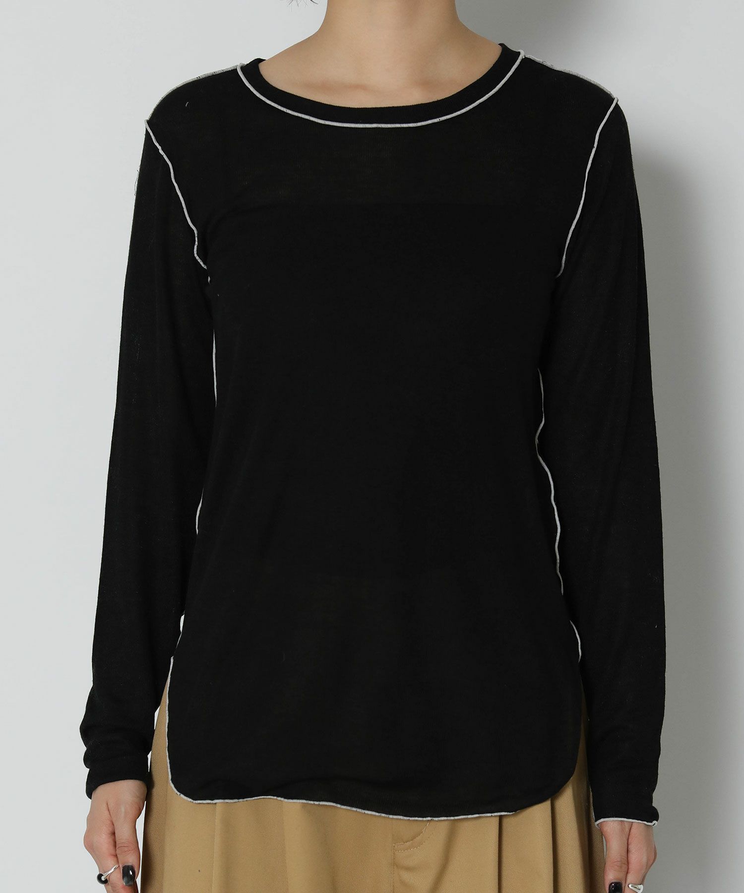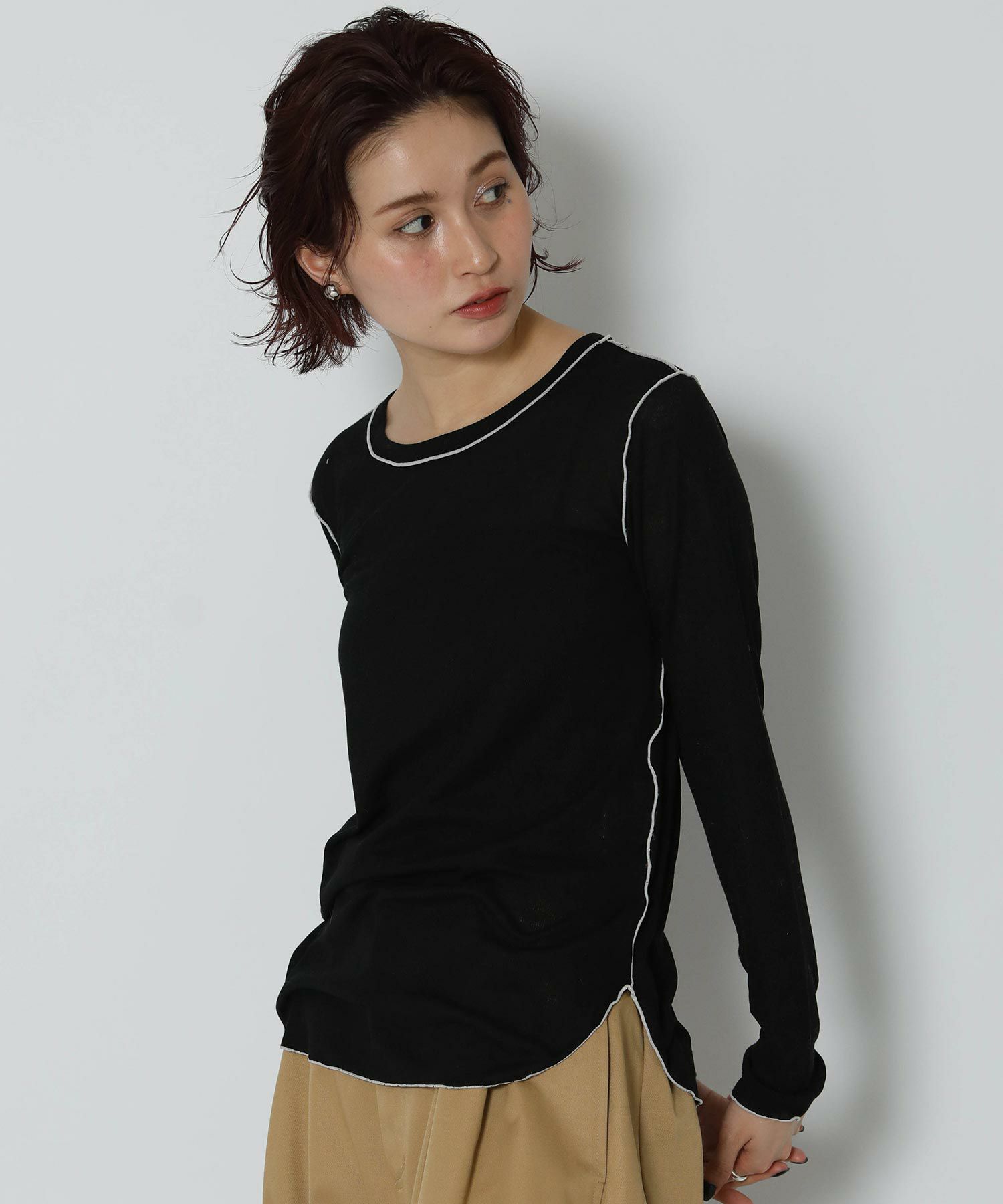 伸縮性のあるさらっとした素材で軽い着心地。身体のラインを拾い過ぎないサイズ感で、脇にかけてのラウンドスリットがアウトで着ても可愛いデザインです。前後2WAYで着用可能。キャミワンピやオールインワンのインナーとしてもオススメです。