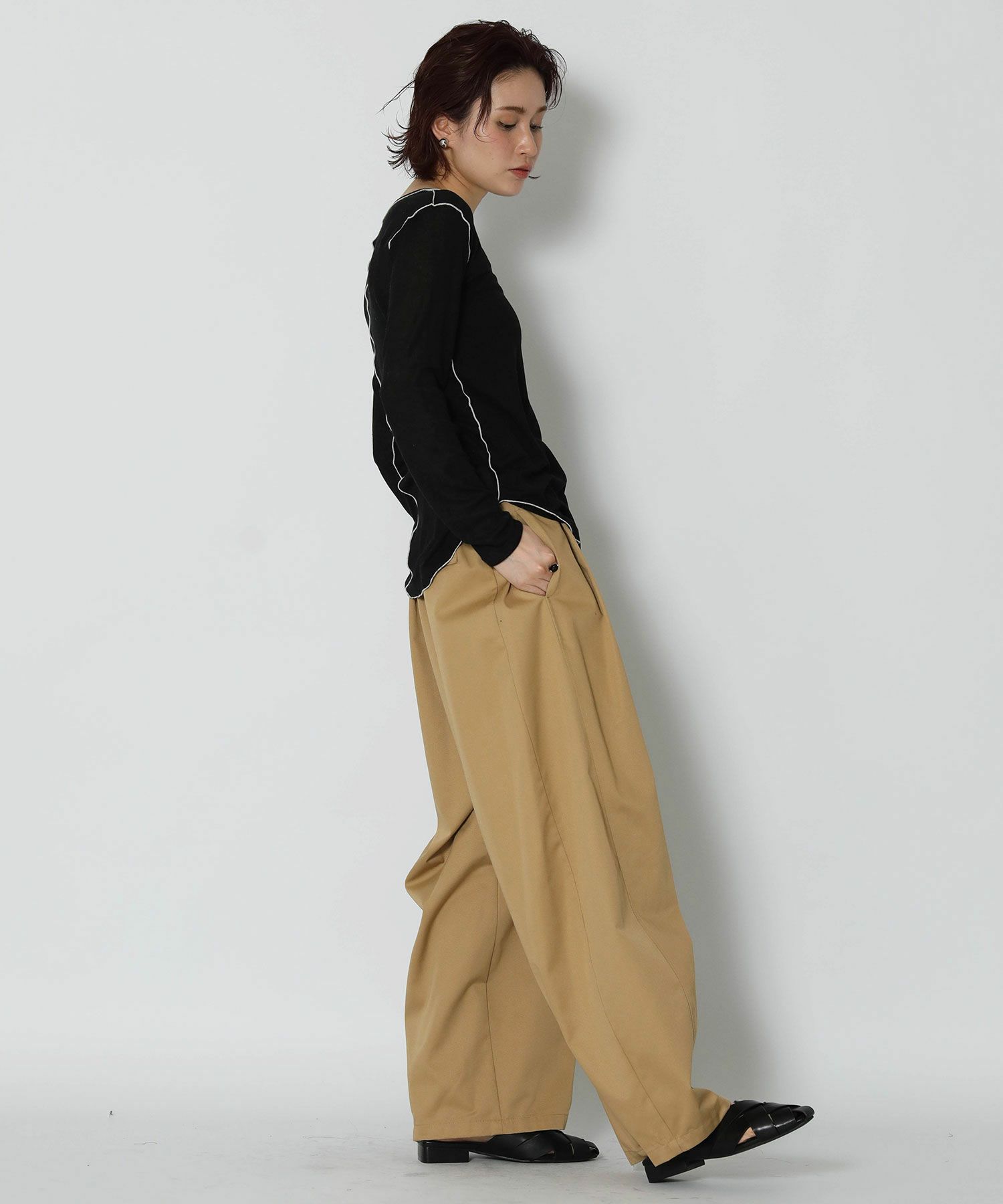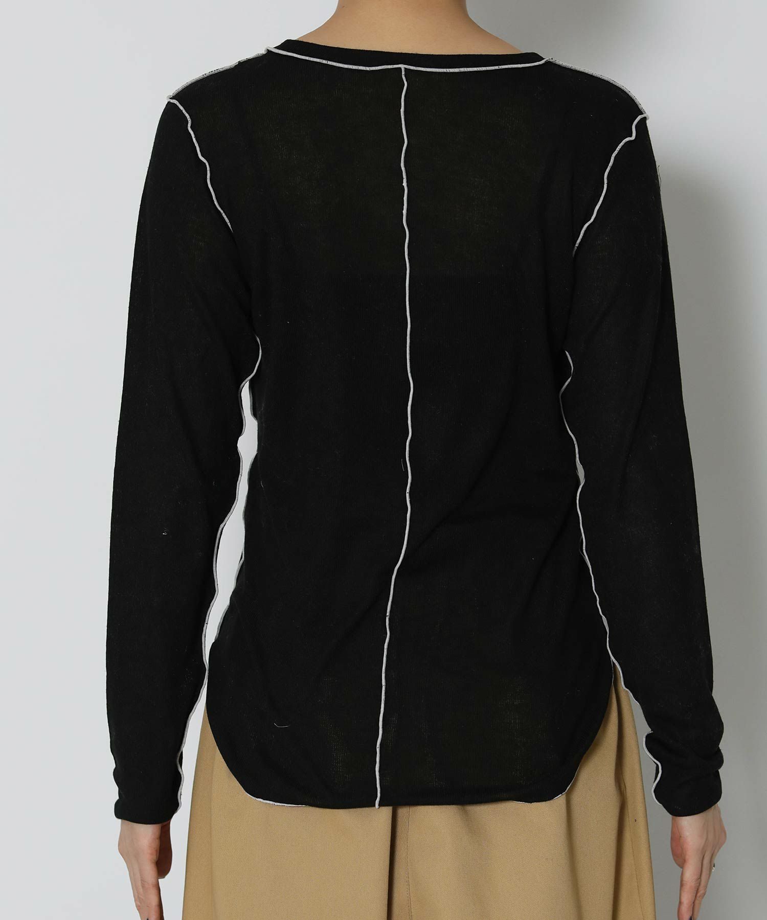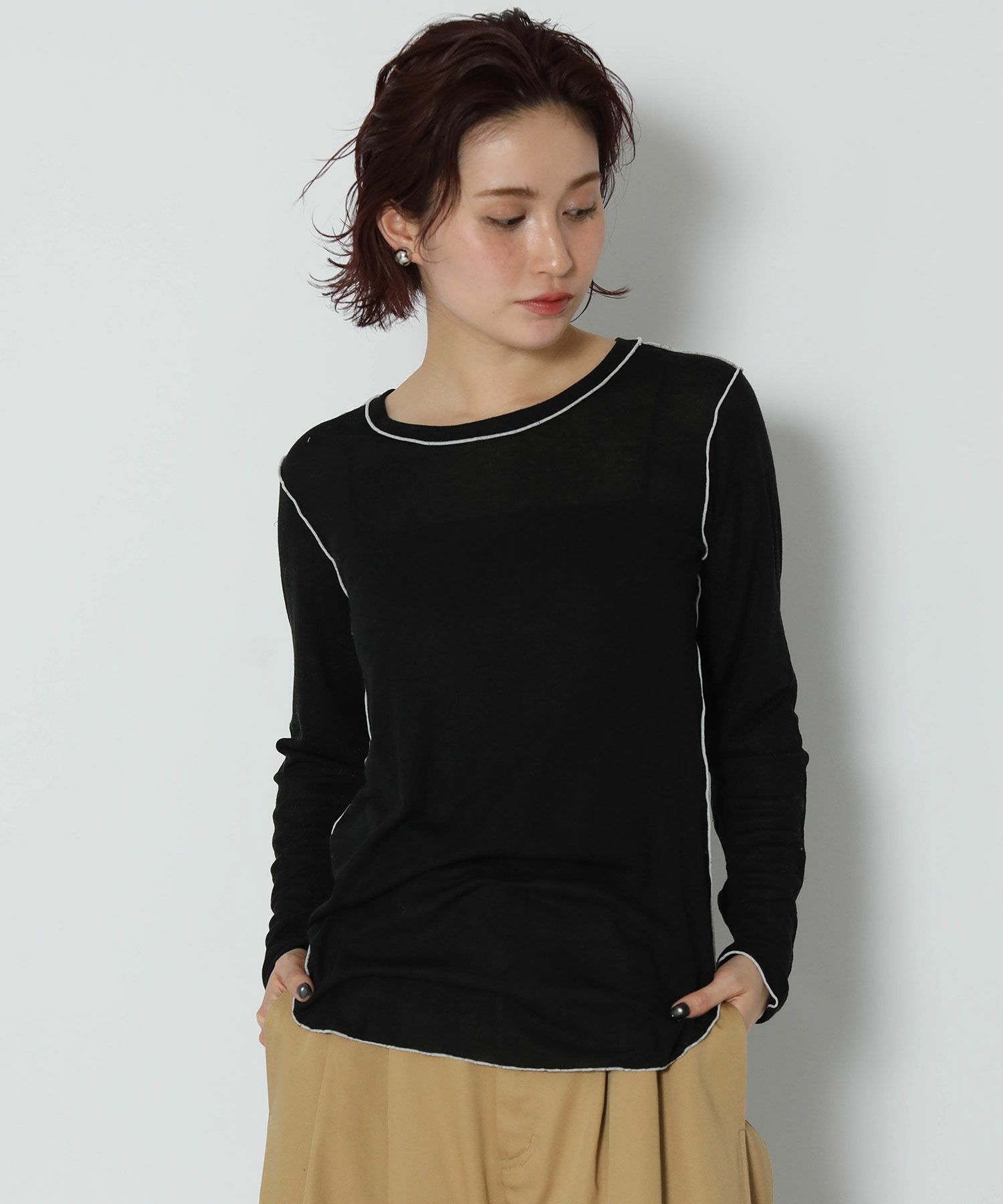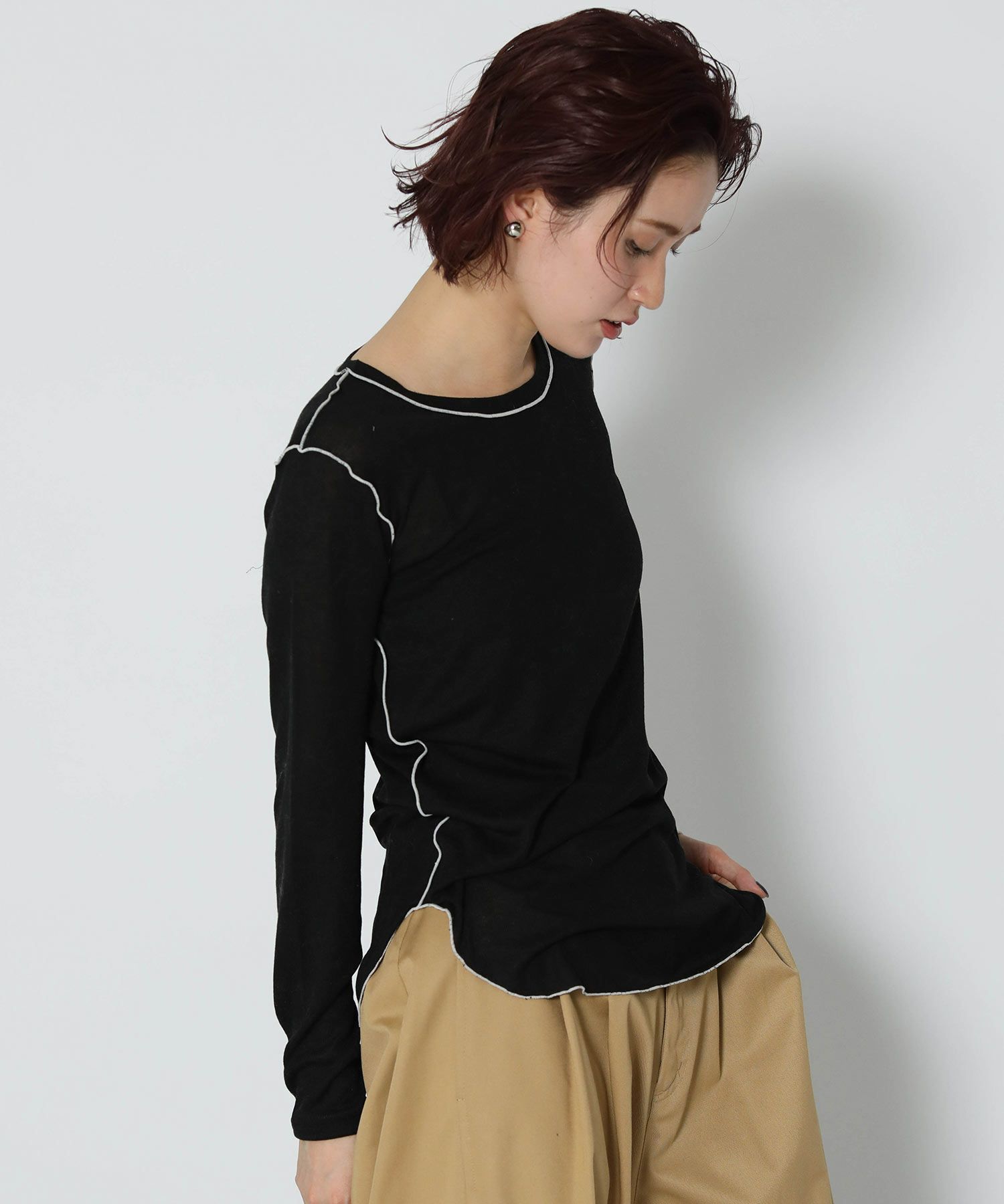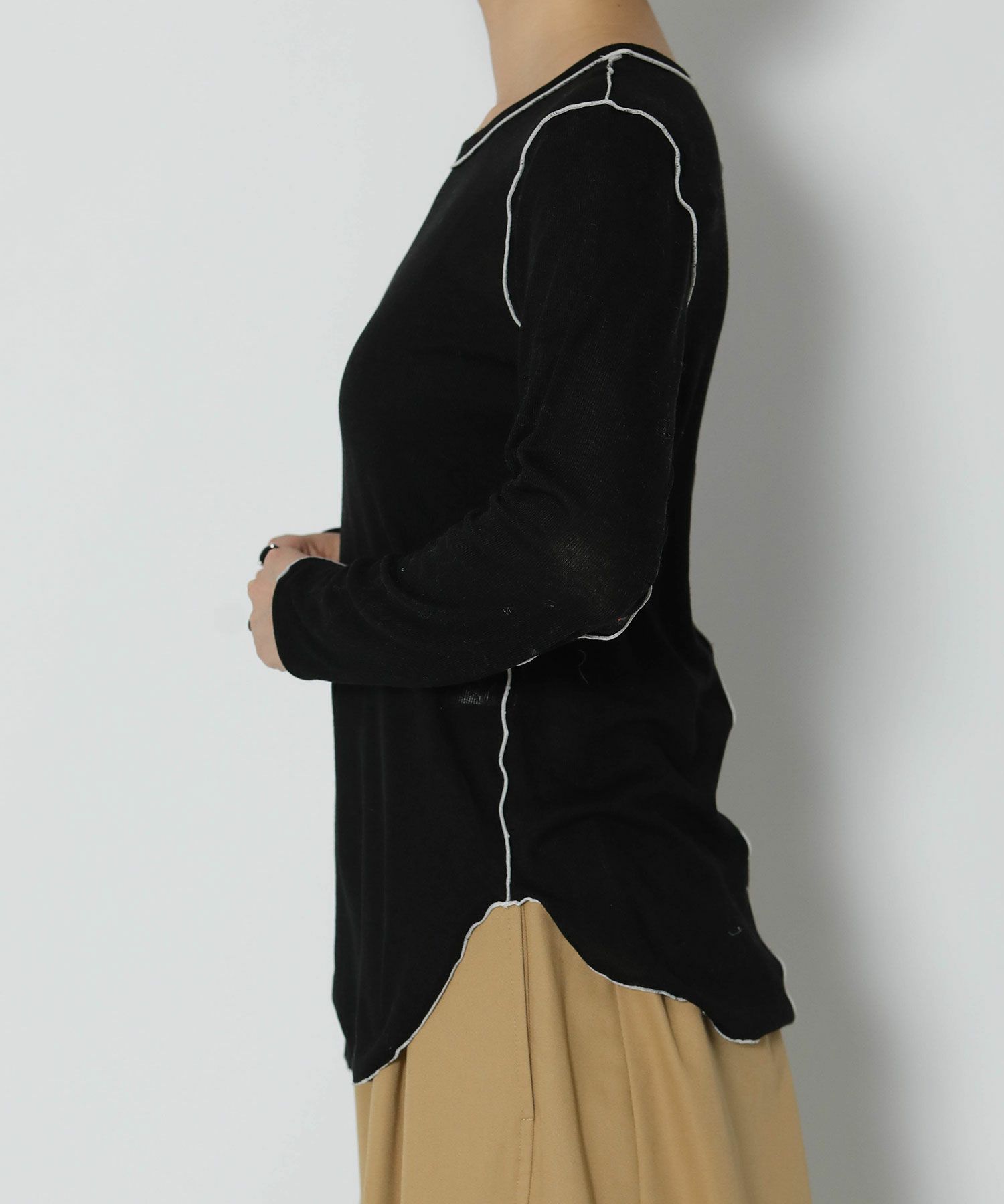 伸縮性のあるさらっとした素材で軽い着心地。身体のラインを拾い過ぎないサイズ感で、脇にかけてのラウンドスリットがアウトで着ても可愛いデザインです。前後2WAYで着用可能。キャミワンピやオールインワンのインナーとしてもオススメです。