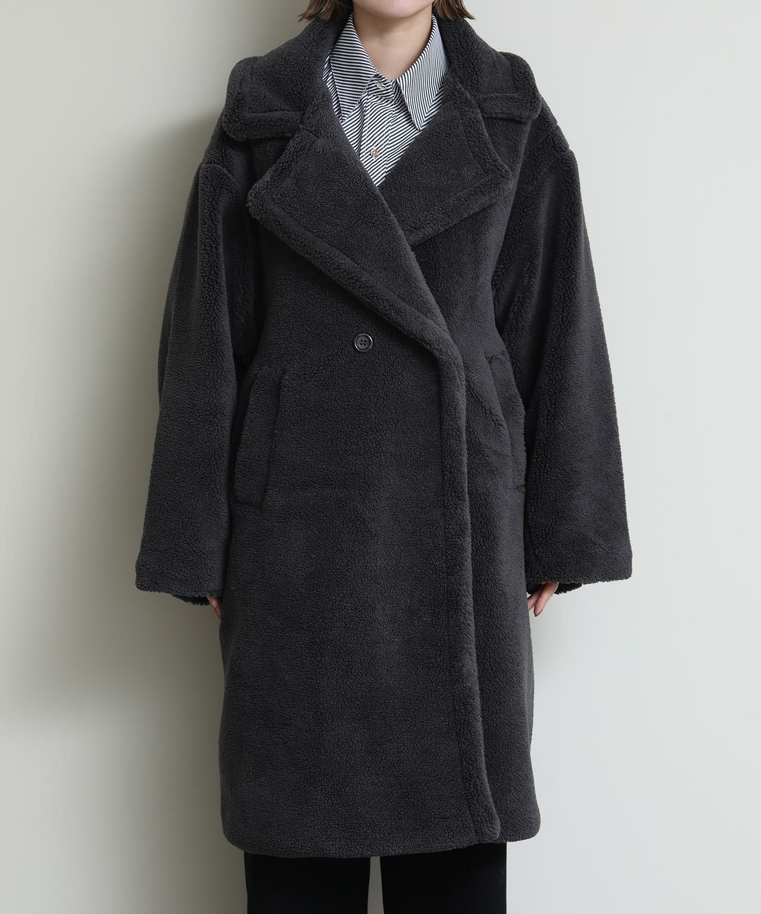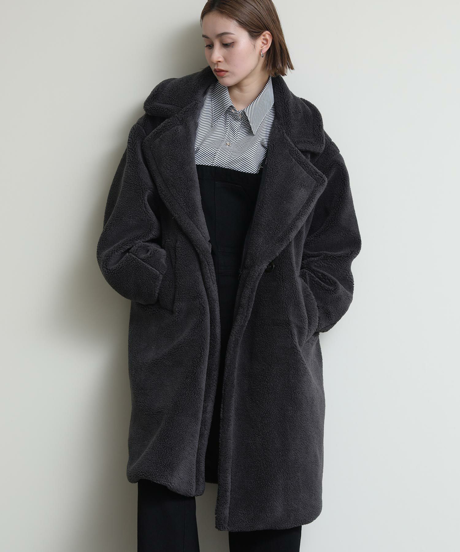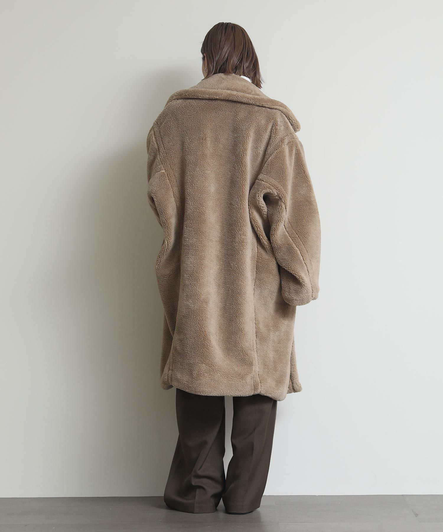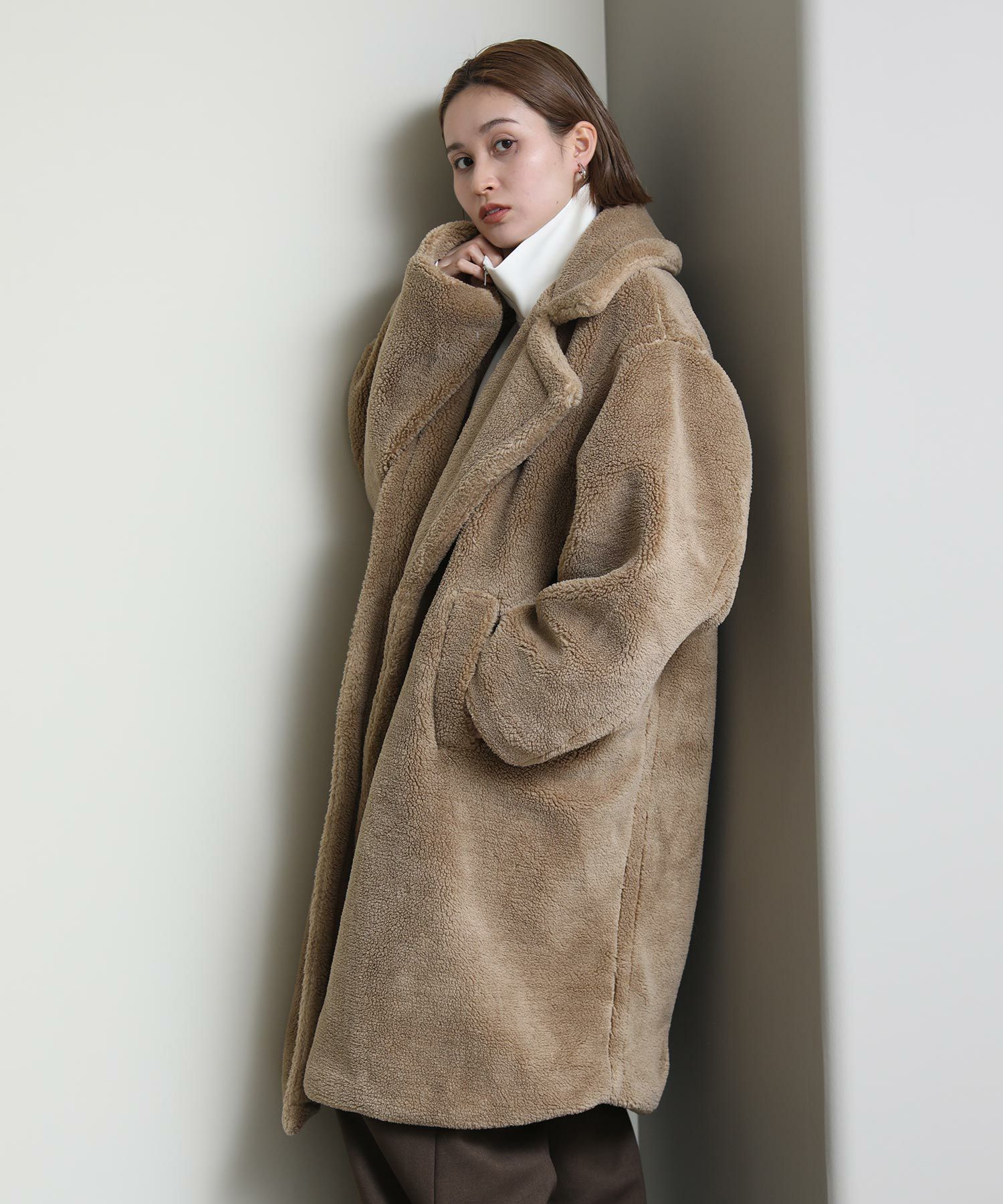 テディベアのようなミニボアを使用したロングコート。