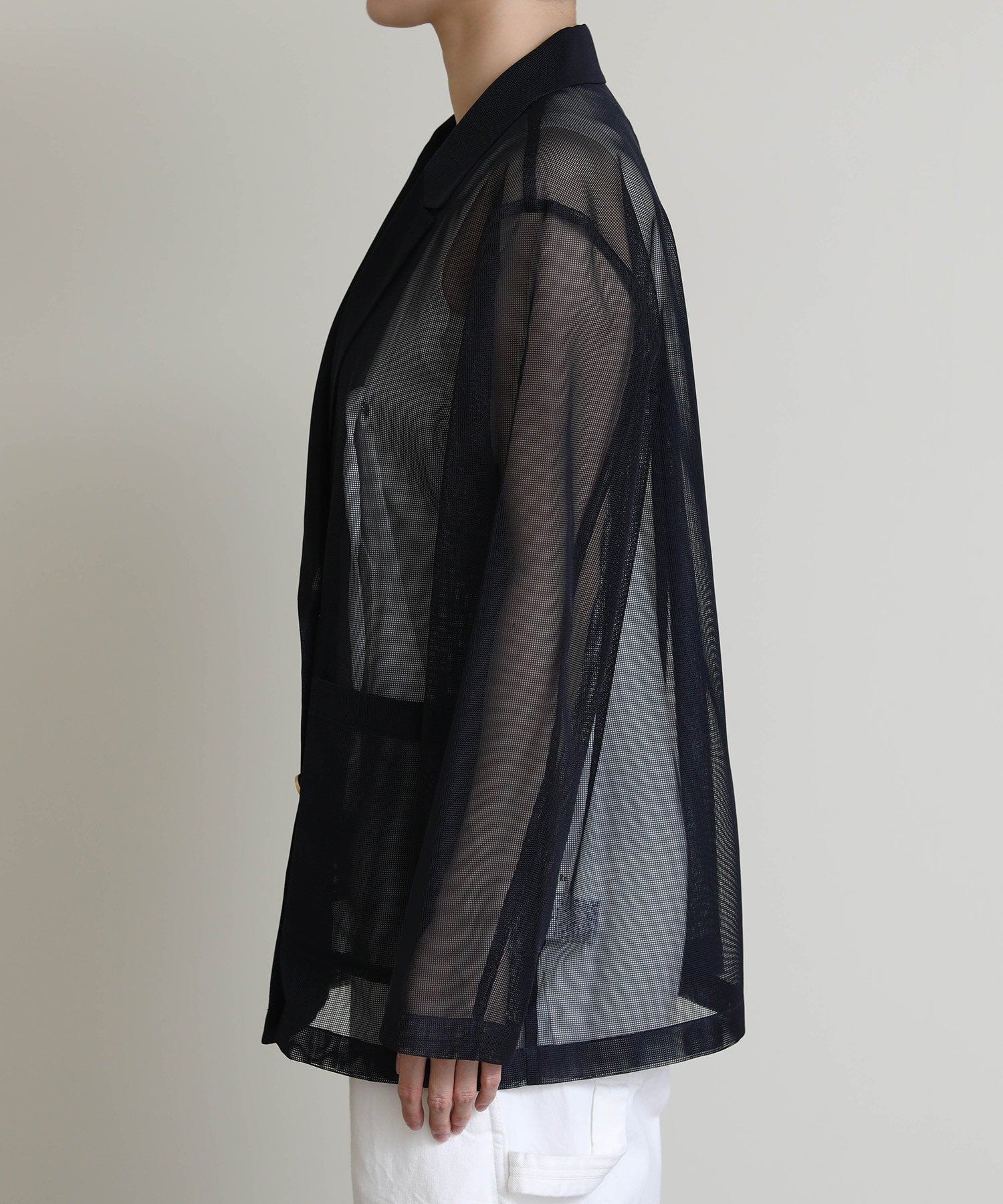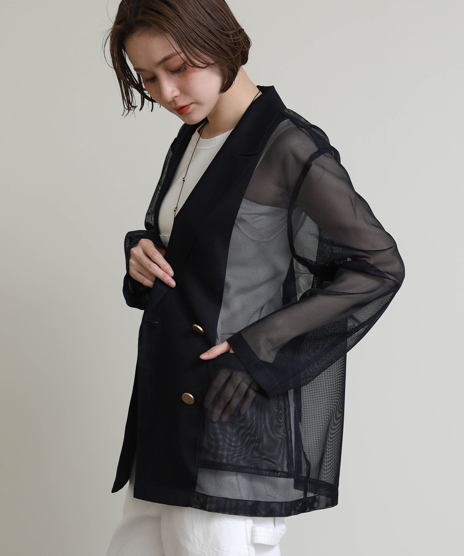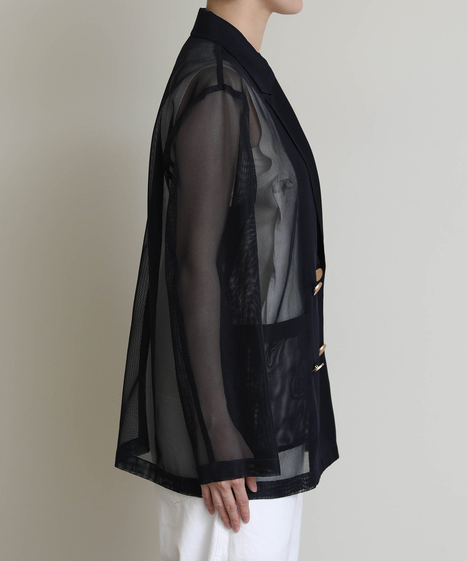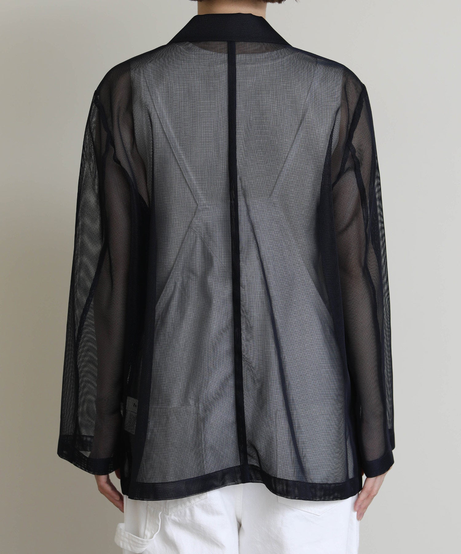 シアーメッシュ素材を使用したダブルテーラードジャケット。