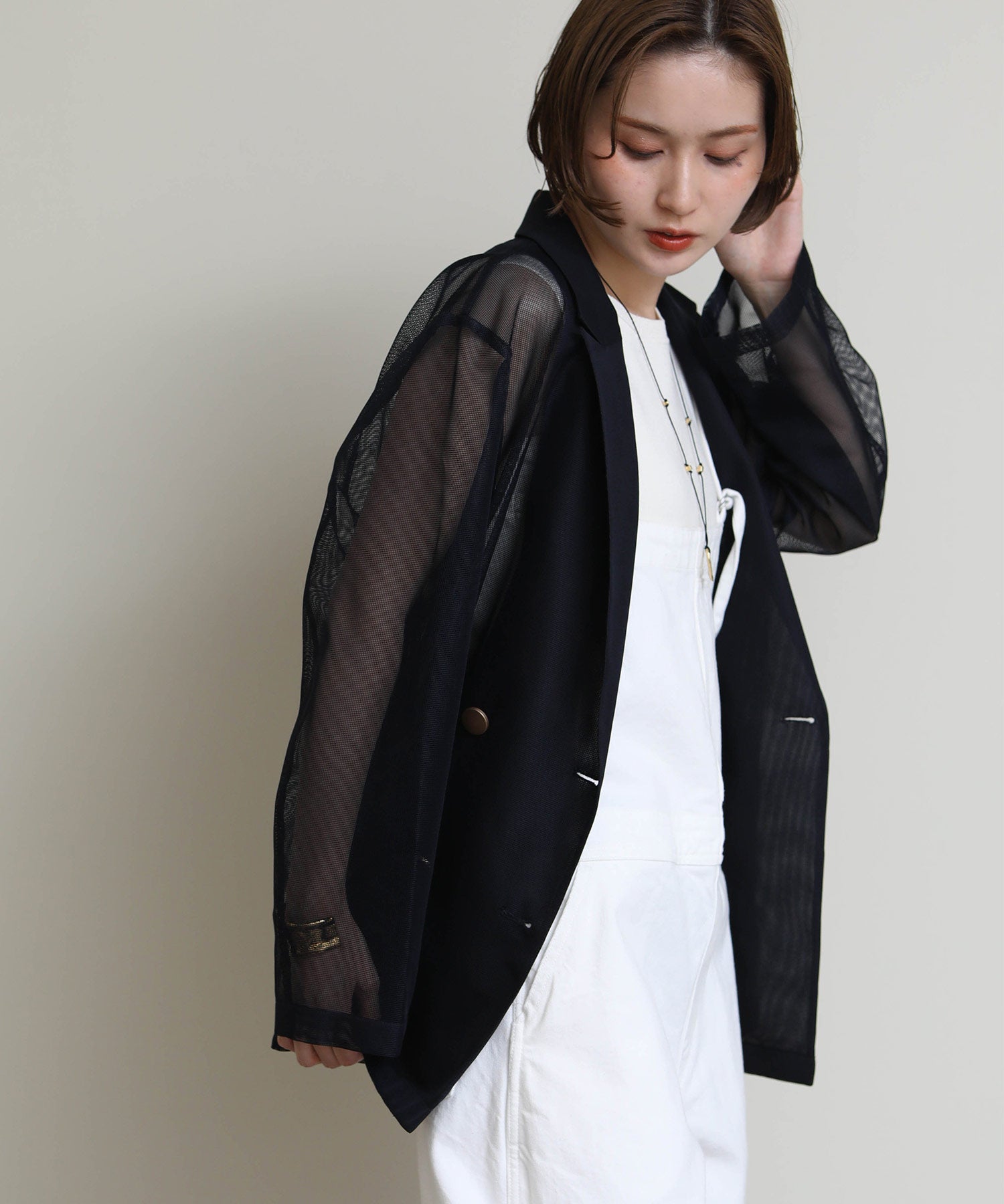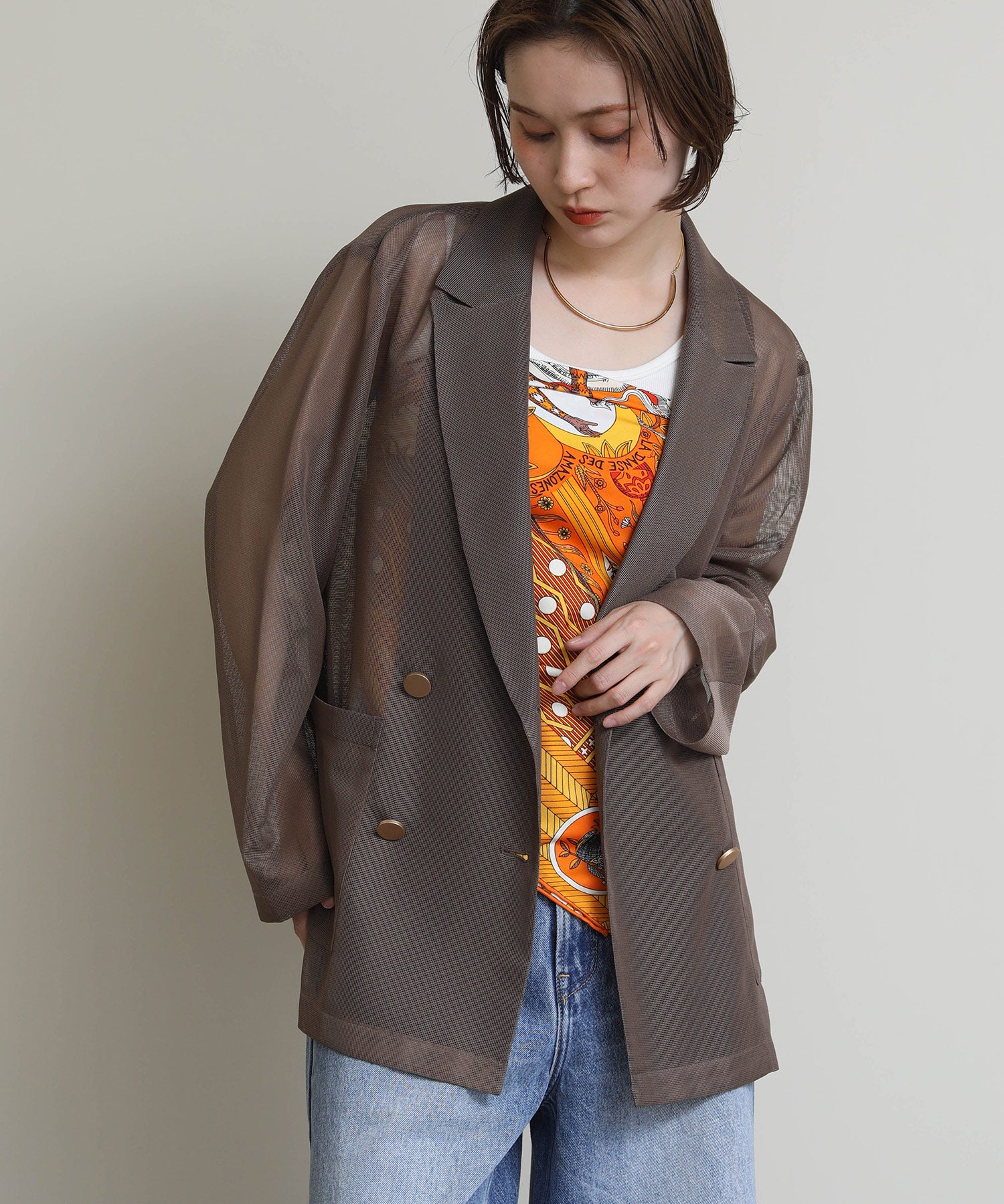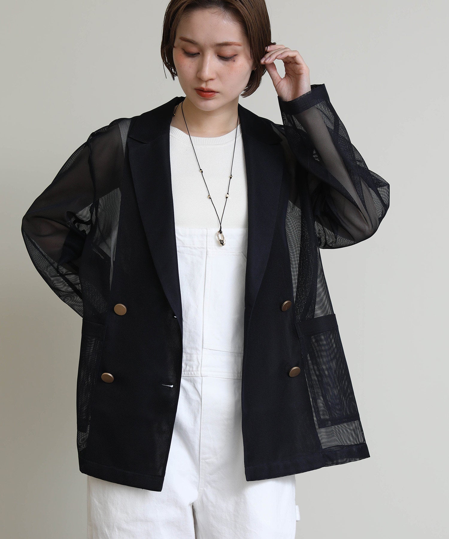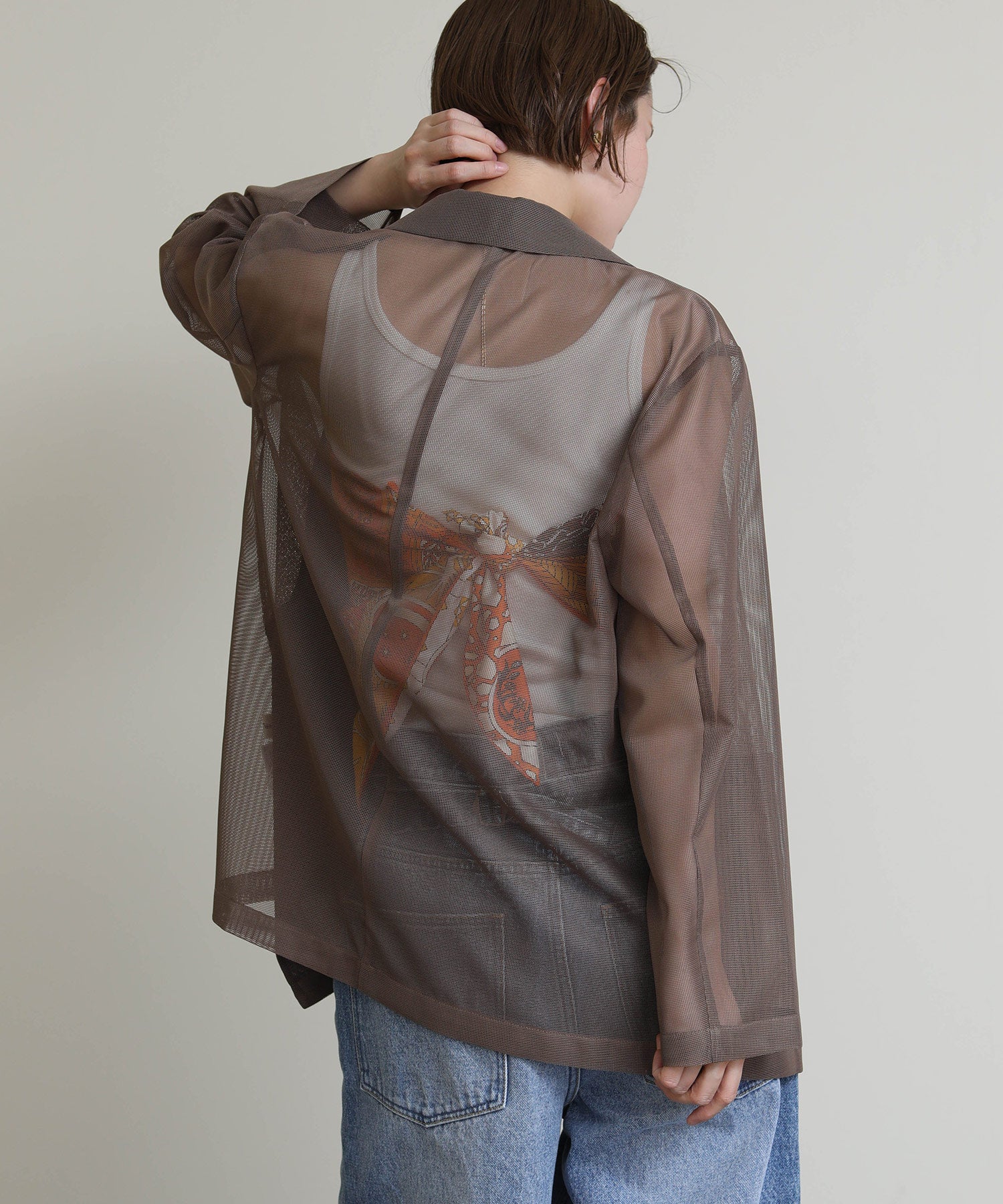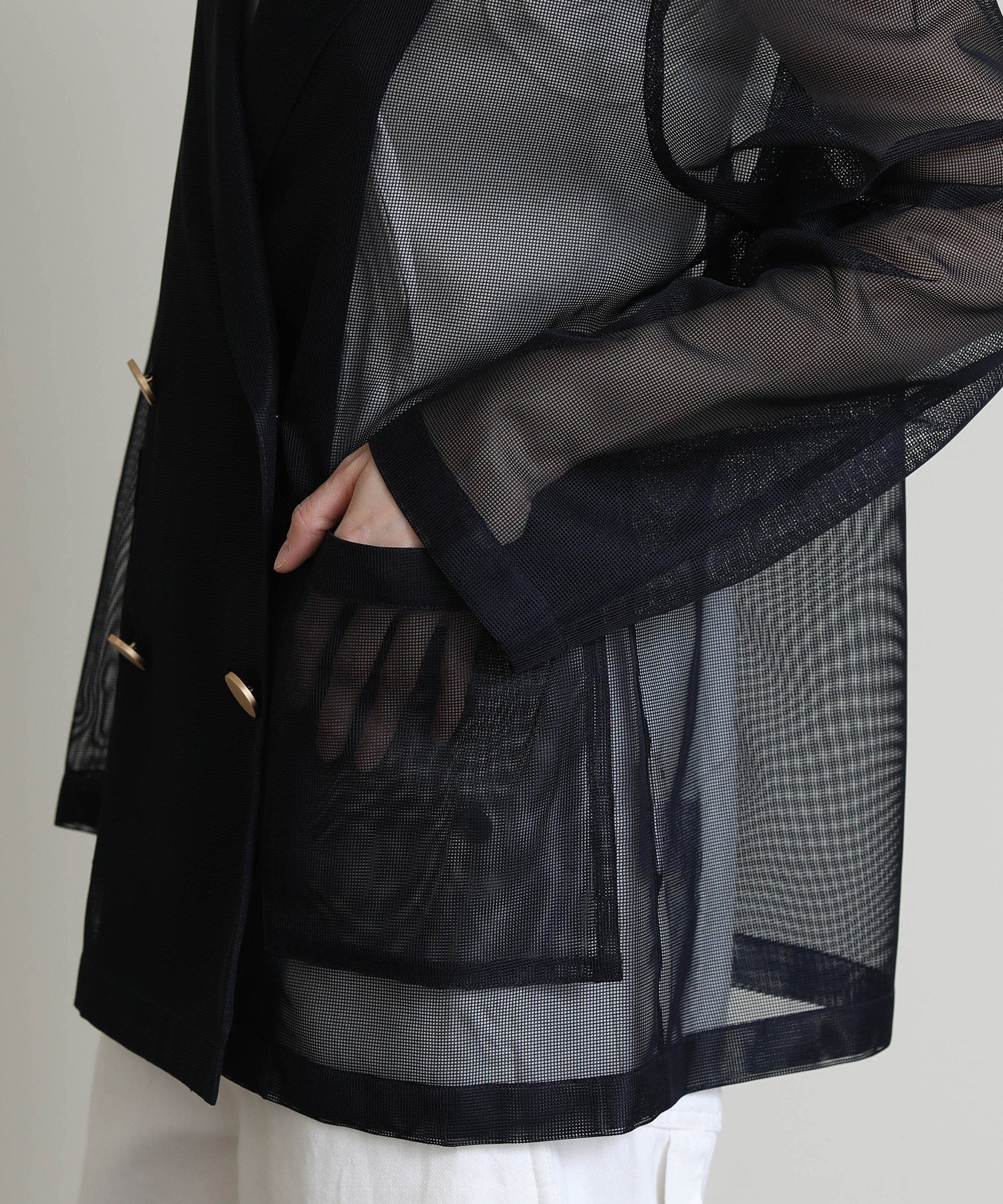 シアーメッシュ素材を使用したダブルテーラードジャケット。